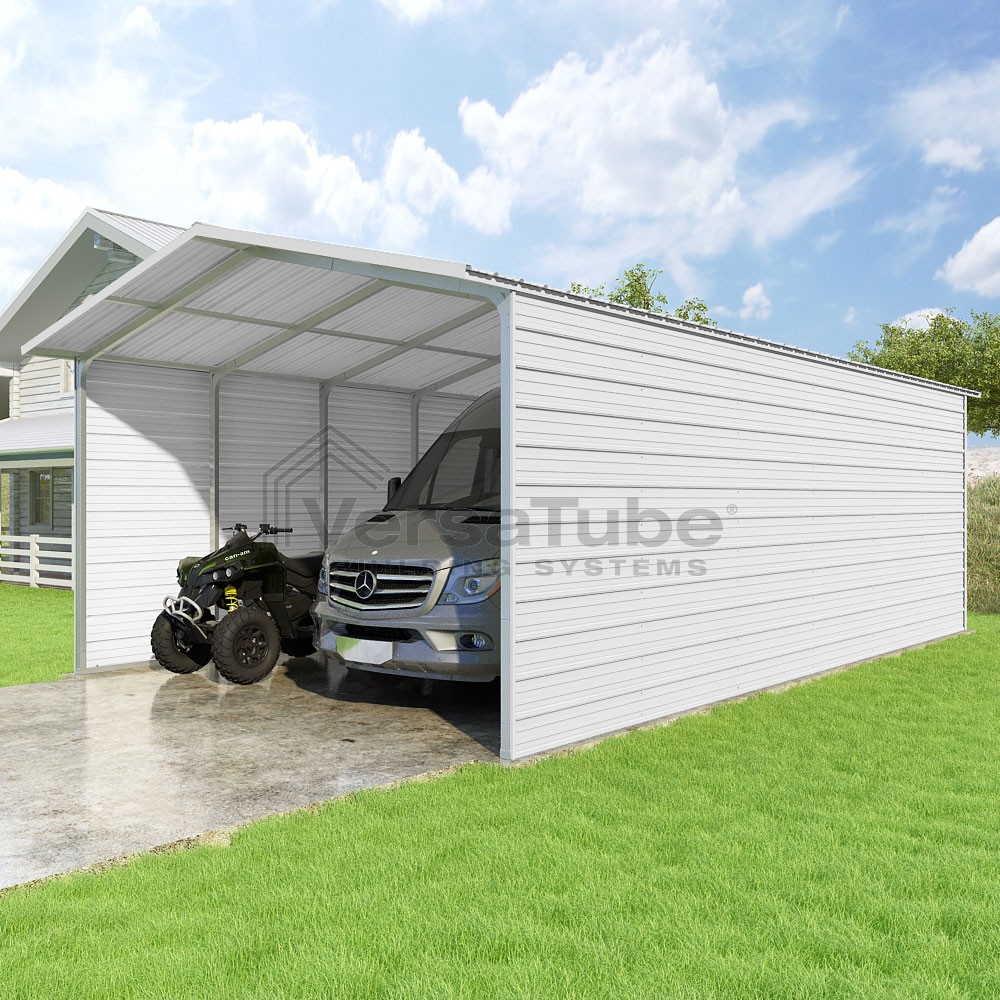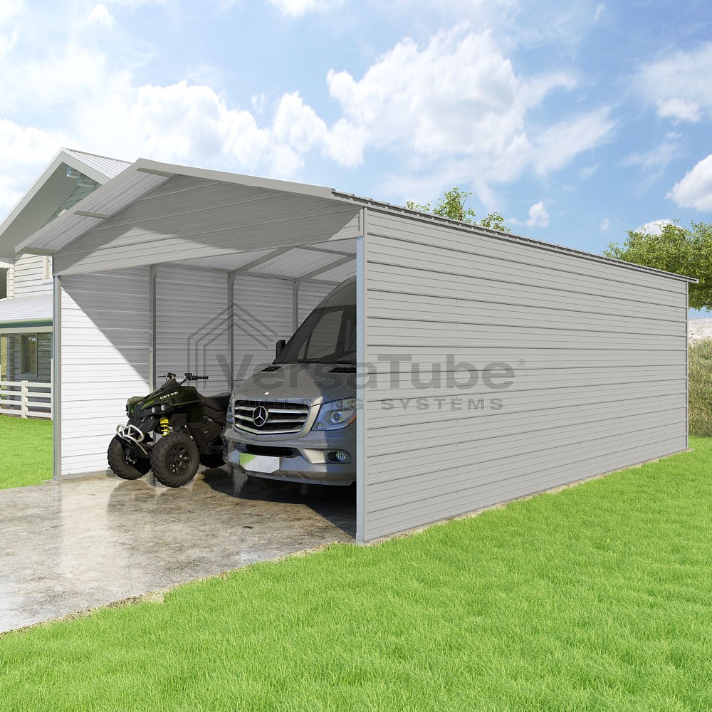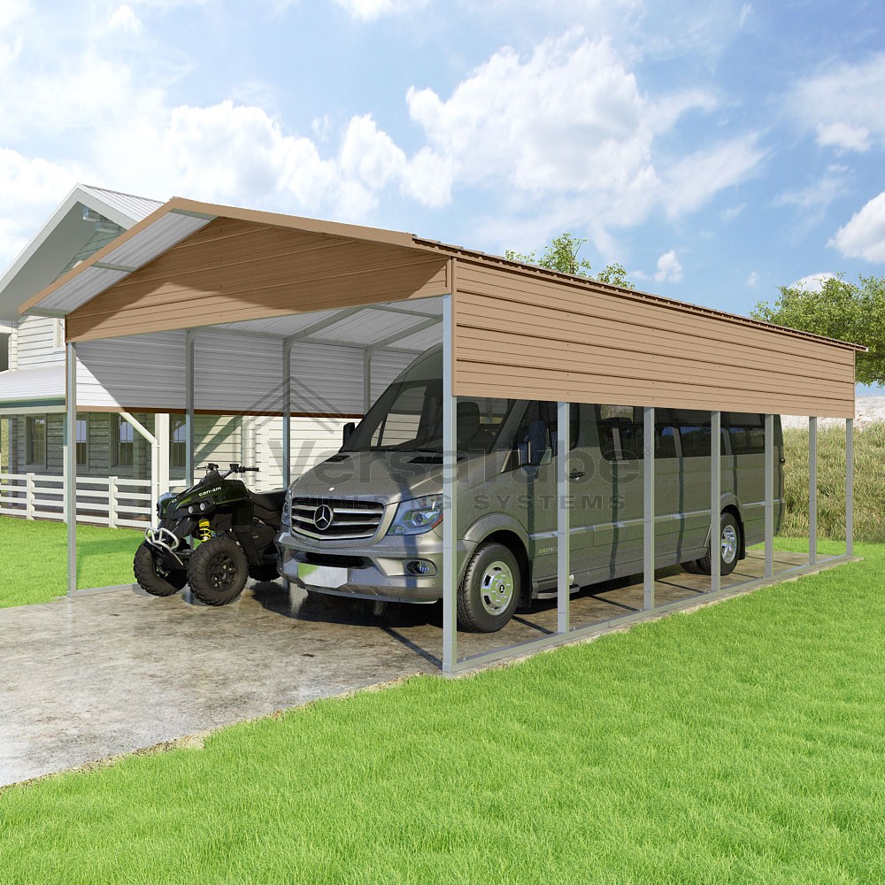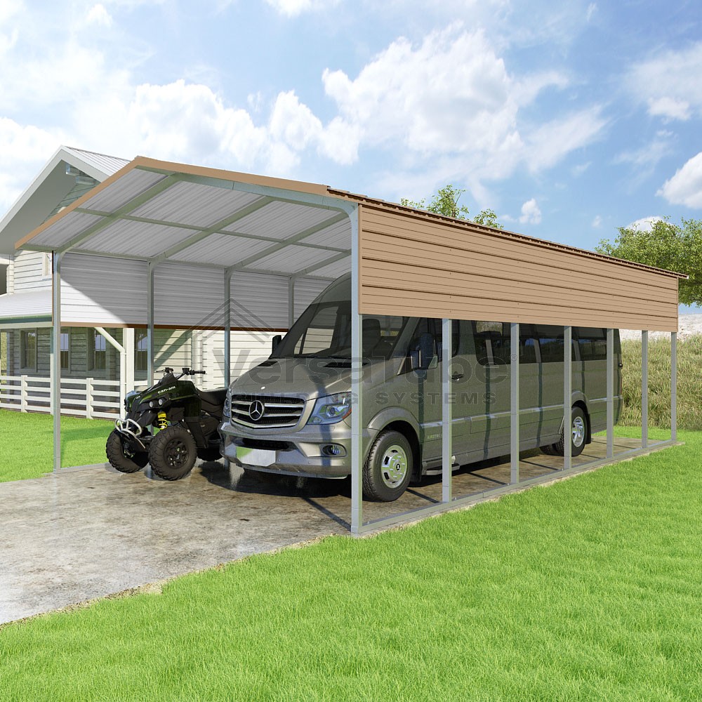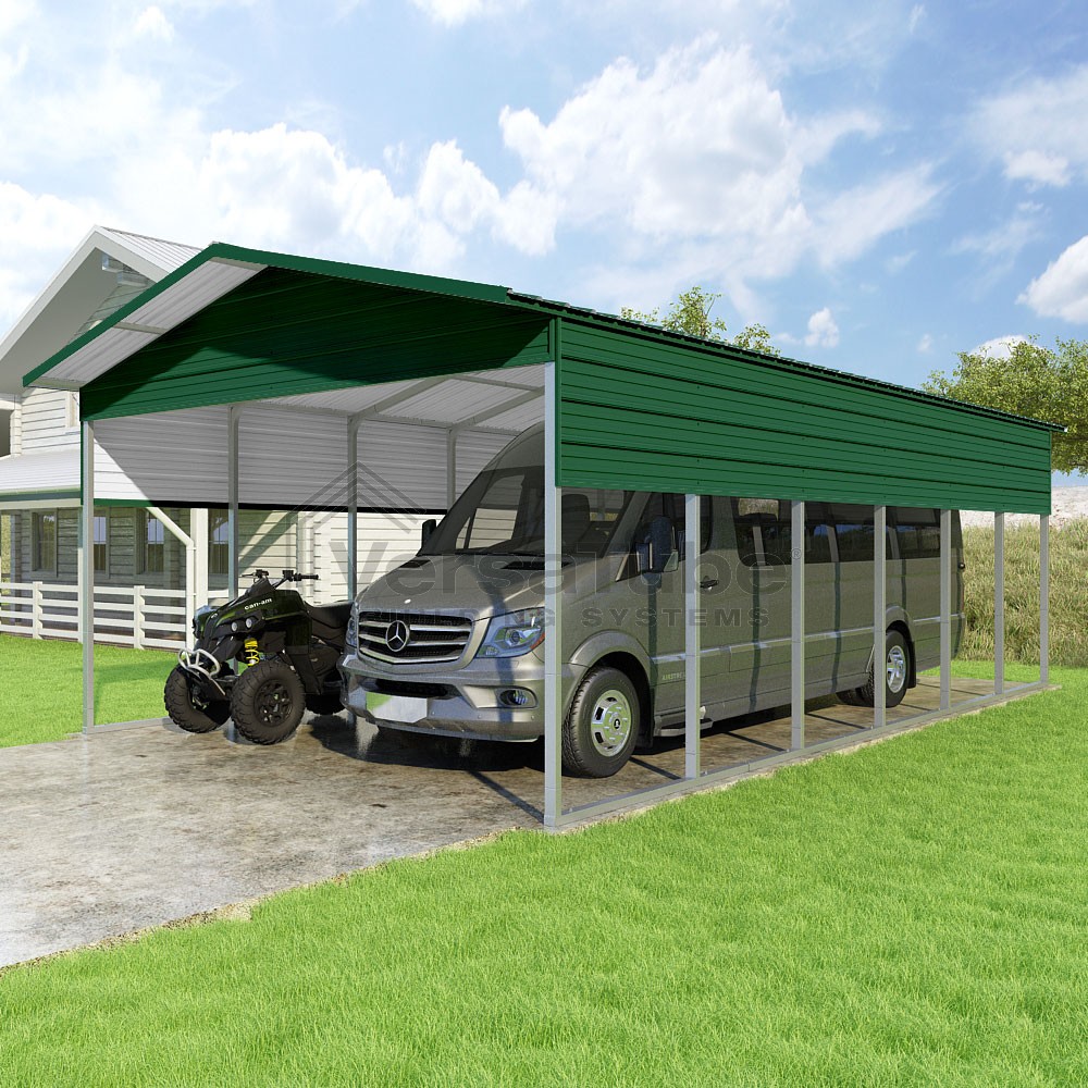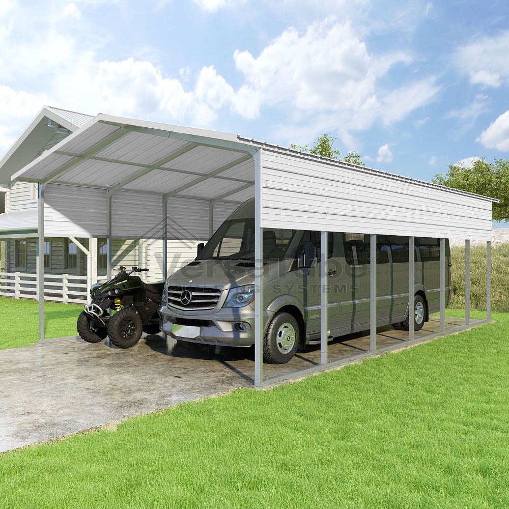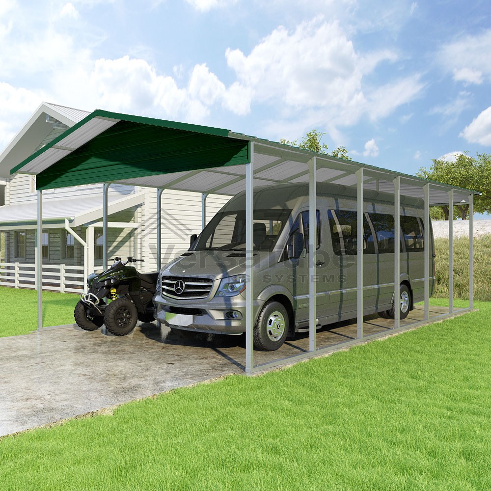 Pinnacle Series DIY carport kit features vertical sheet metal roof panels with ridge cap, gable and eave trim for an A-frame roof style and extended coverage on both ends.