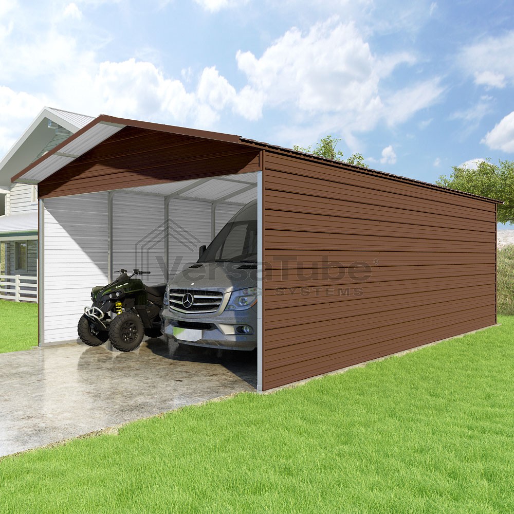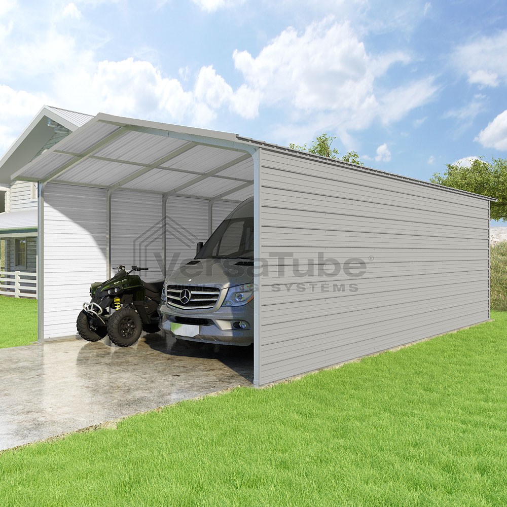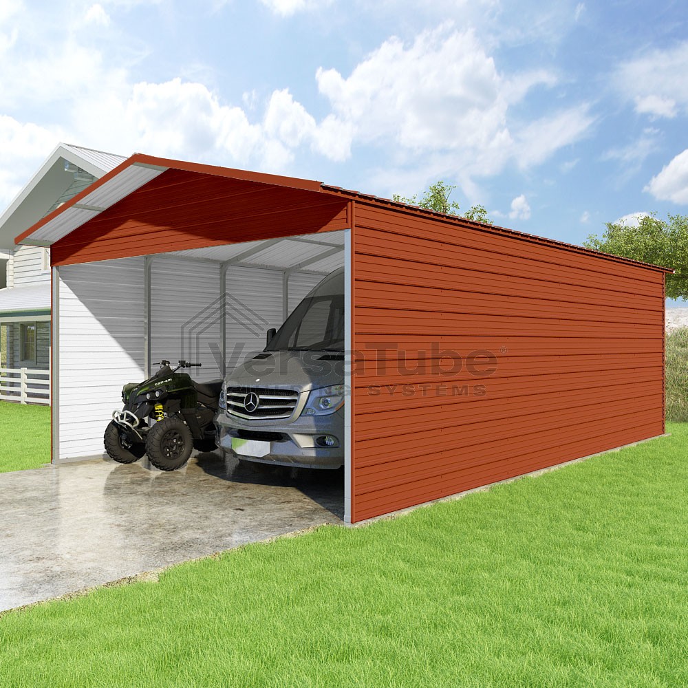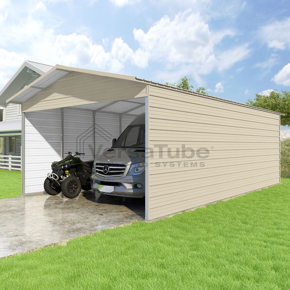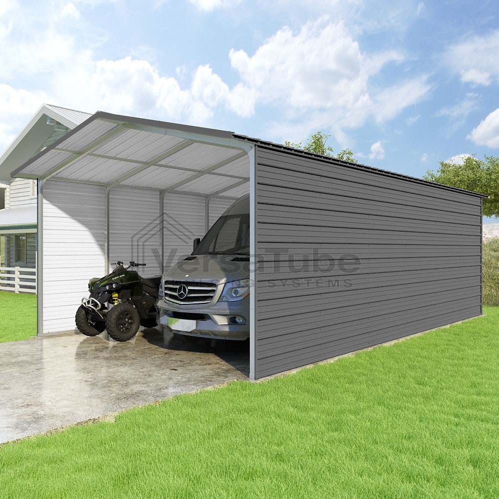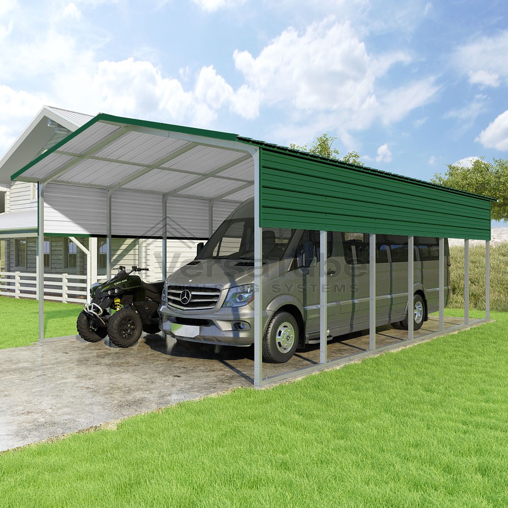 Pinnacle Series DIY carport kit features vertical sheet metal roof panels with ridge cap, gable and eave trim for an A-frame roof style and extended coverage on both ends.
