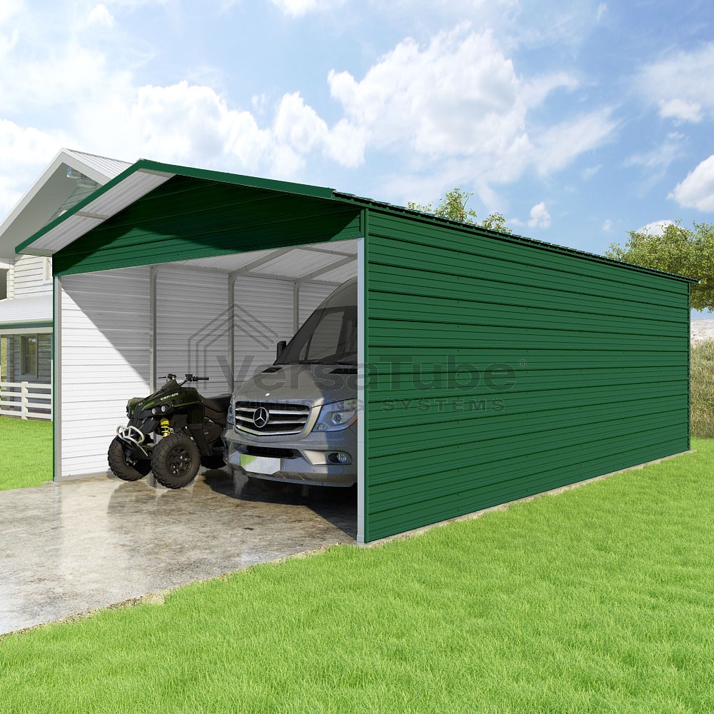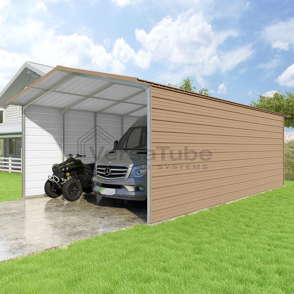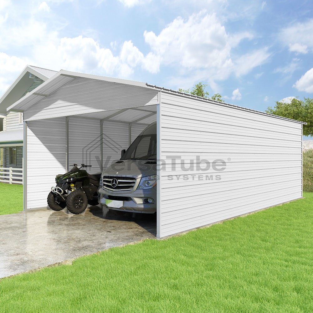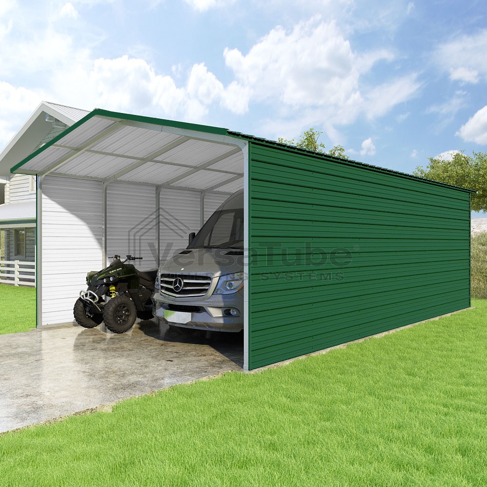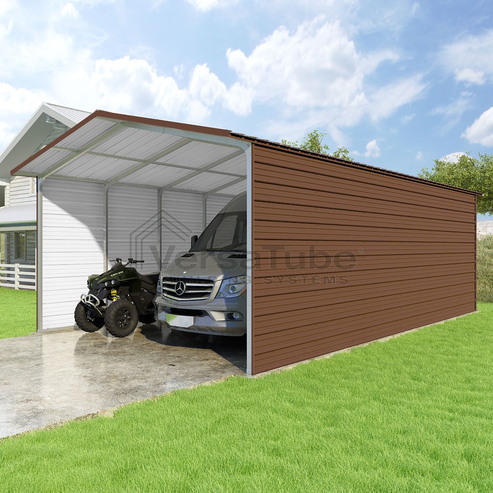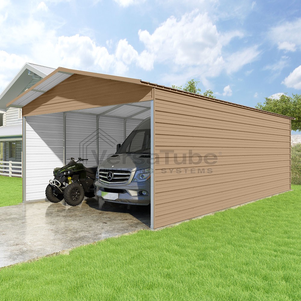 Pinnacle Series DIY carport kit features vertical sheet metal roof panels with ridge cap, gable and eave trim for an A-frame roof style and extended coverage on both ends.