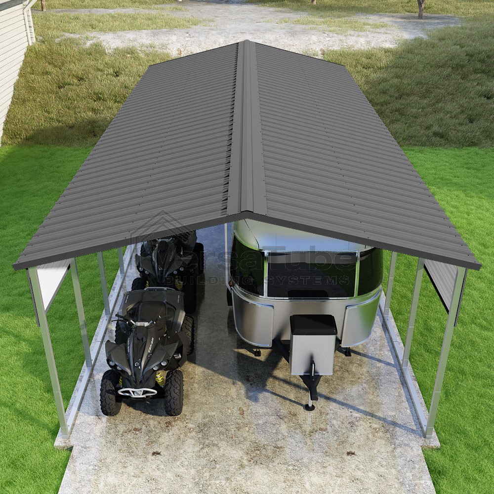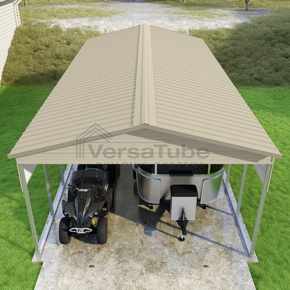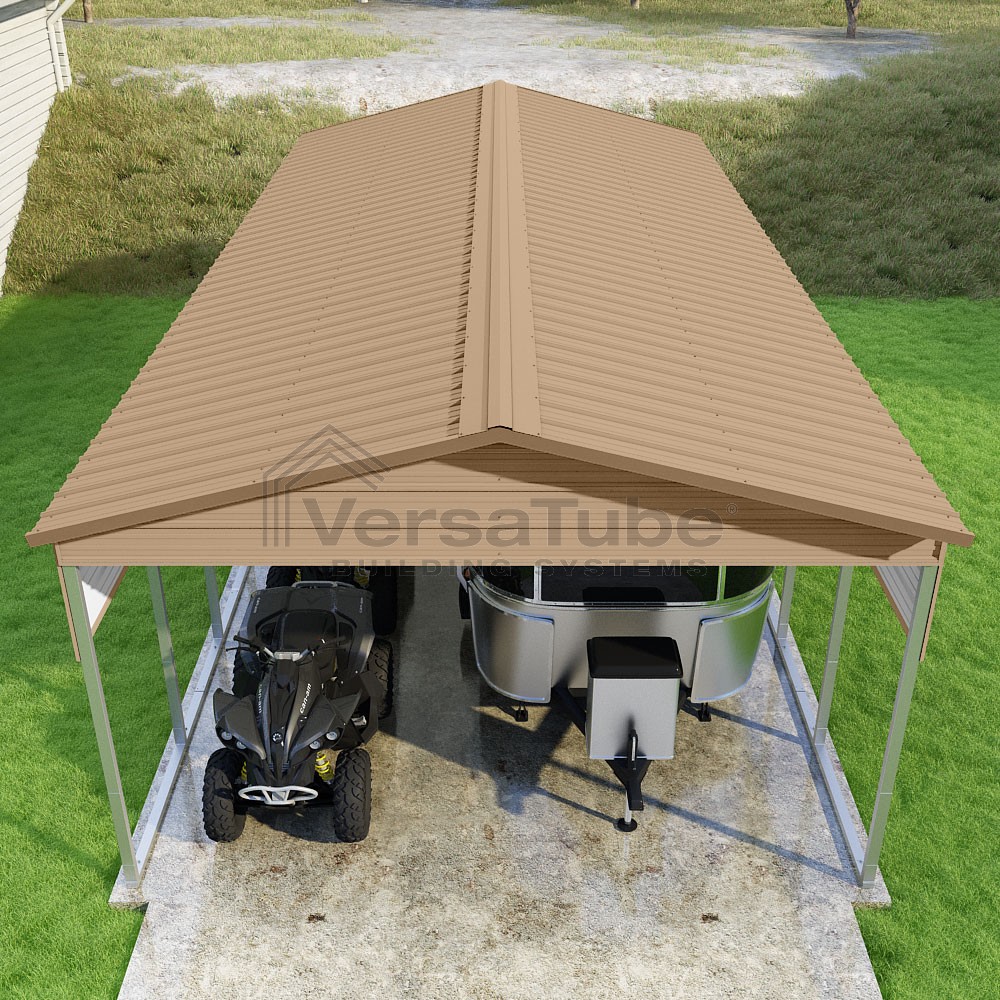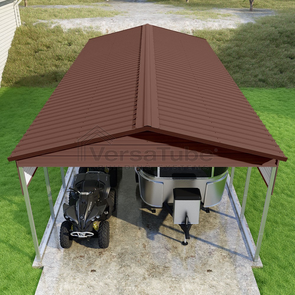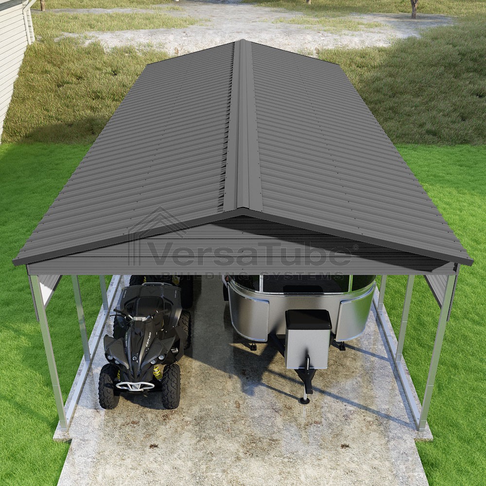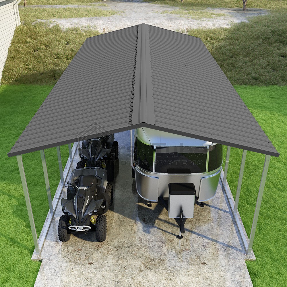 Pinnacle Series DIY carport kit features vertical sheet metal roof panels with ridge cap, gable and eave trim for an A-frame roof style and extended coverage on both ends.