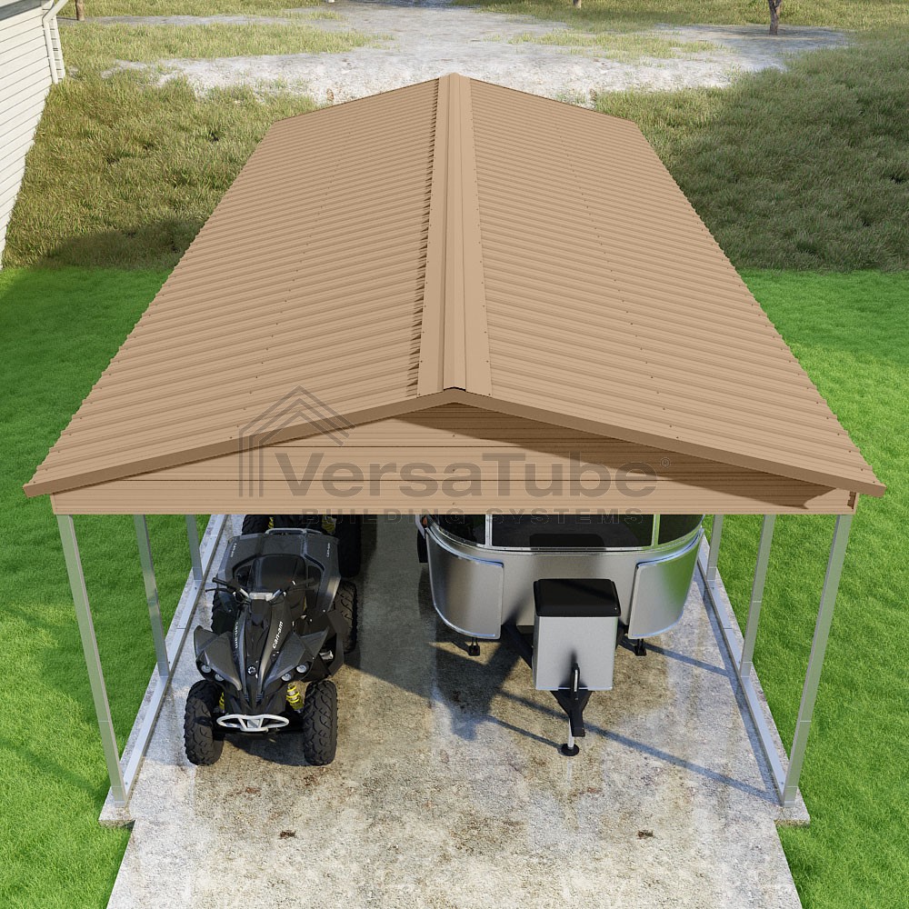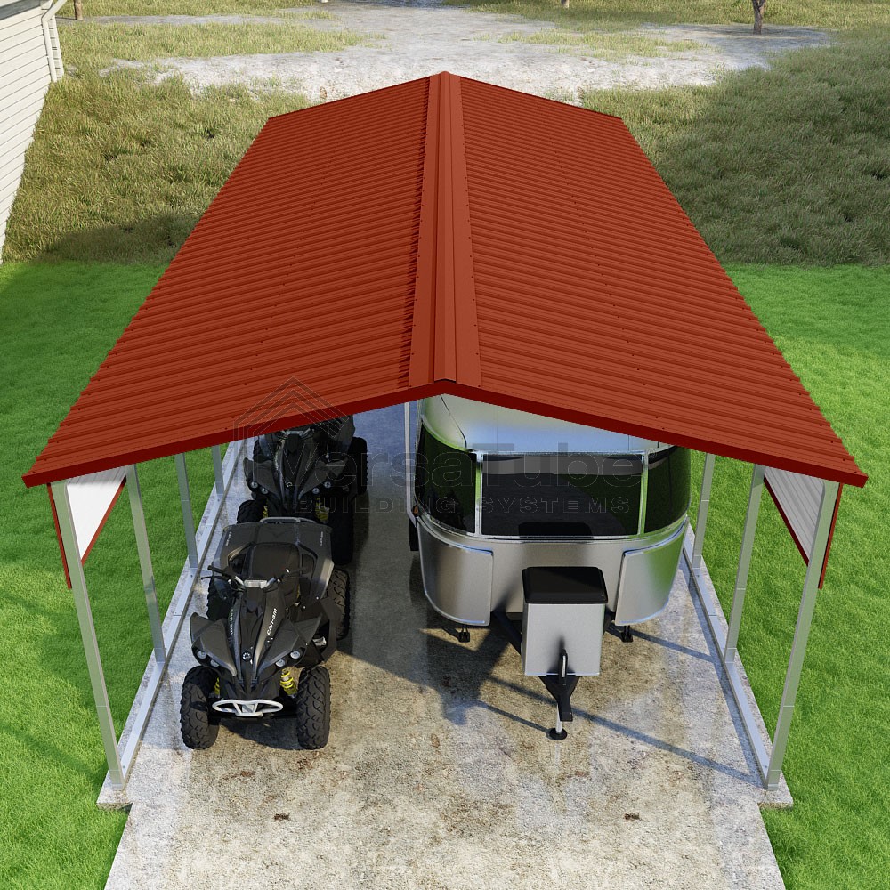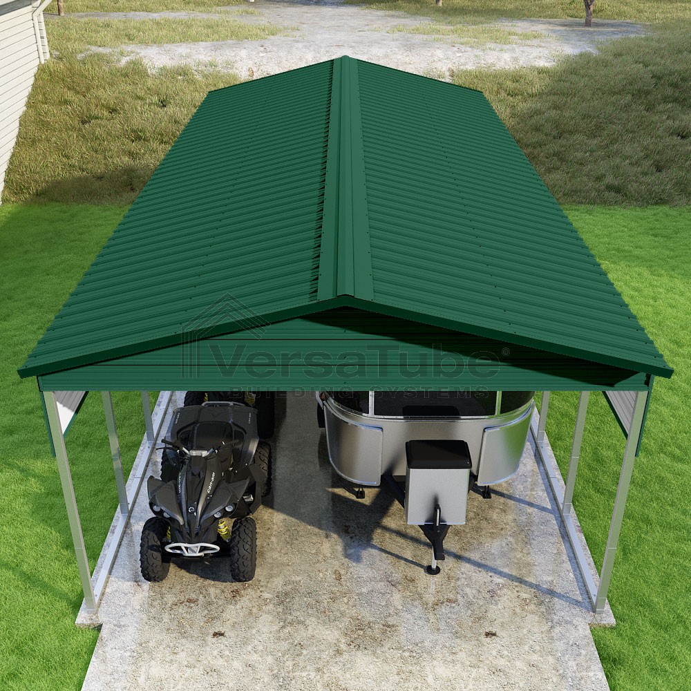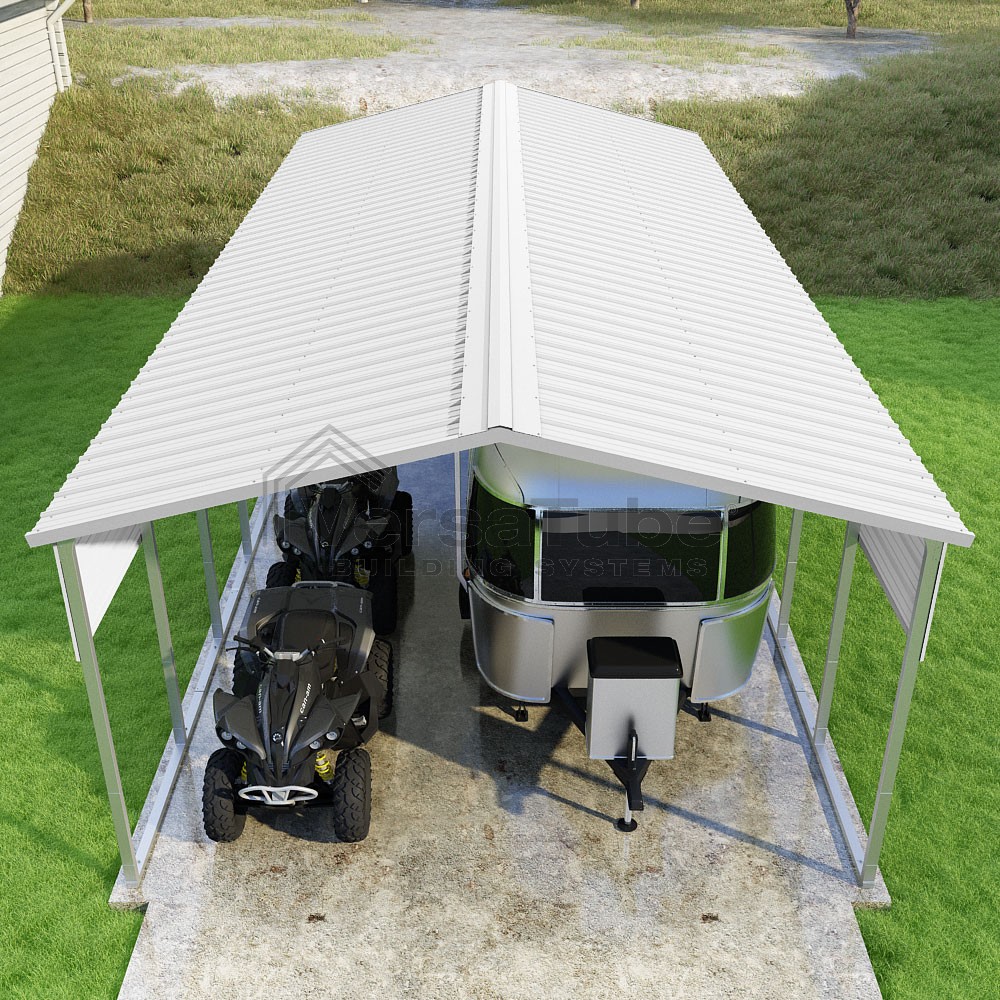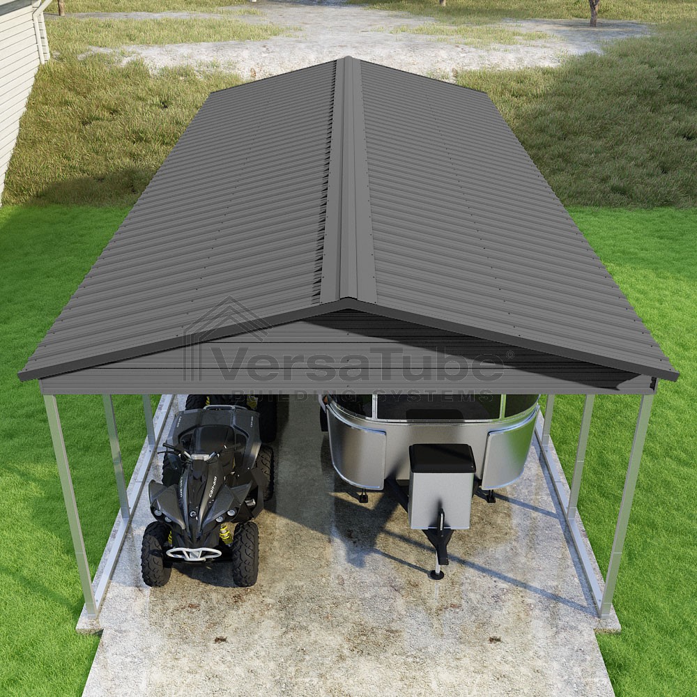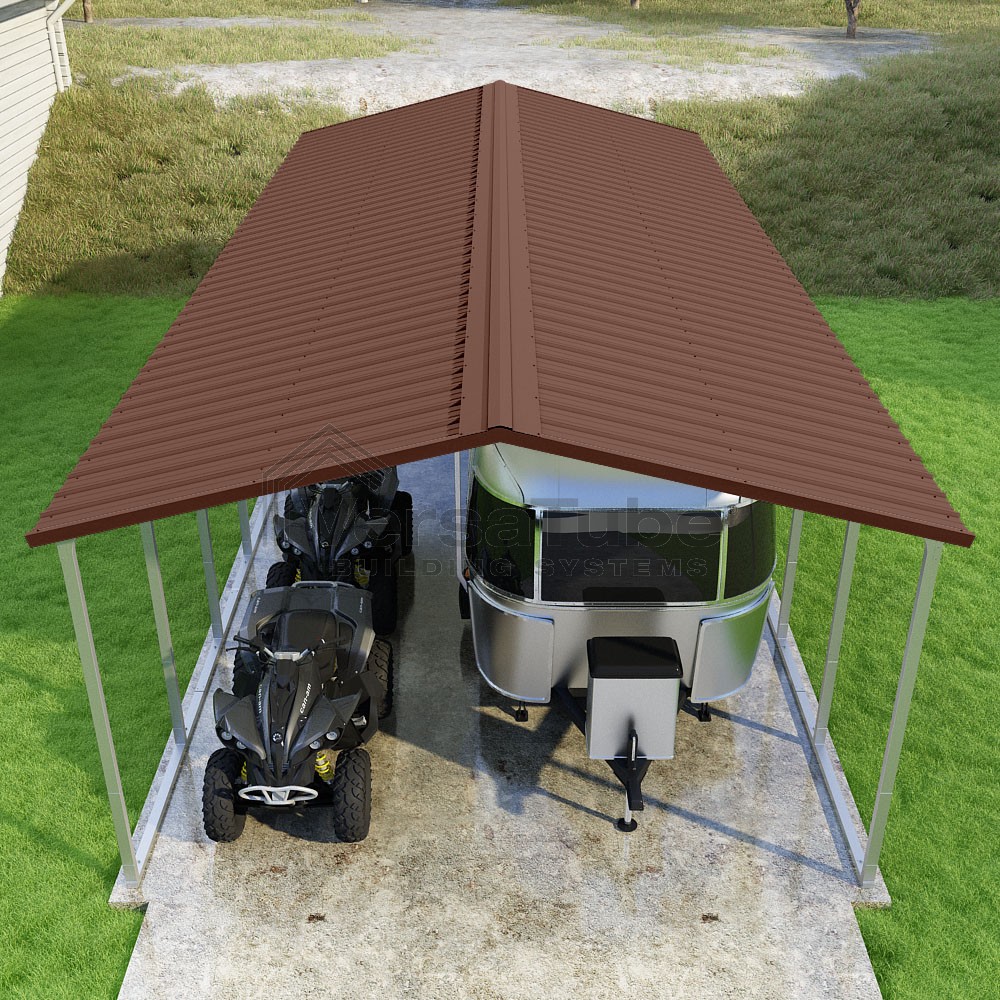 Pinnacle Series DIY carport kit features vertical sheet metal roof panels with ridge cap, gable and eave trim for an A-frame roof style and extended coverage on both ends.