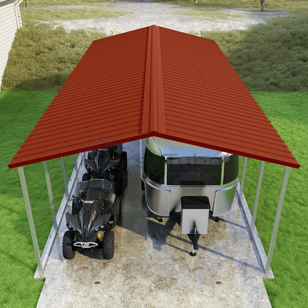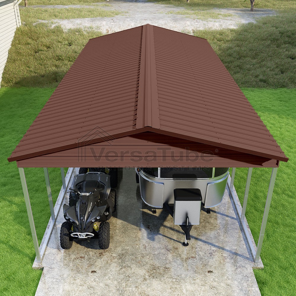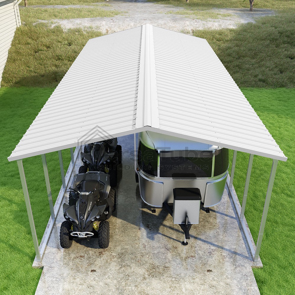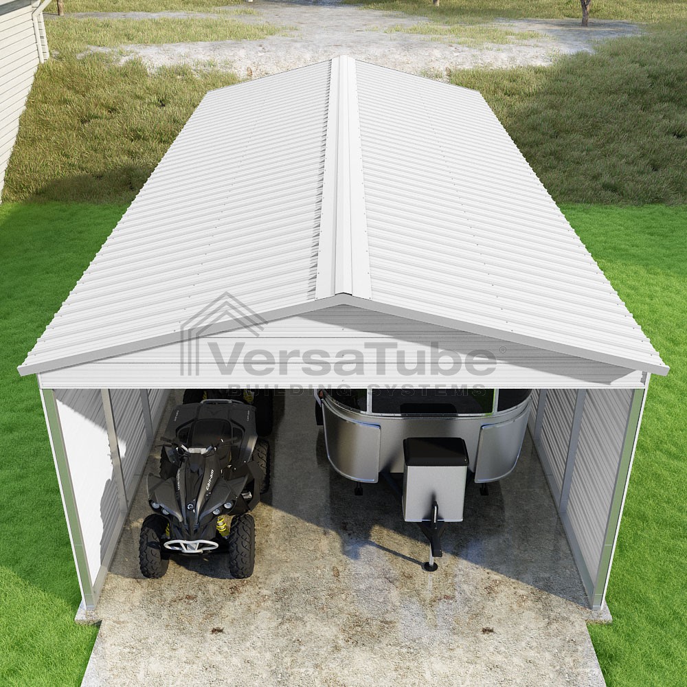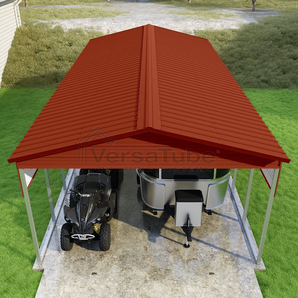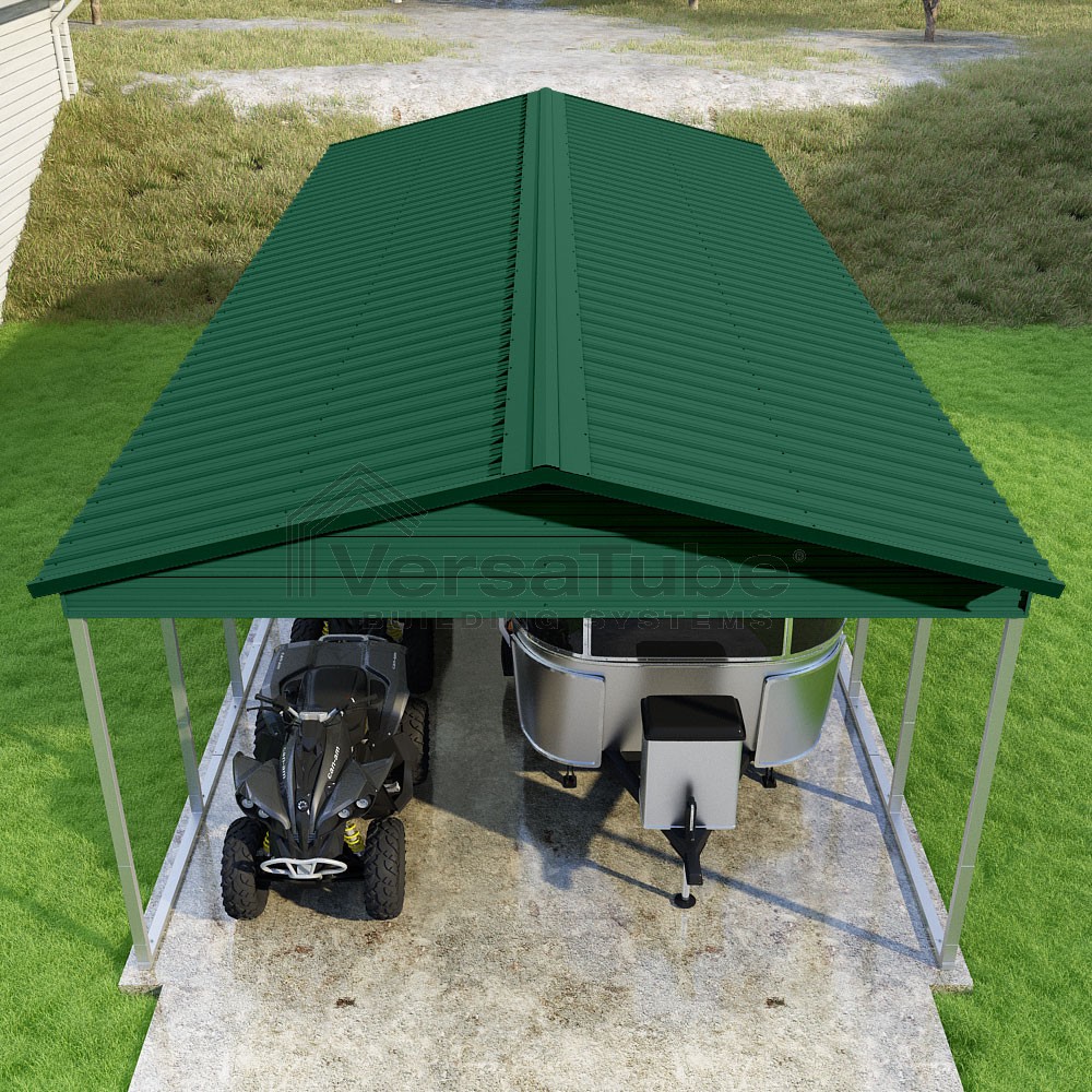 Pinnacle Series DIY carport kit features vertical sheet metal roof panels with ridge cap, gable and eave trim for an A-frame roof style and extended coverage on both ends.