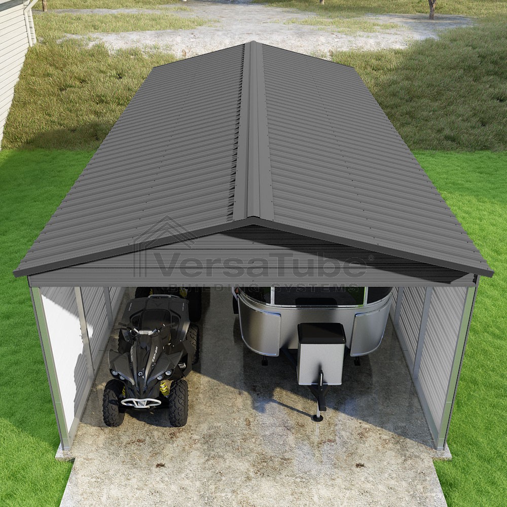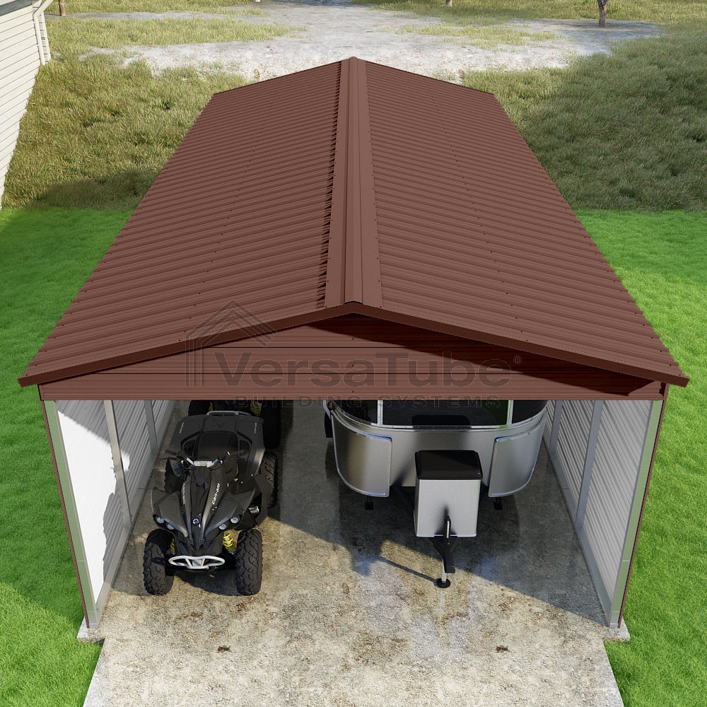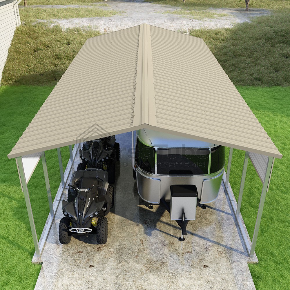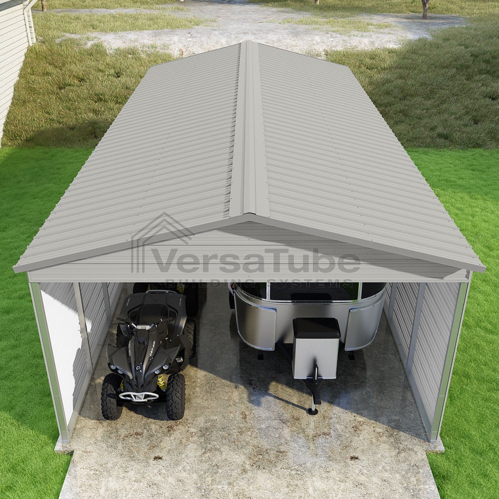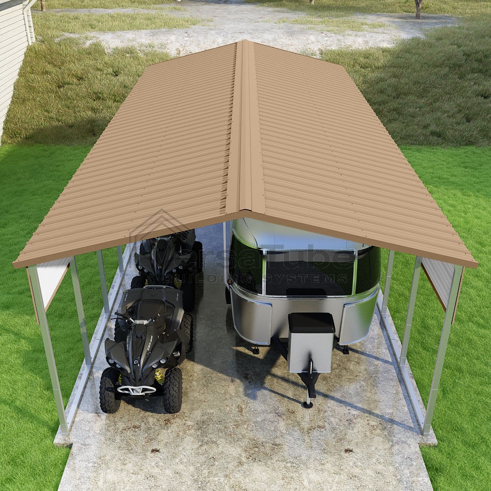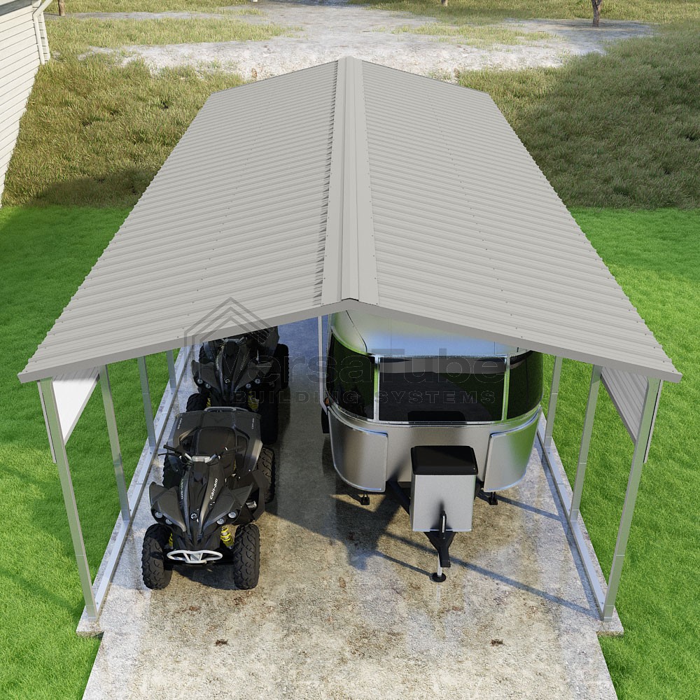 Pinnacle Series DIY carport kit features vertical sheet metal roof panels with ridge cap, gable and eave trim for an A-frame roof style and extended coverage on both ends.