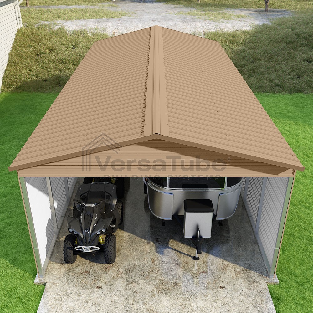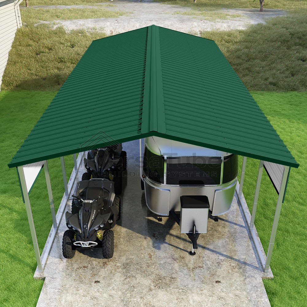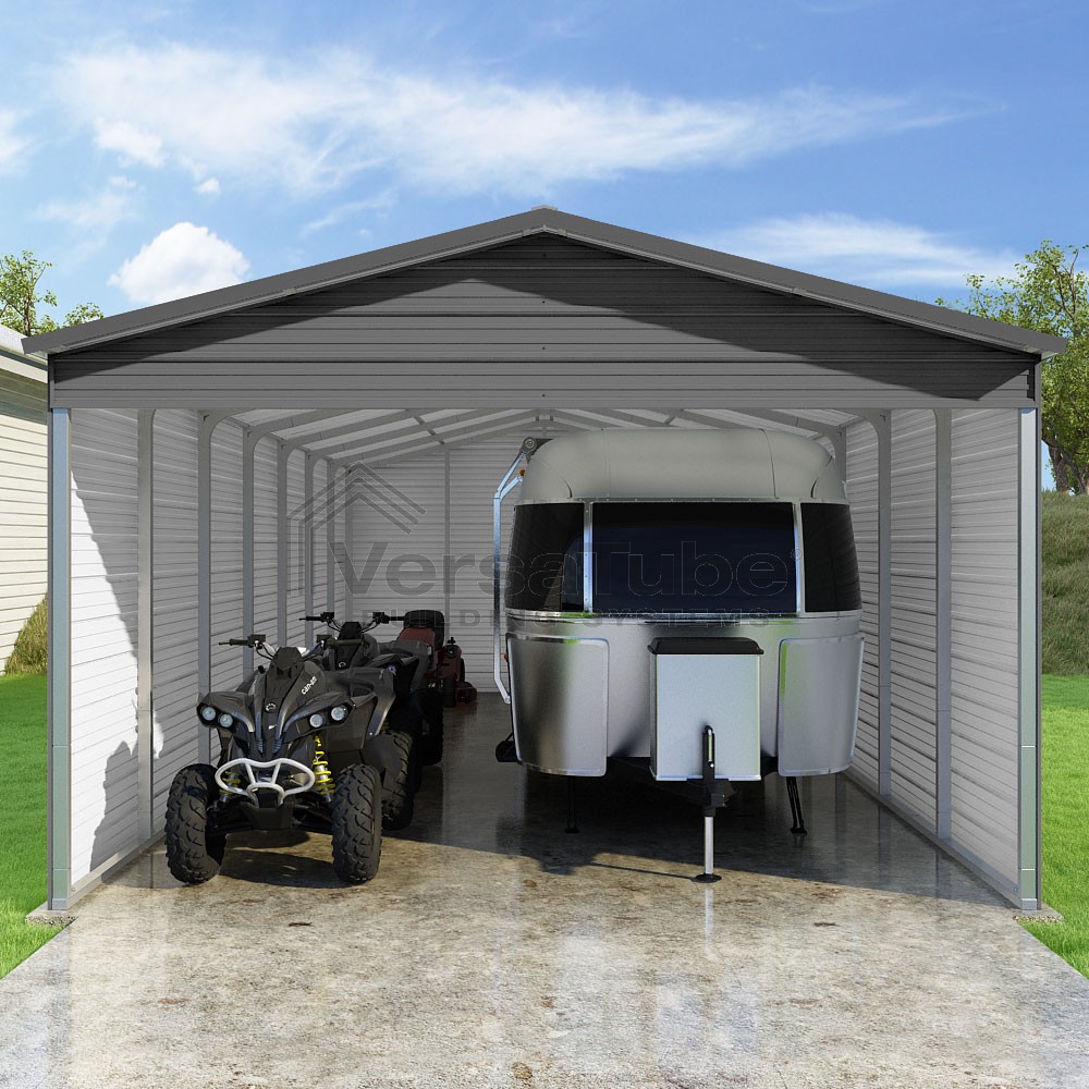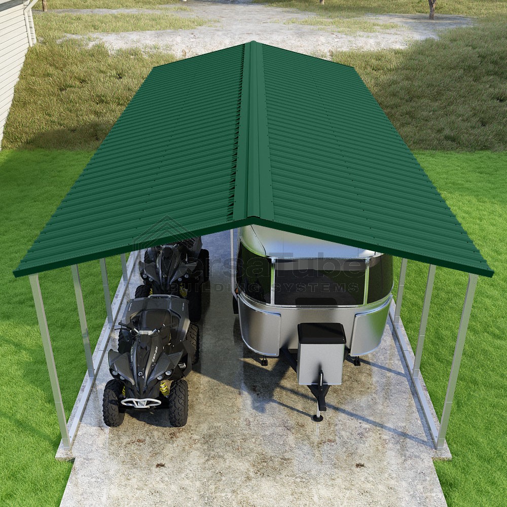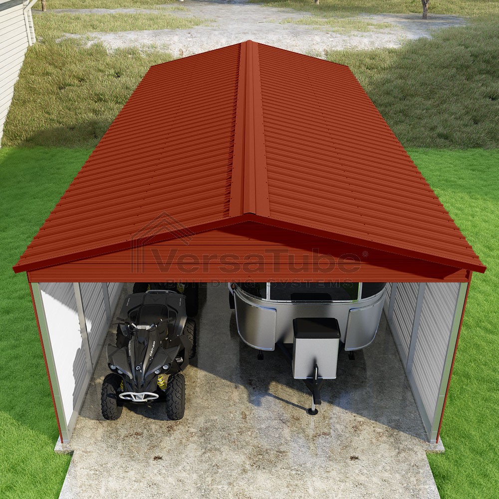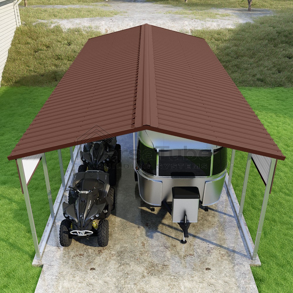 Pinnacle Series DIY carport kit features vertical sheet metal roof panels with ridge cap, gable and eave trim for an A-frame roof style and extended coverage on both ends.
