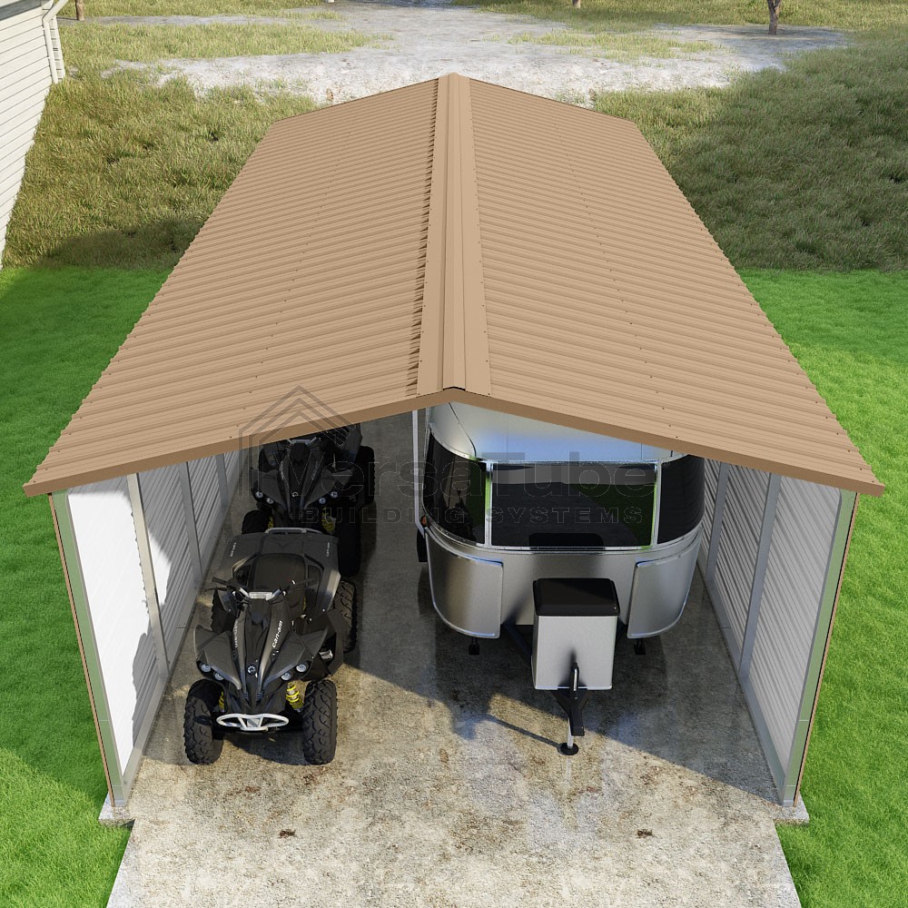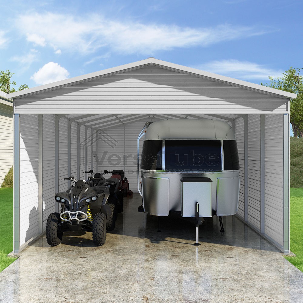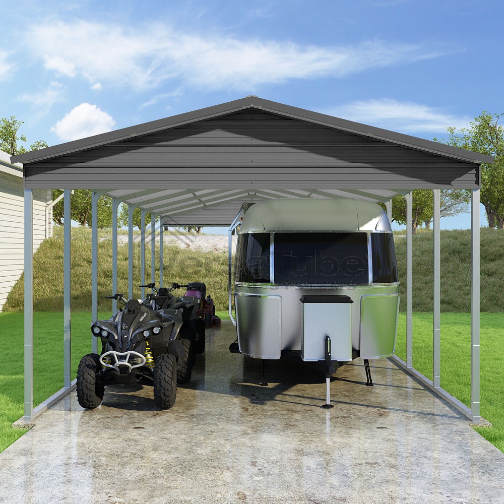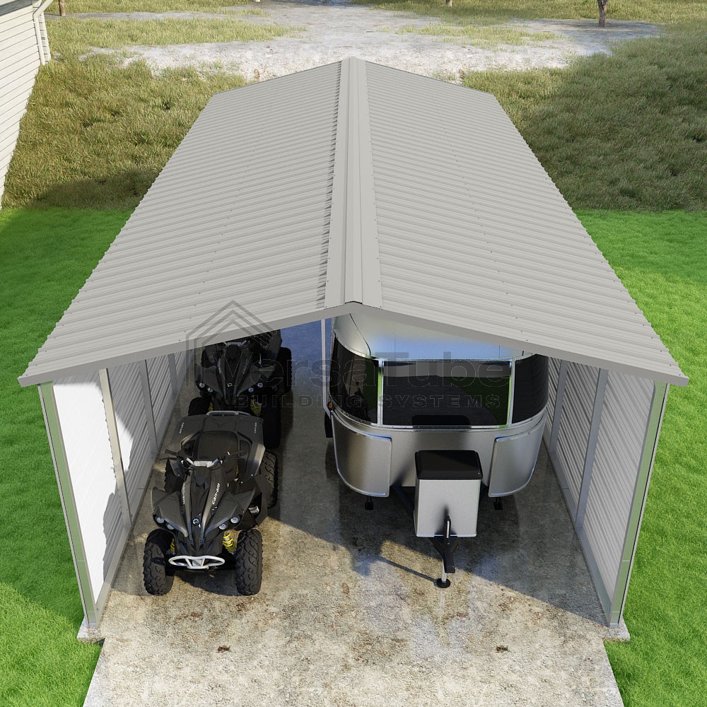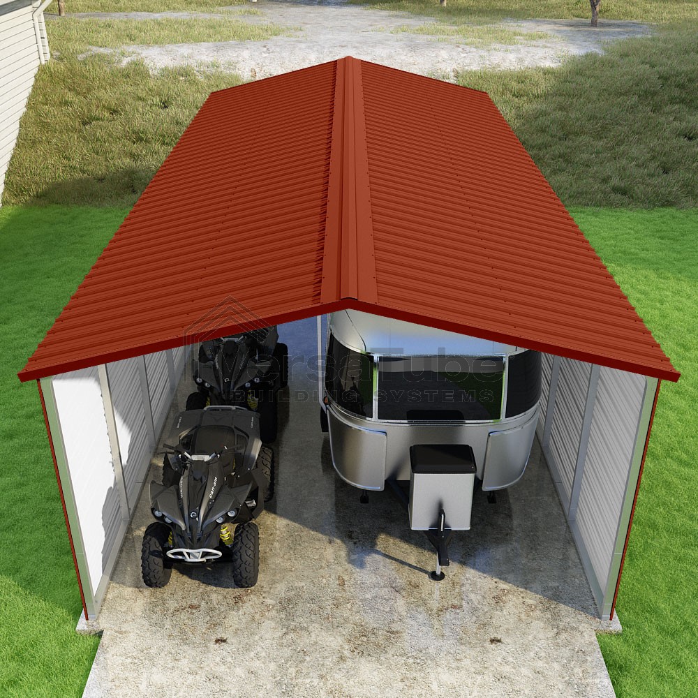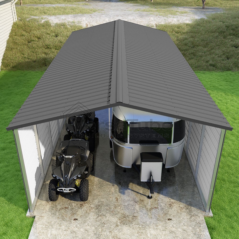Pinnacle Series DIY carport kit features vertical sheet metal roof panels with ridge cap, gable and eave trim for an A-frame roof style and extended coverage on both ends.