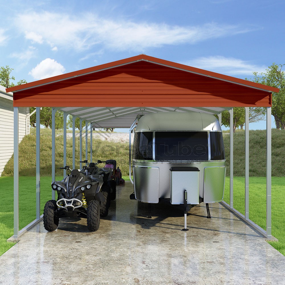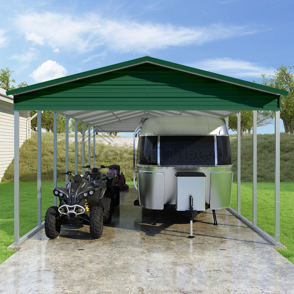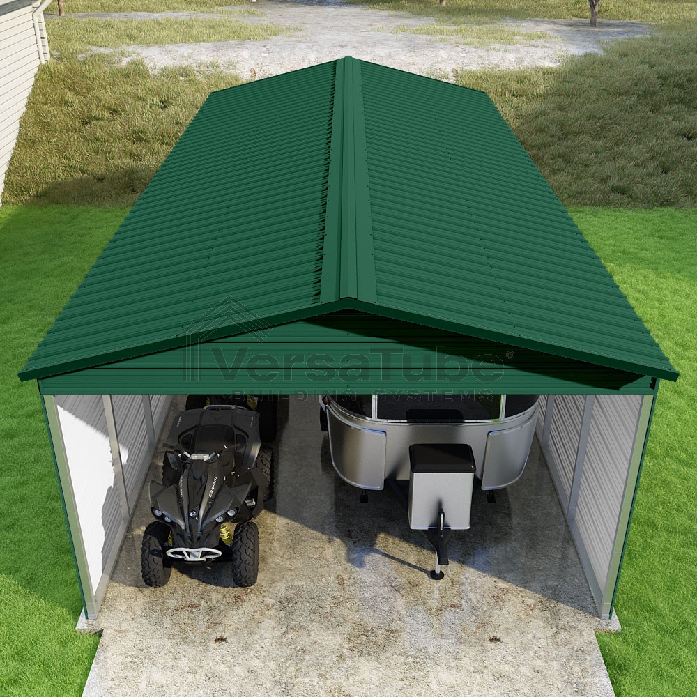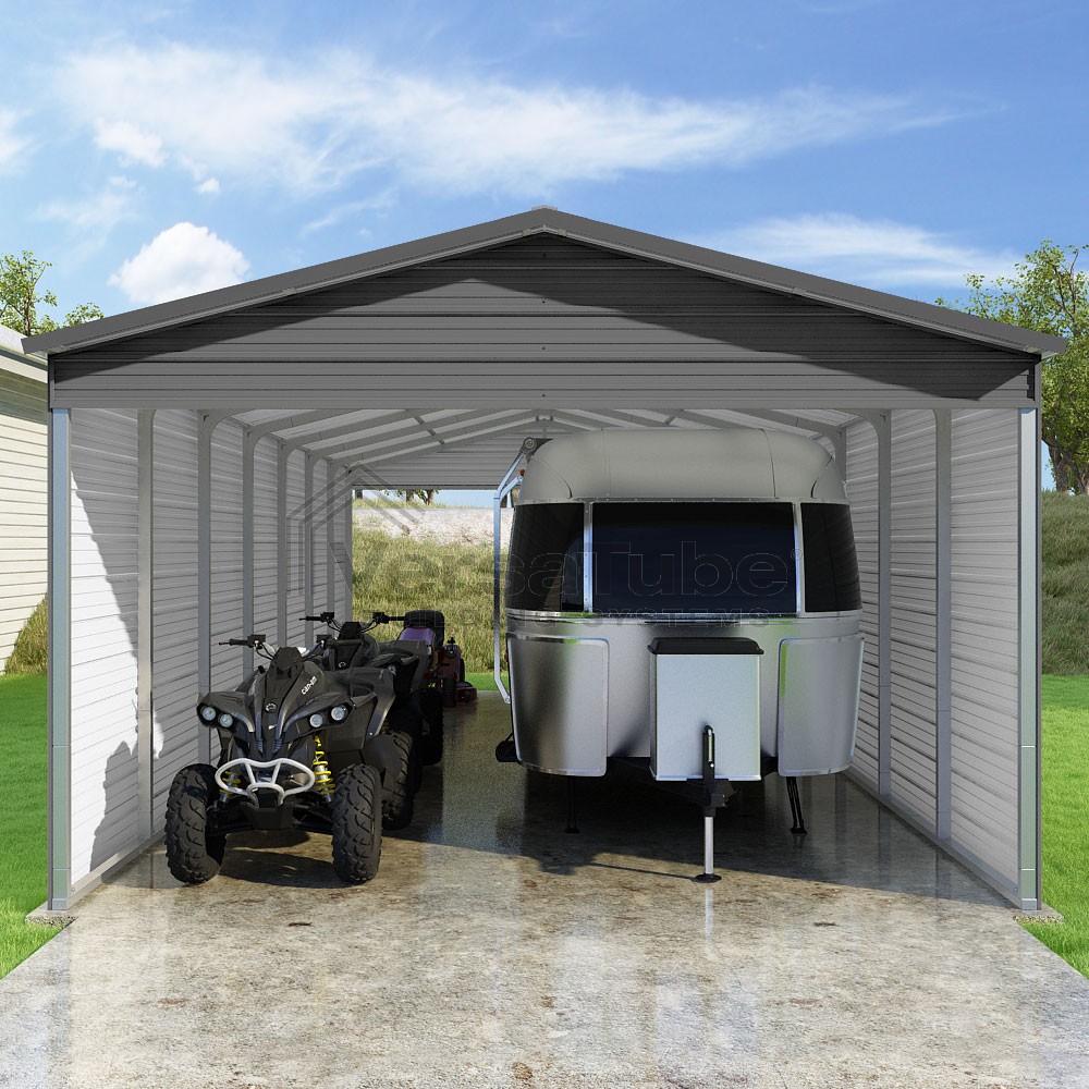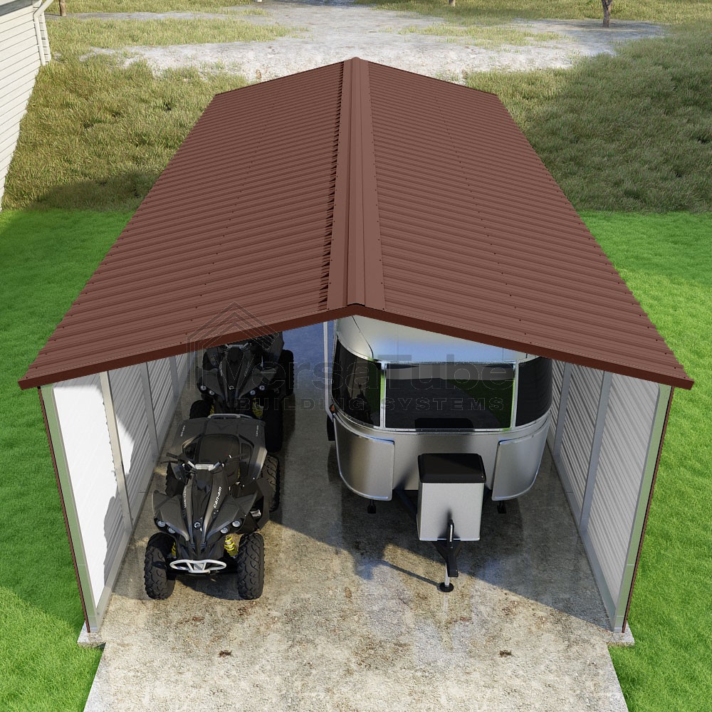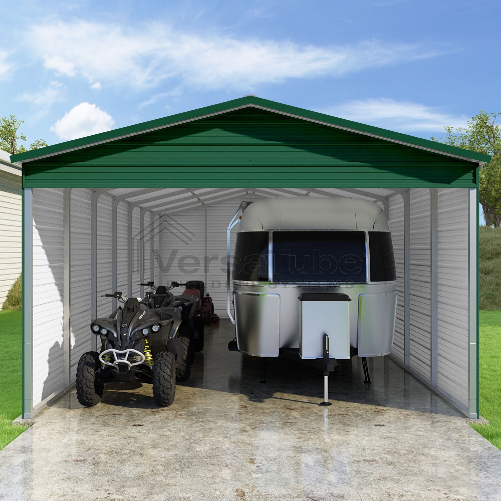 Pinnacle Series DIY carport kit features vertical sheet metal roof panels with ridge cap, gable and eave trim for an A-frame roof style and extended coverage on both ends.
