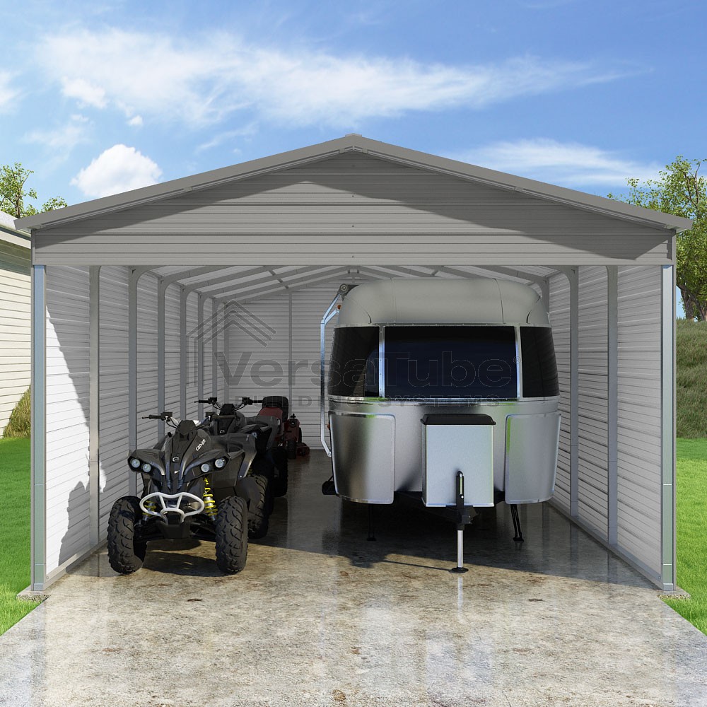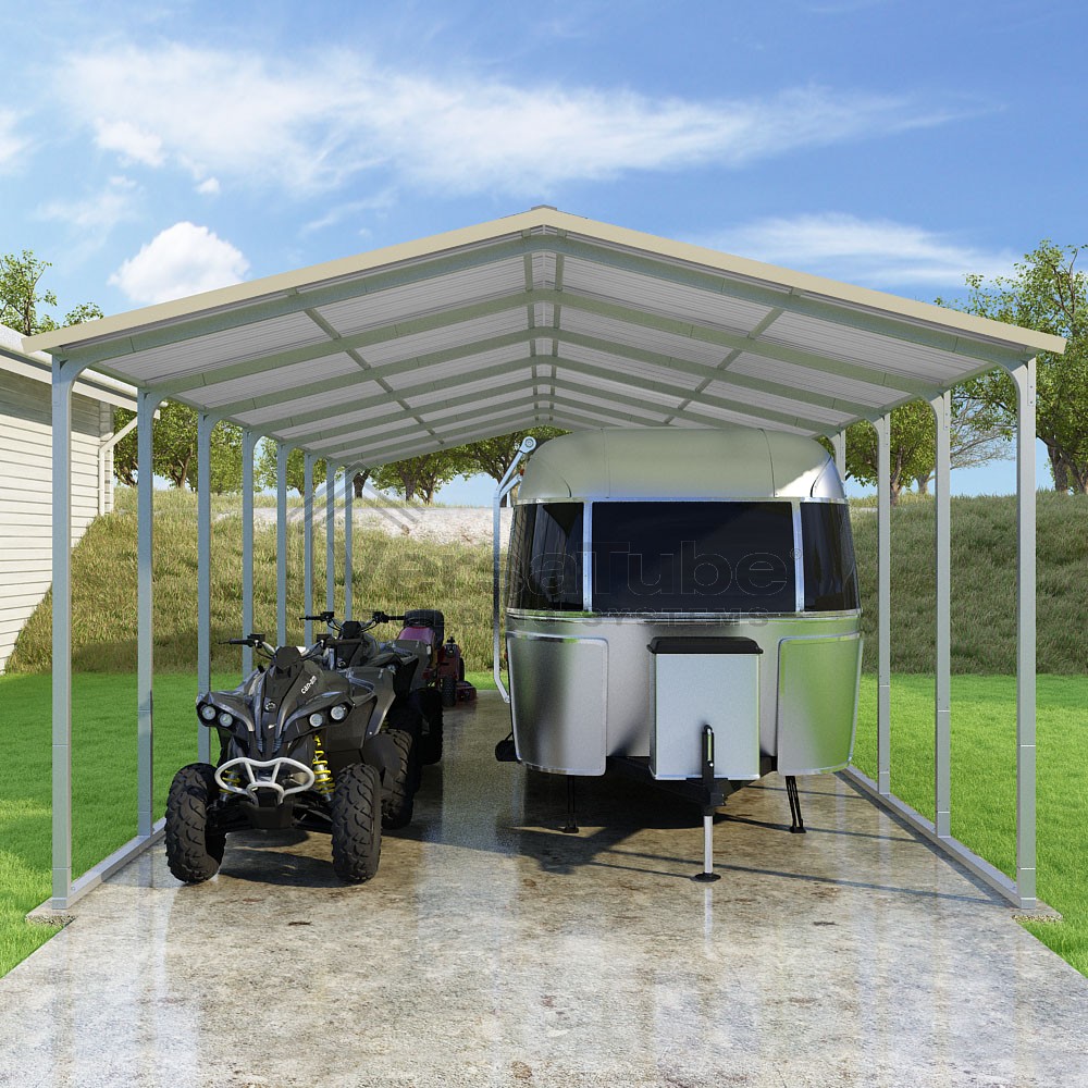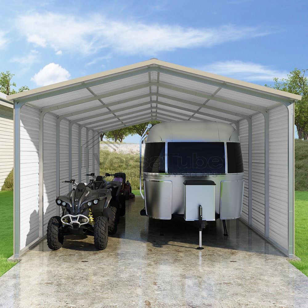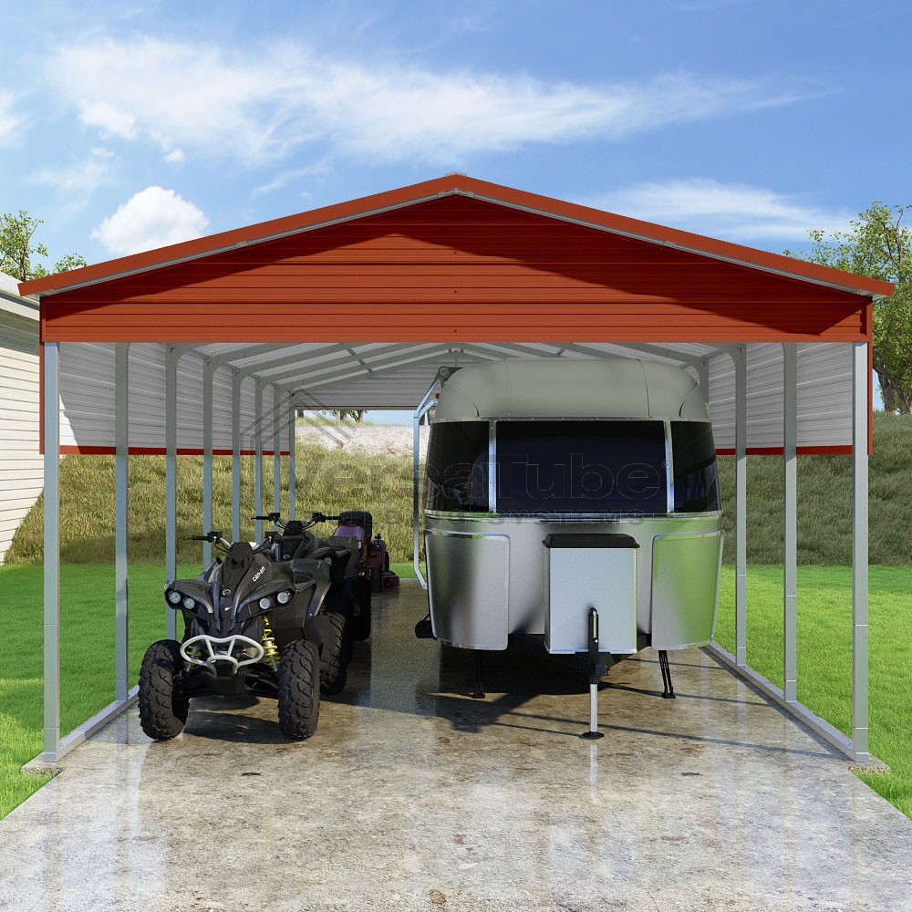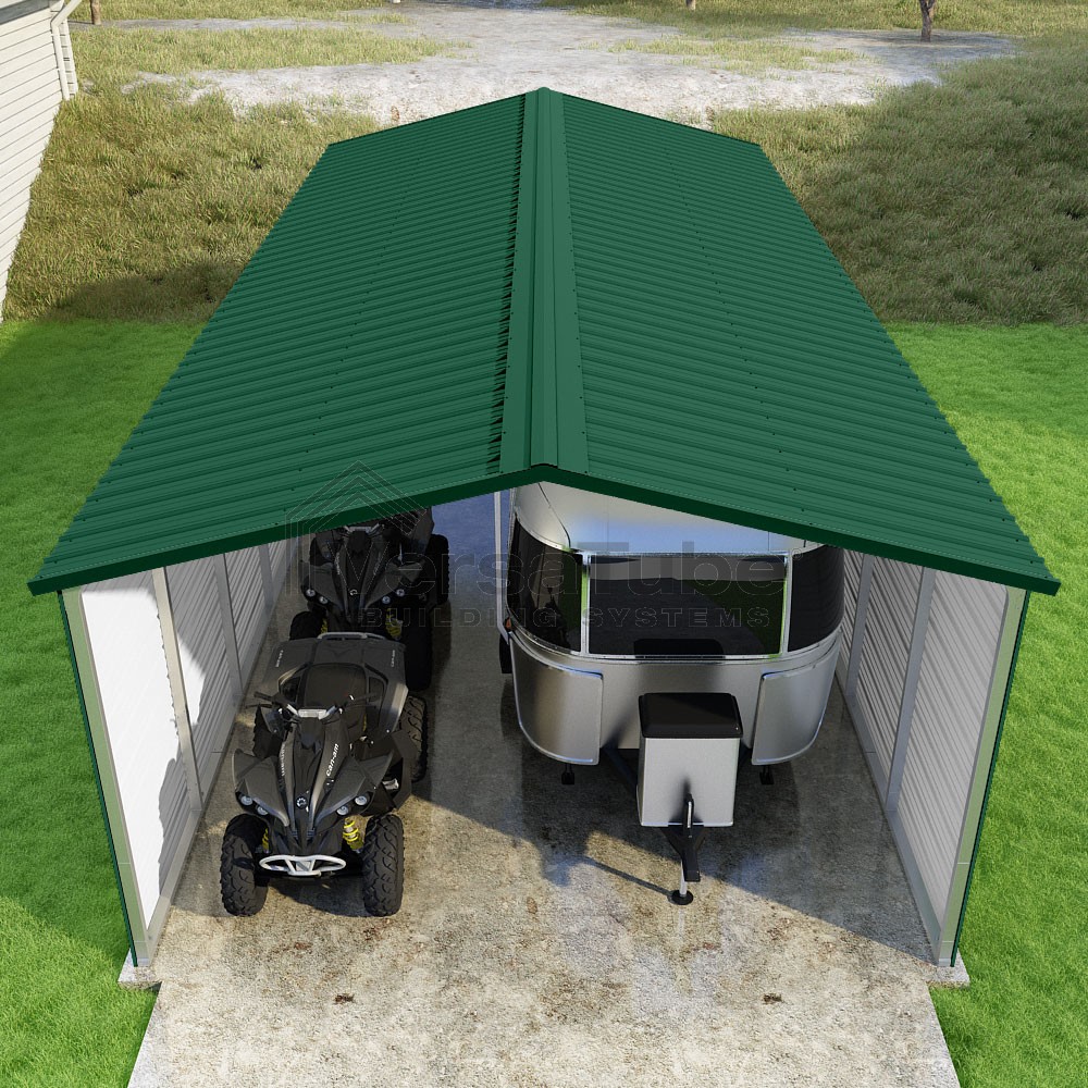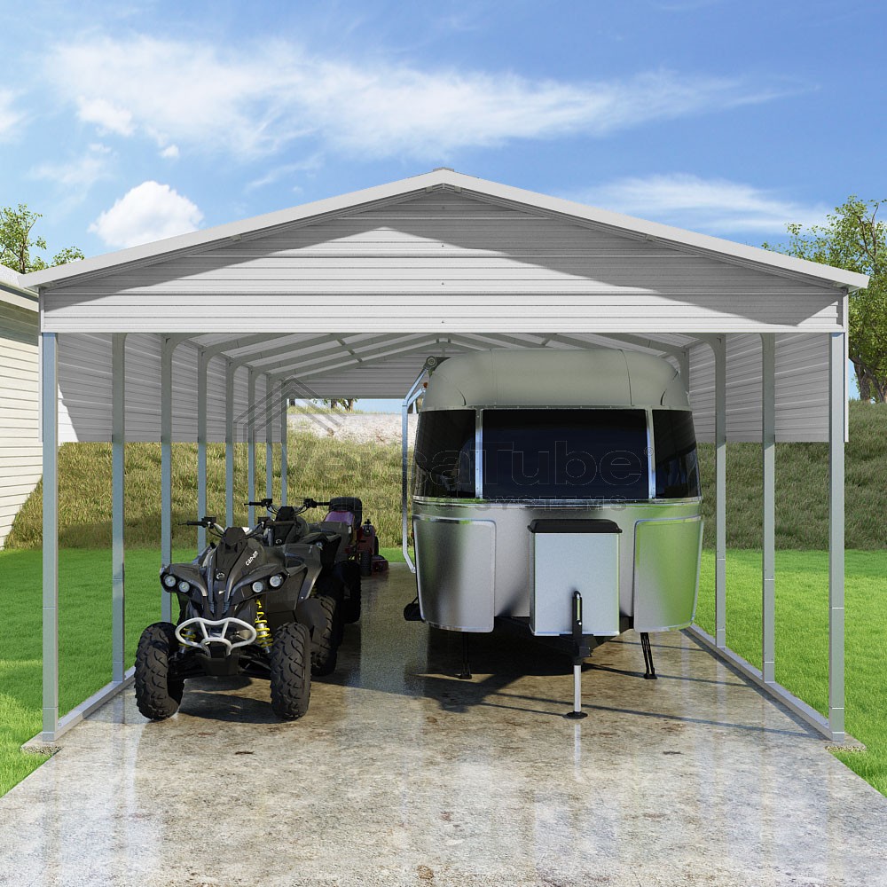 Pinnacle Series DIY carport kit features vertical sheet metal roof panels with ridge cap, gable and eave trim for an A-frame roof style and extended coverage on both ends.