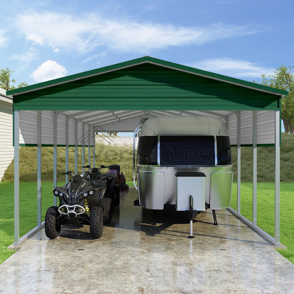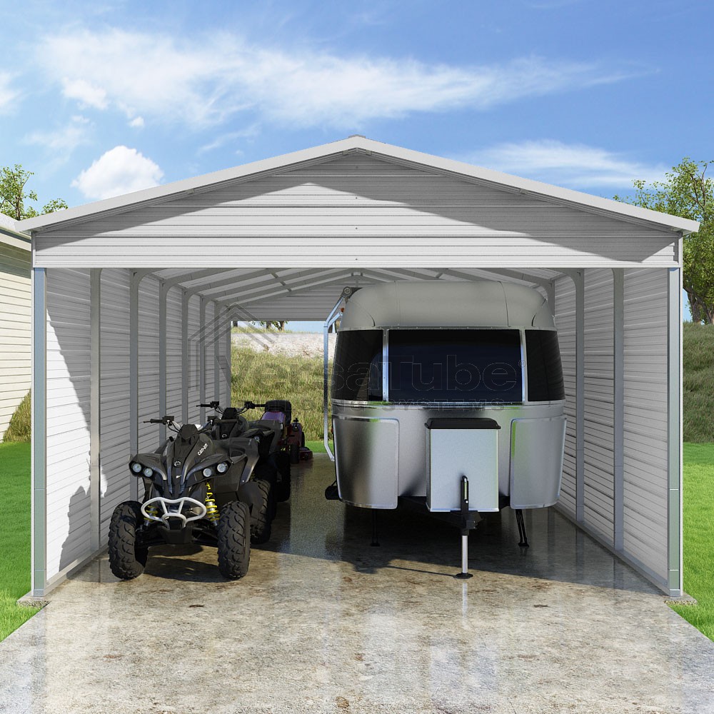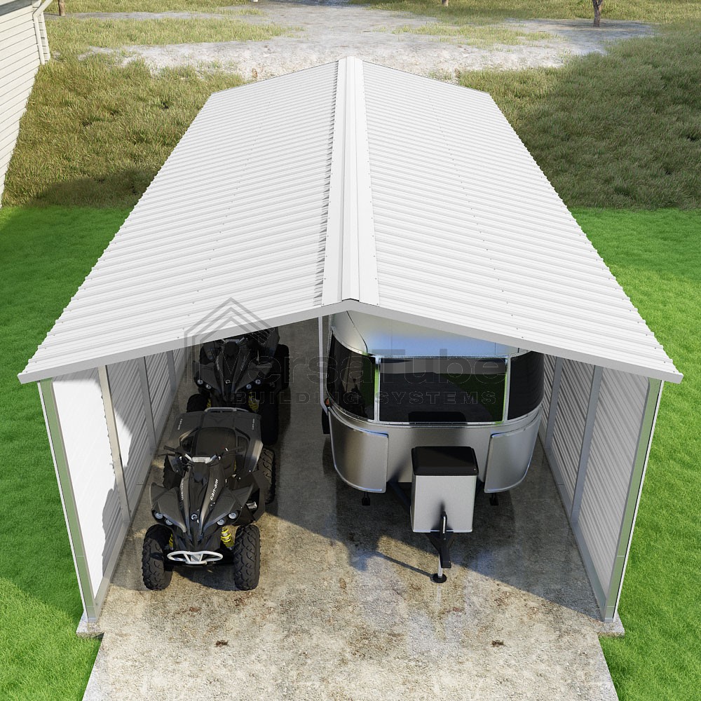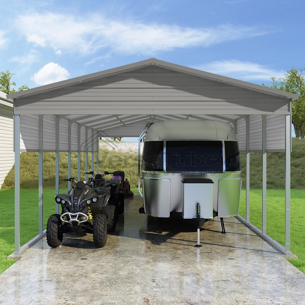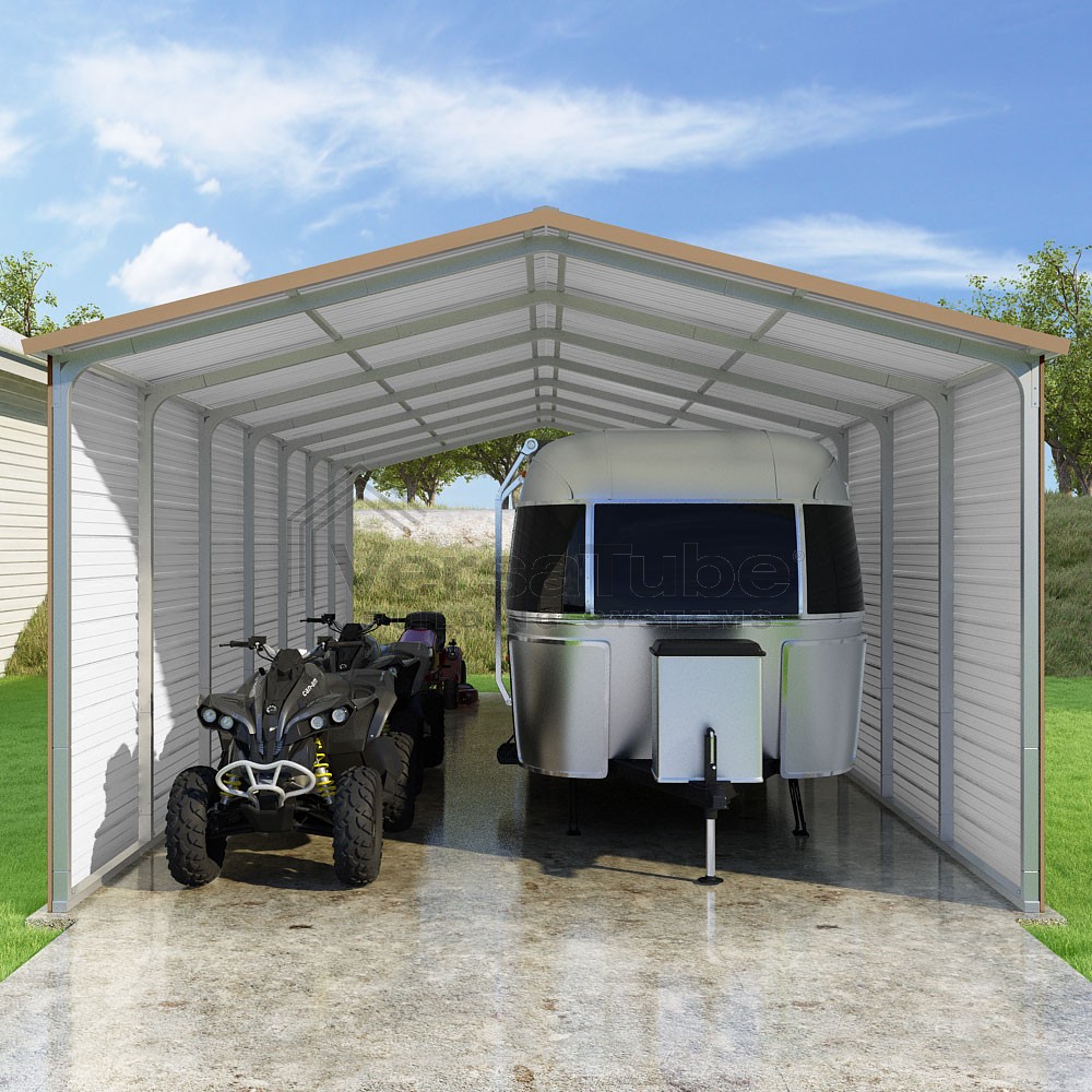 Pinnacle Series DIY carport kit features vertical sheet metal roof panels with ridge cap, gable and eave trim for an A-frame roof style and extended coverage on both ends.