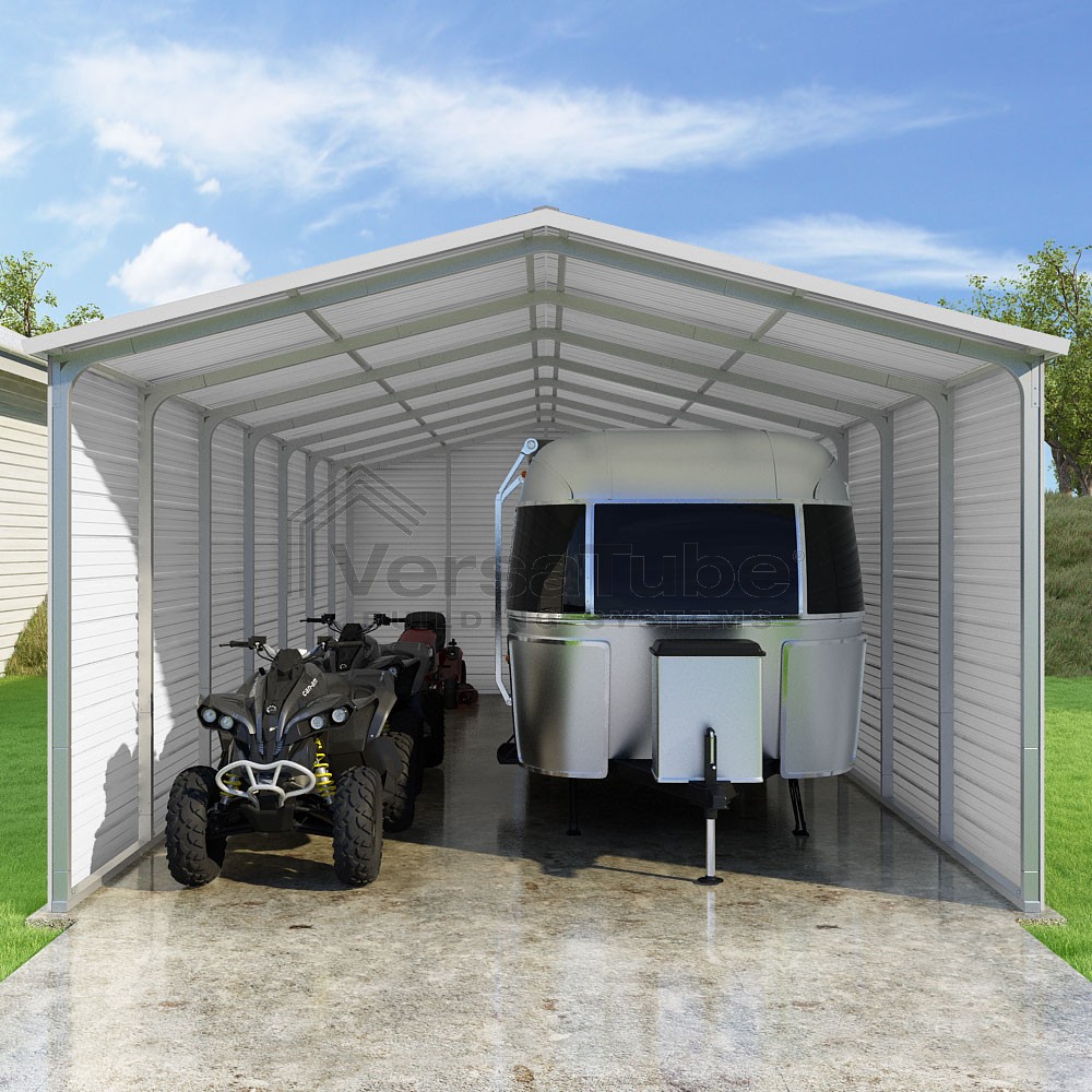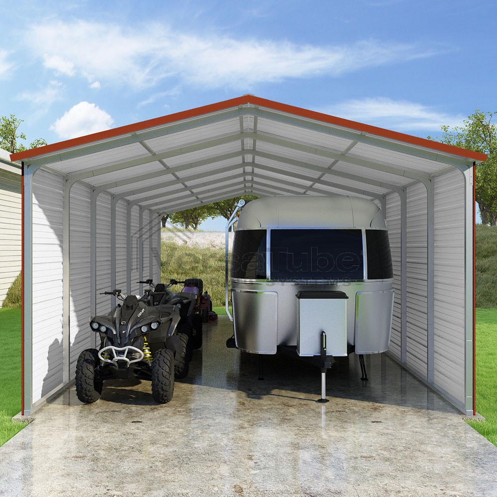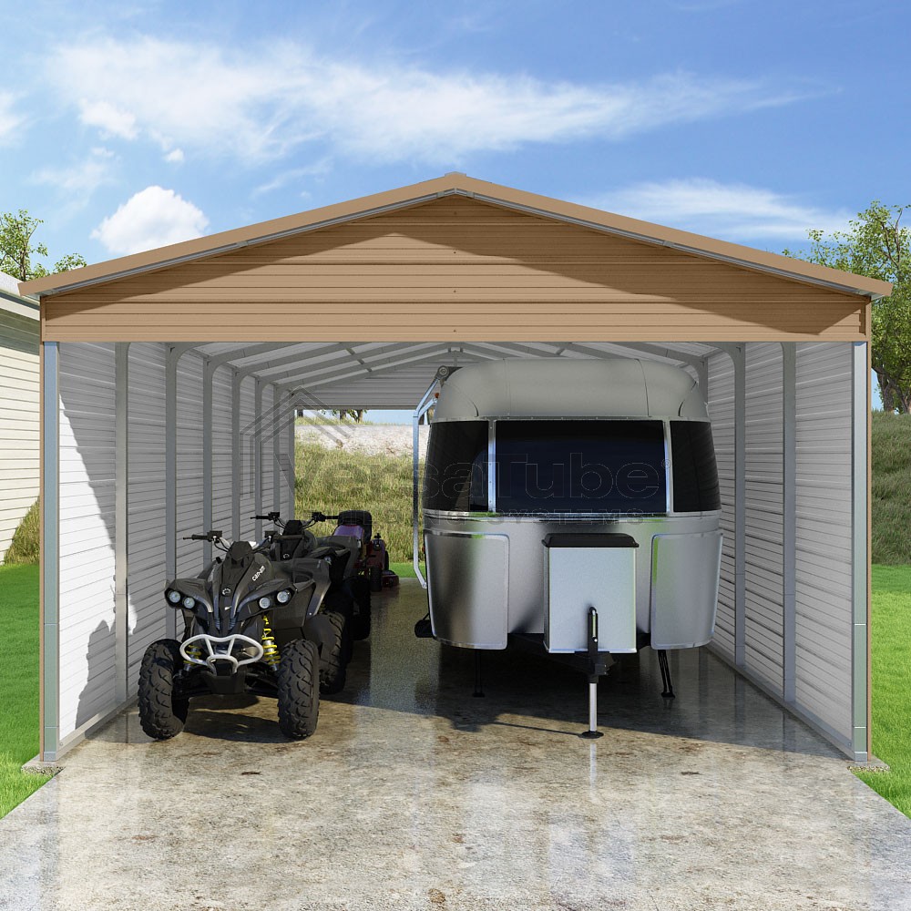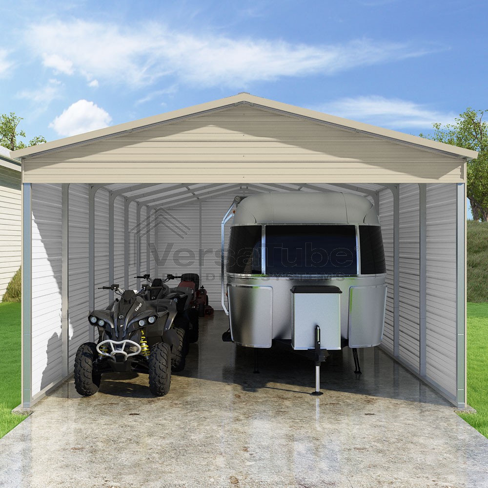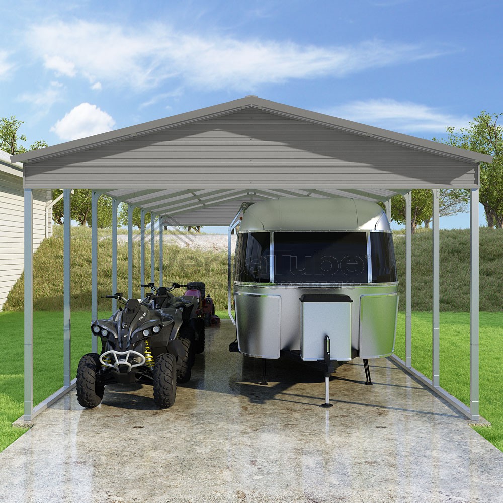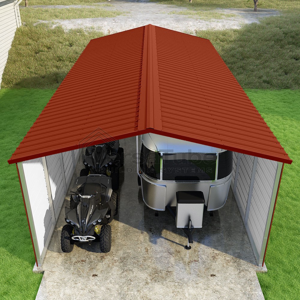 Pinnacle Series DIY carport kit features vertical sheet metal roof panels with ridge cap, gable and eave trim for an A-frame roof style and extended coverage on both ends.