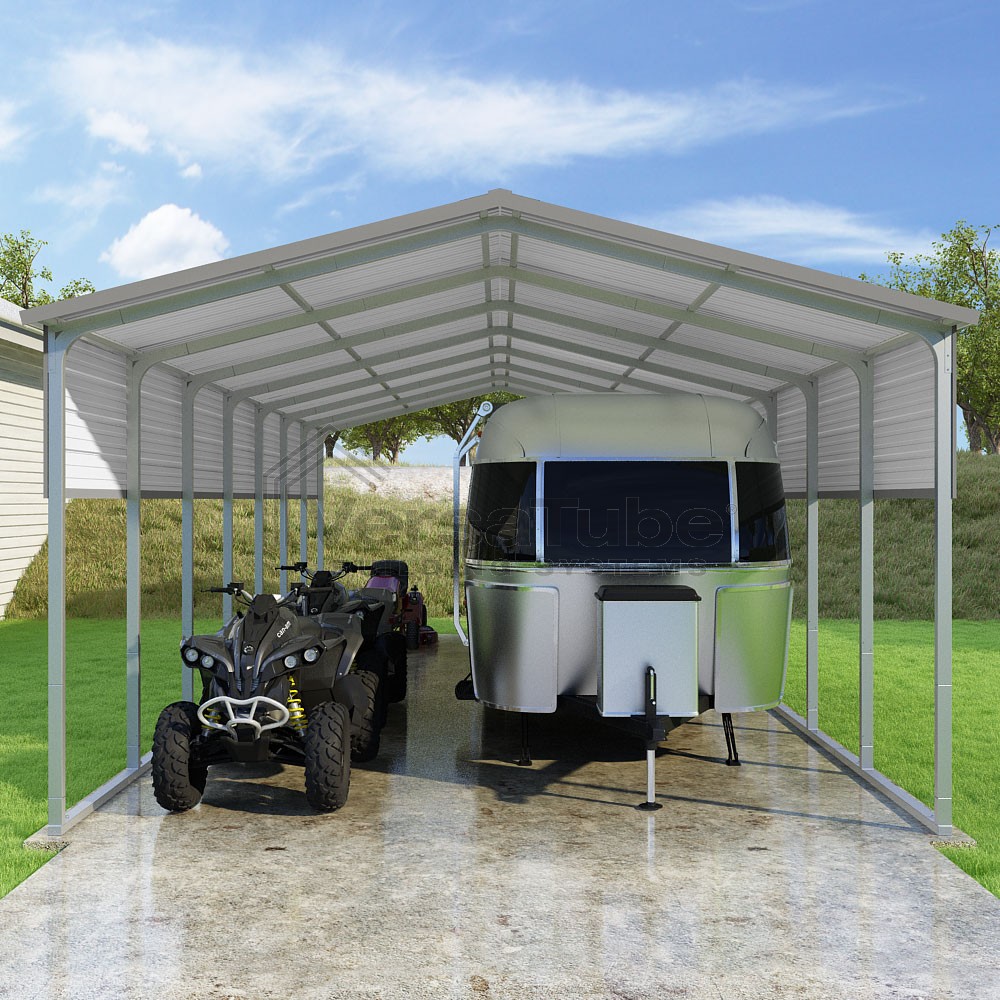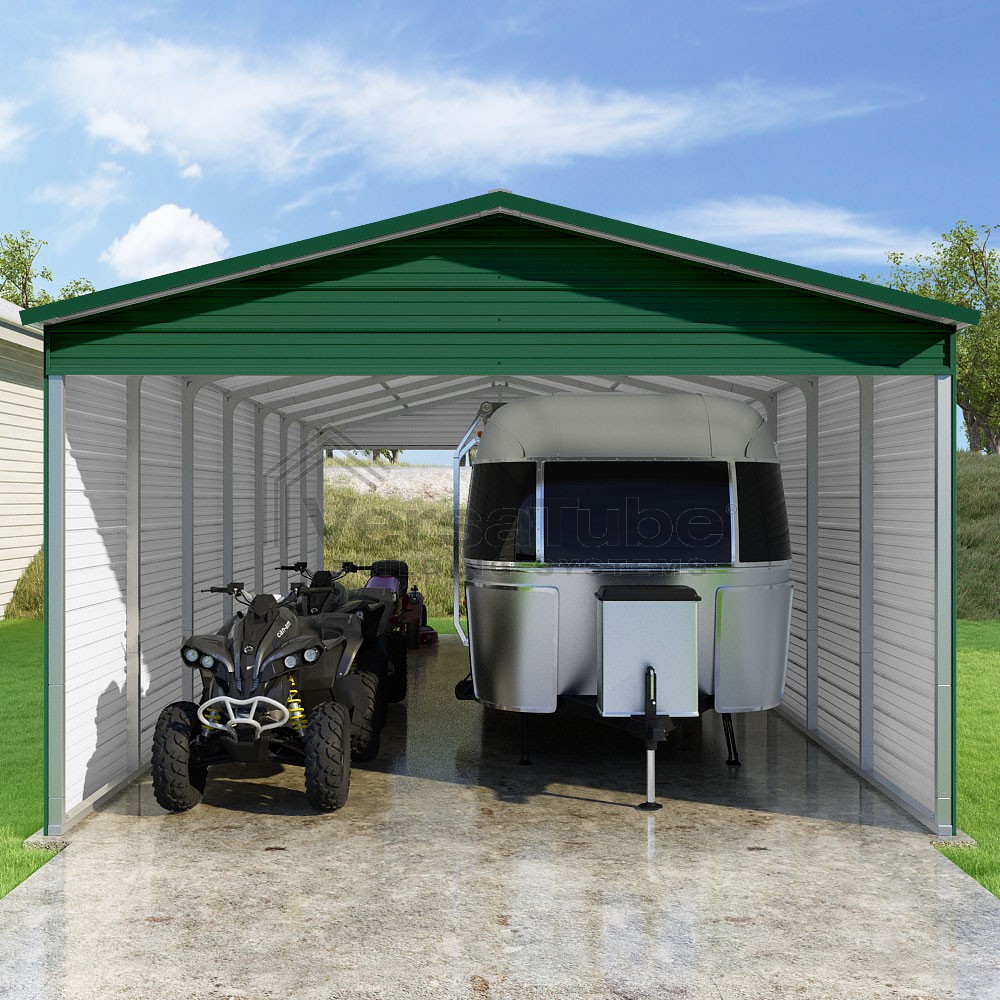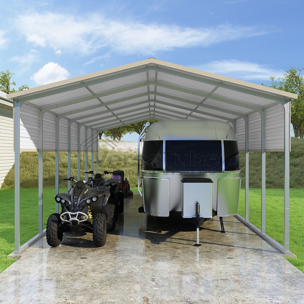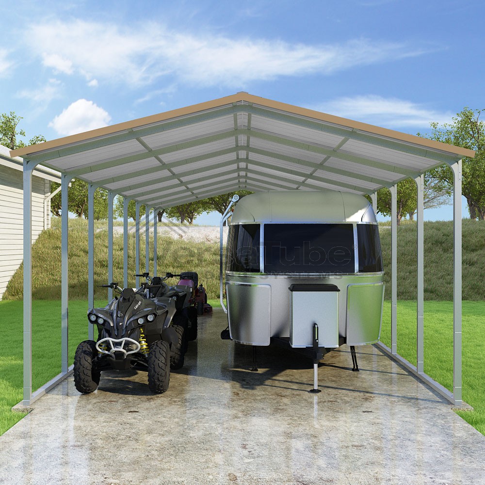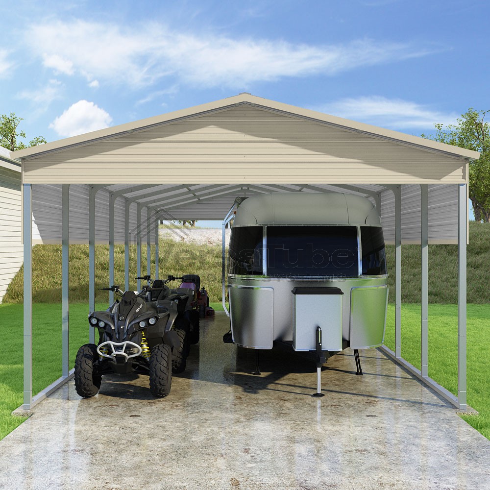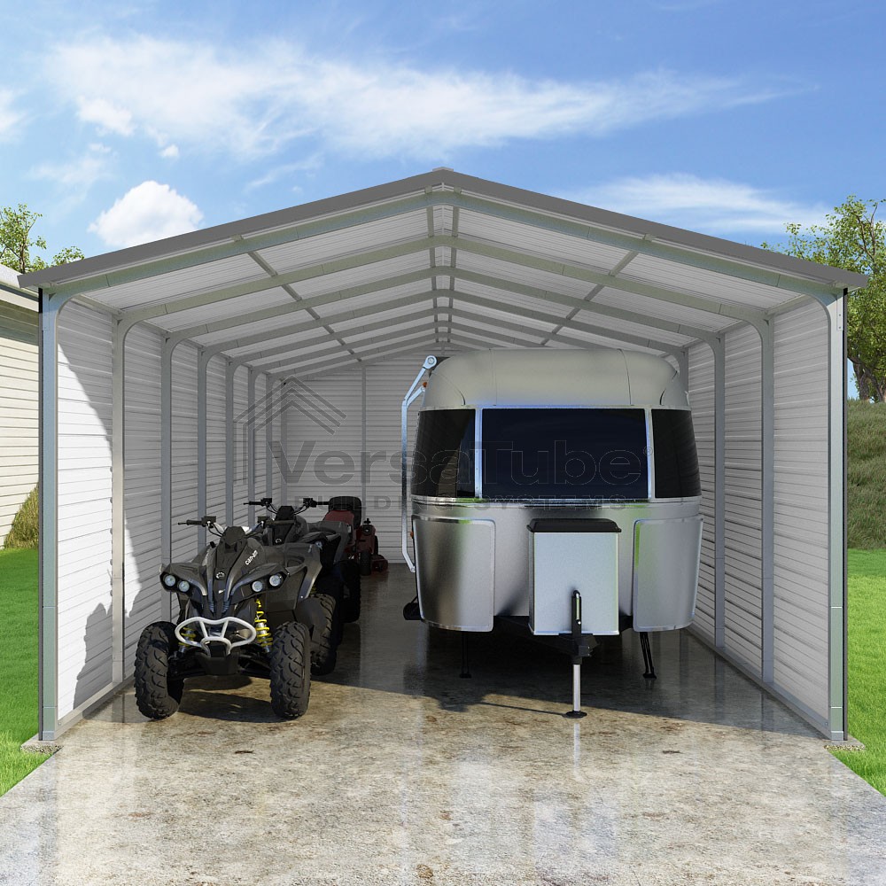 Pinnacle Series DIY carport kit features vertical sheet metal roof panels with ridge cap, gable and eave trim for an A-frame roof style and extended coverage on both ends.