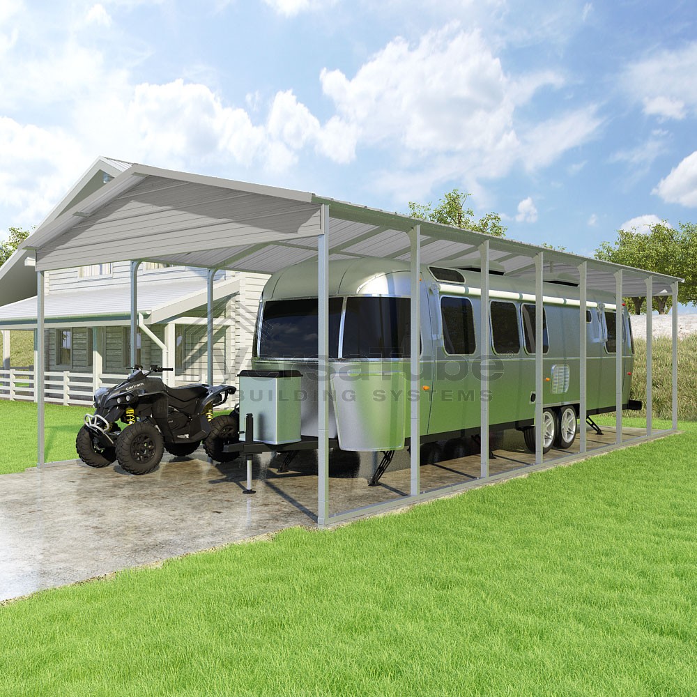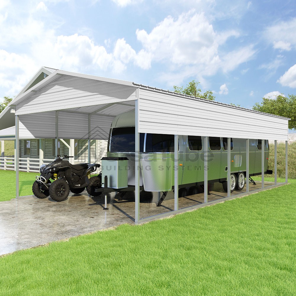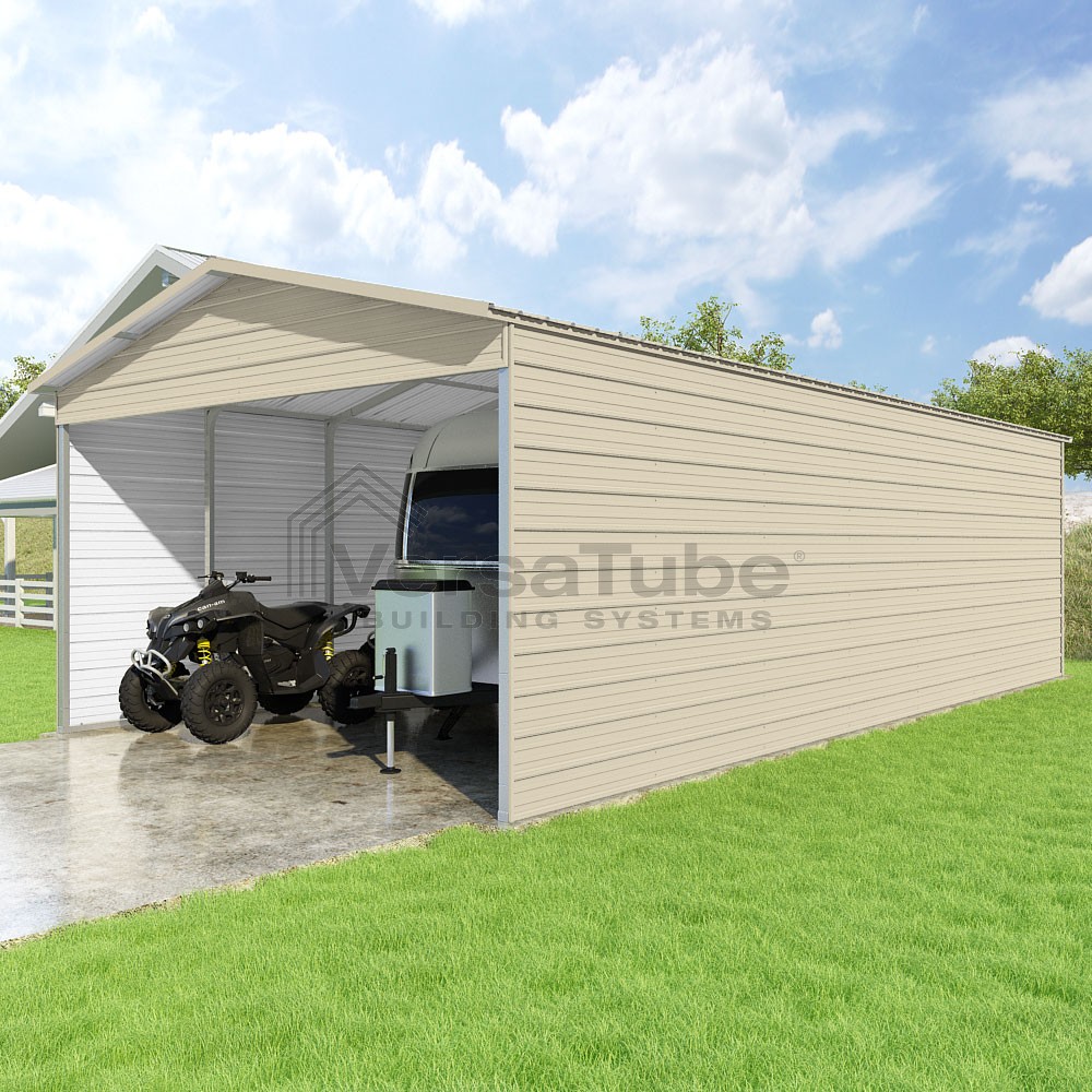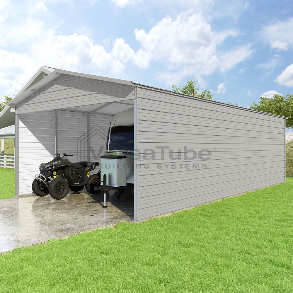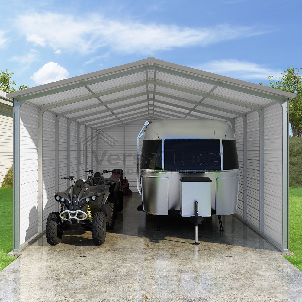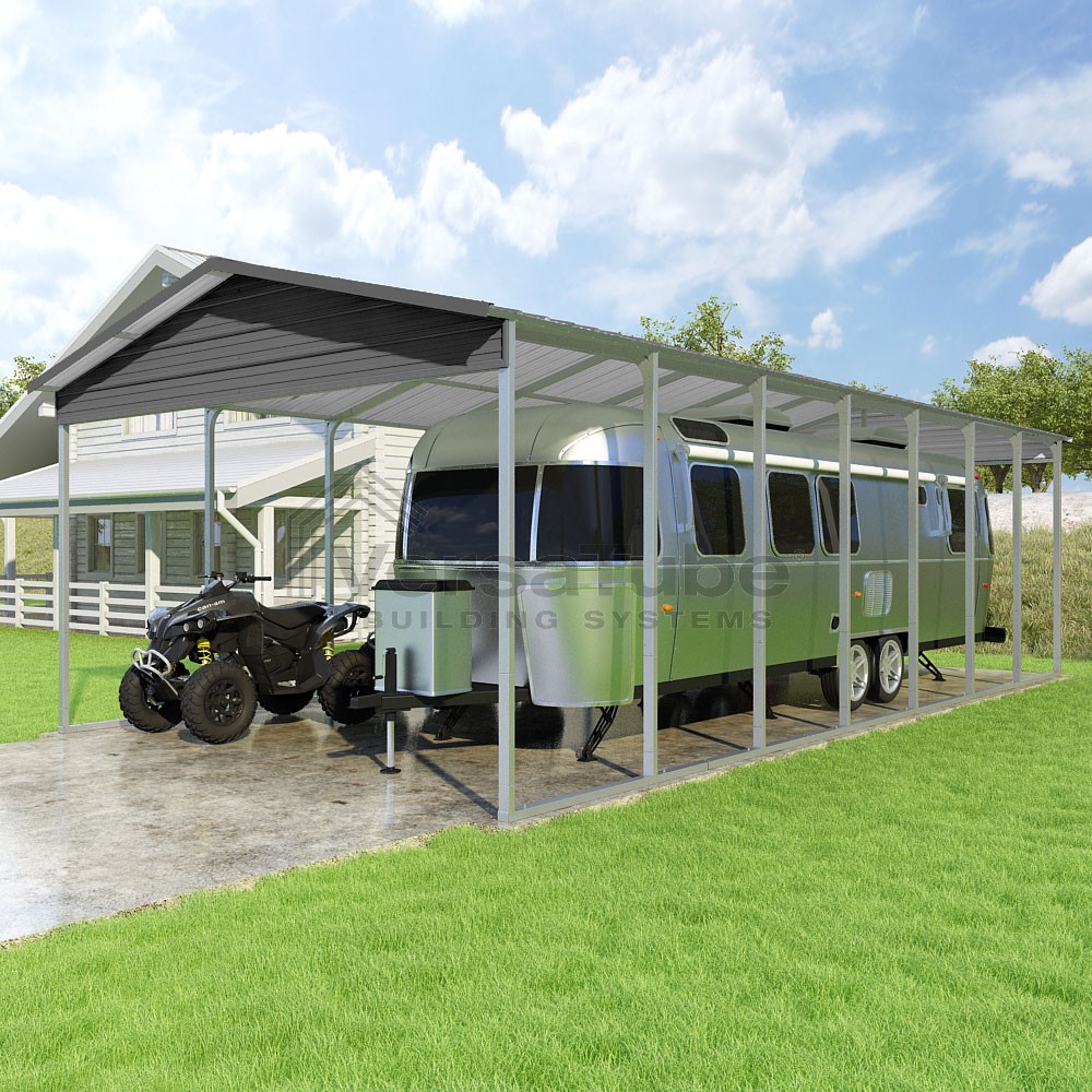 Pinnacle Series DIY carport kit features vertical sheet metal roof panels with ridge cap, gable and eave trim for an A-frame roof style and extended coverage on both ends.