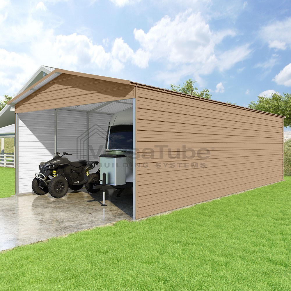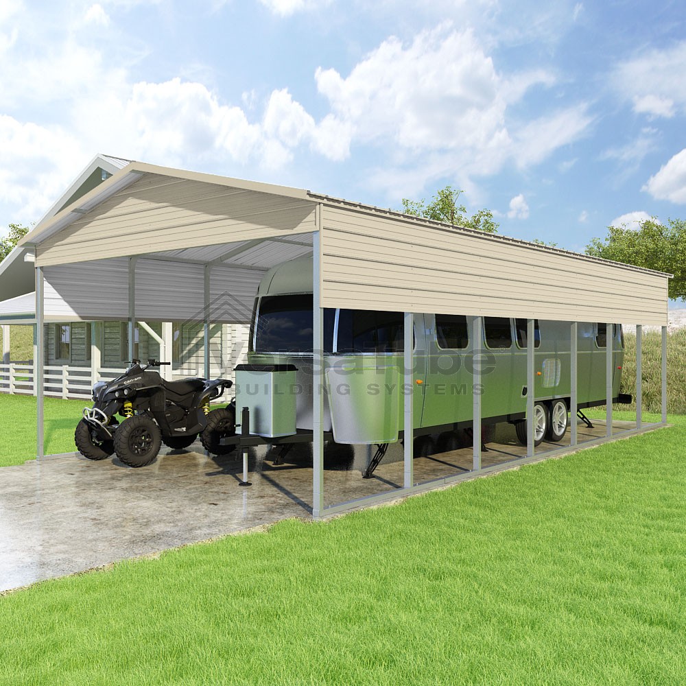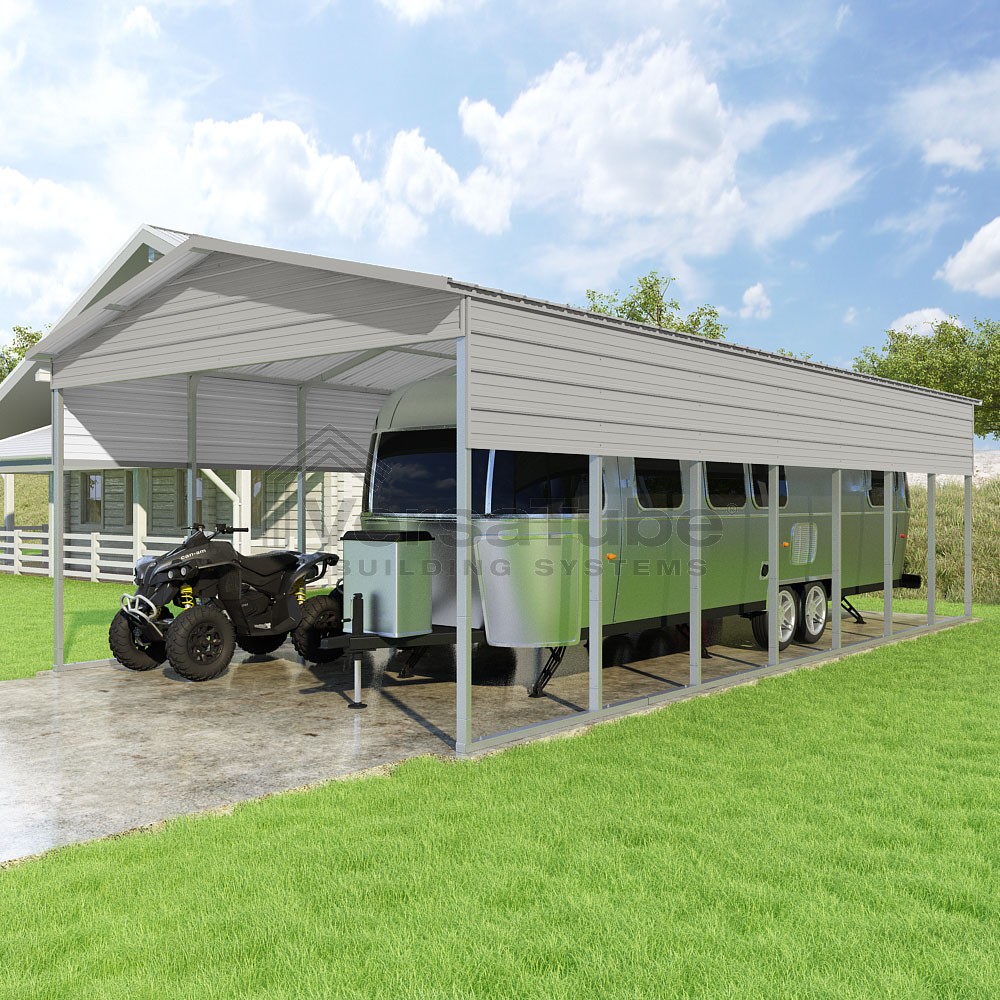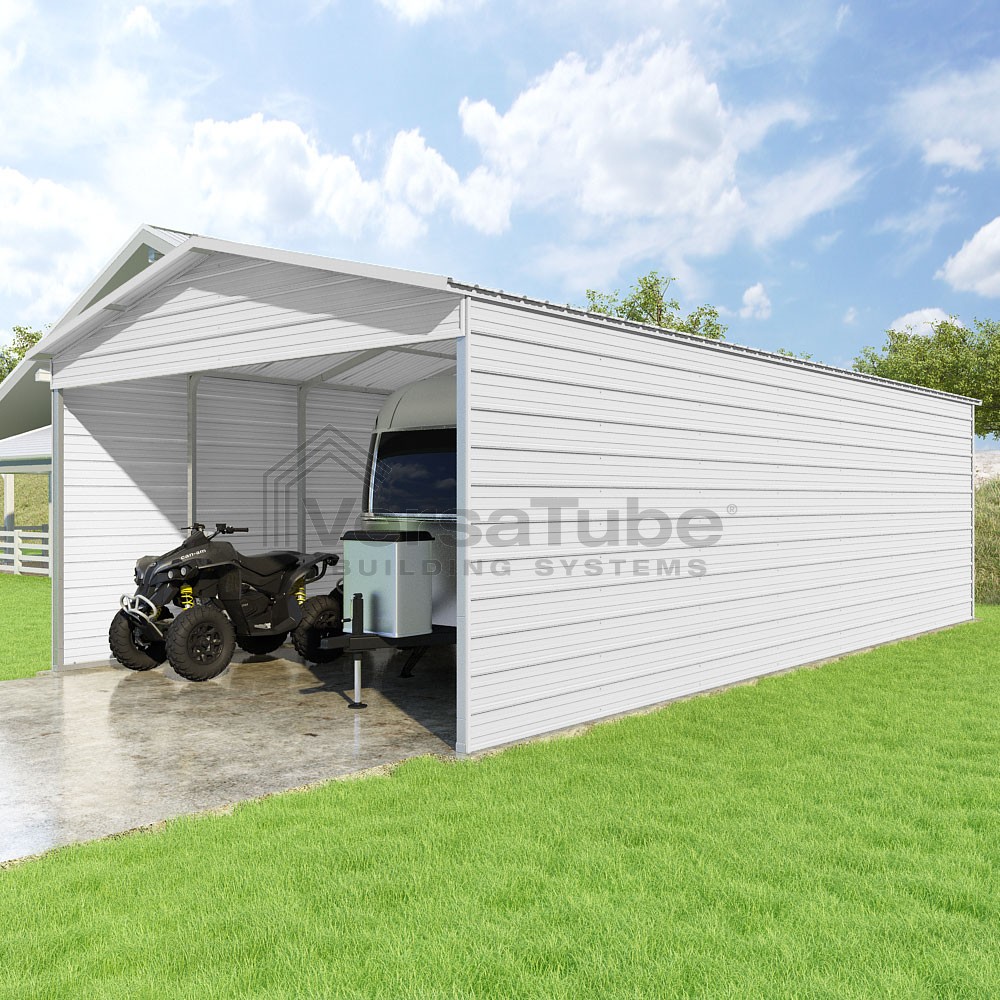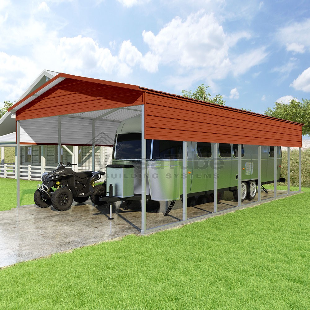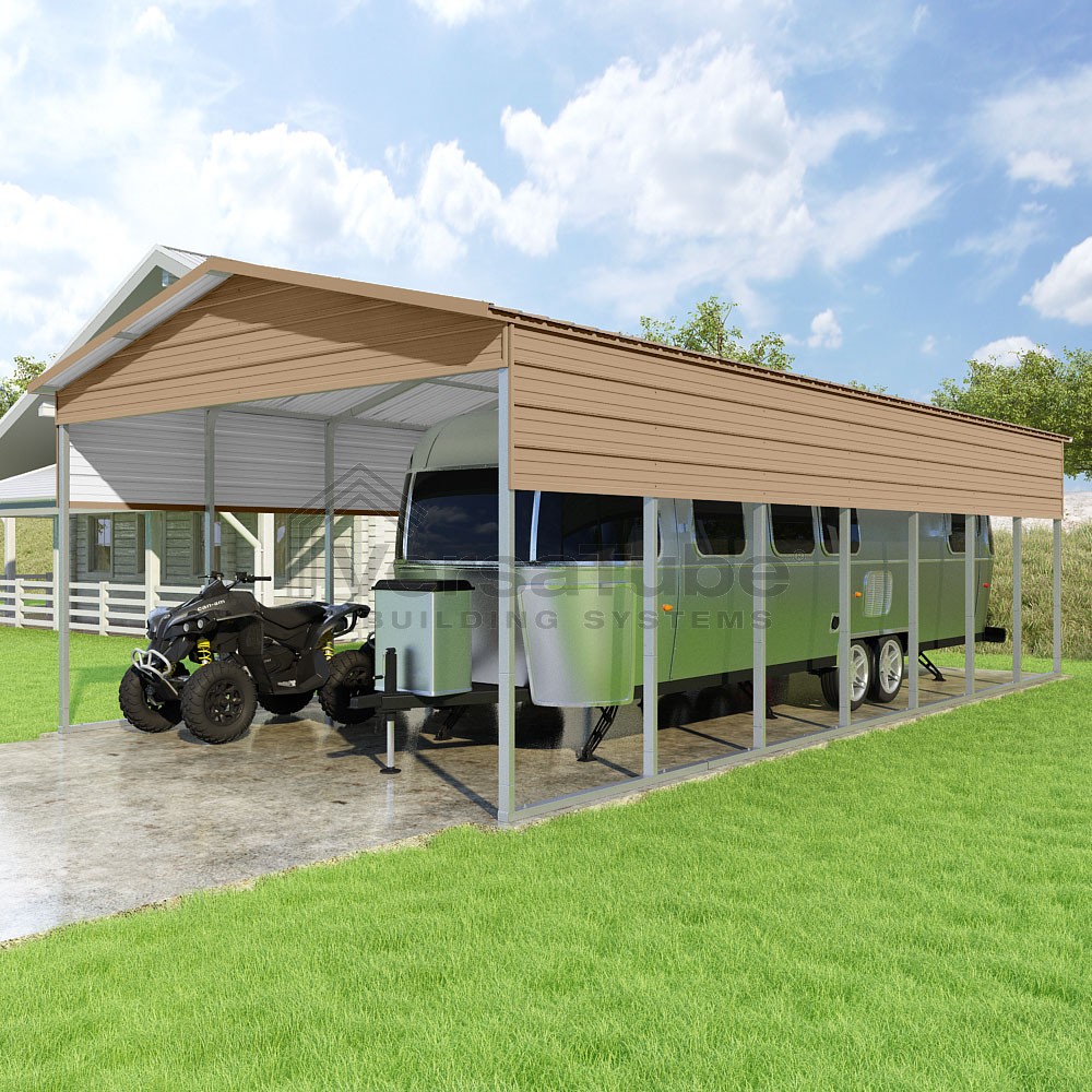 Pinnacle Series DIY carport kit features vertical sheet metal roof panels with ridge cap, gable and eave trim for an A-frame roof style and extended coverage on both ends.