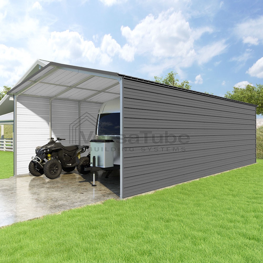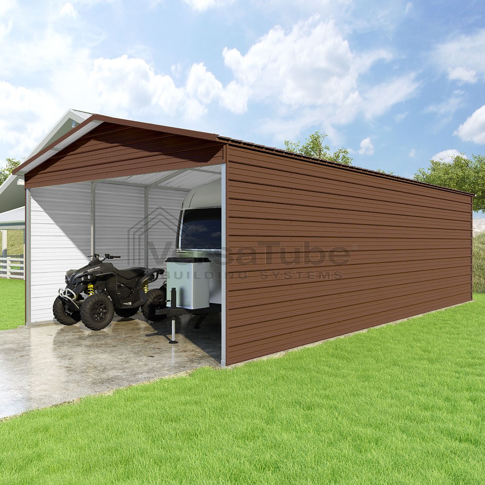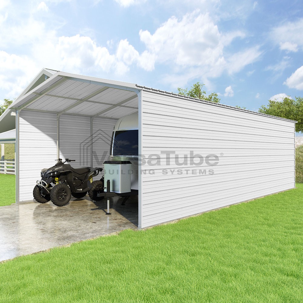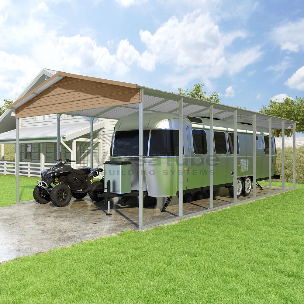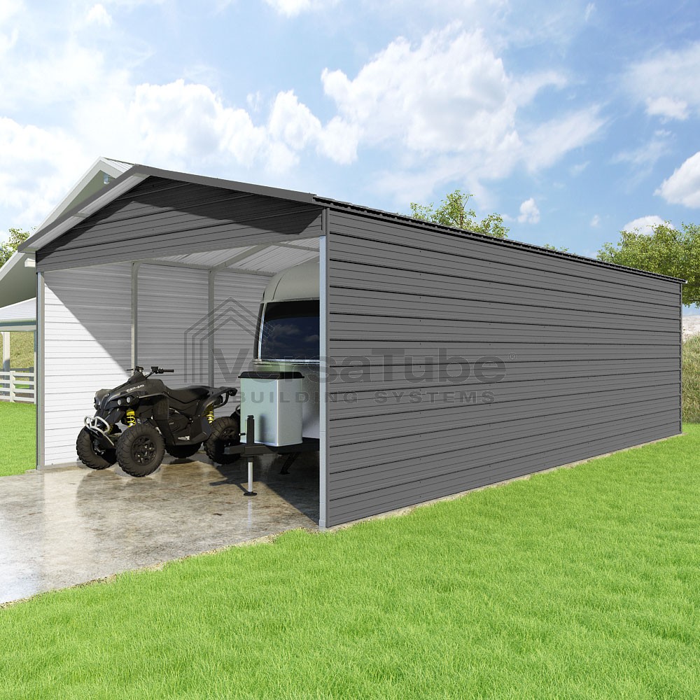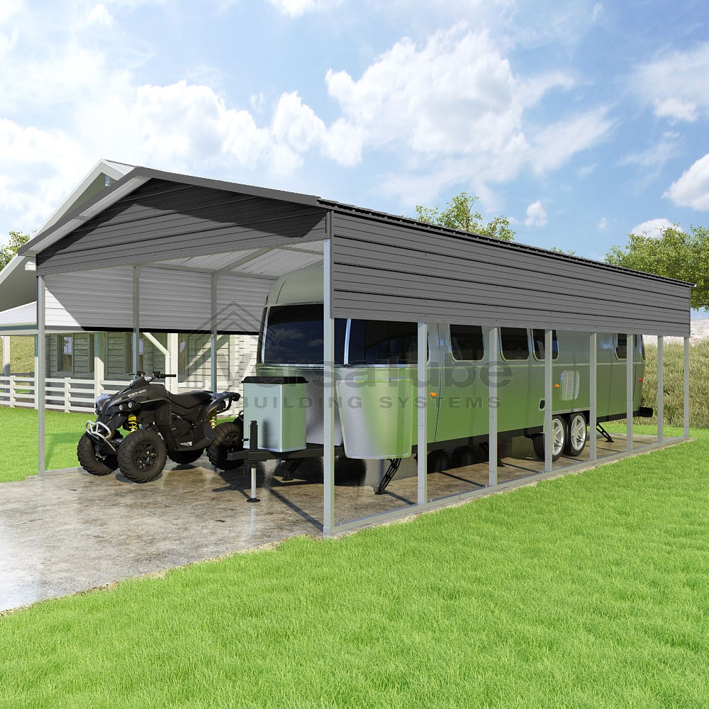 Pinnacle Series DIY carport kit features vertical sheet metal roof panels with ridge cap, gable and eave trim for an A-frame roof style and extended coverage on both ends.