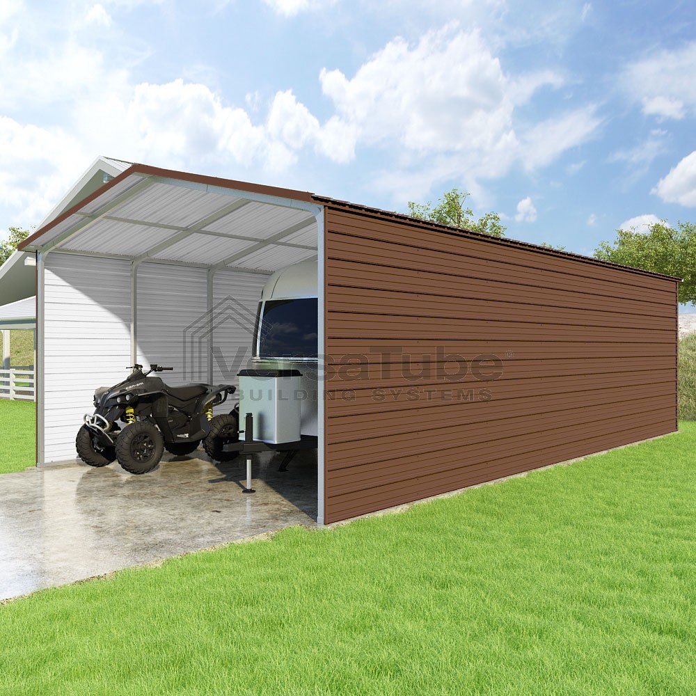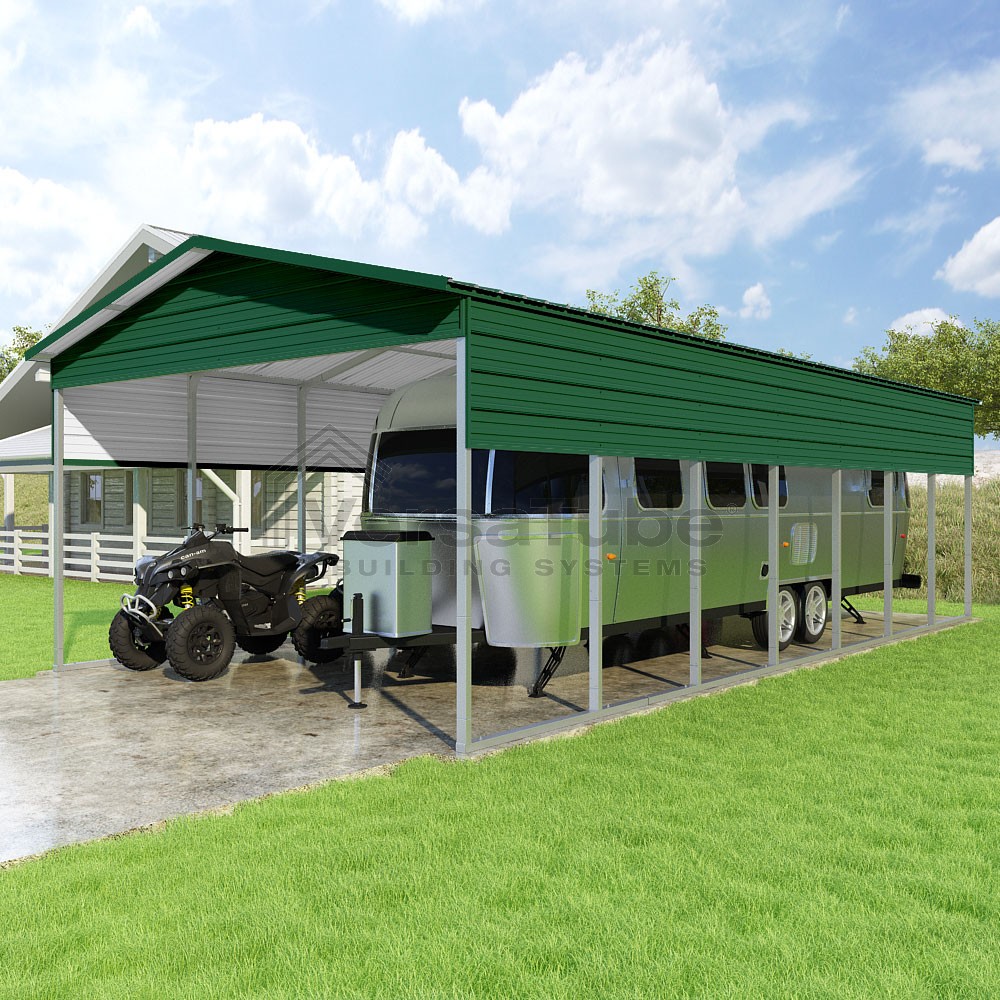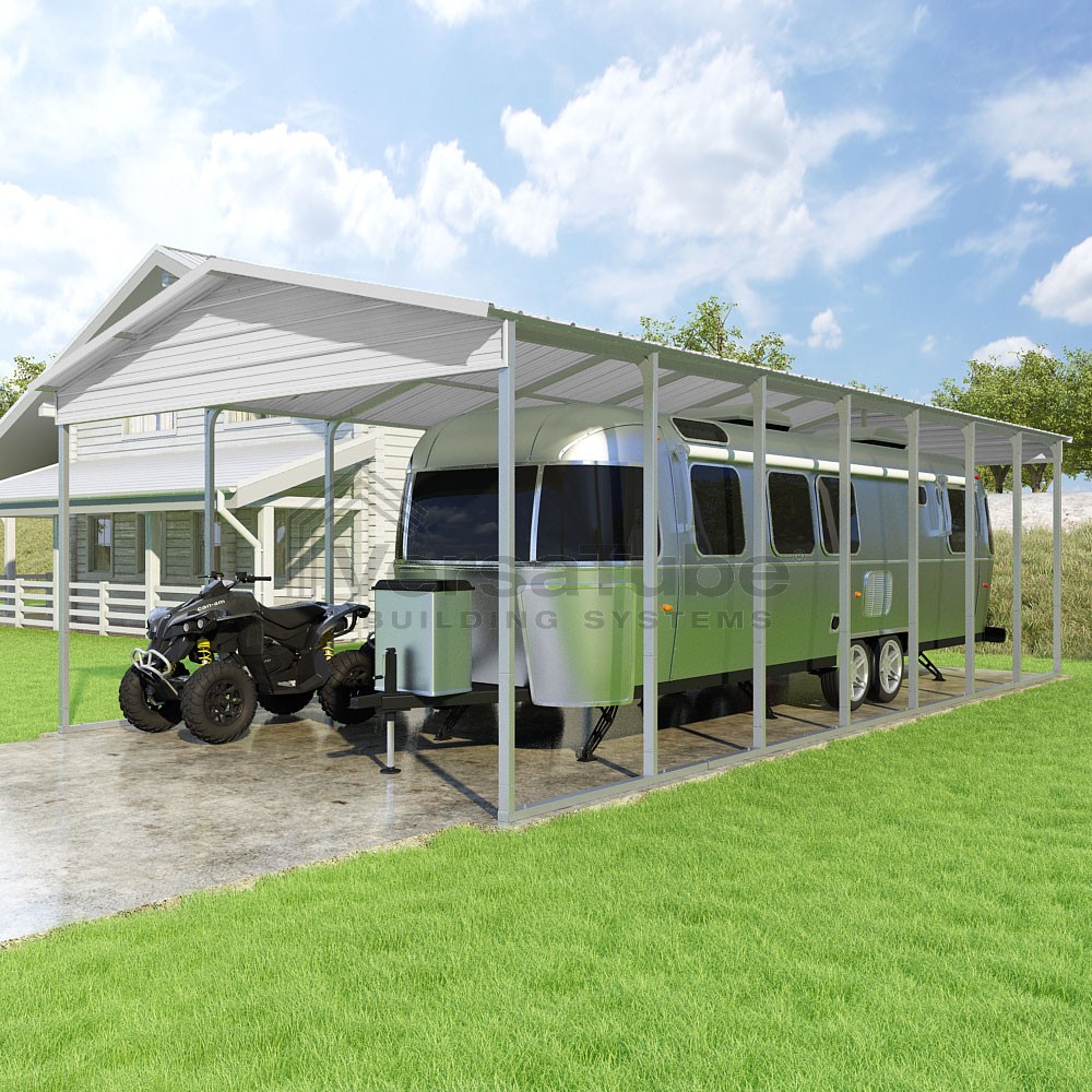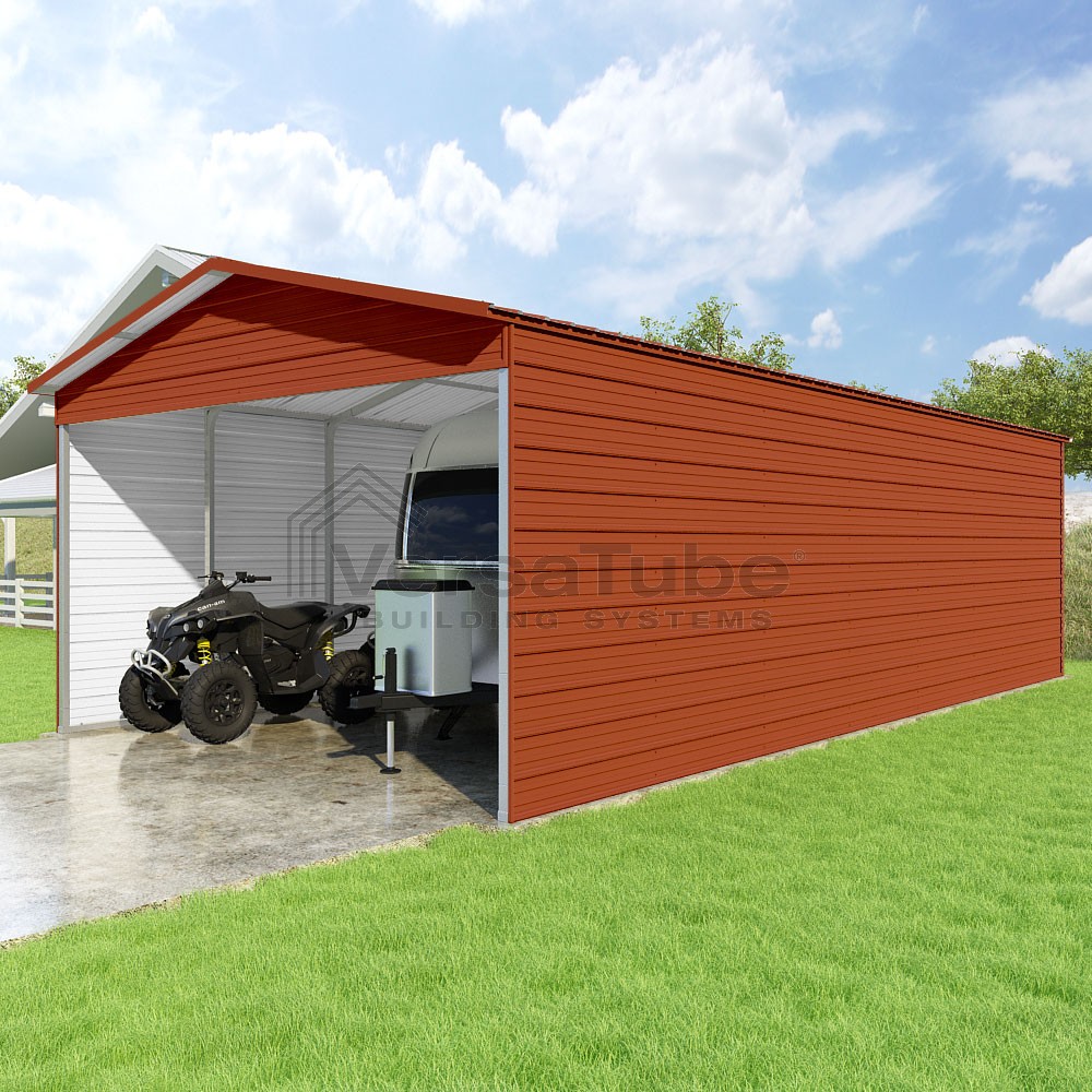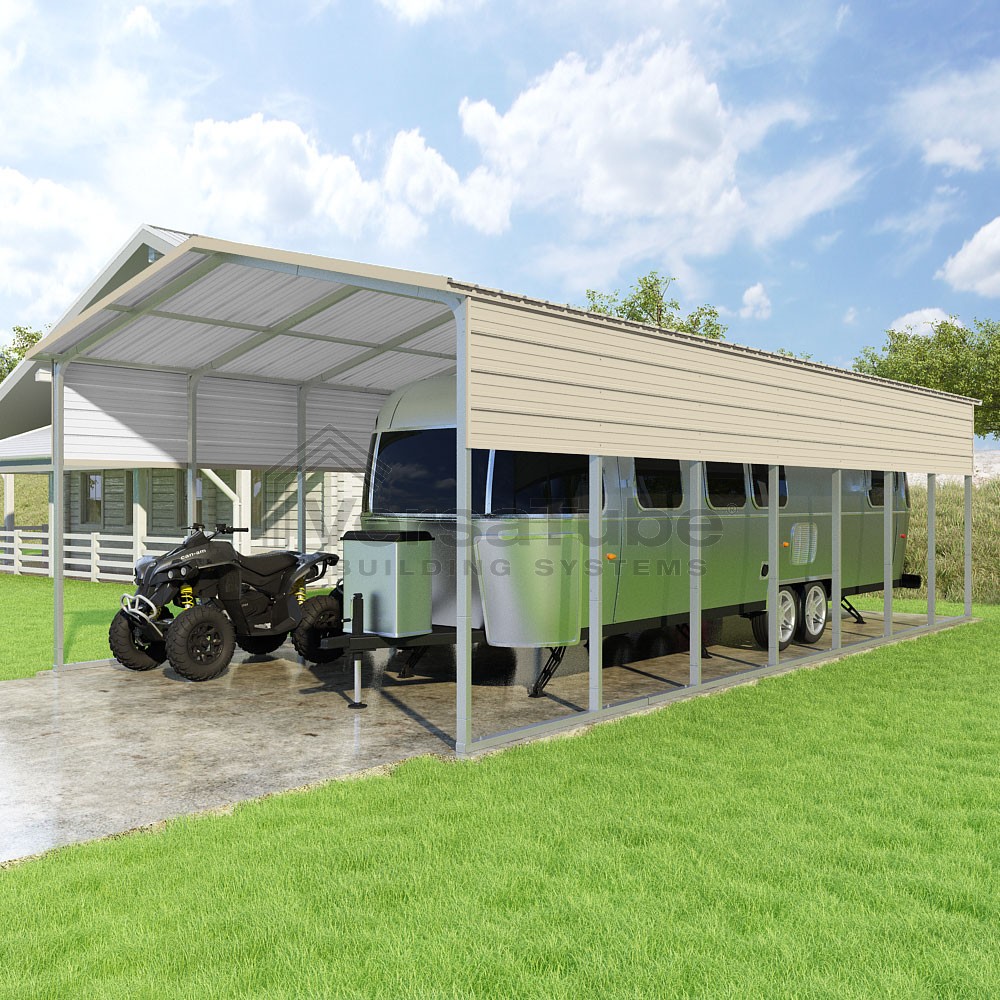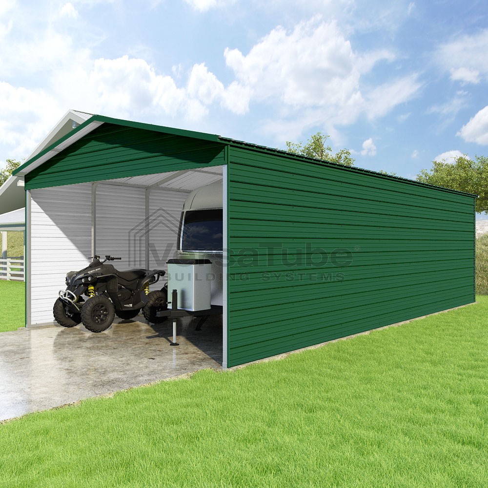 Pinnacle Series DIY carport kit features vertical sheet metal roof panels with ridge cap, gable and eave trim for an A-frame roof style and extended coverage on both ends.