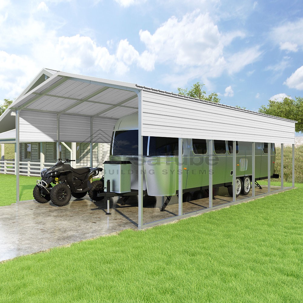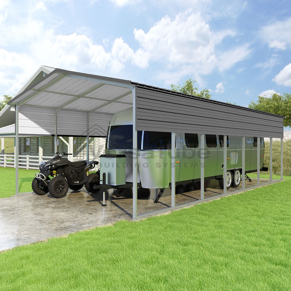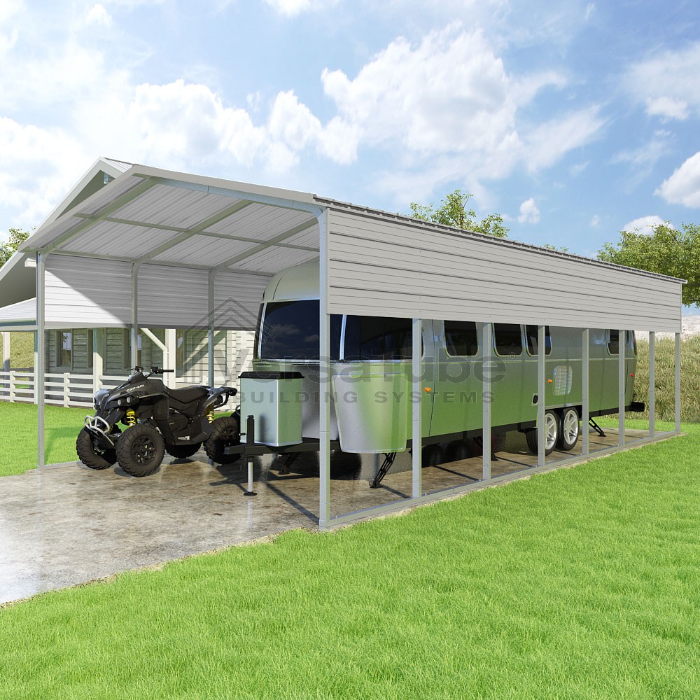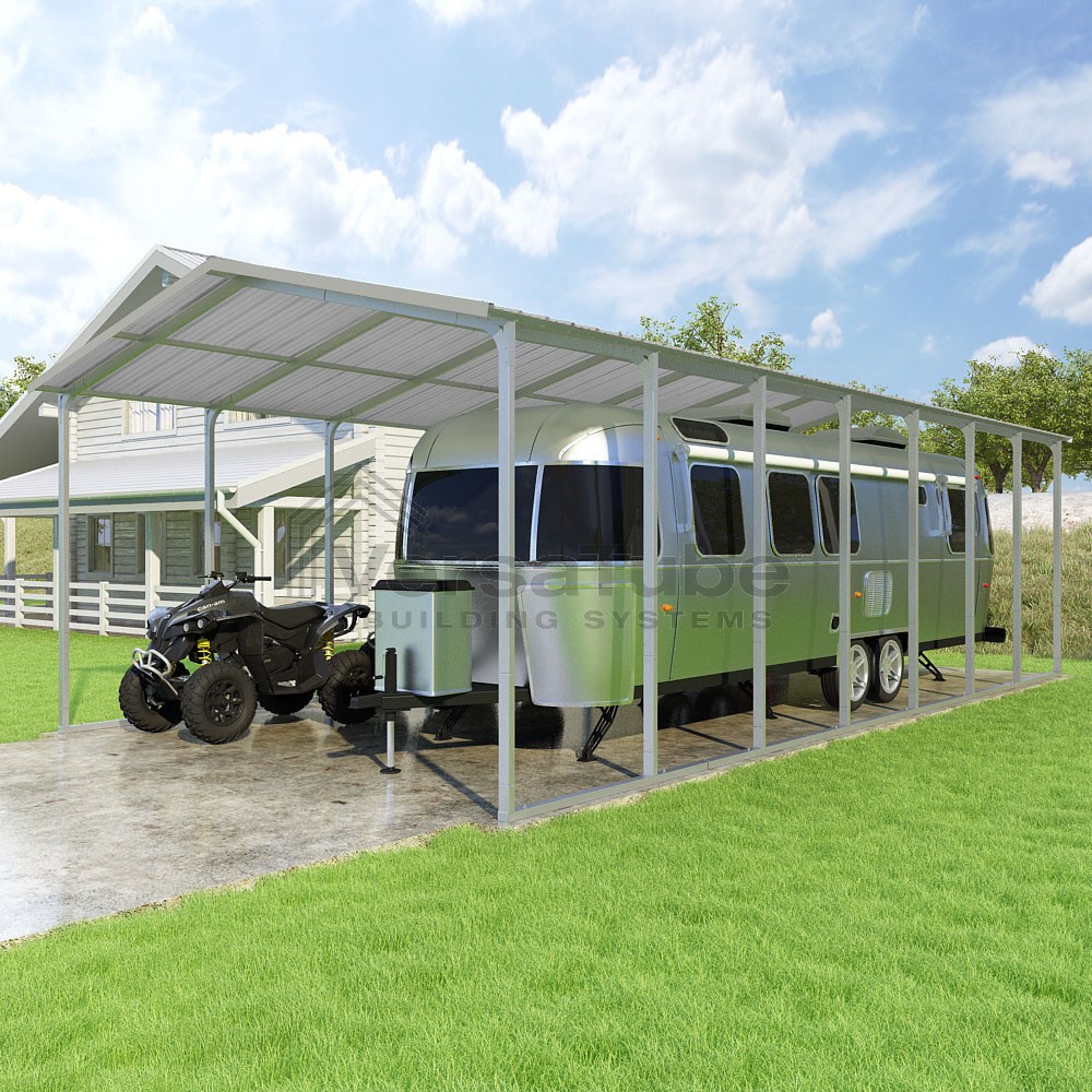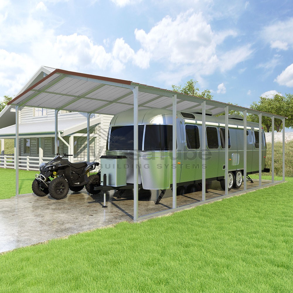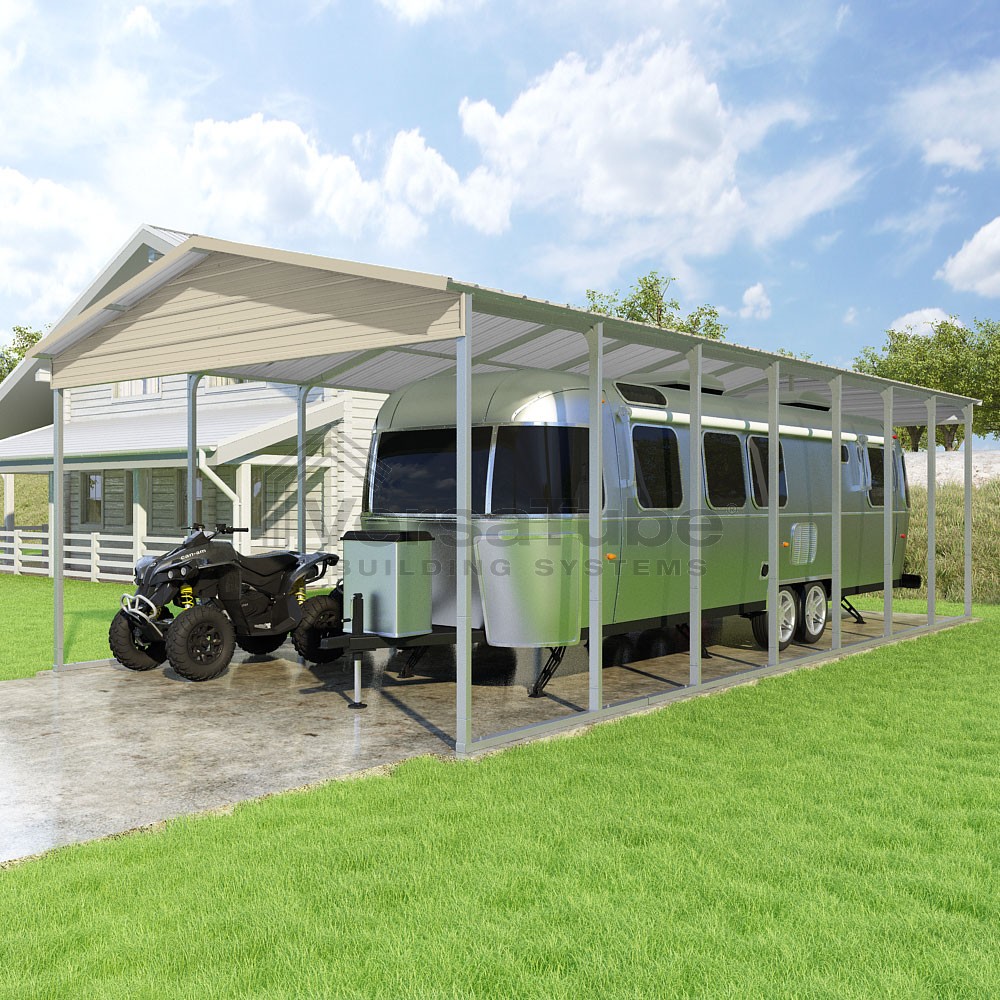 Pinnacle Series DIY carport kit features vertical sheet metal roof panels with ridge cap, gable and eave trim for an A-frame roof style and extended coverage on both ends.