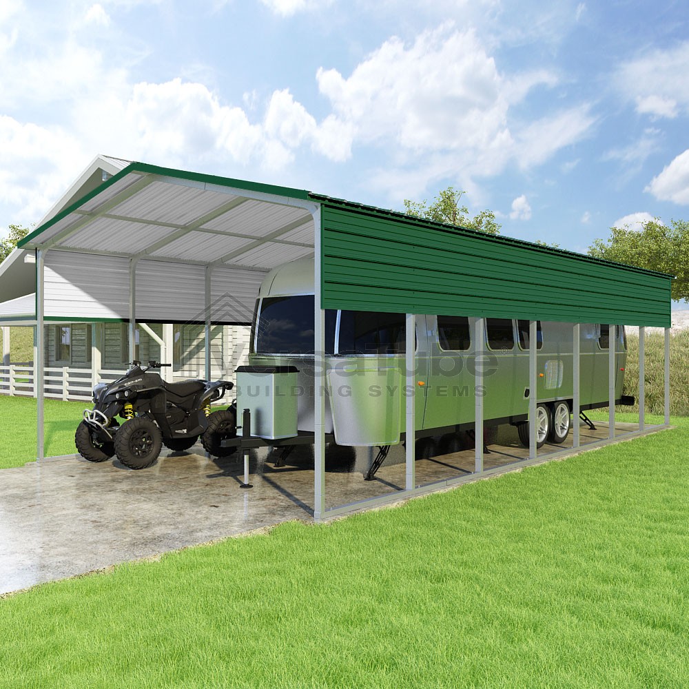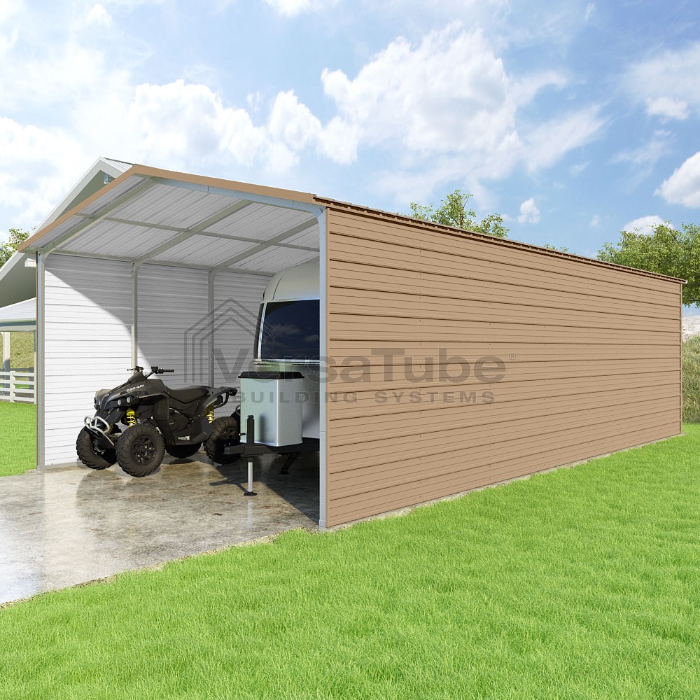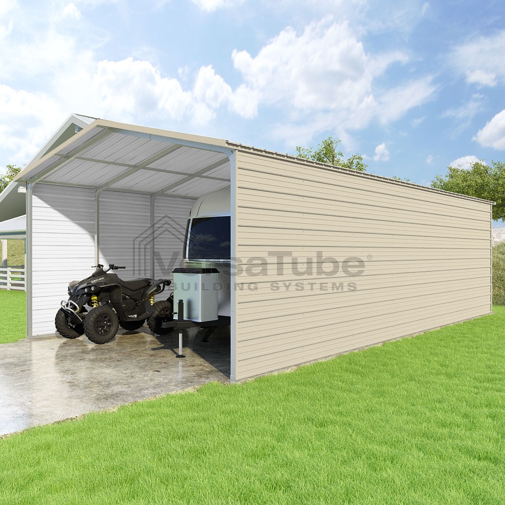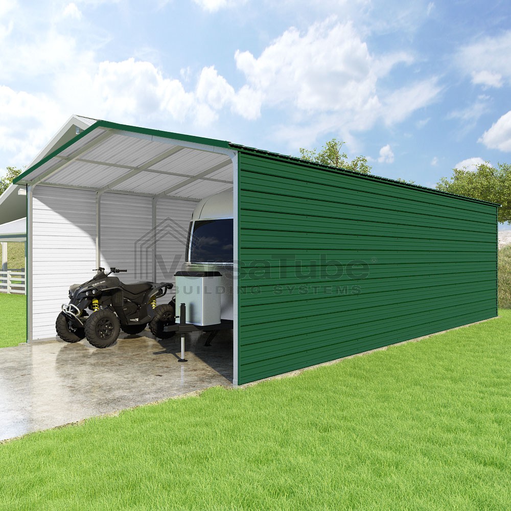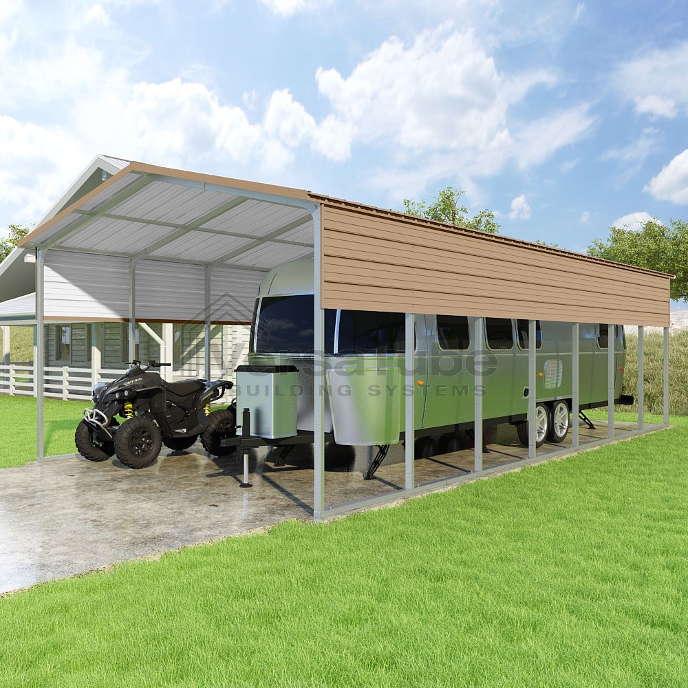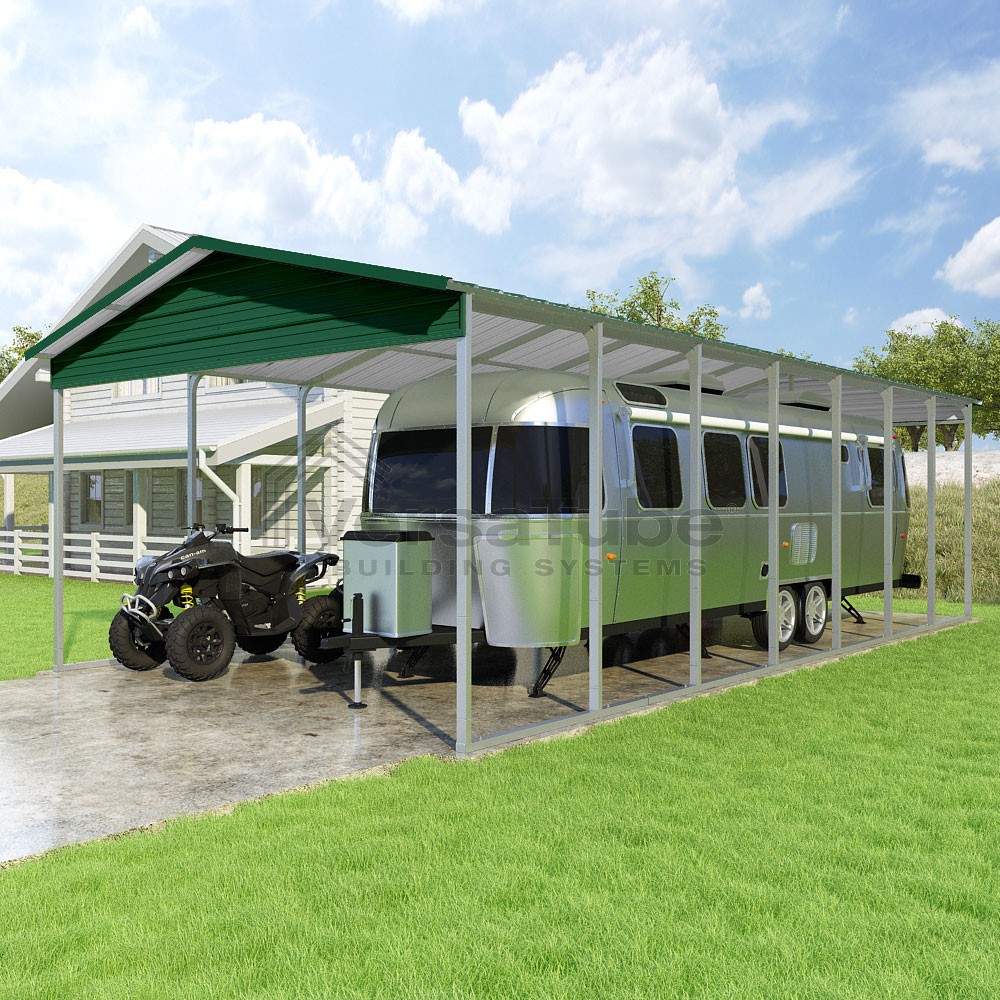 Pinnacle Series DIY carport kit features vertical sheet metal roof panels with ridge cap, gable and eave trim for an A-frame roof style and extended coverage on both ends.