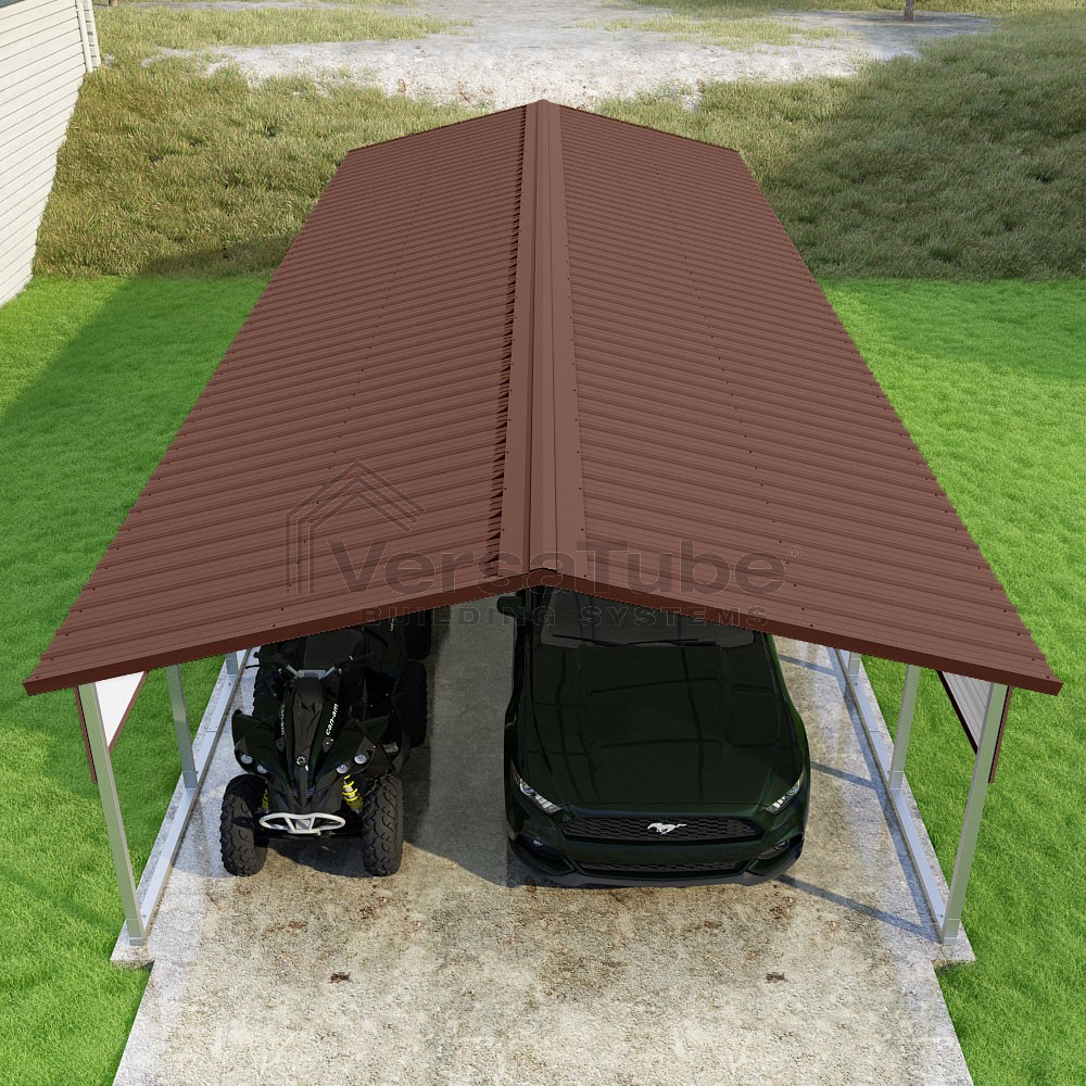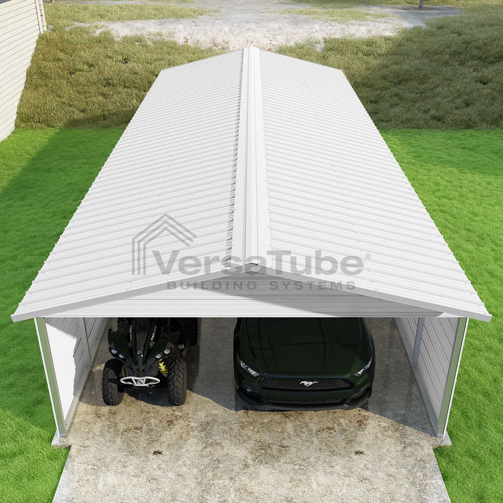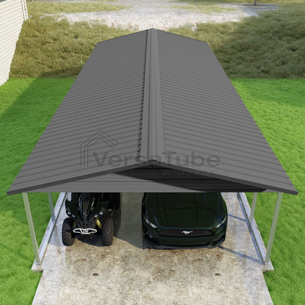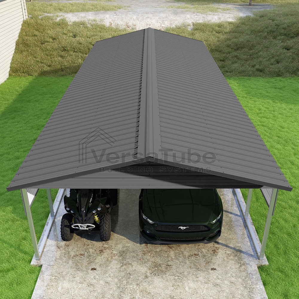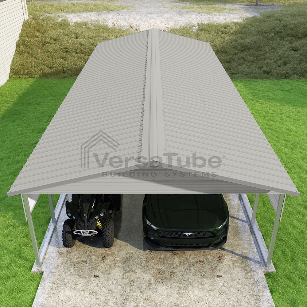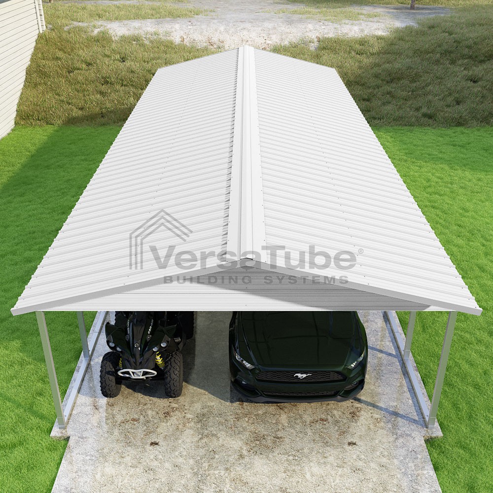 Pinnacle Series DIY carport kit features vertical sheet metal roof panels with ridge cap, gable and eave trim for an A-frame roof style and extended coverage on both ends.