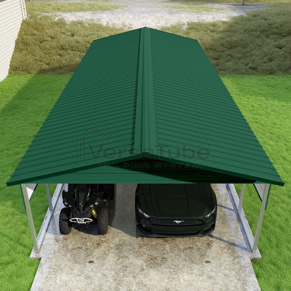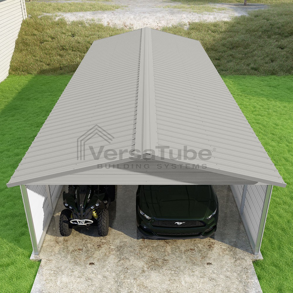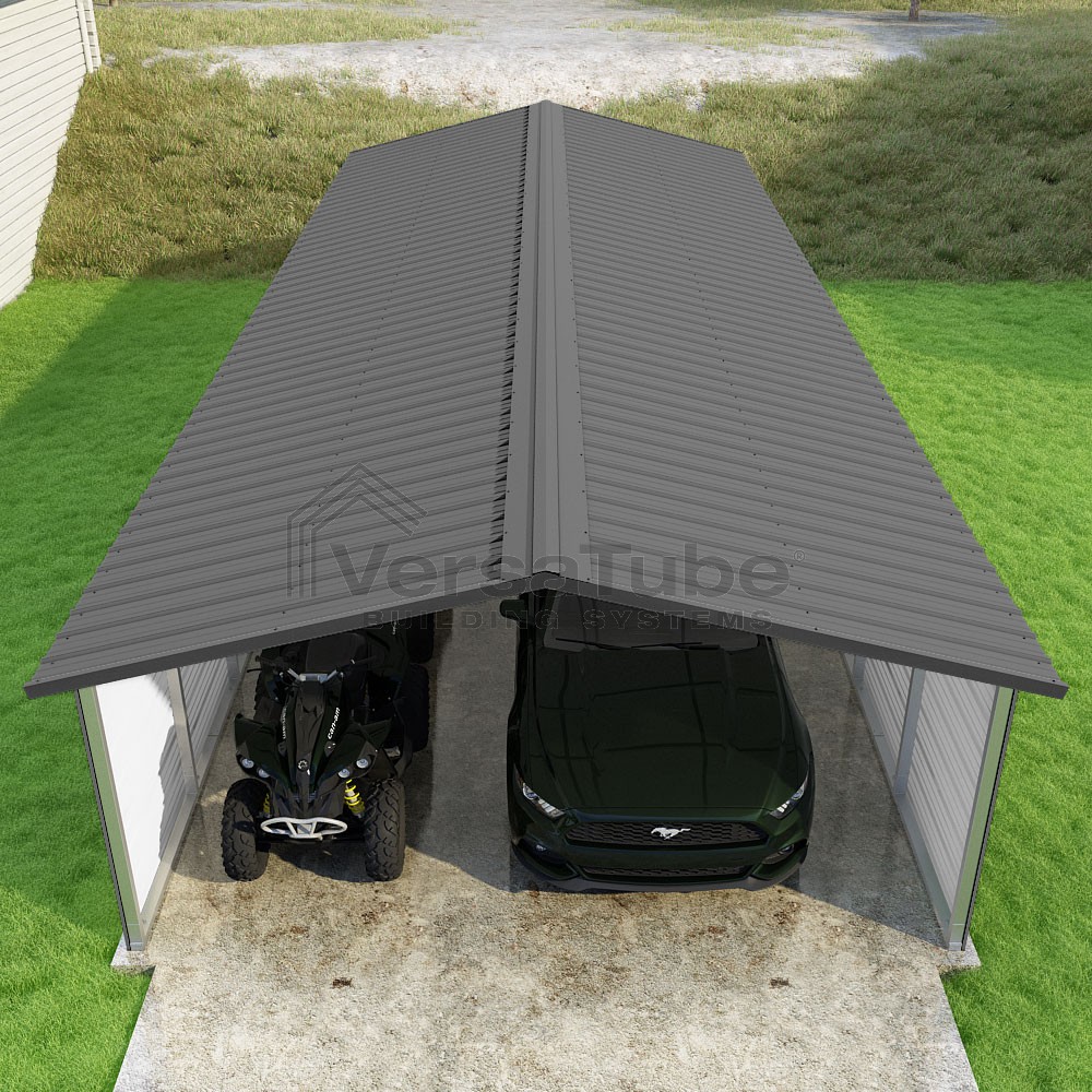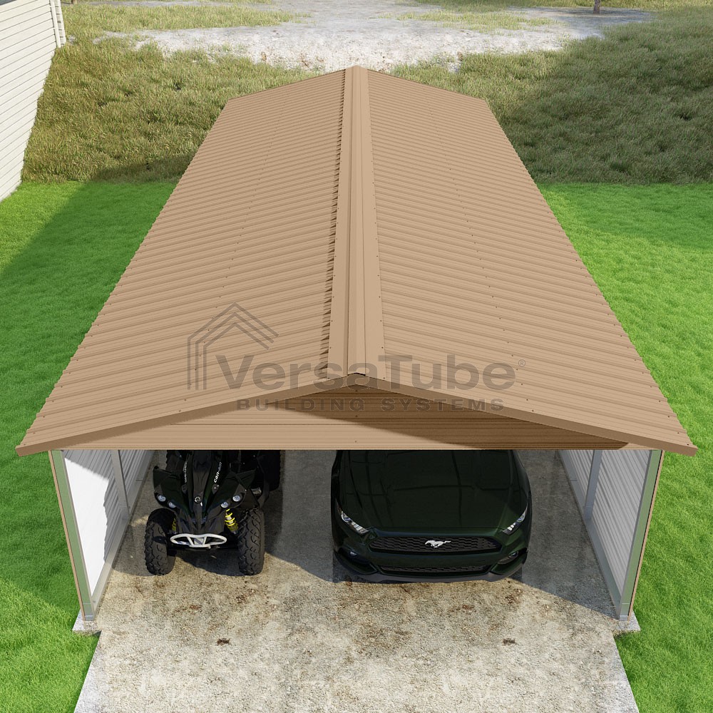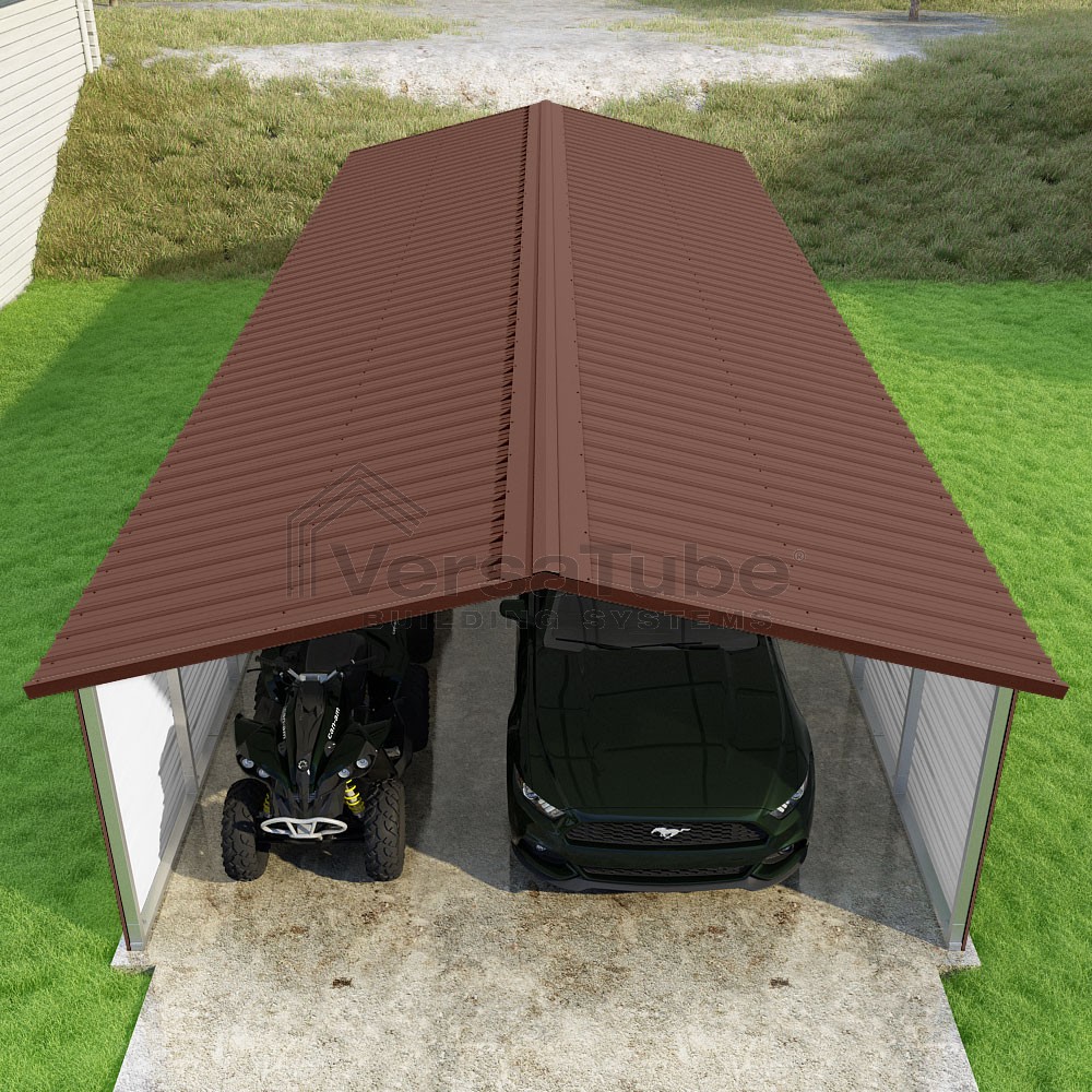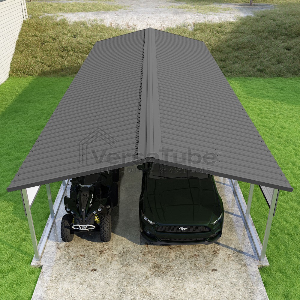 Pinnacle Series DIY carport kit features vertical sheet metal roof panels with ridge cap, gable and eave trim for an A-frame roof style and extended coverage on both ends.