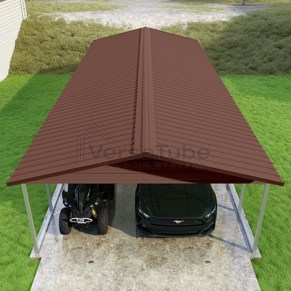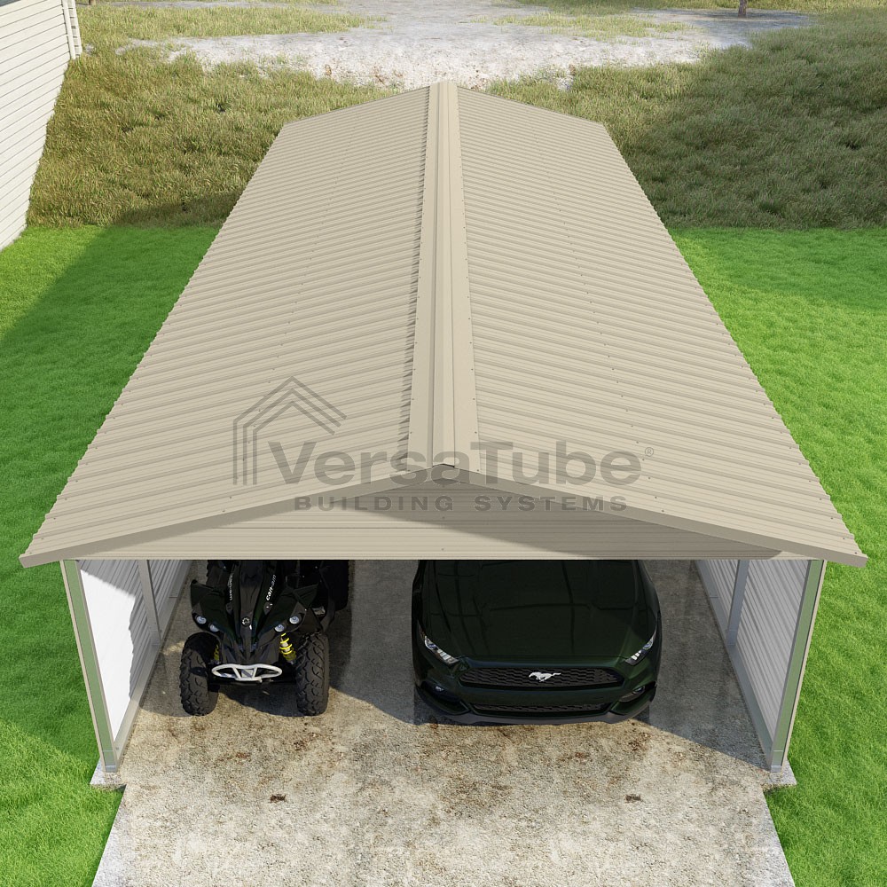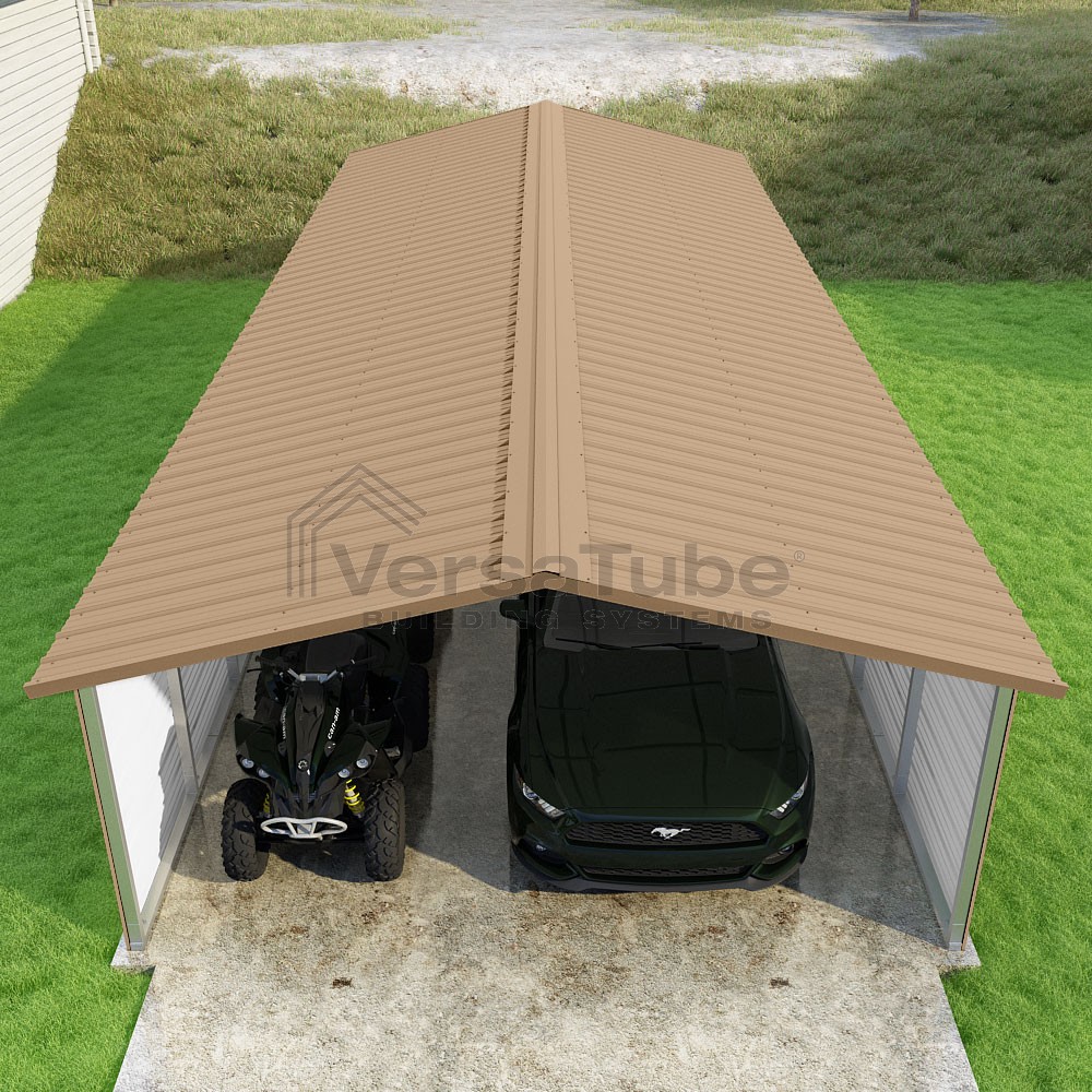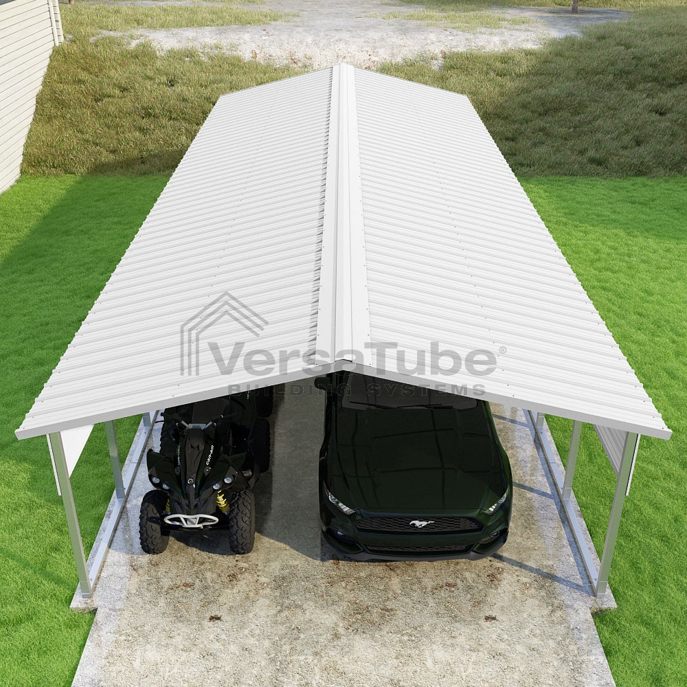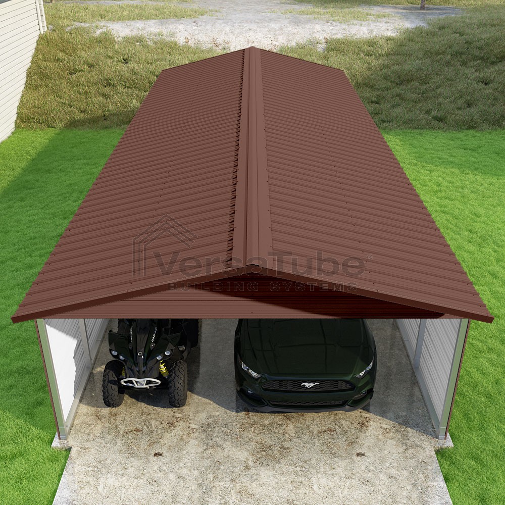 Pinnacle Series DIY carport kit features vertical sheet metal roof panels with ridge cap, gable and eave trim for an A-frame roof style and extended coverage on both ends.