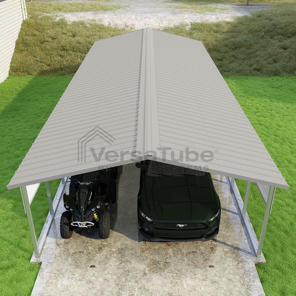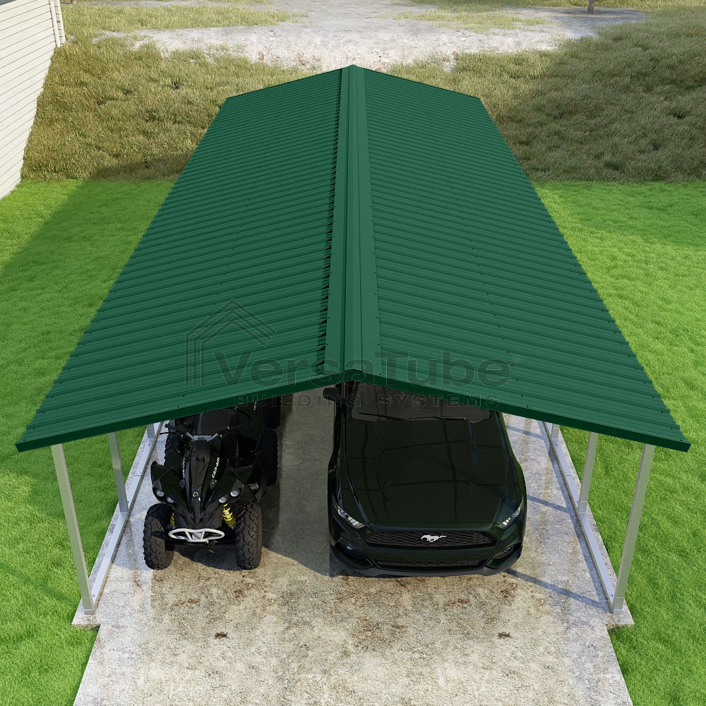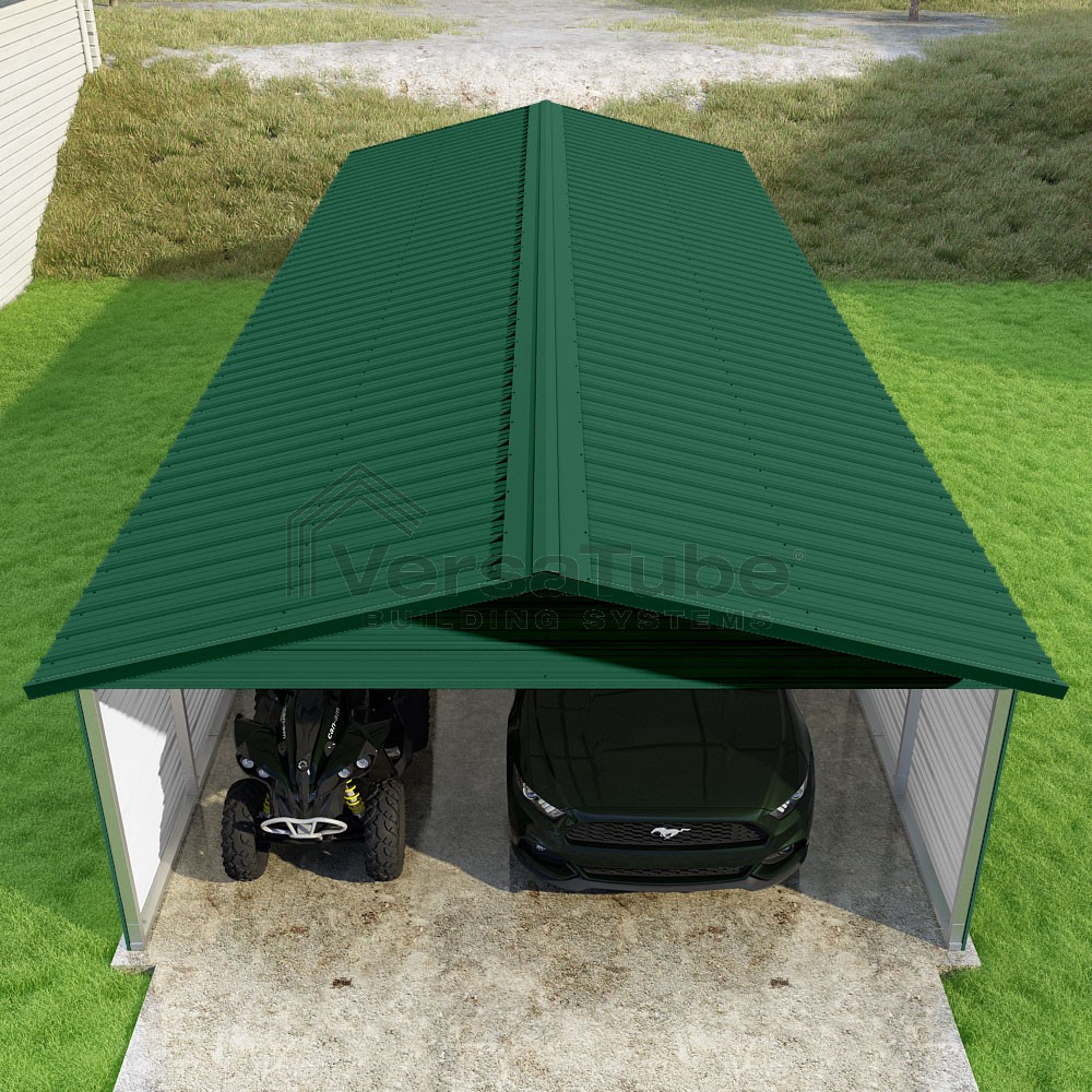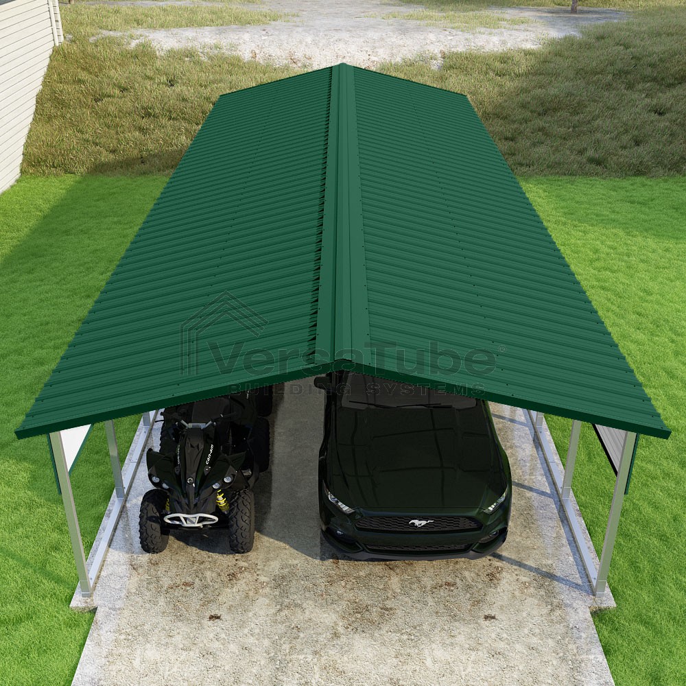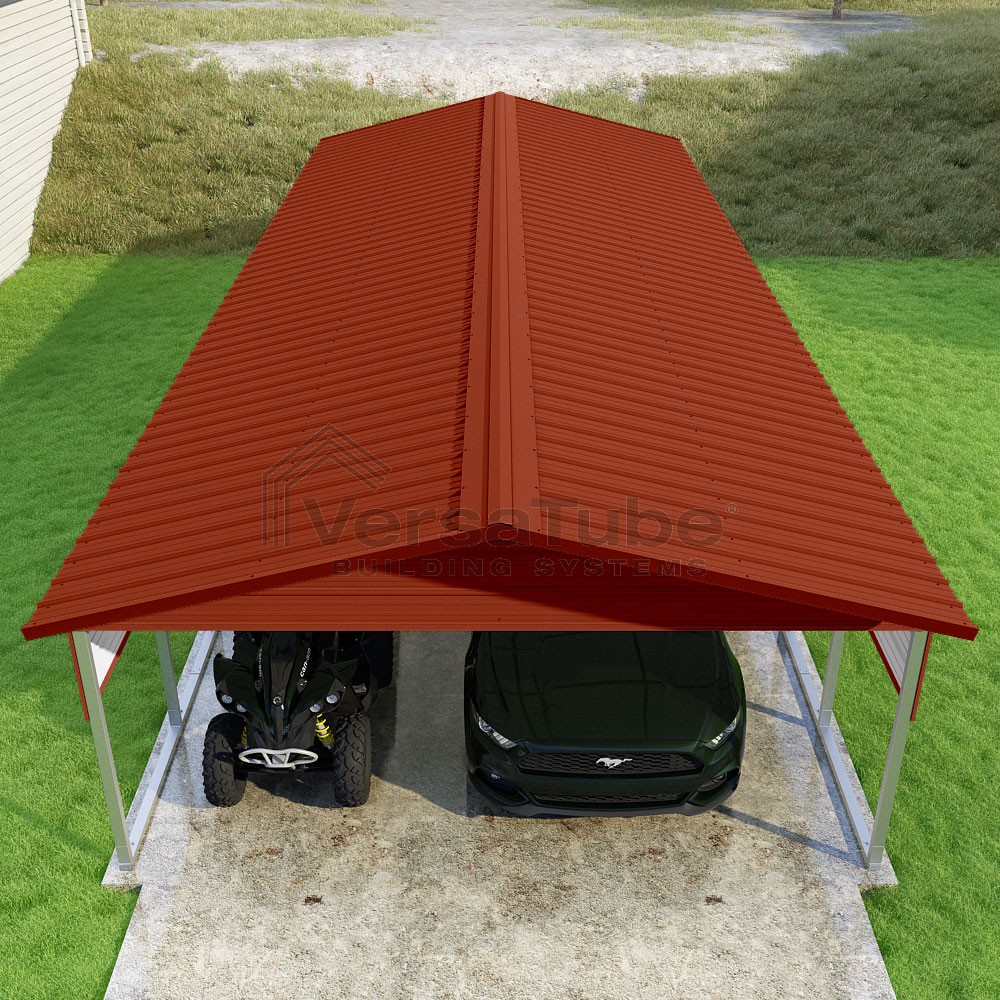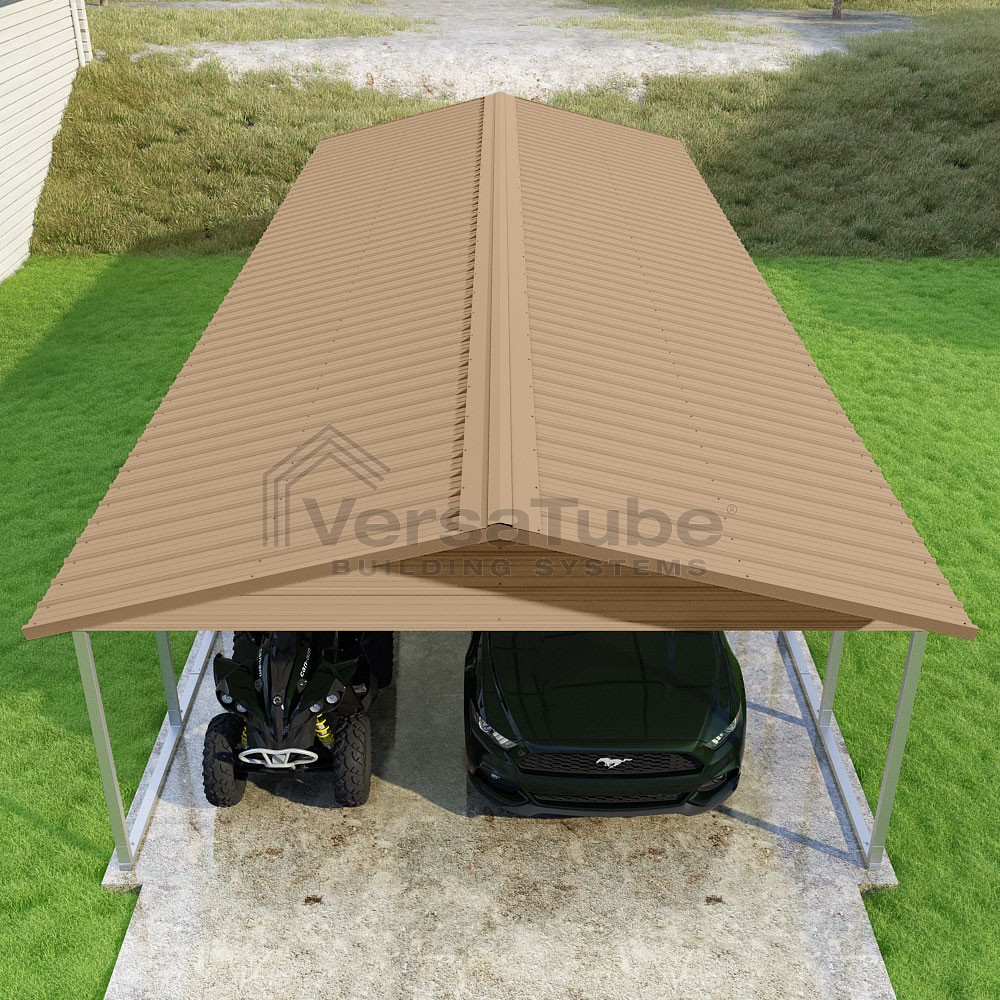 Pinnacle Series DIY carport kit features vertical sheet metal roof panels with ridge cap, gable and eave trim for an A-frame roof style and extended coverage on both ends.