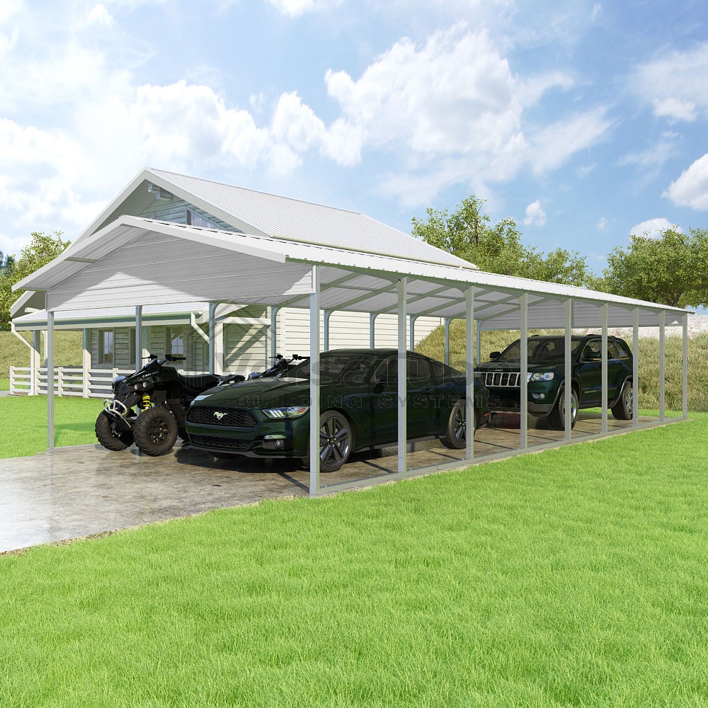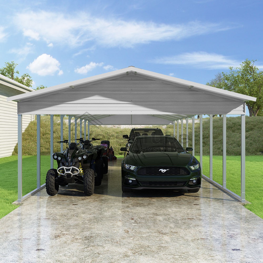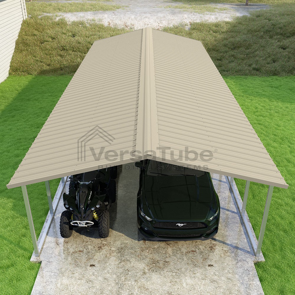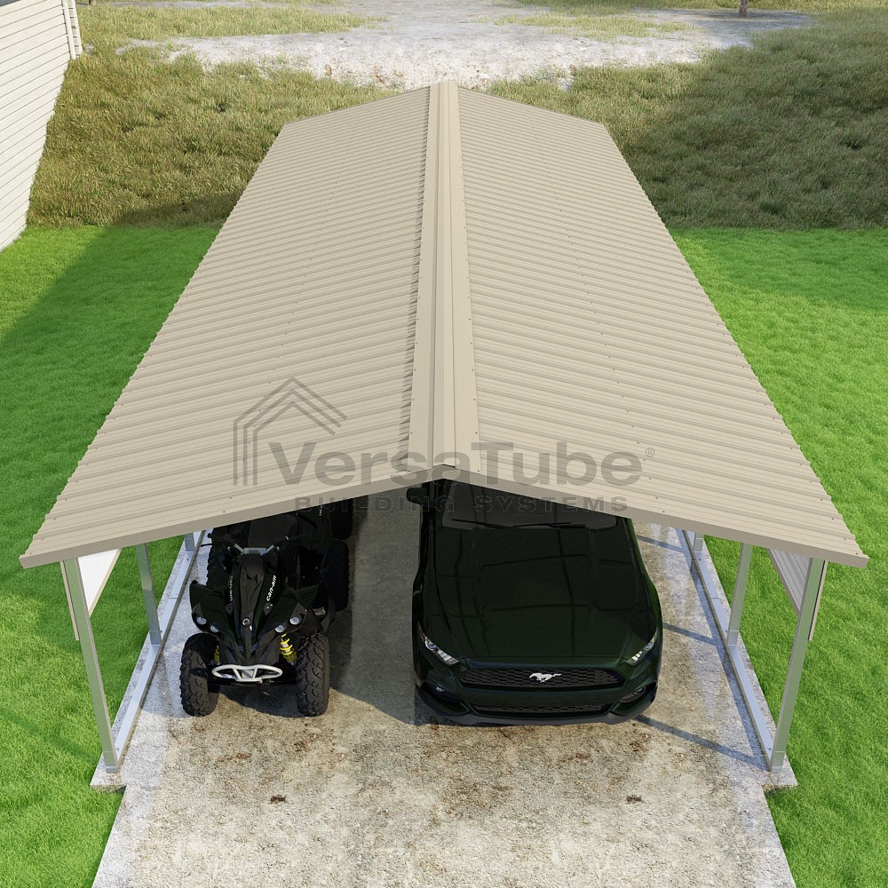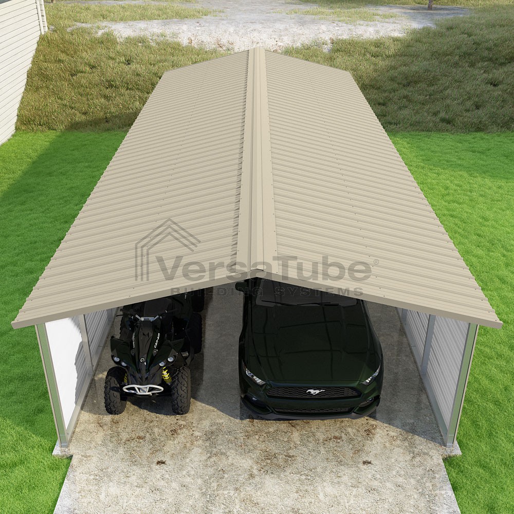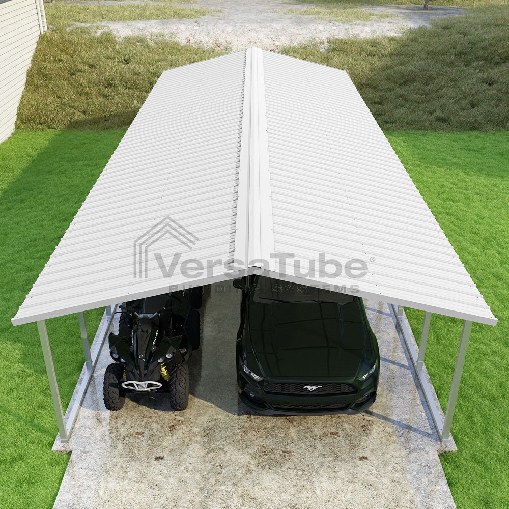 Pinnacle Series DIY carport kit features vertical sheet metal roof panels with ridge cap, gable and eave trim for an A-frame roof style and extended coverage on both ends.