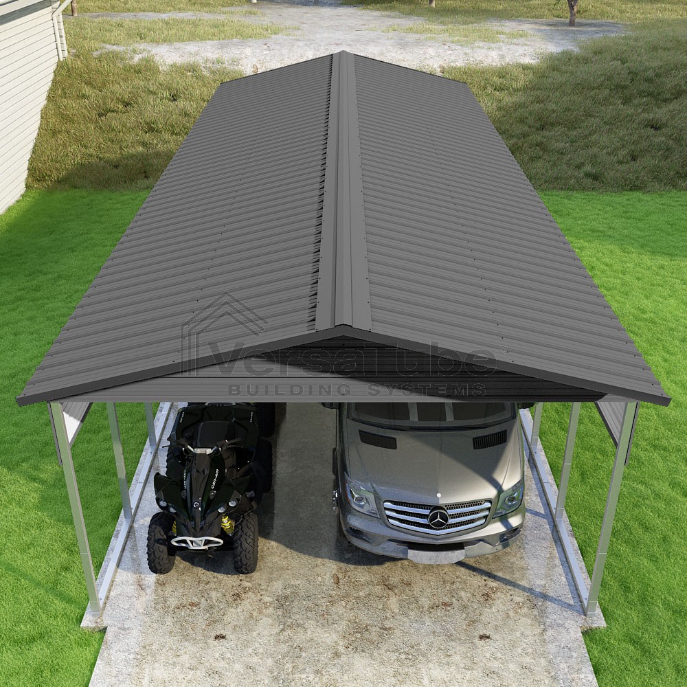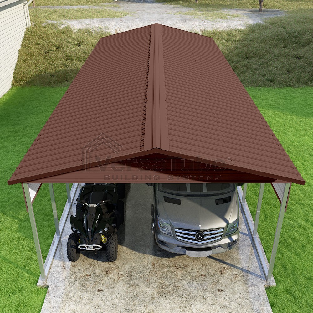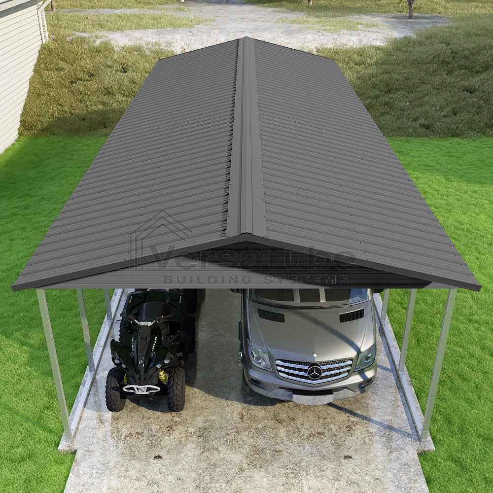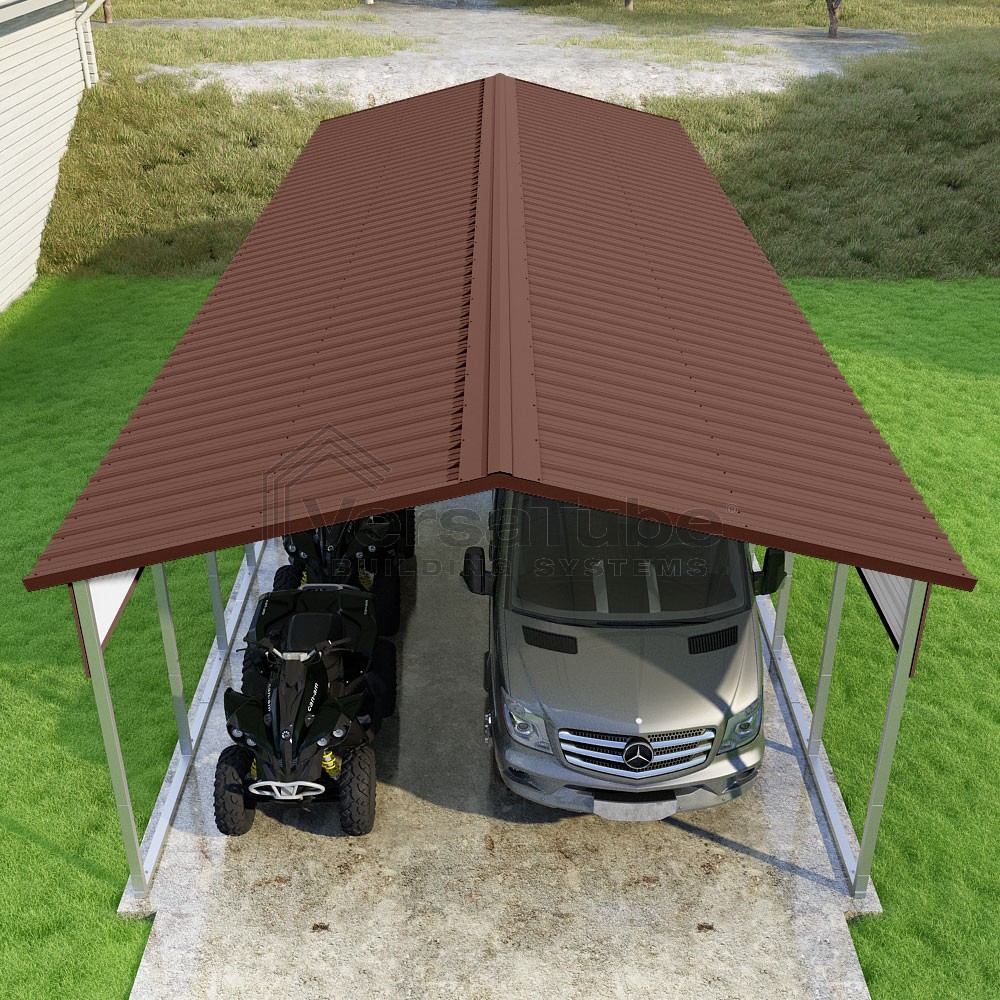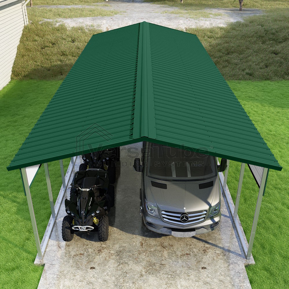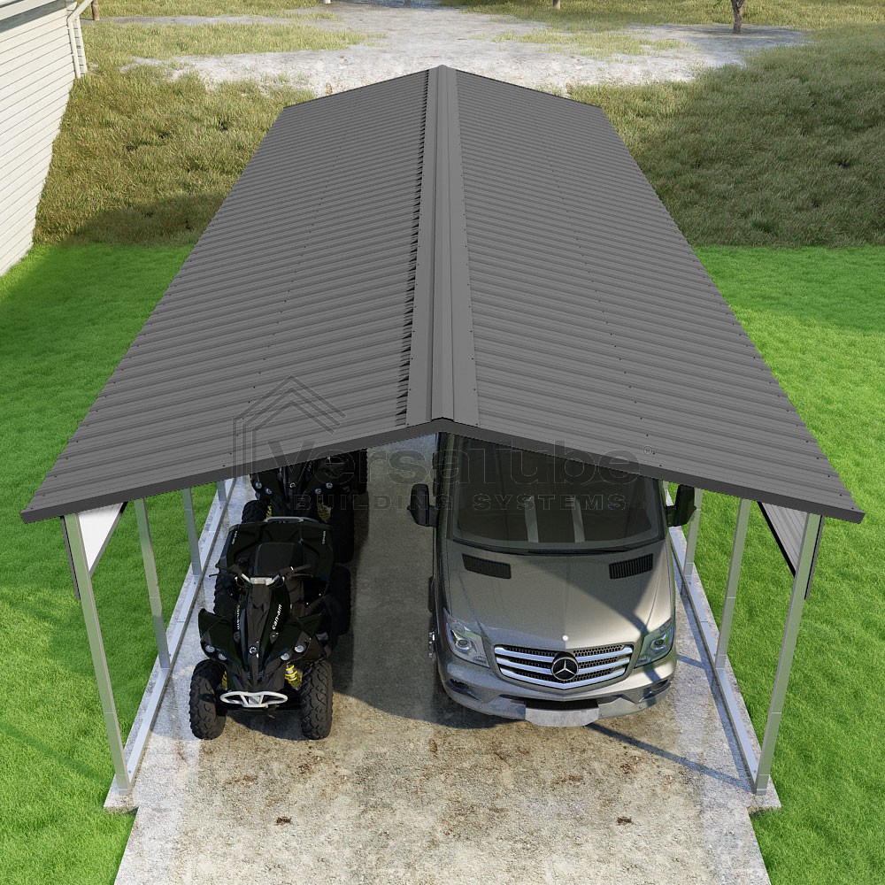 Pinnacle Series DIY carport kit features vertical sheet metal roof panels with ridge cap, gable and eave trim for an A-frame roof style and extended coverage on both ends.