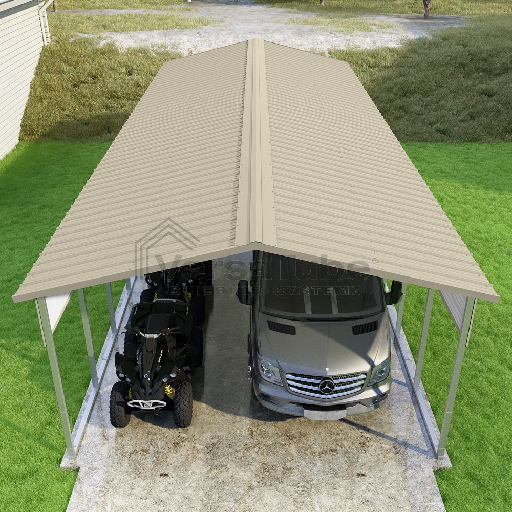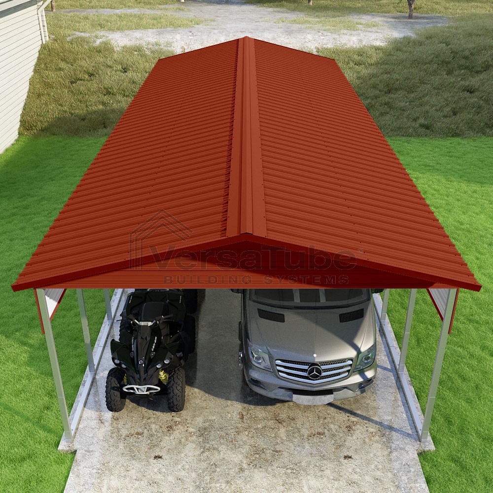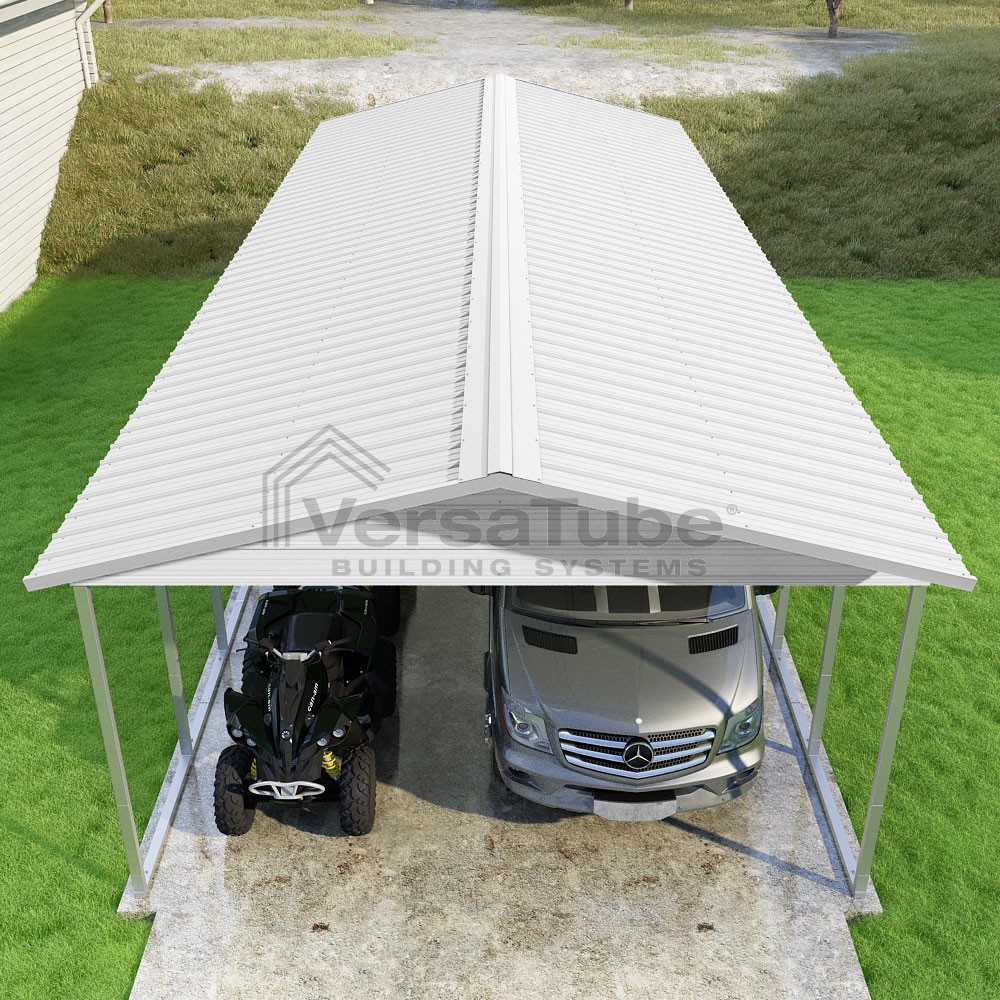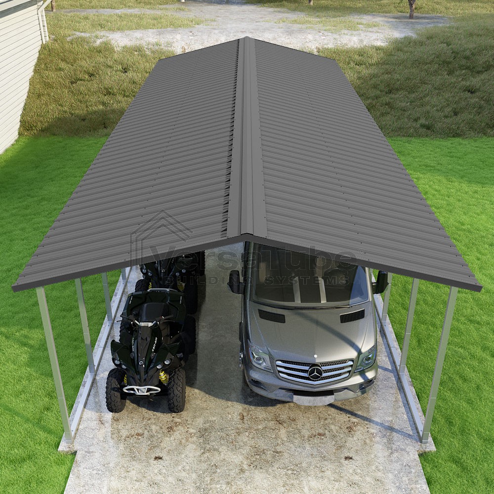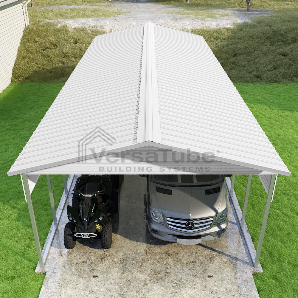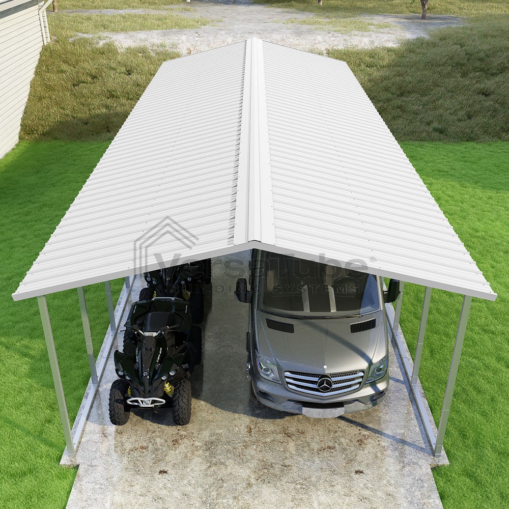 Pinnacle Series DIY carport kit features vertical sheet metal roof panels with ridge cap, gable and eave trim for an A-frame roof style and extended coverage on both ends.