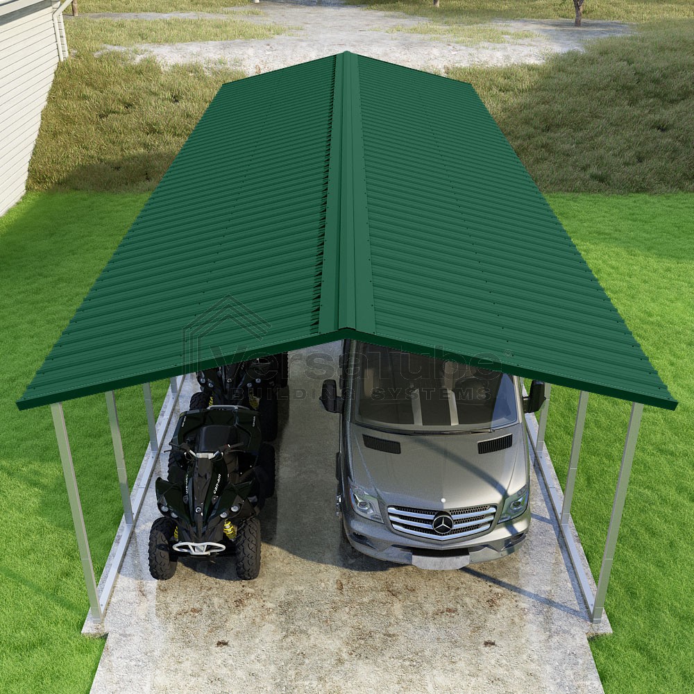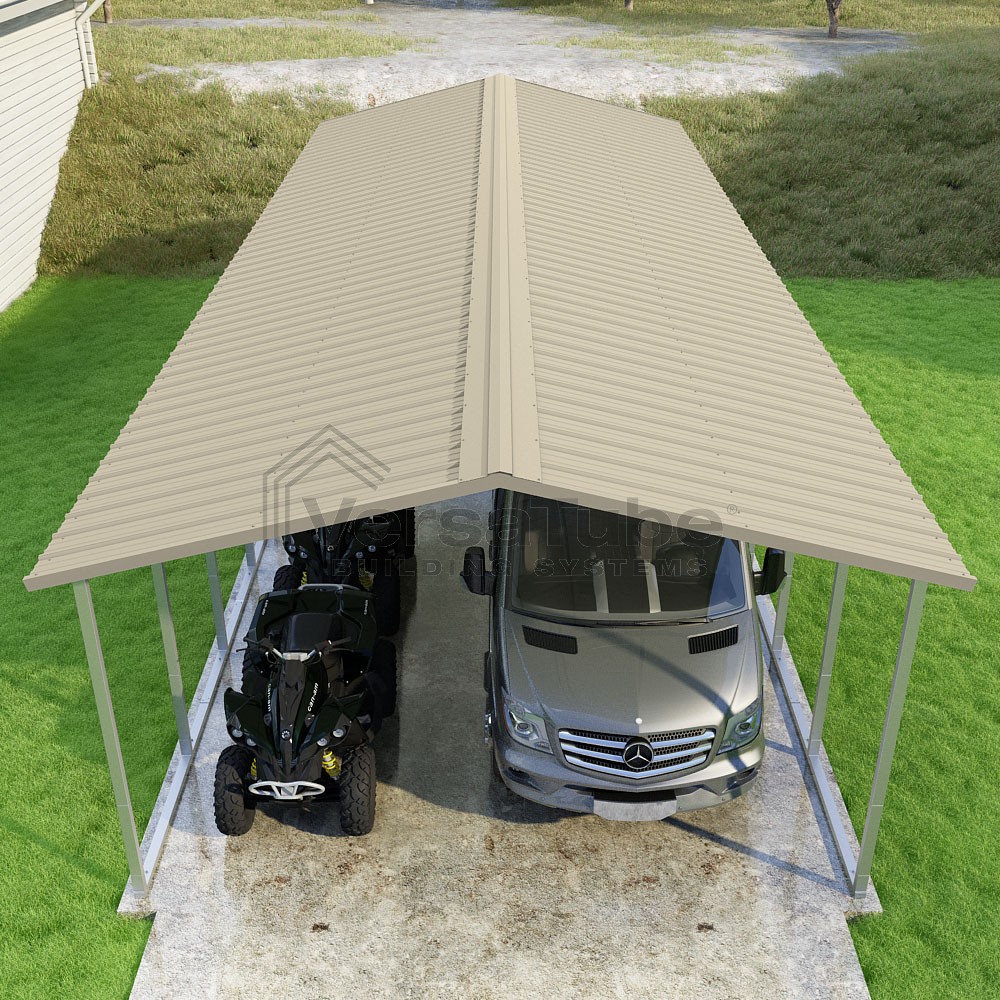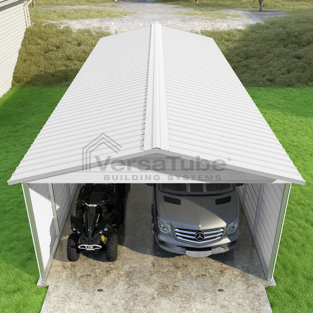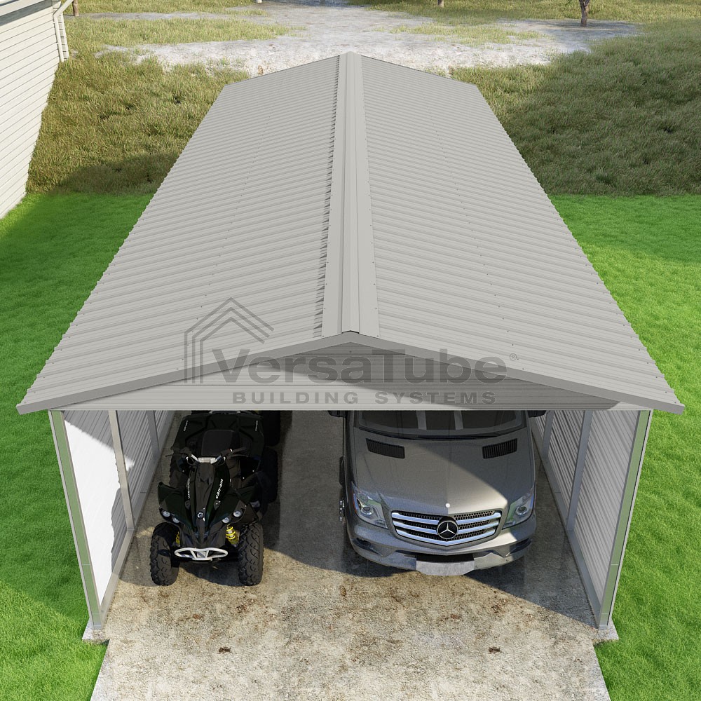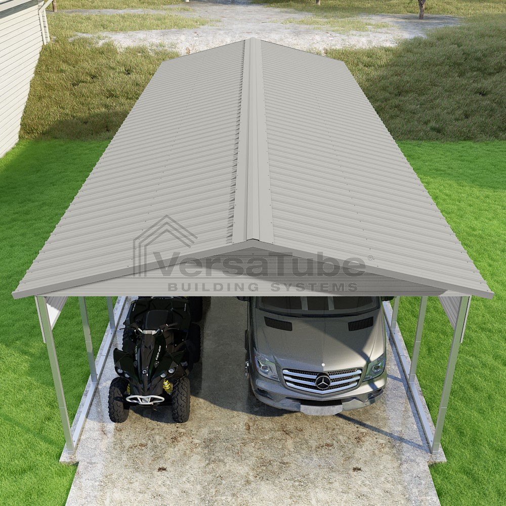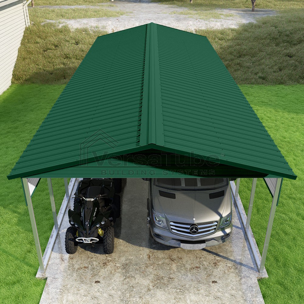 Pinnacle Series DIY carport kit features vertical sheet metal roof panels with ridge cap, gable and eave trim for an A-frame roof style and extended coverage on both ends.