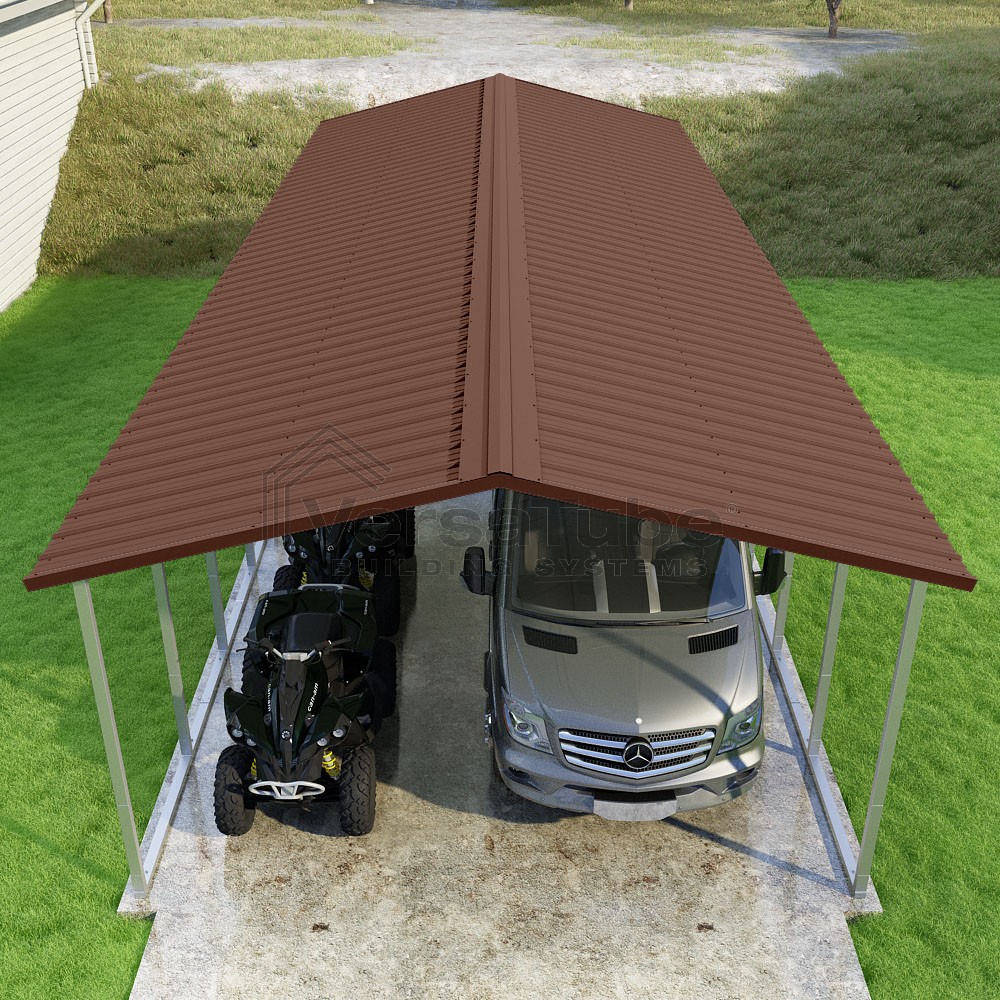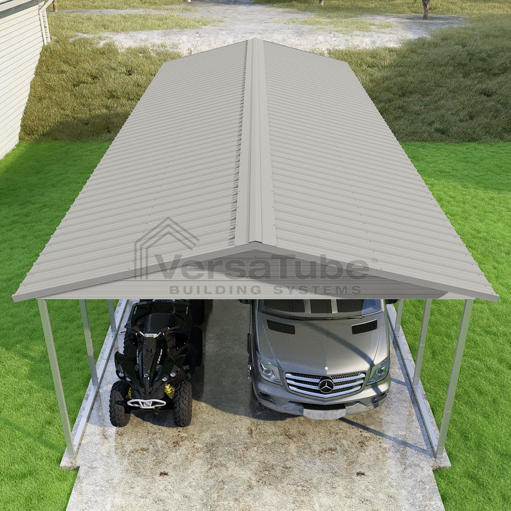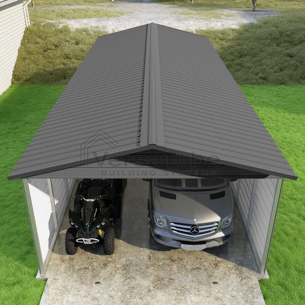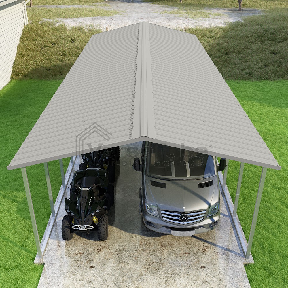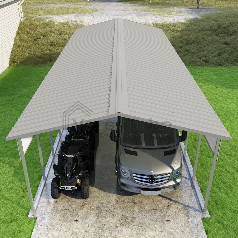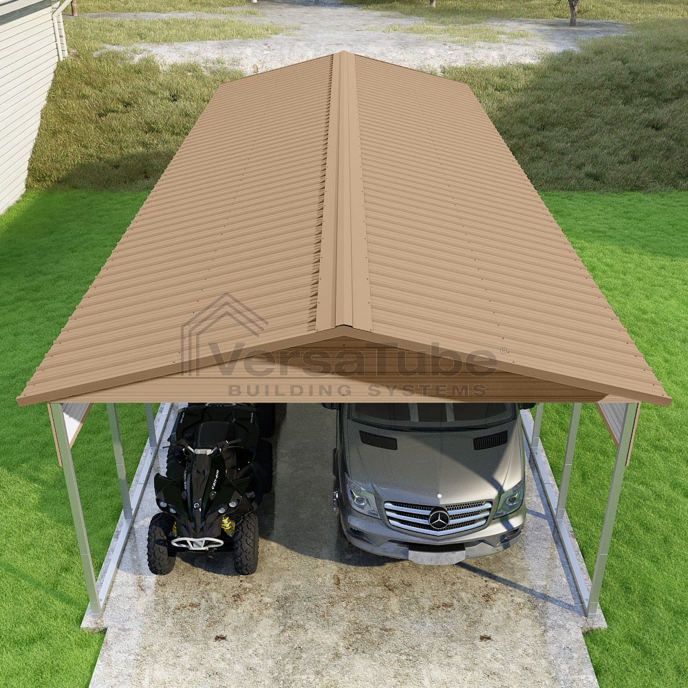 Pinnacle Series DIY carport kit features vertical sheet metal roof panels with ridge cap, gable and eave trim for an A-frame roof style and extended coverage on both ends.