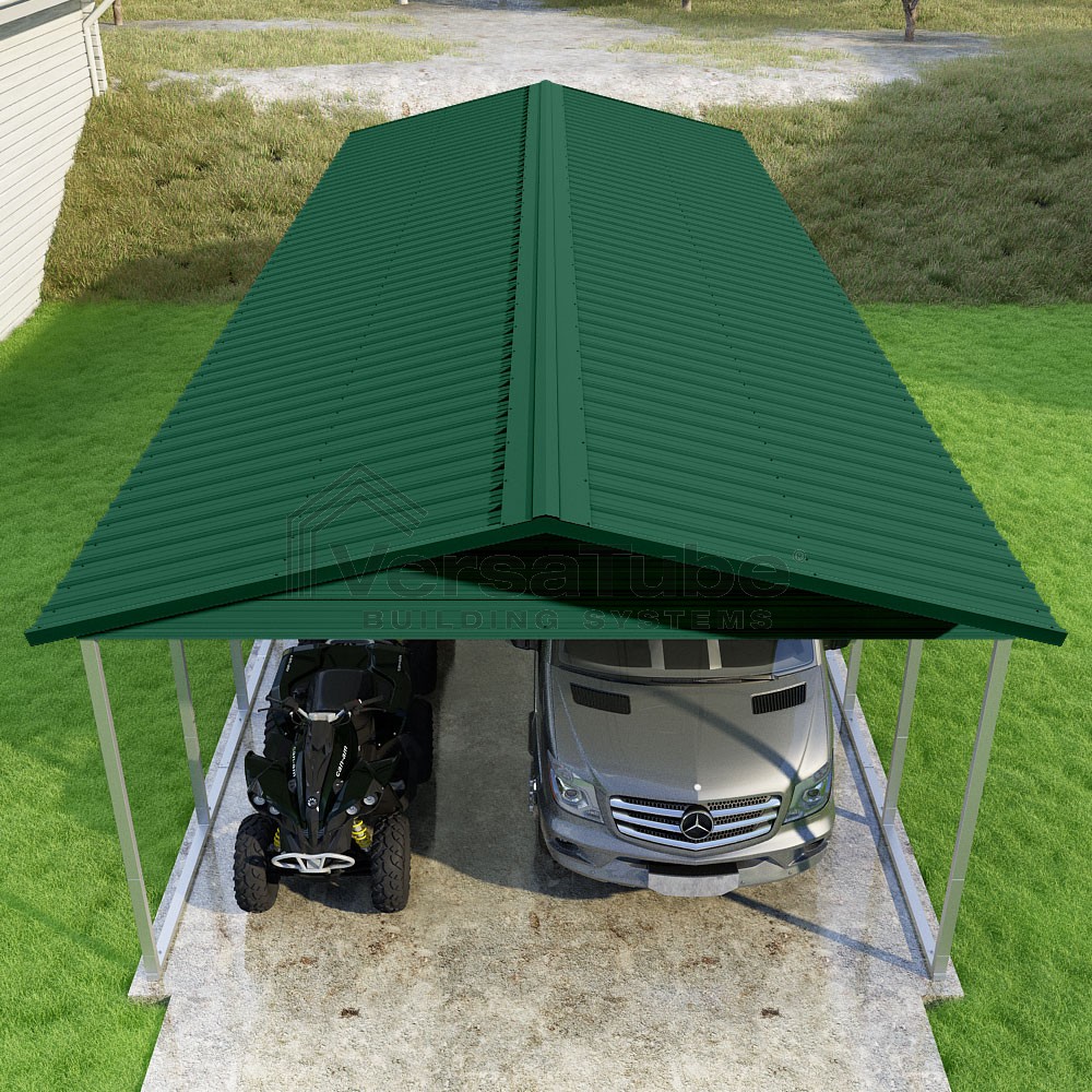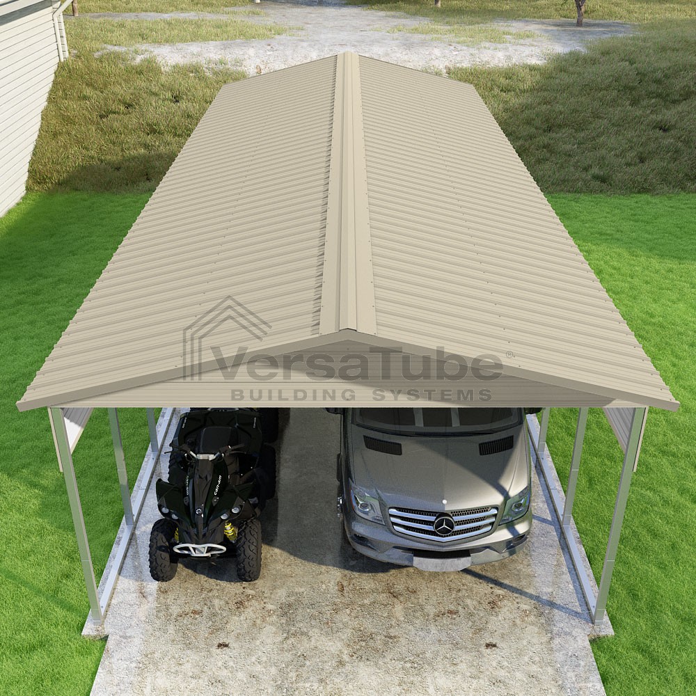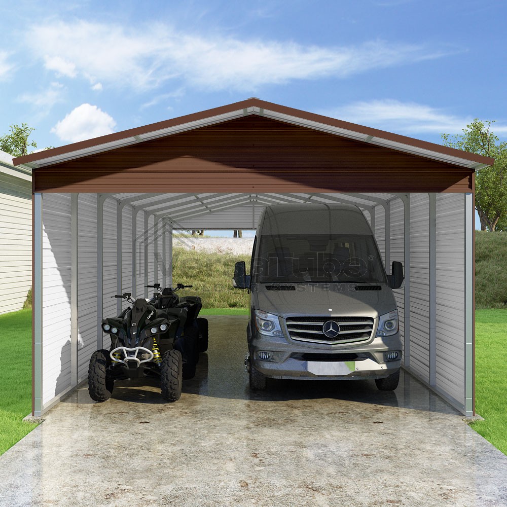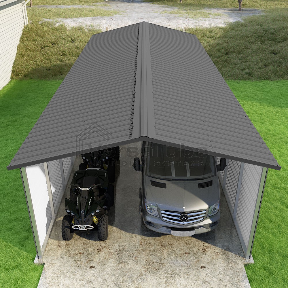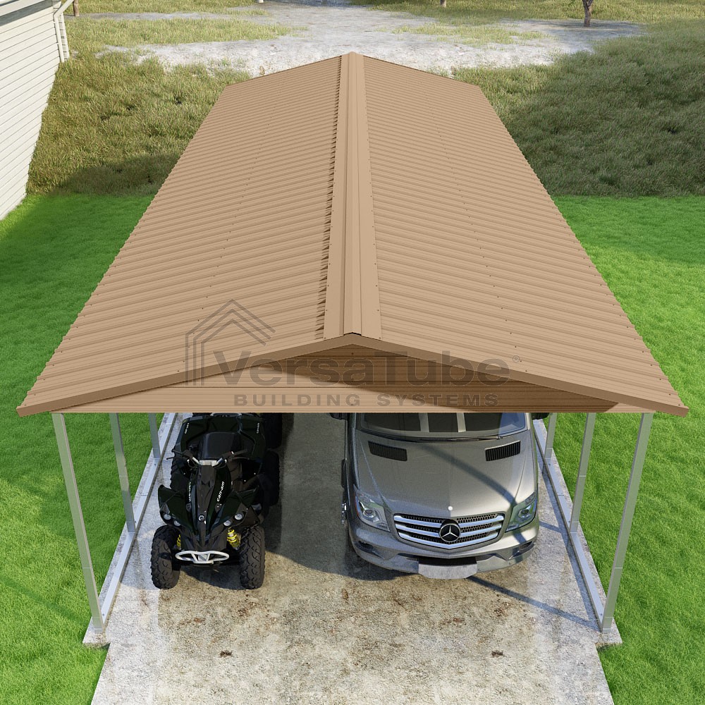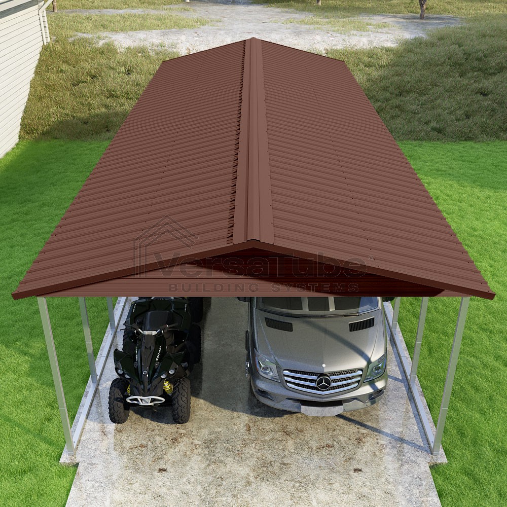 Pinnacle Series DIY carport kit features vertical sheet metal roof panels with ridge cap, gable and eave trim for an A-frame roof style and extended coverage on both ends.