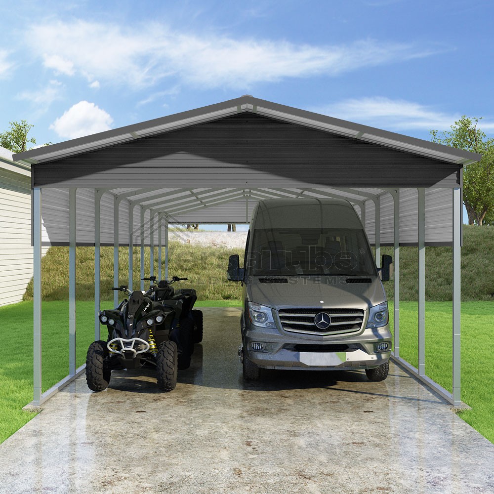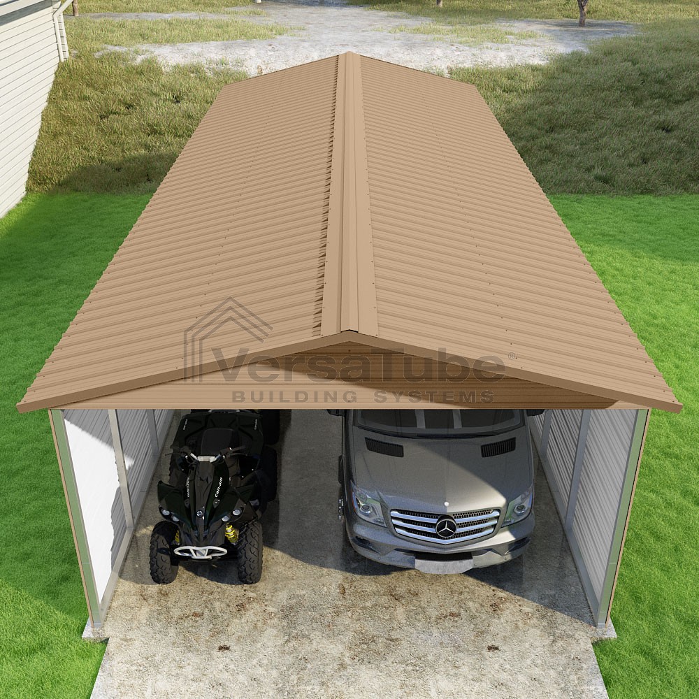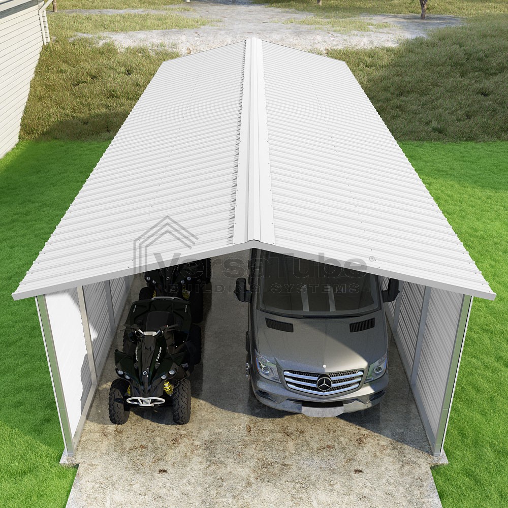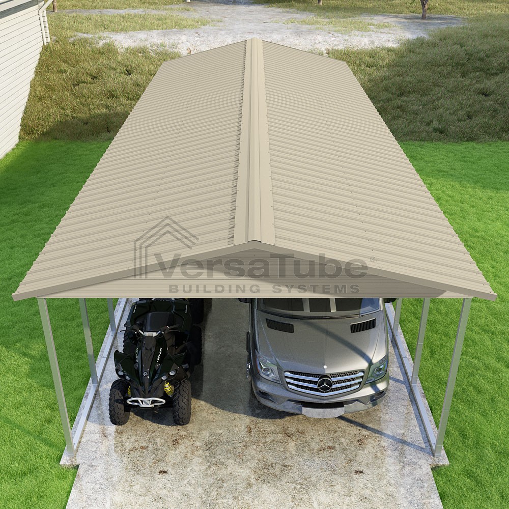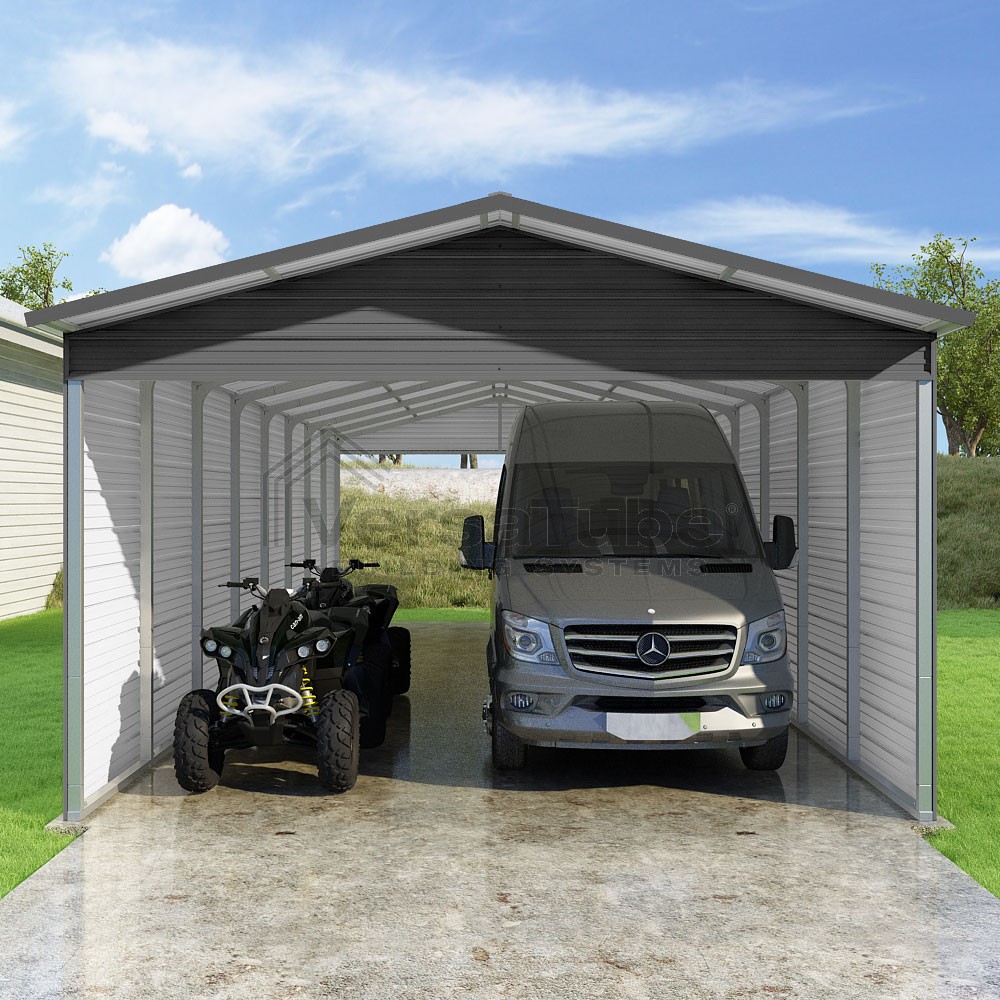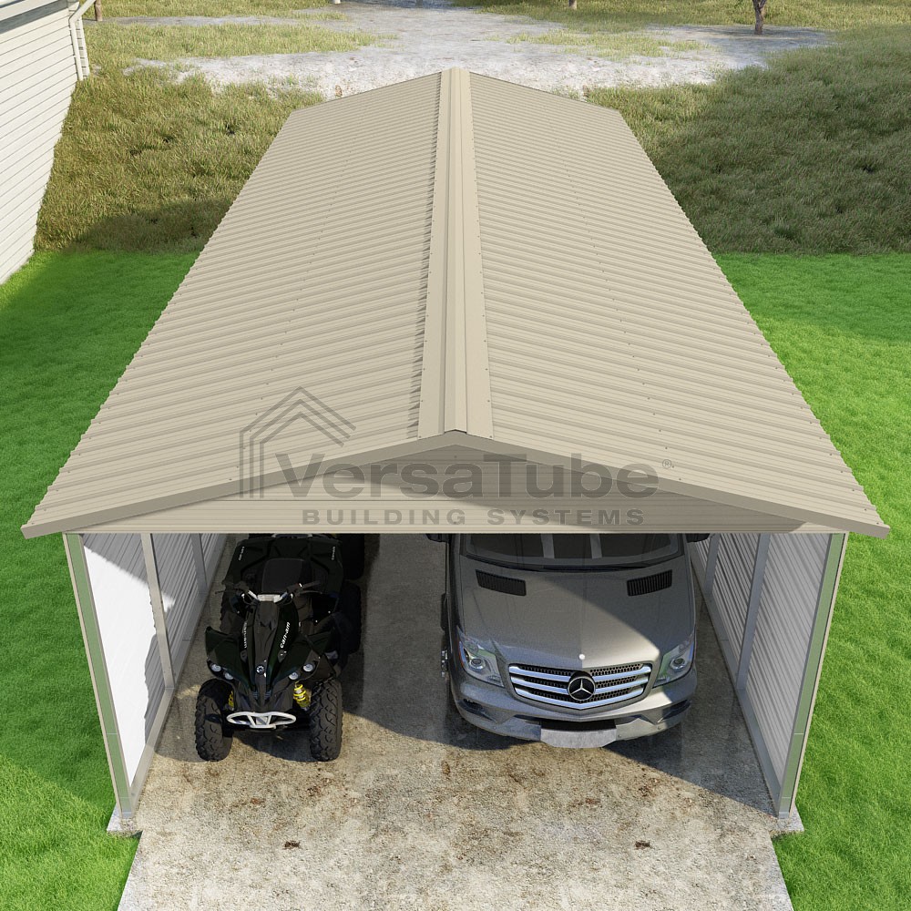 Pinnacle Series DIY carport kit features vertical sheet metal roof panels with ridge cap, gable and eave trim for an A-frame roof style and extended coverage on both ends.