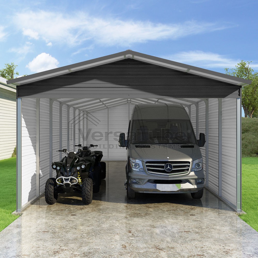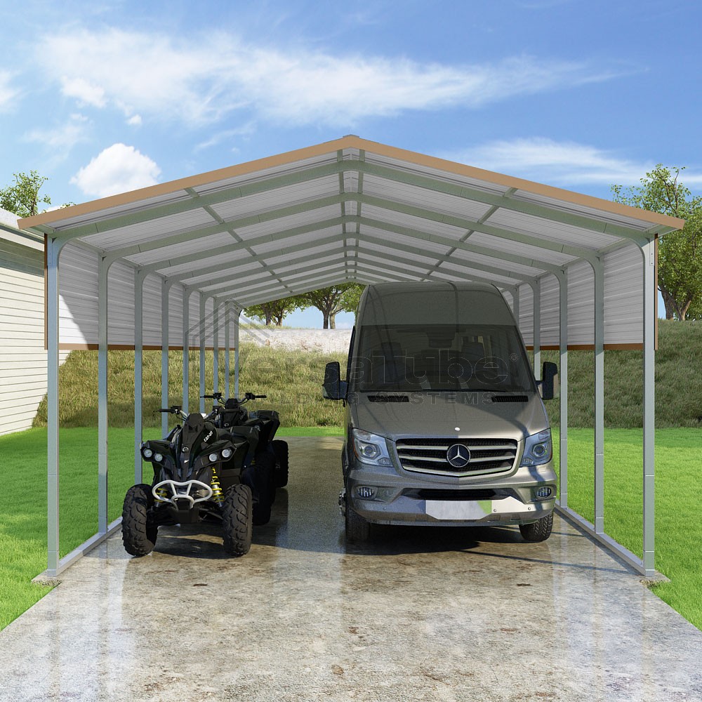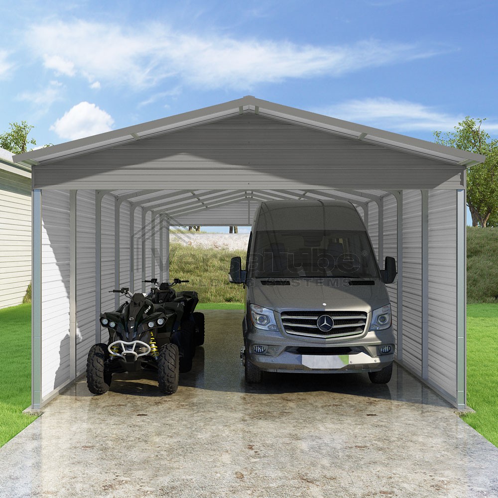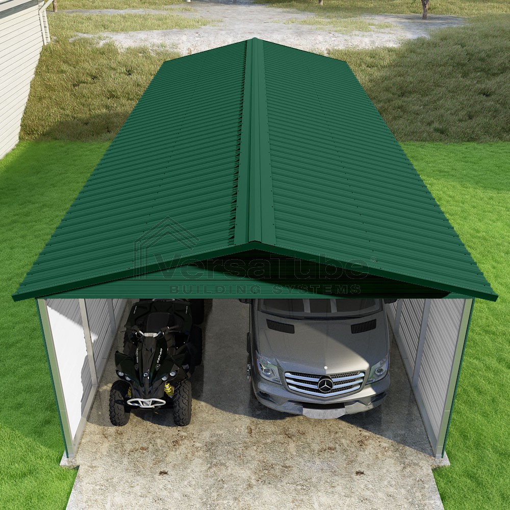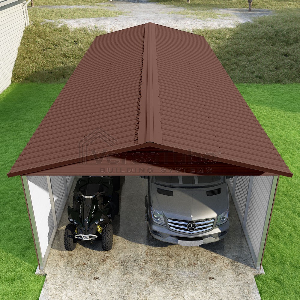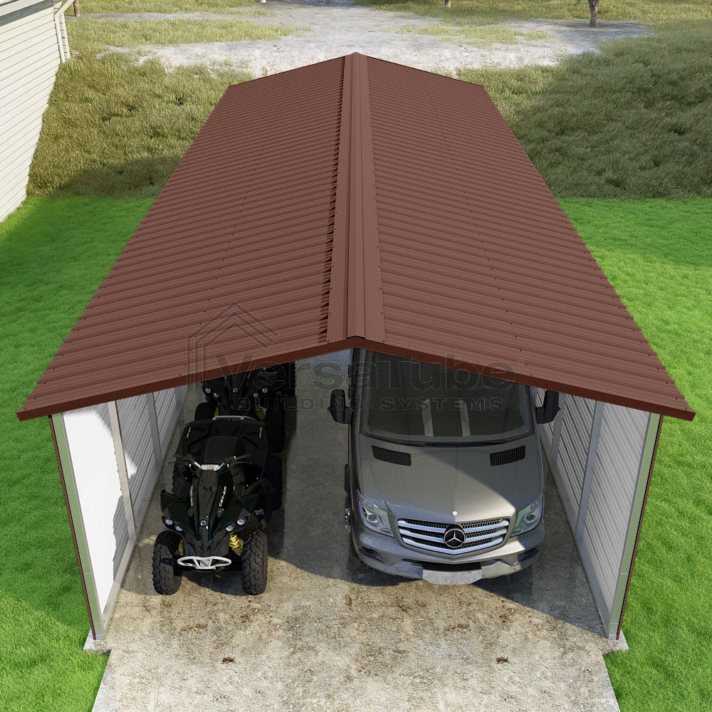 Pinnacle Series DIY carport kit features vertical sheet metal roof panels with ridge cap, gable and eave trim for an A-frame roof style and extended coverage on both ends.