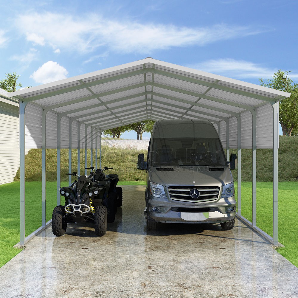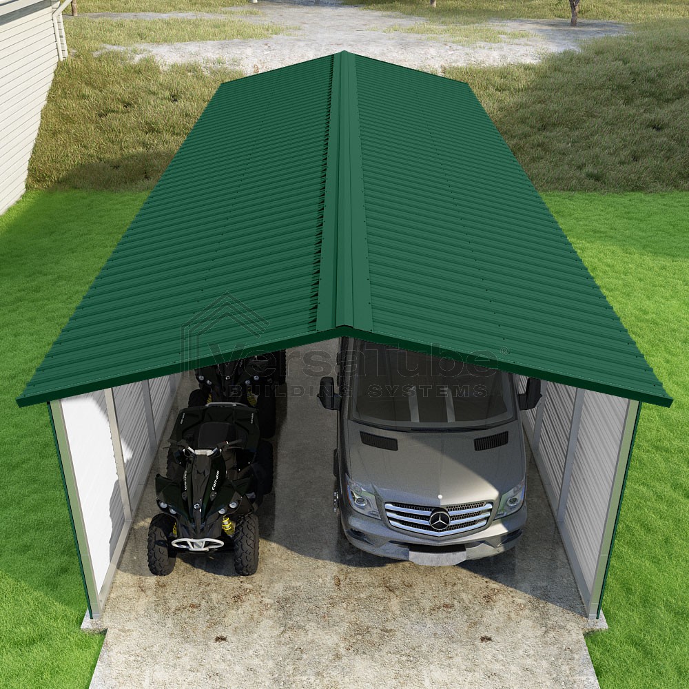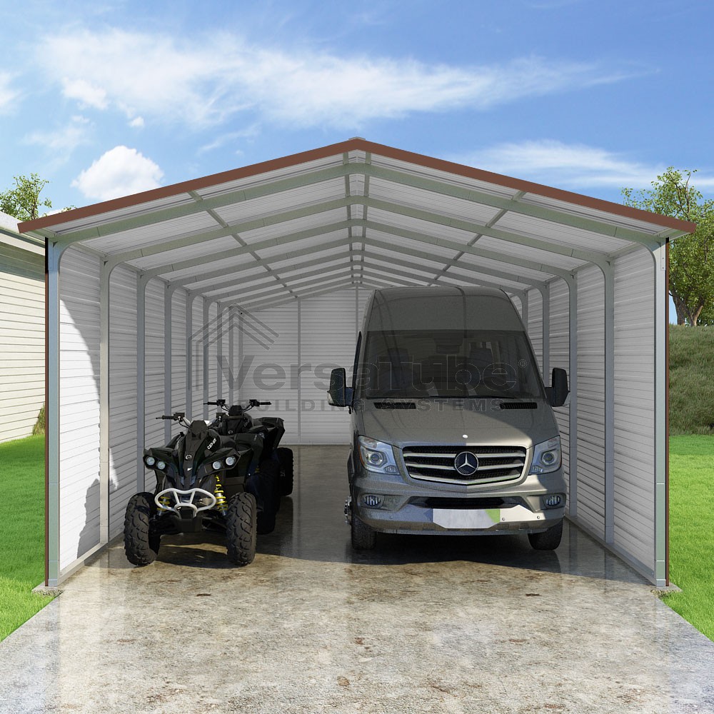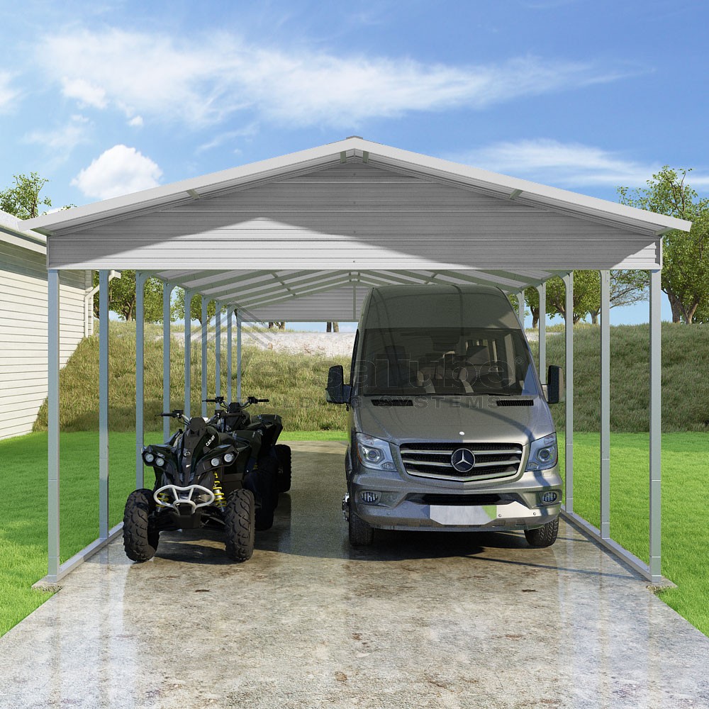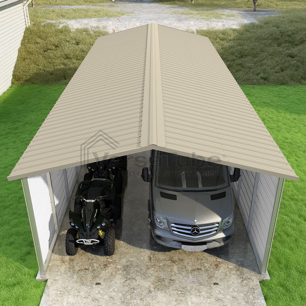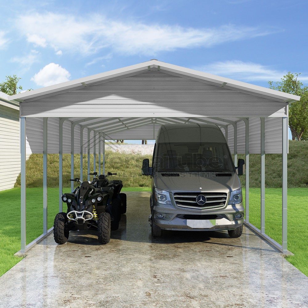 Pinnacle Series DIY carport kit features vertical sheet metal roof panels with ridge cap, gable and eave trim for an A-frame roof style and extended coverage on both ends.