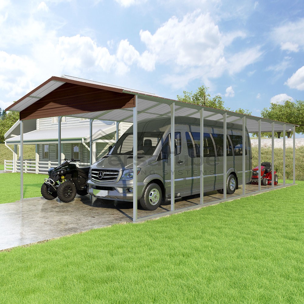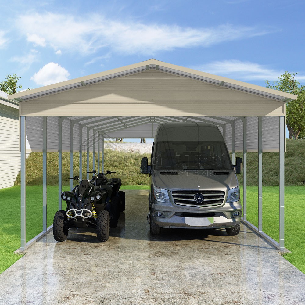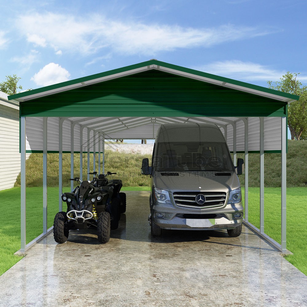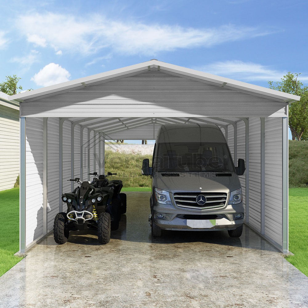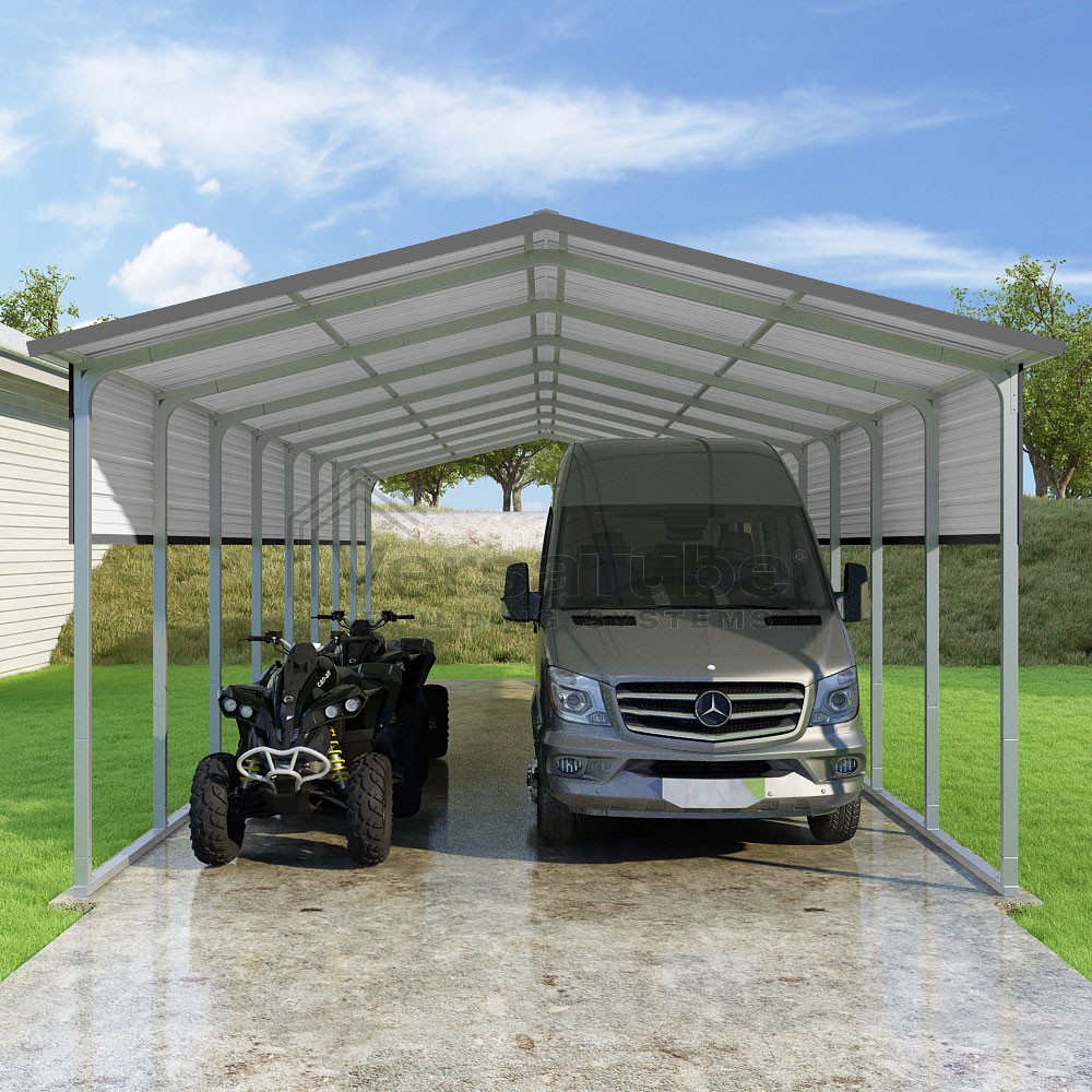 Pinnacle Series DIY carport kit features vertical sheet metal roof panels with ridge cap, gable and eave trim for an A-frame roof style and extended coverage on both ends.
