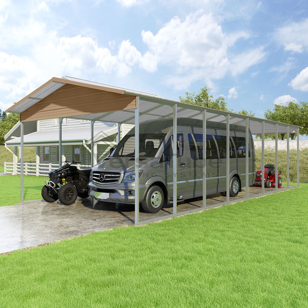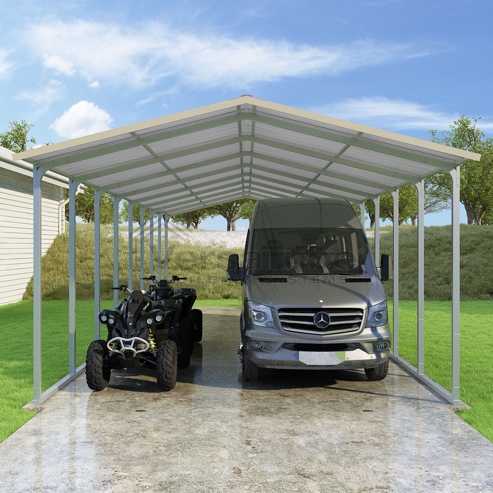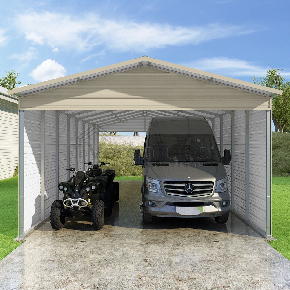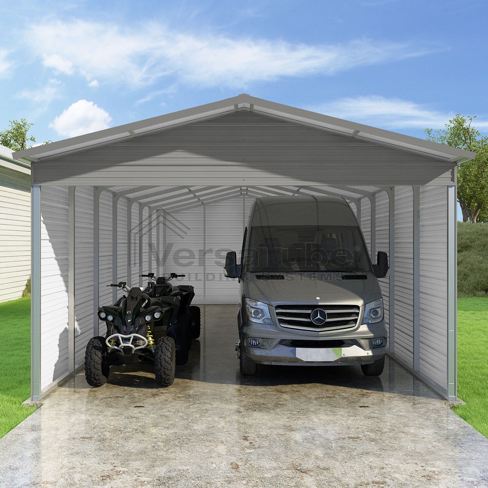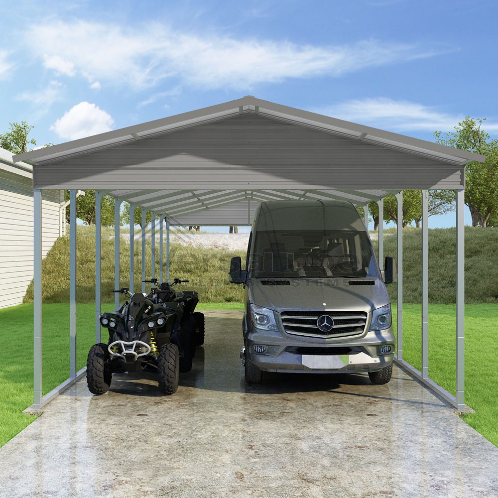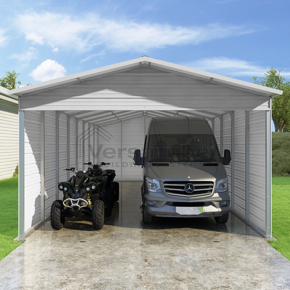 Pinnacle Series DIY carport kit features vertical sheet metal roof panels with ridge cap, gable and eave trim for an A-frame roof style and extended coverage on both ends.