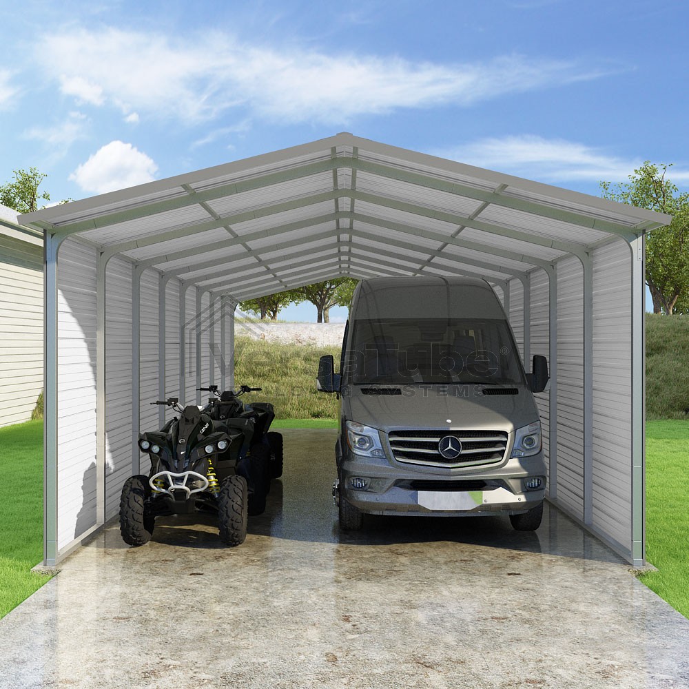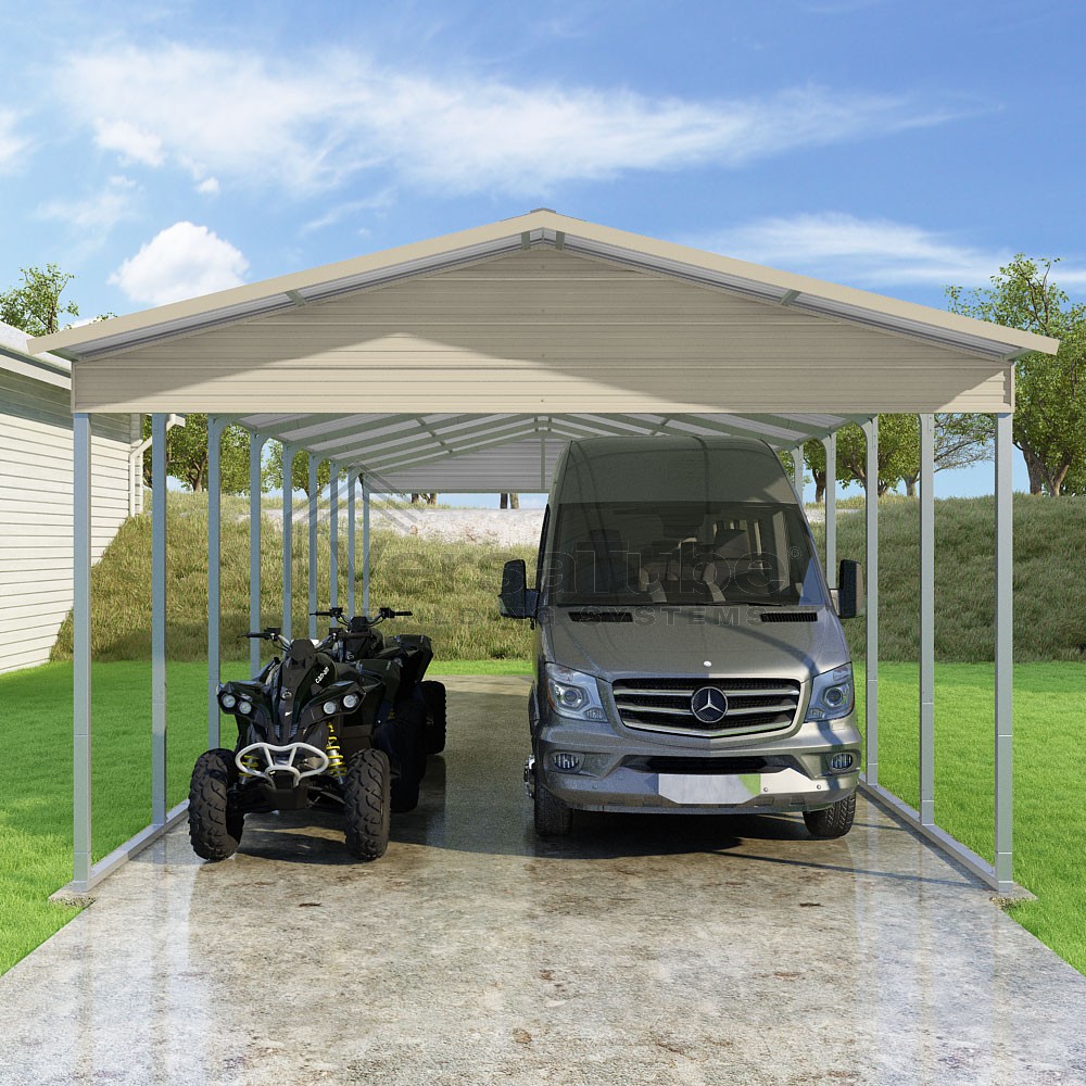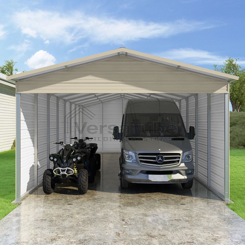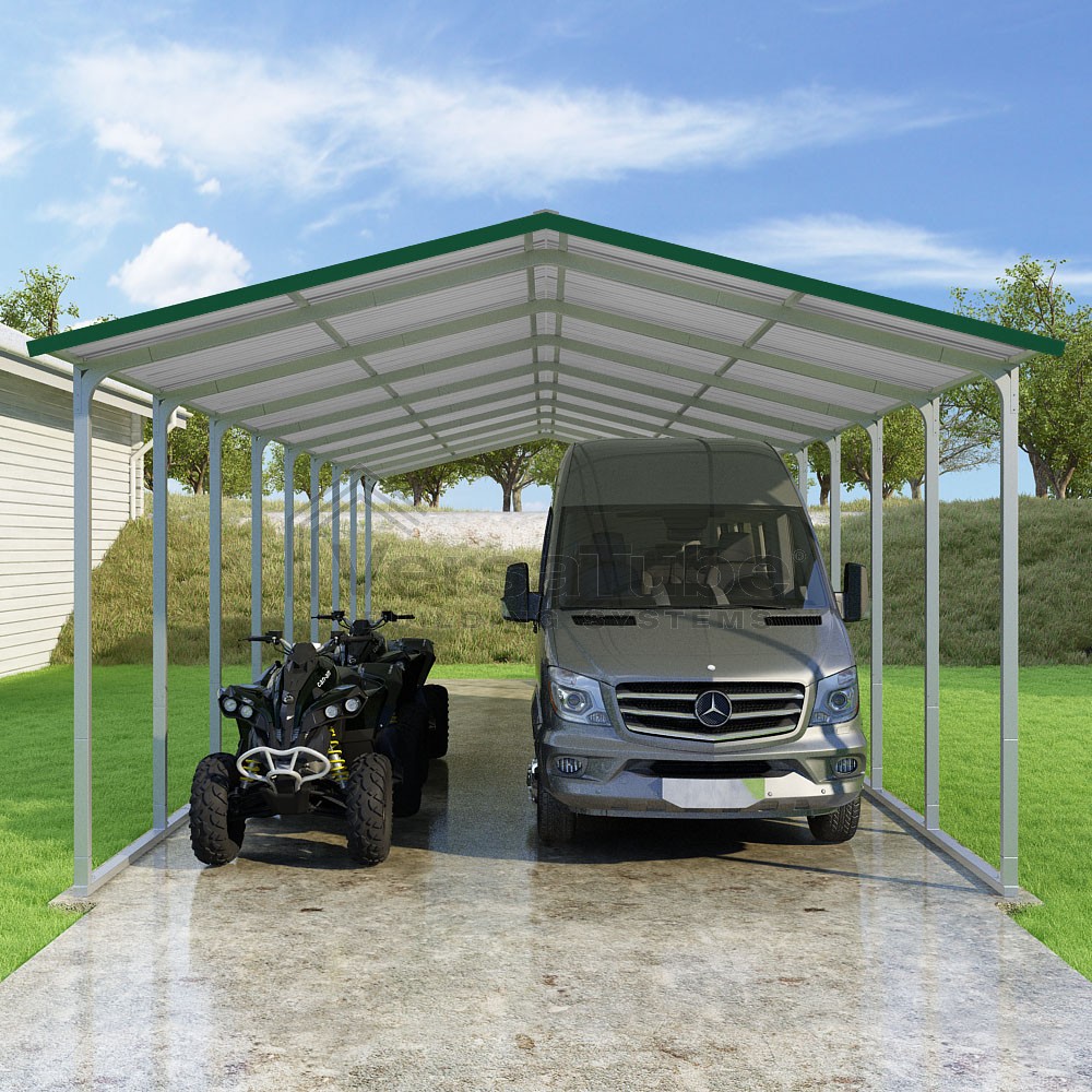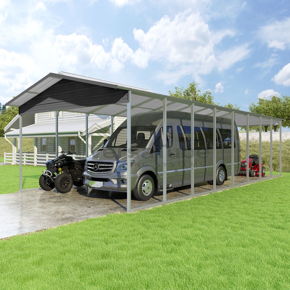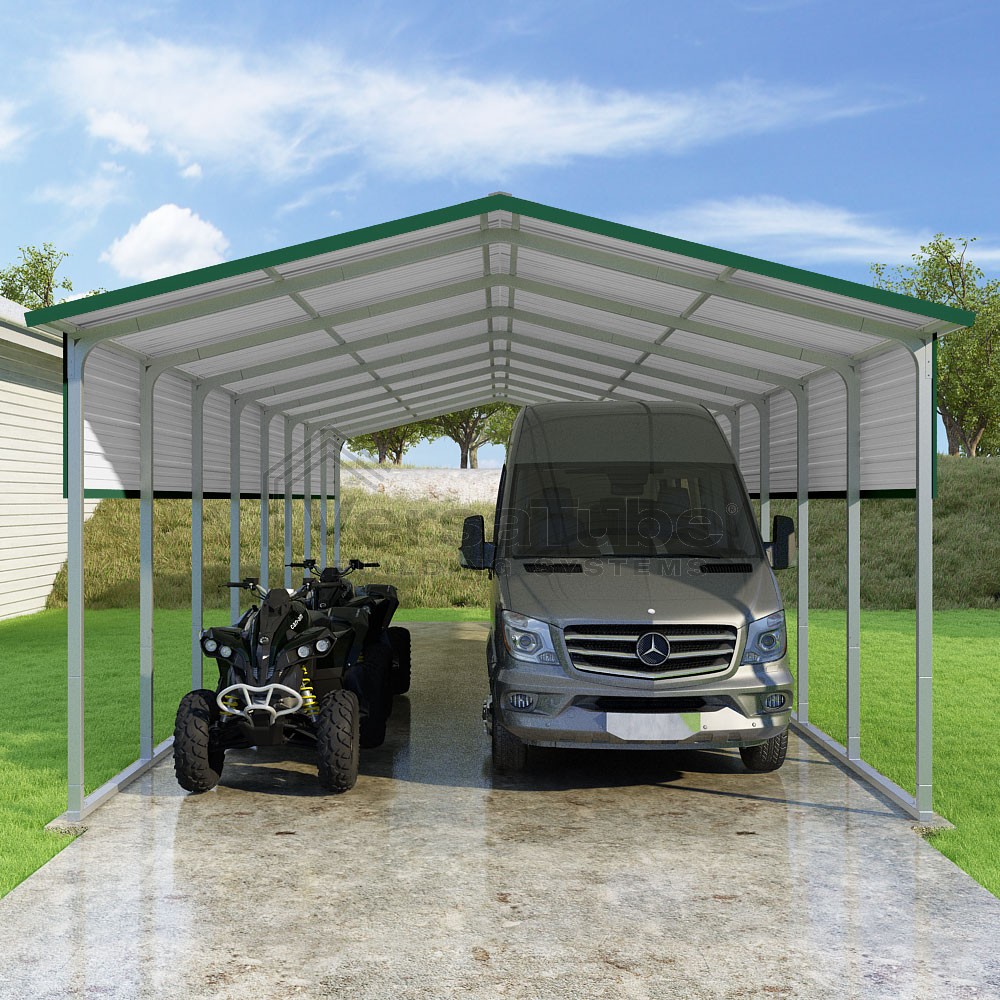 Pinnacle Series DIY carport kit features vertical sheet metal roof panels with ridge cap, gable and eave trim for an A-frame roof style and extended coverage on both ends.