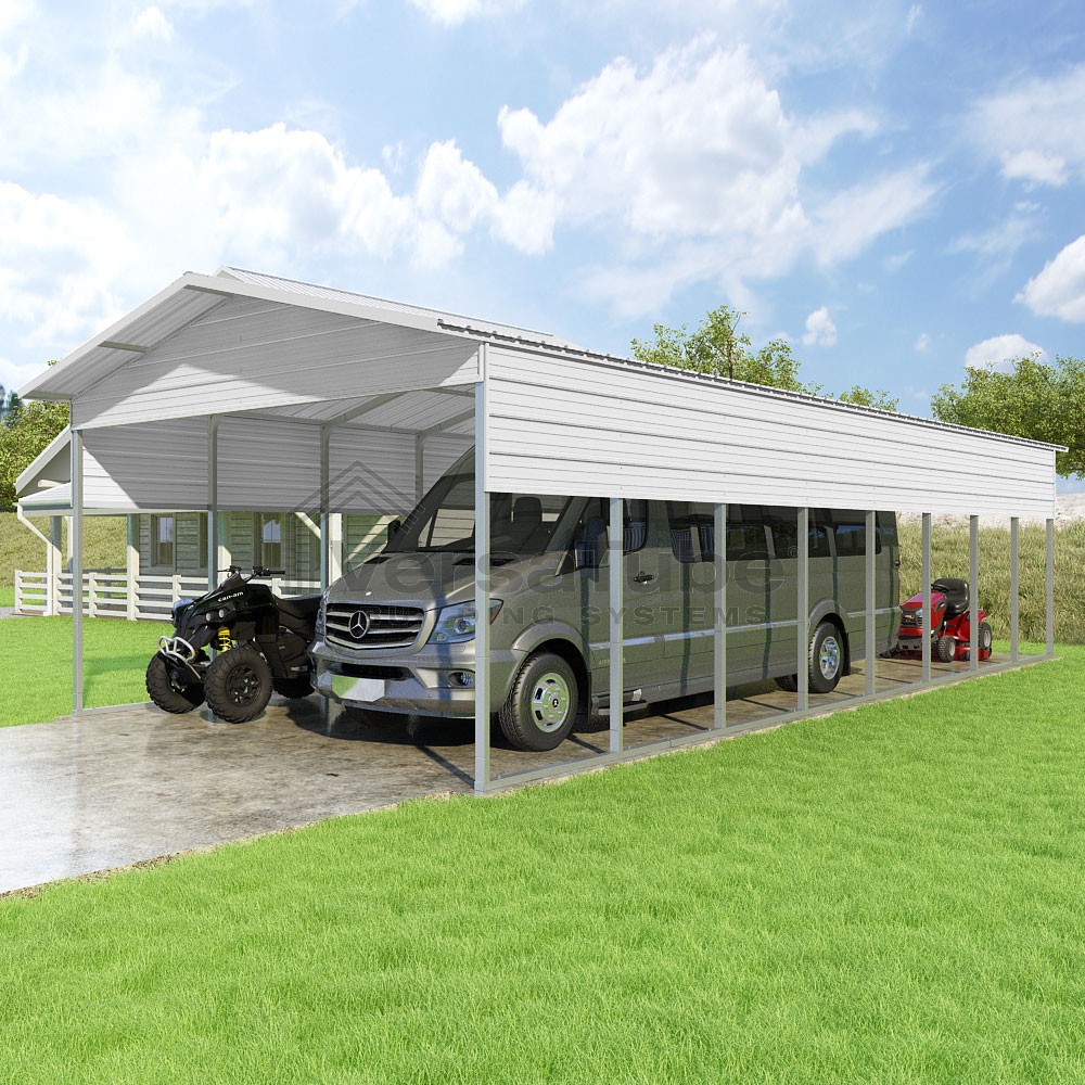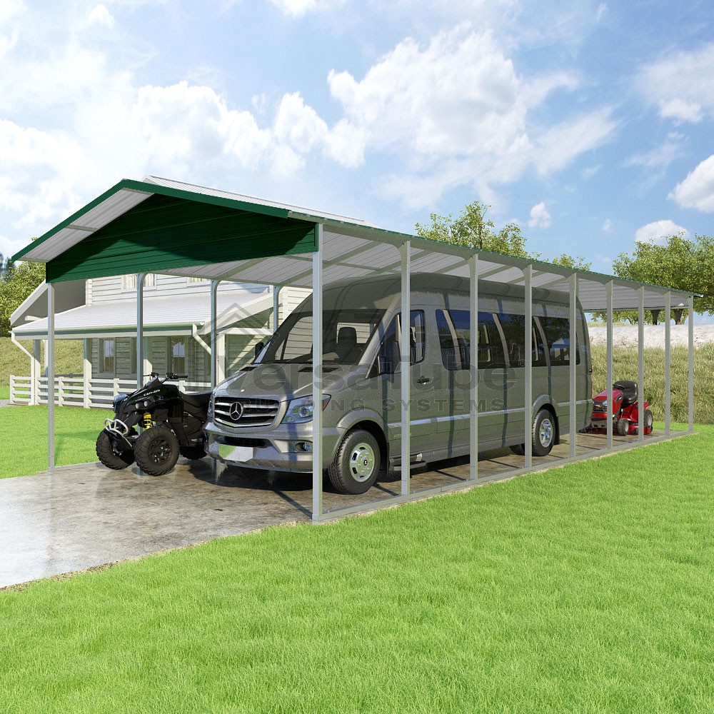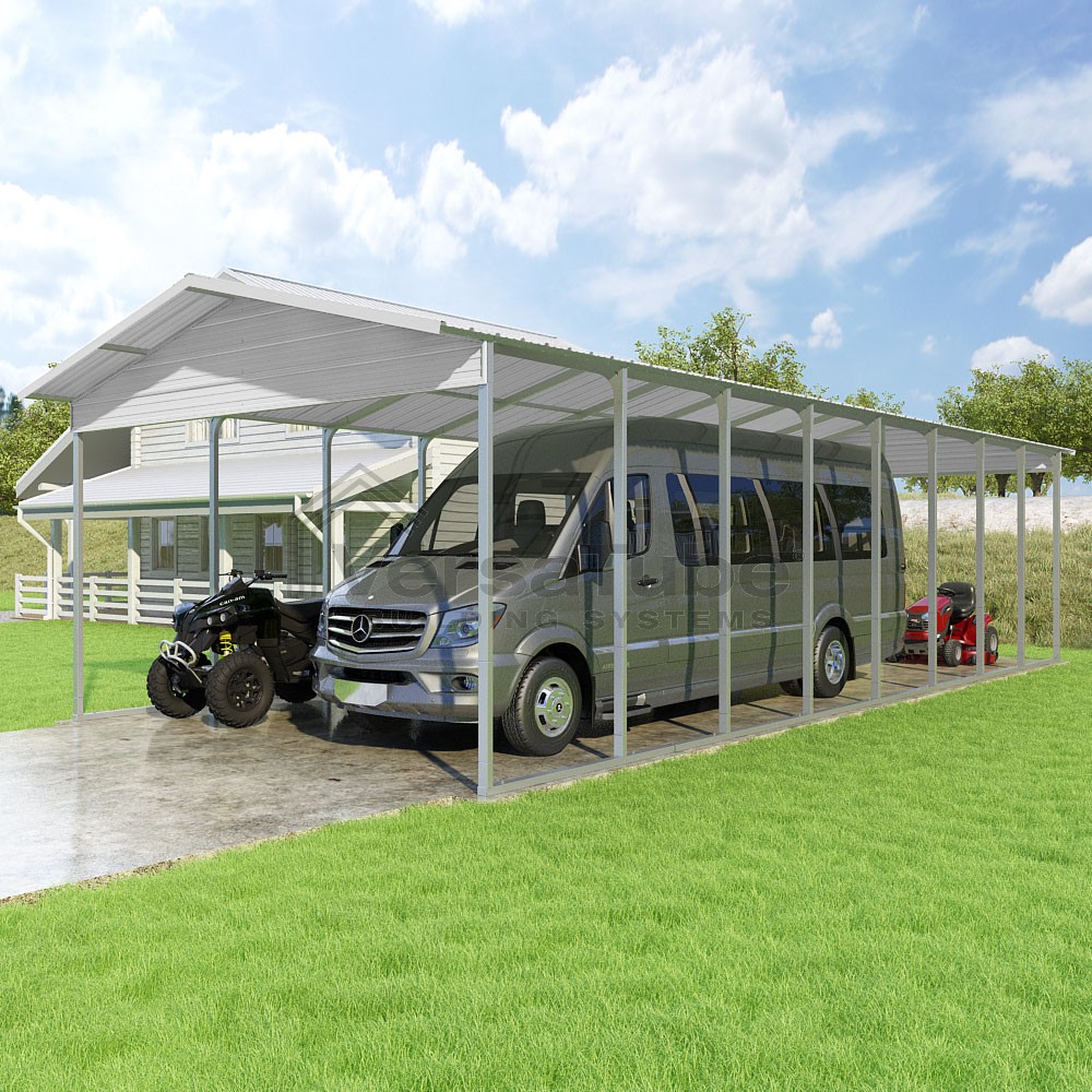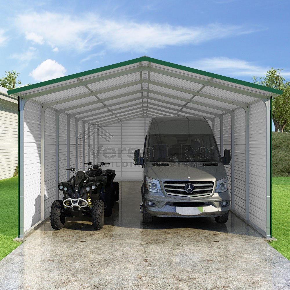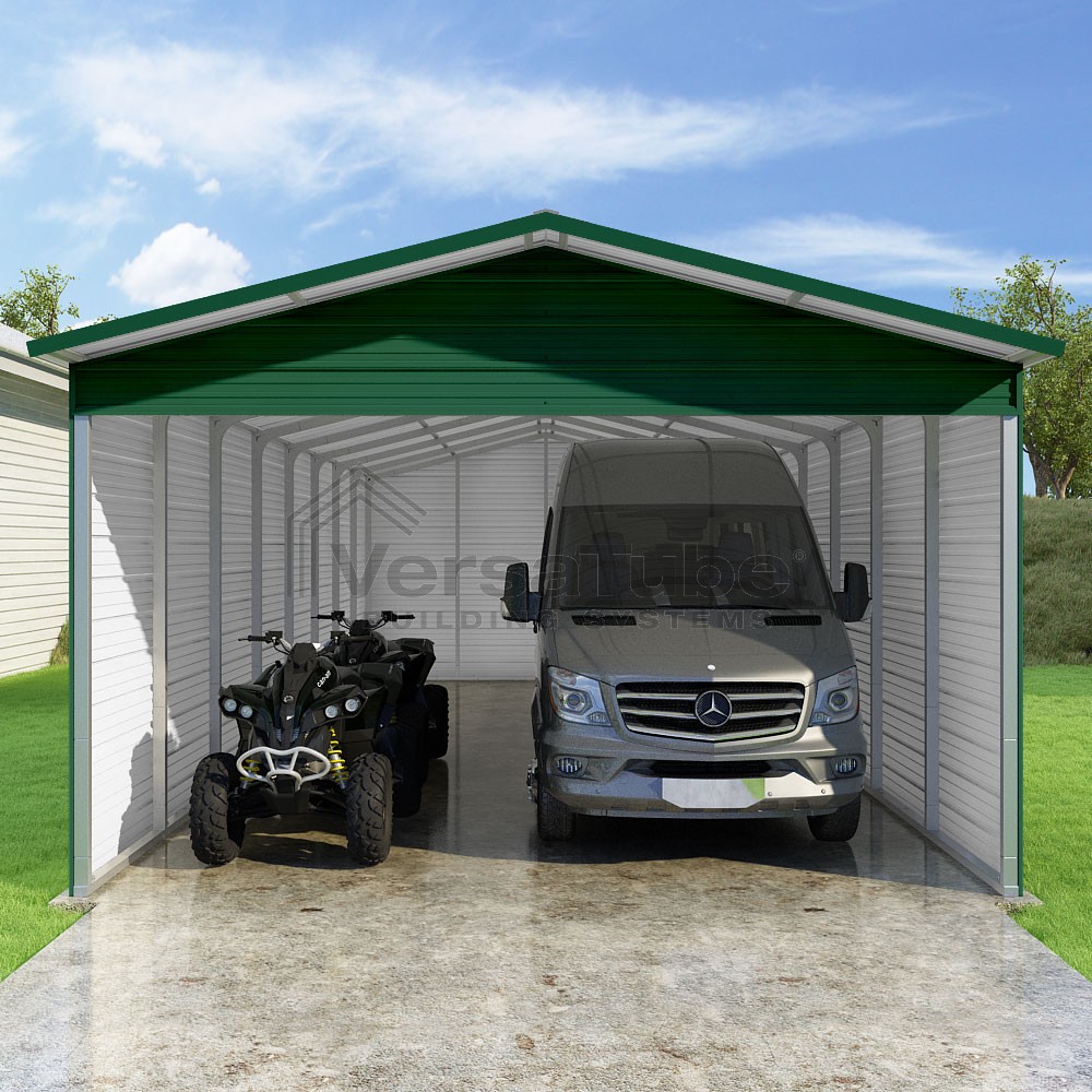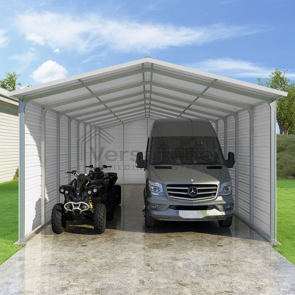 Pinnacle Series DIY carport kit features vertical sheet metal roof panels with ridge cap, gable and eave trim for an A-frame roof style and extended coverage on both ends.