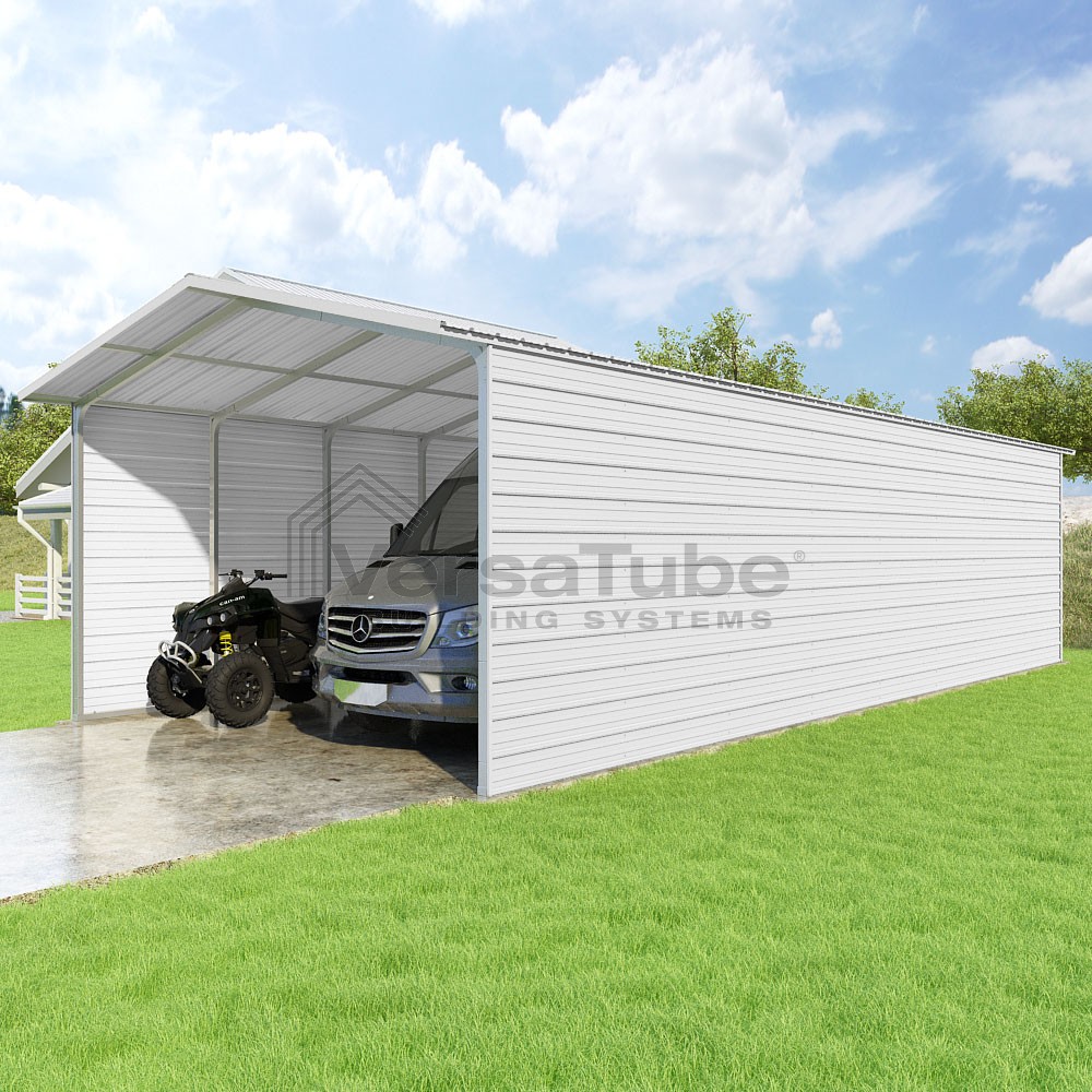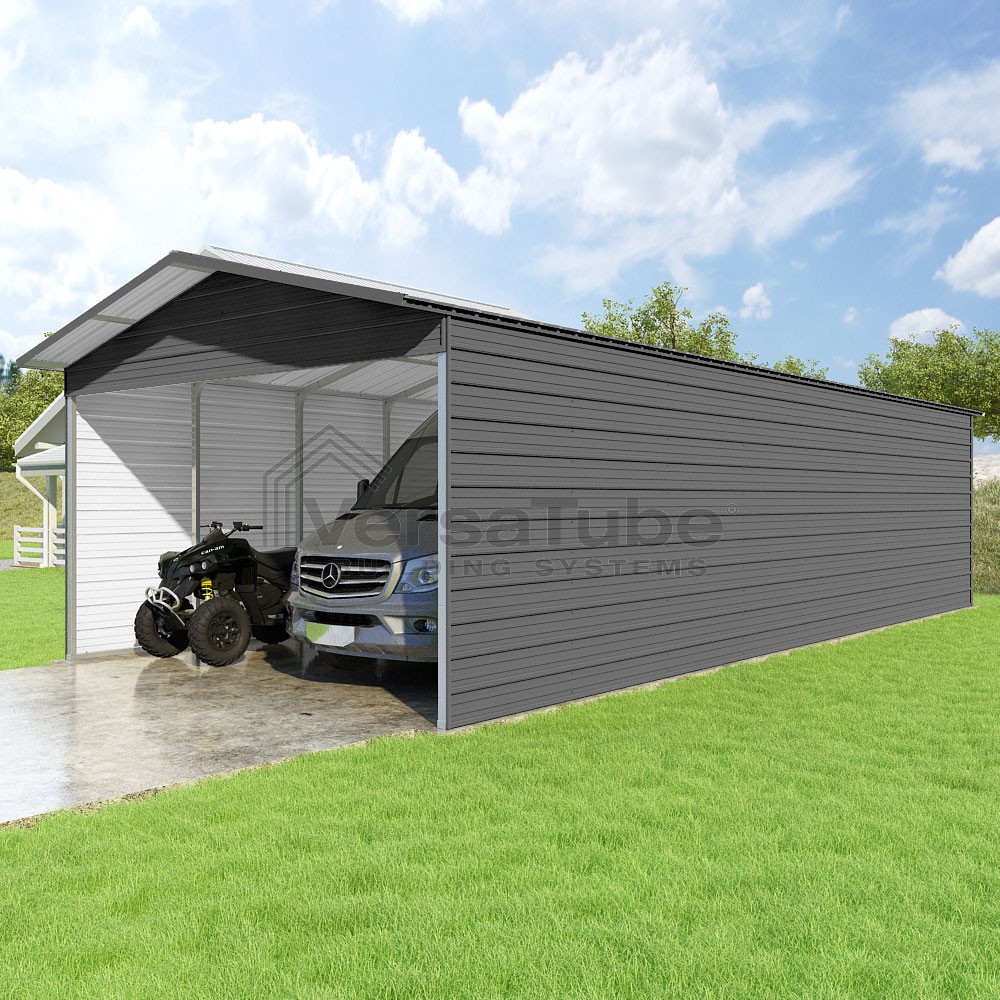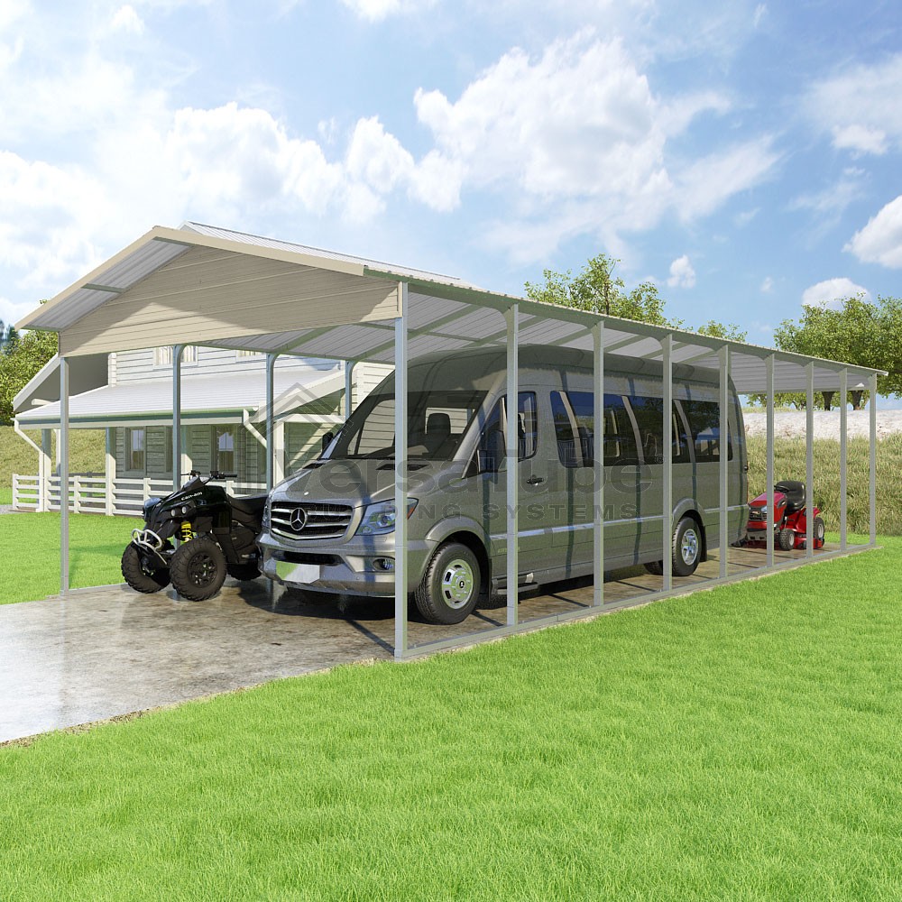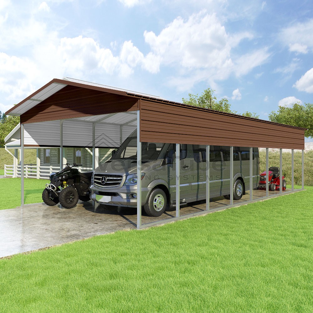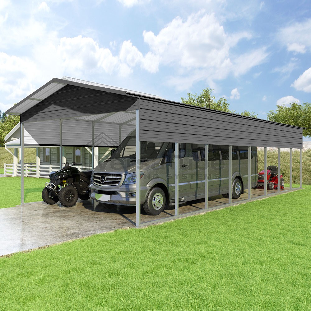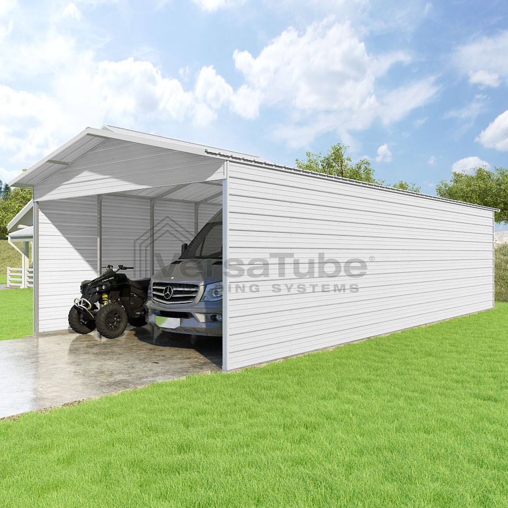 Pinnacle Series DIY carport kit features vertical sheet metal roof panels with ridge cap, gable and eave trim for an A-frame roof style and extended coverage on both ends.