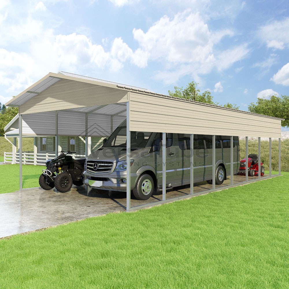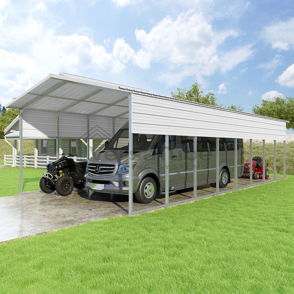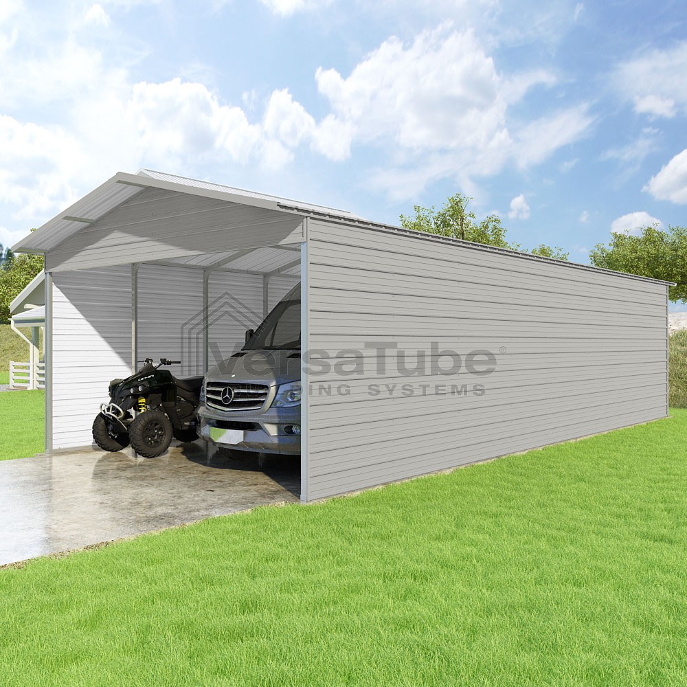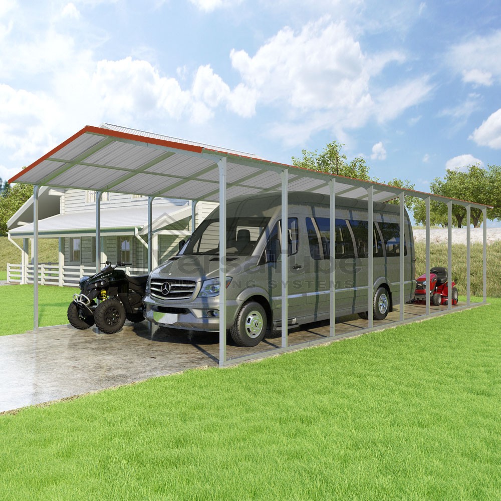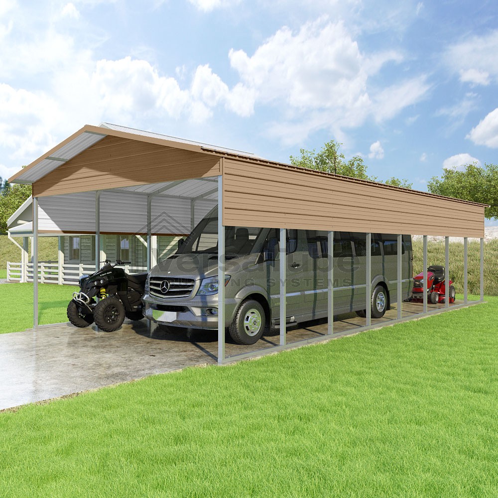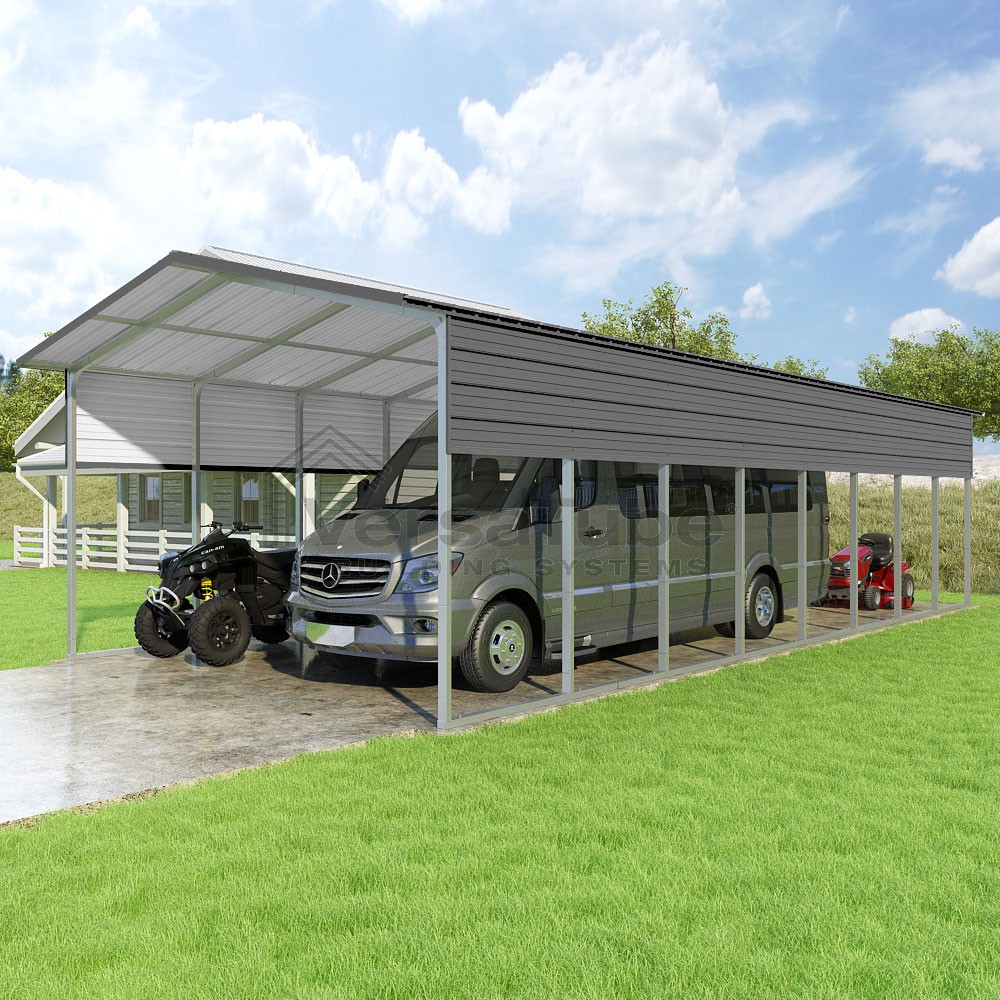 Pinnacle Series DIY carport kit features vertical sheet metal roof panels with ridge cap, gable and eave trim for an A-frame roof style and extended coverage on both ends.