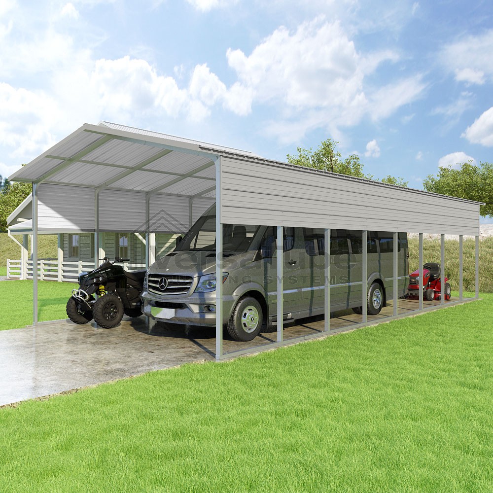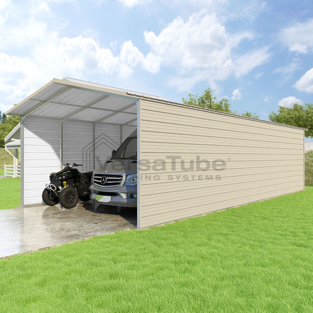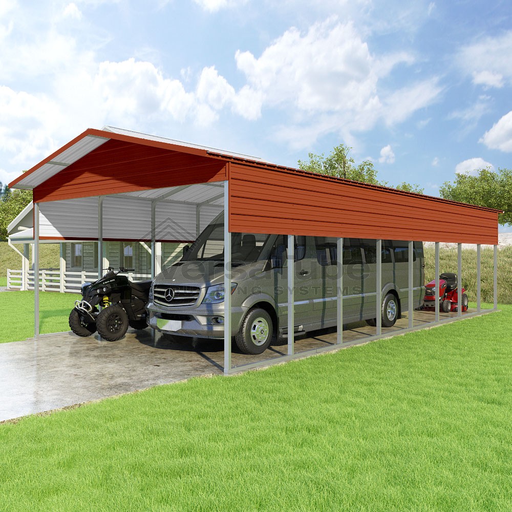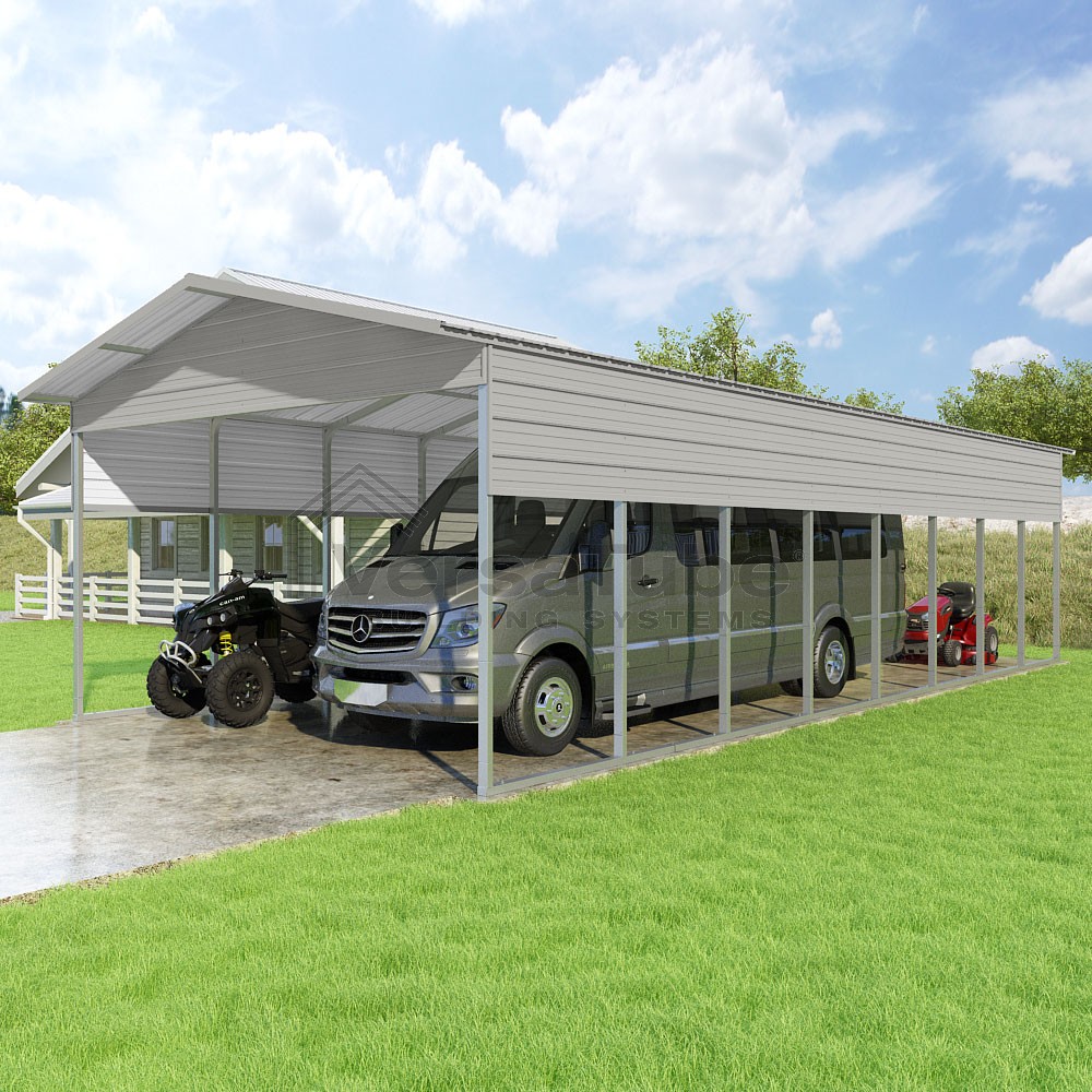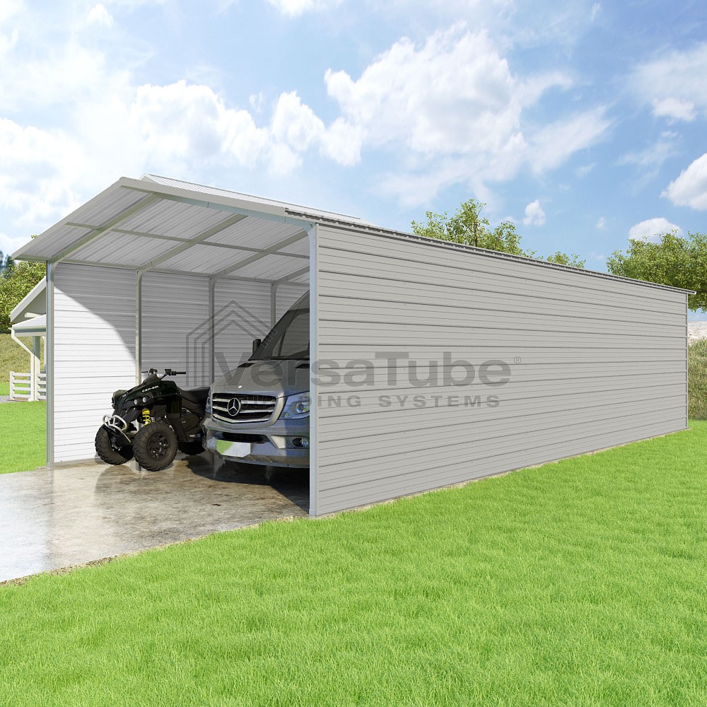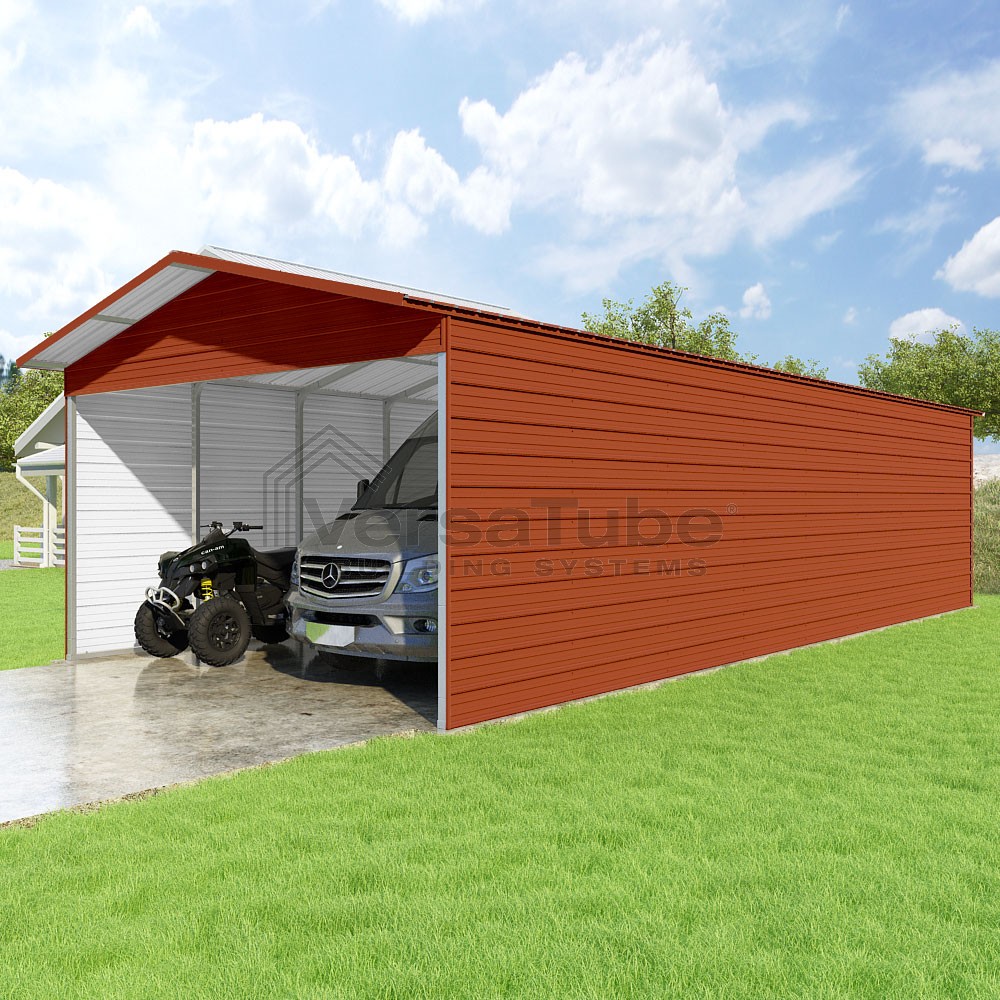 Pinnacle Series DIY carport kit features vertical sheet metal roof panels with ridge cap, gable and eave trim for an A-frame roof style and extended coverage on both ends.