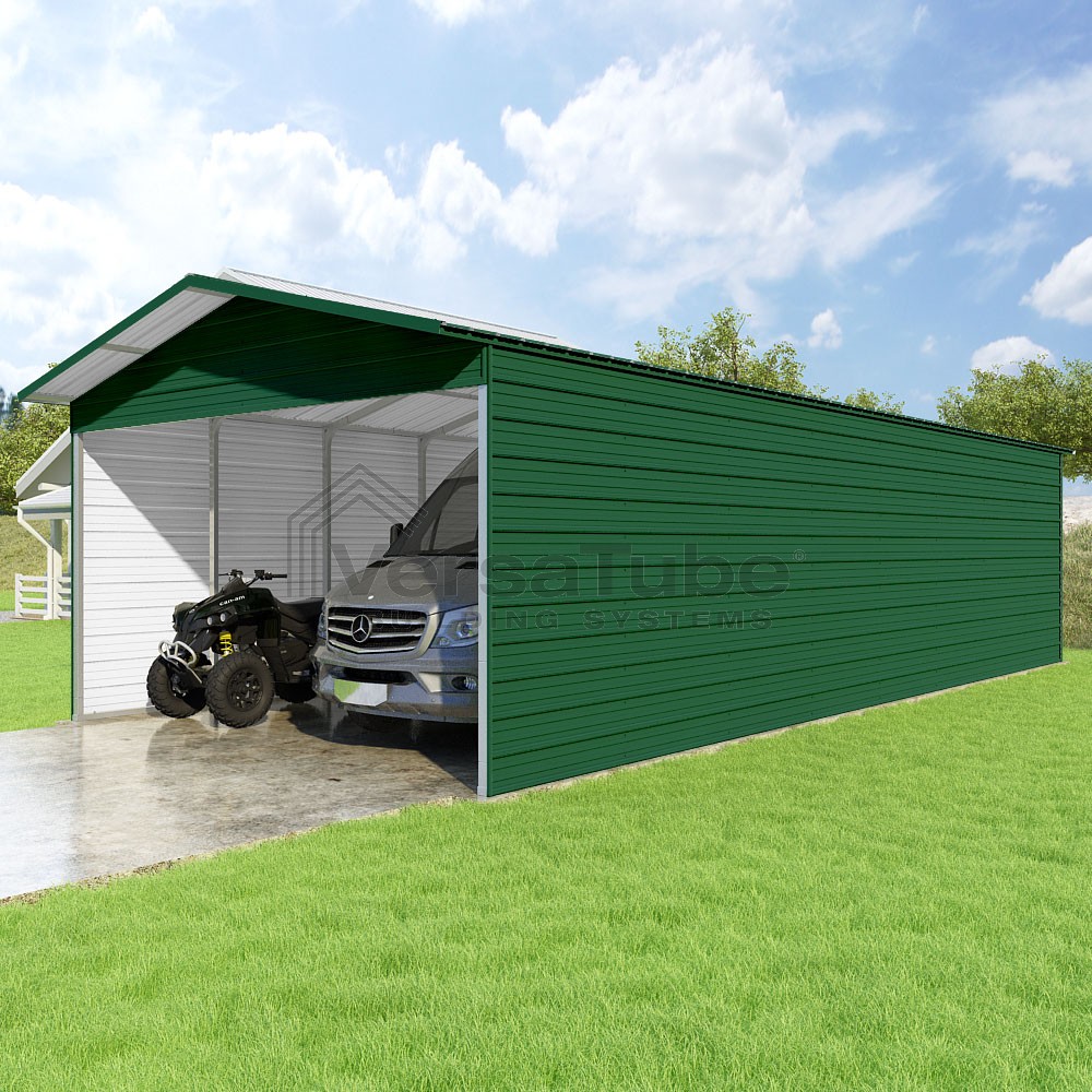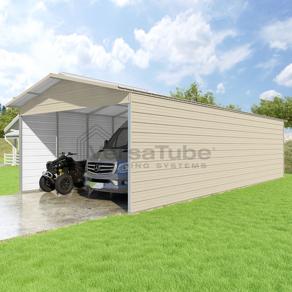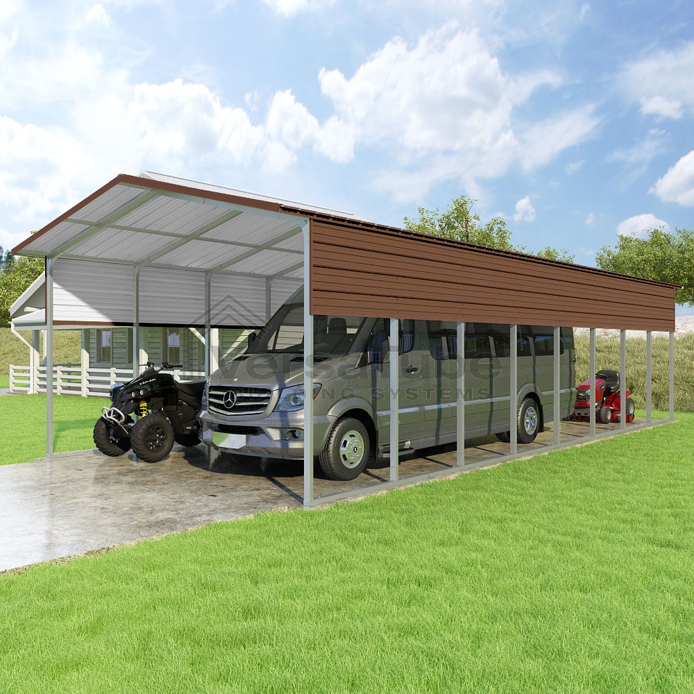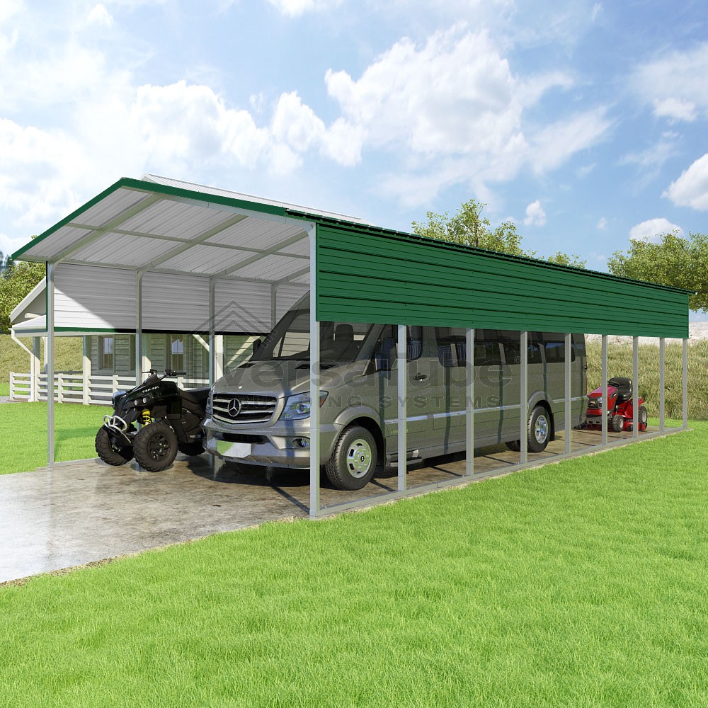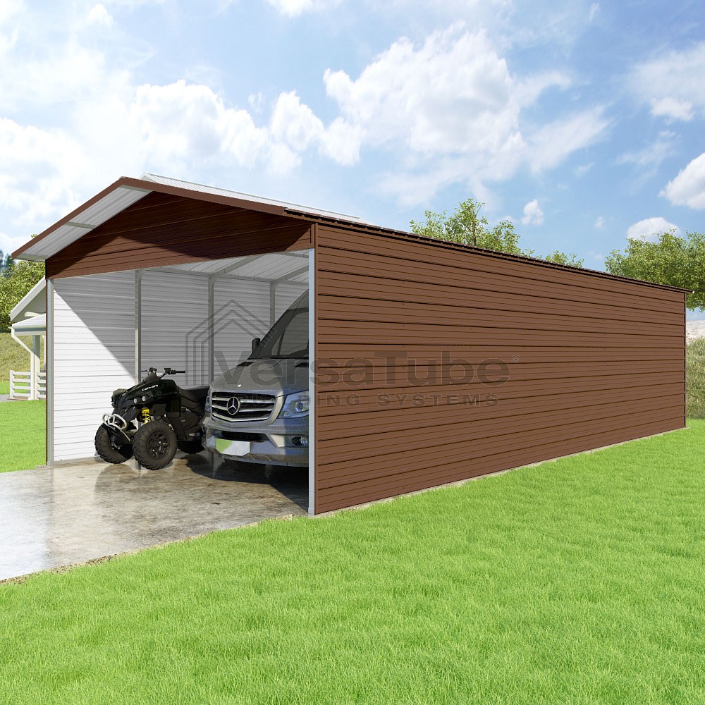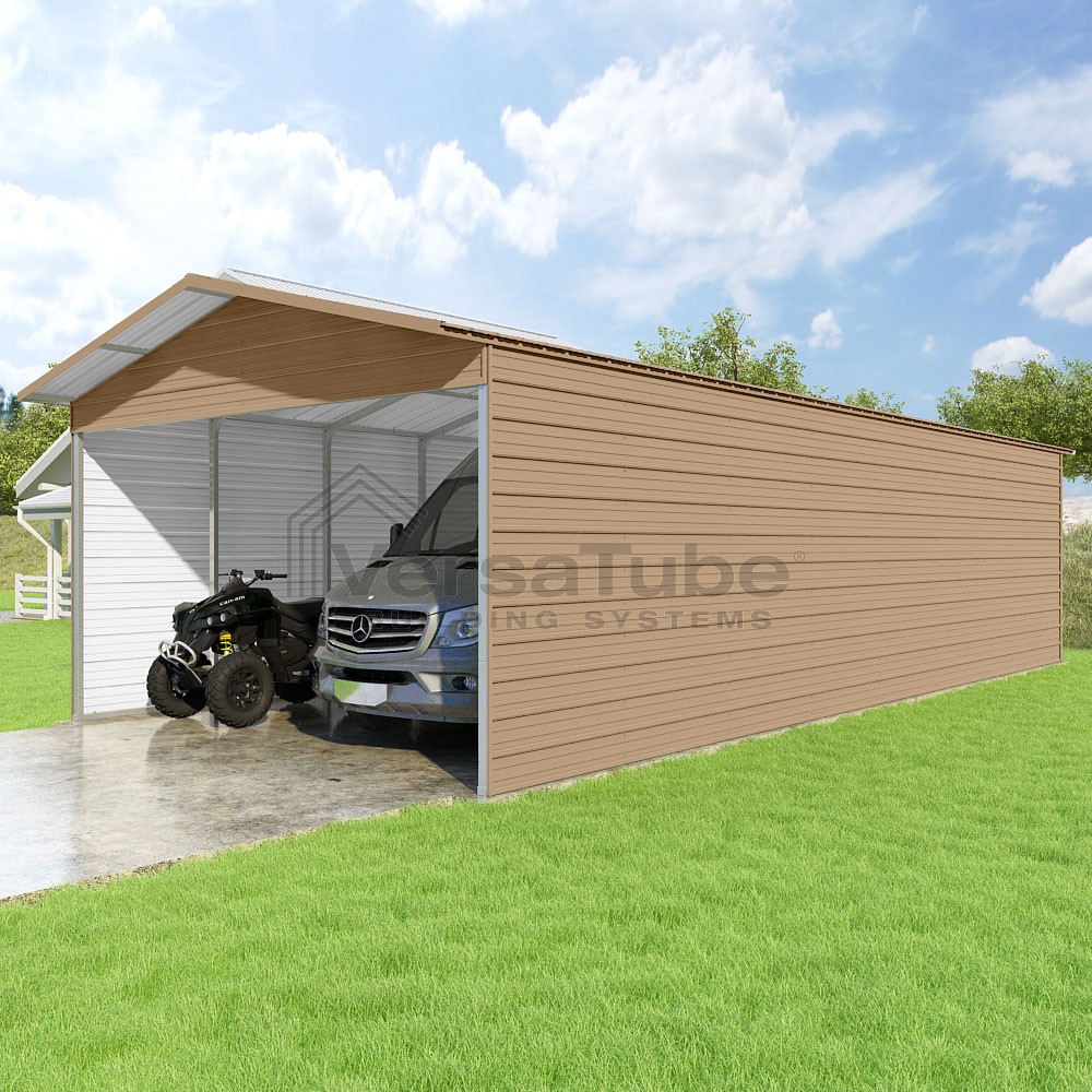 Pinnacle Series DIY carport kit features vertical sheet metal roof panels with ridge cap, gable and eave trim for an A-frame roof style and extended coverage on both ends.