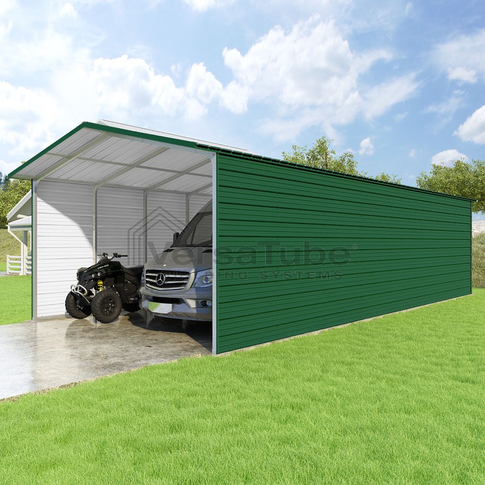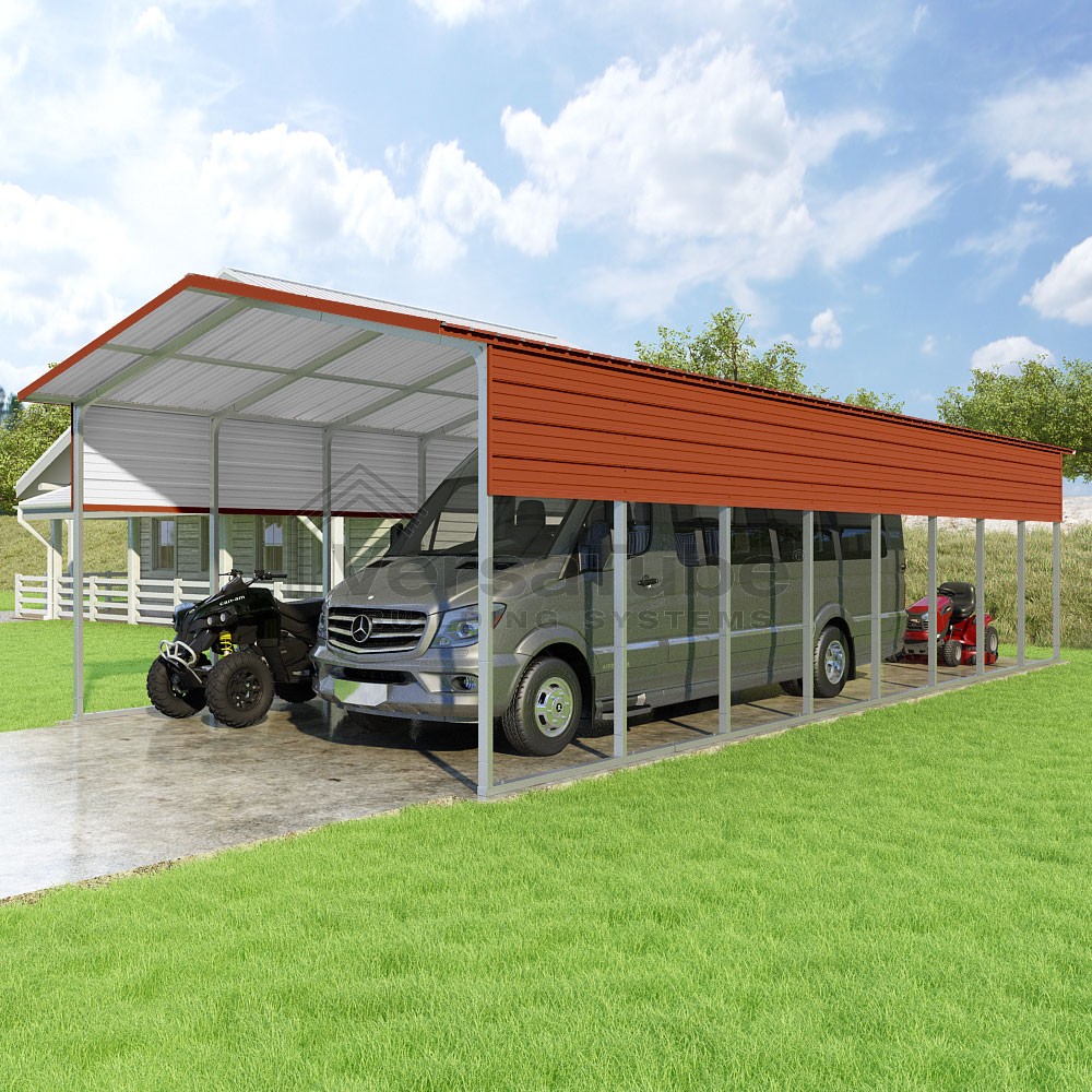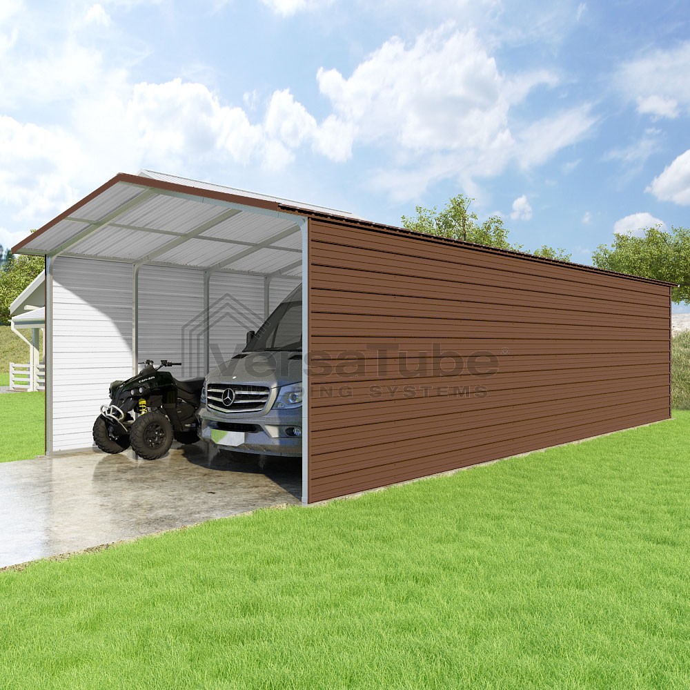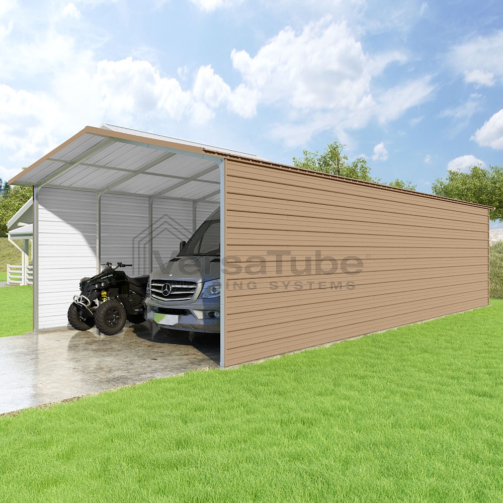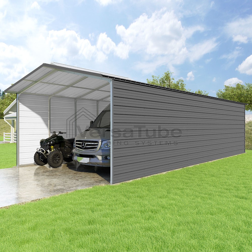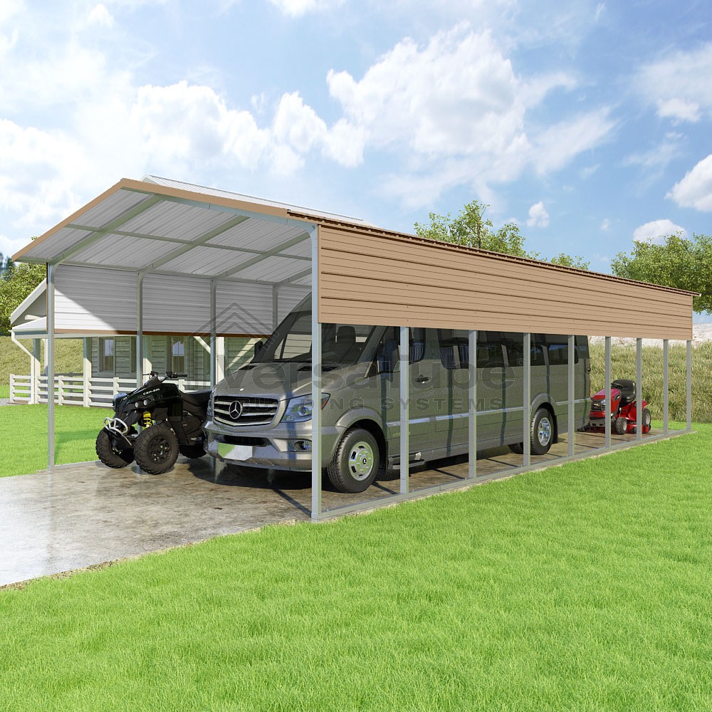 Pinnacle Series DIY carport kit features vertical sheet metal roof panels with ridge cap, gable and eave trim for an A-frame roof style and extended coverage on both ends.