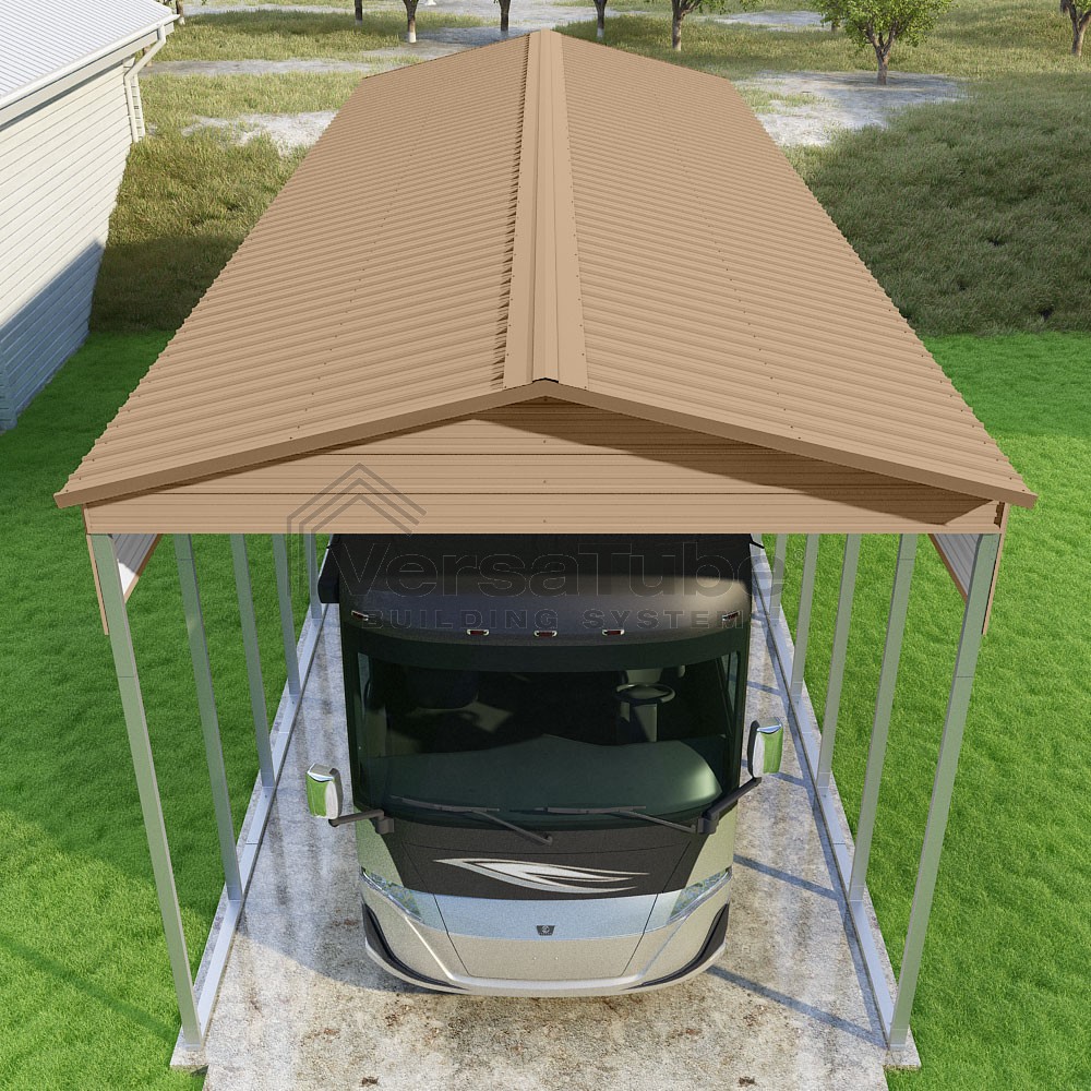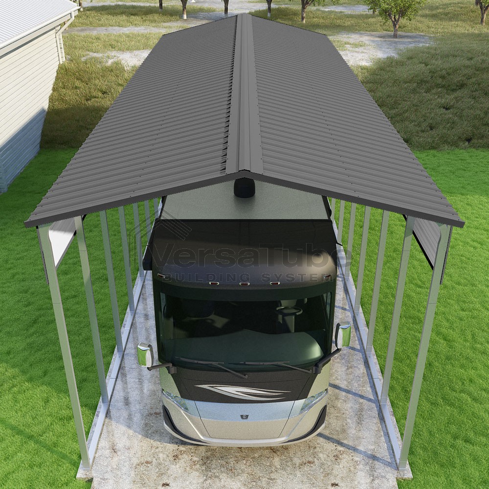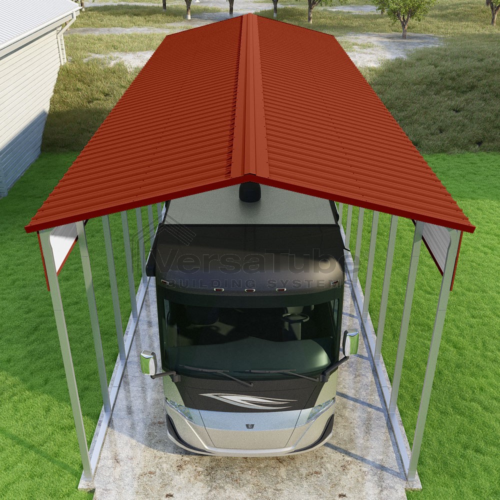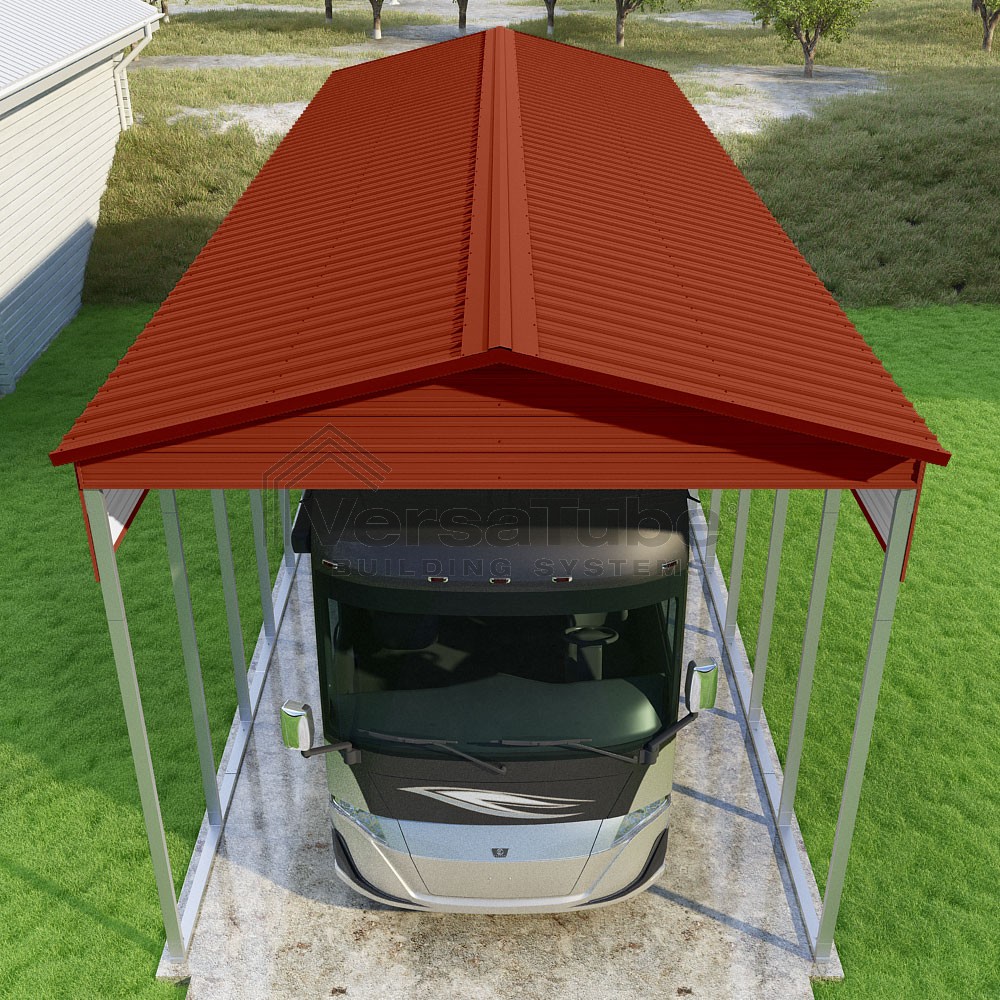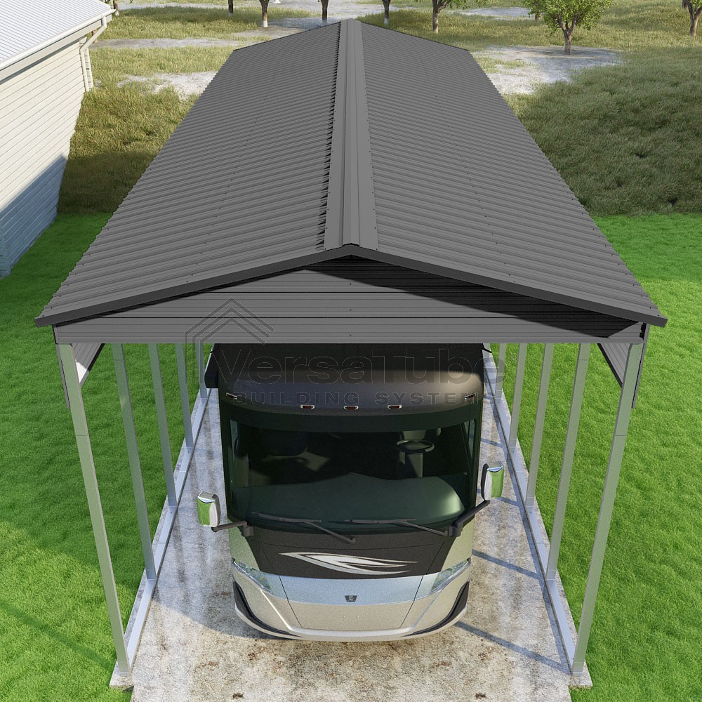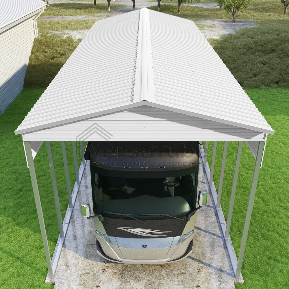 Pinnacle Series DIY carport kit features vertical sheet metal roof panels with ridge cap, gable and eave trim for an A-frame roof style and extended coverage on both ends.