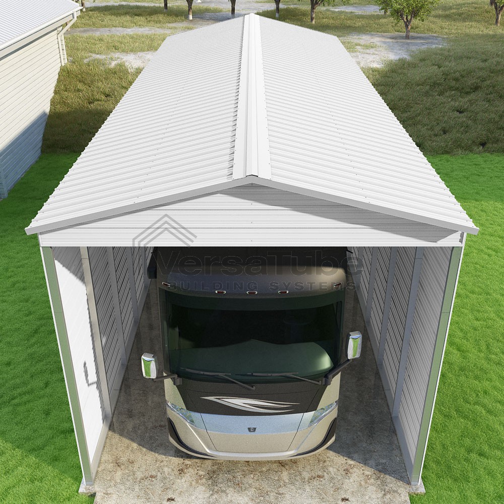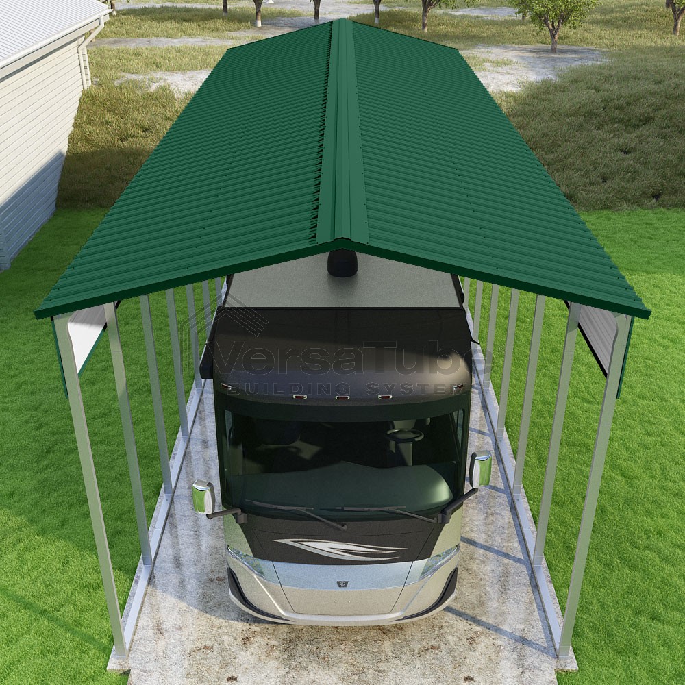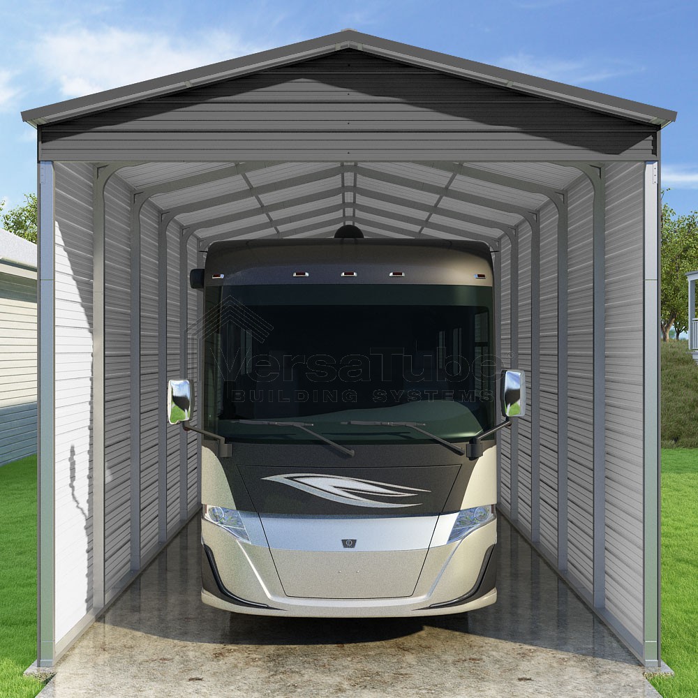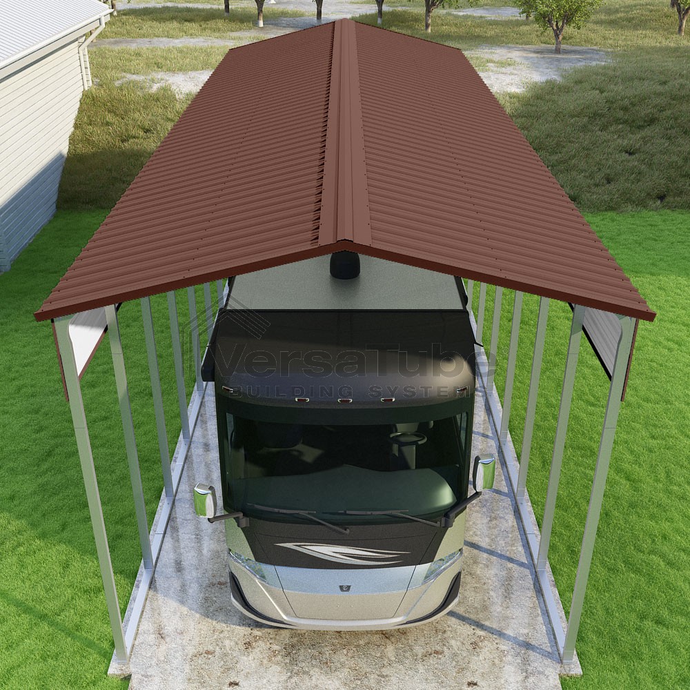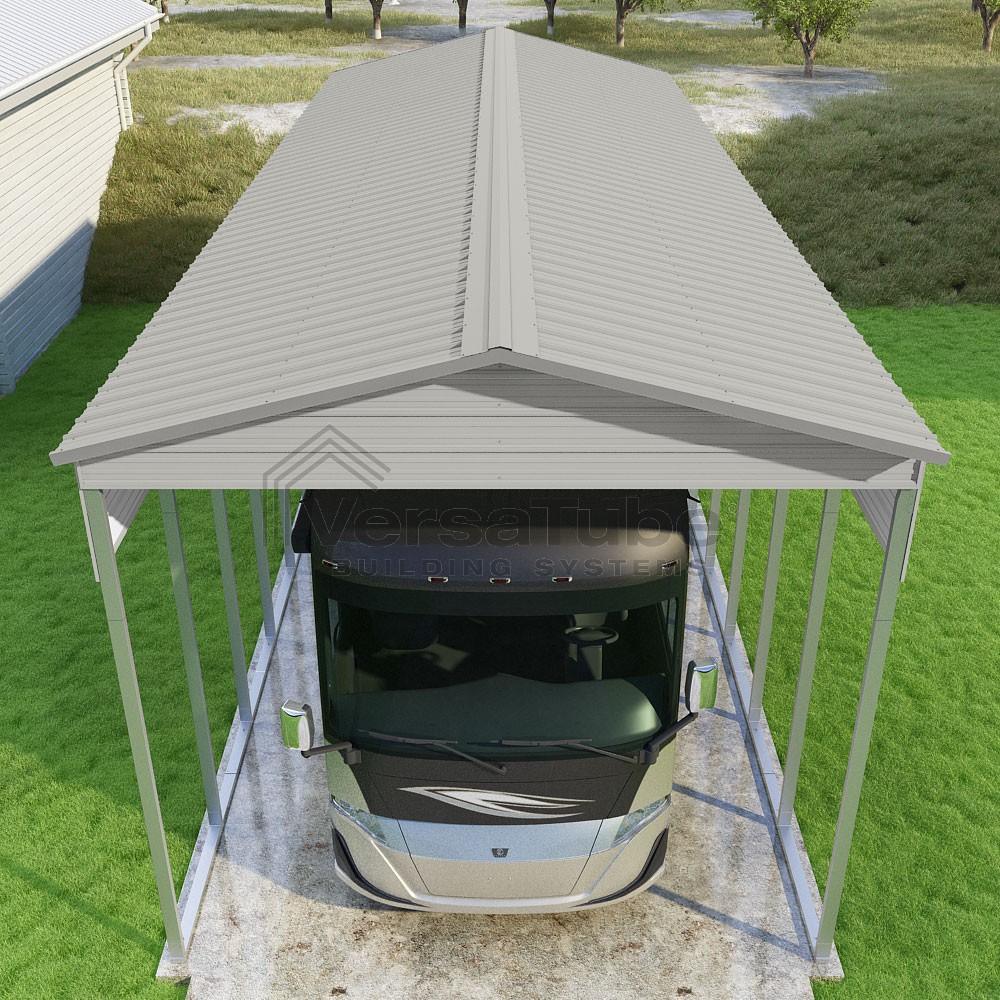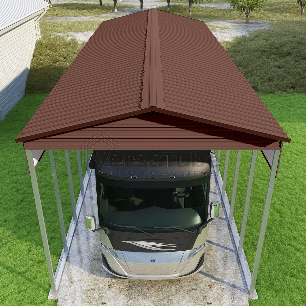 Pinnacle Series DIY carport kit features vertical sheet metal roof panels with ridge cap, gable and eave trim for an A-frame roof style and extended coverage on both ends.