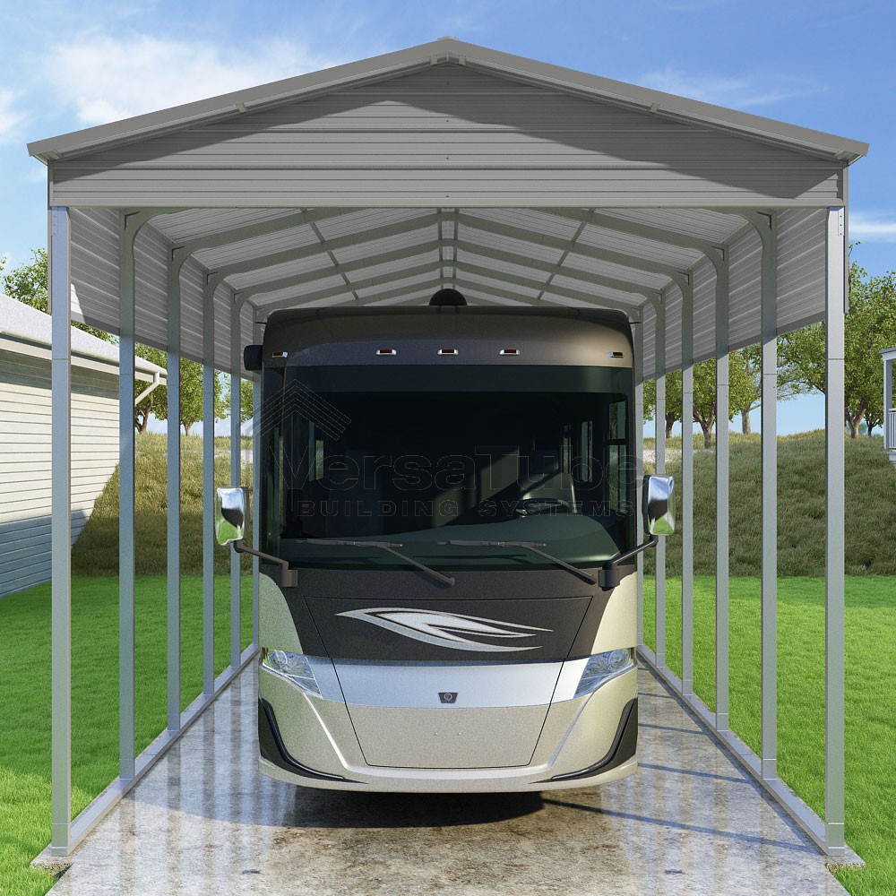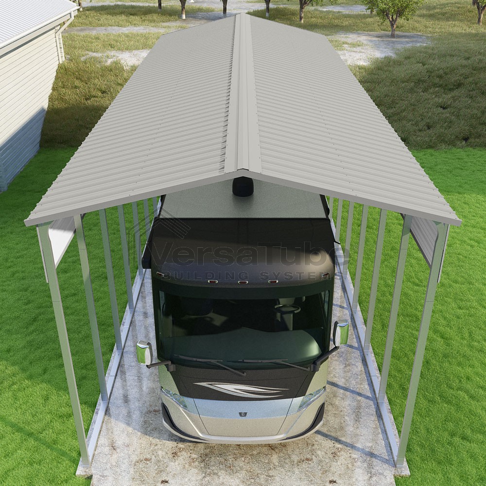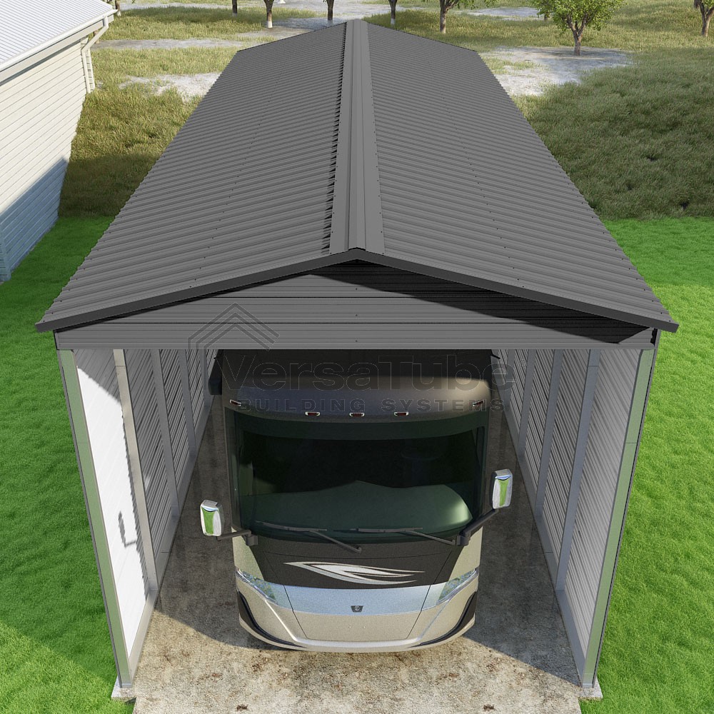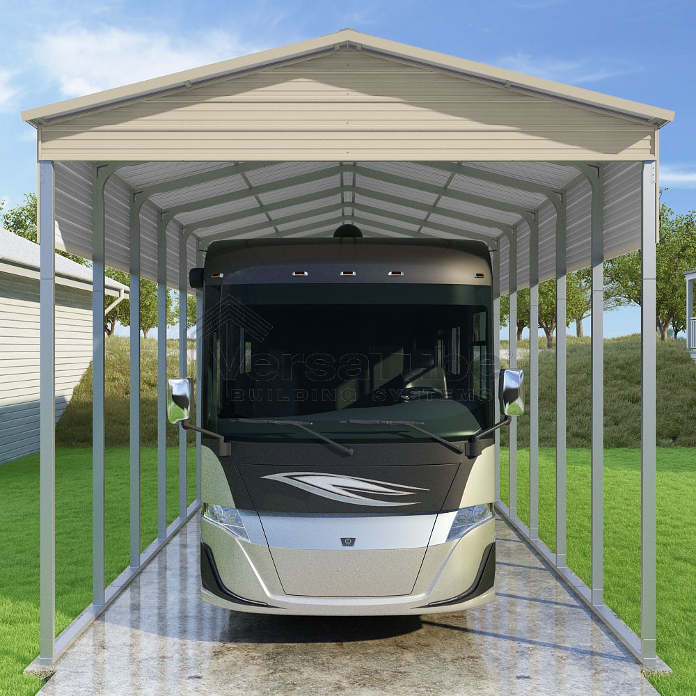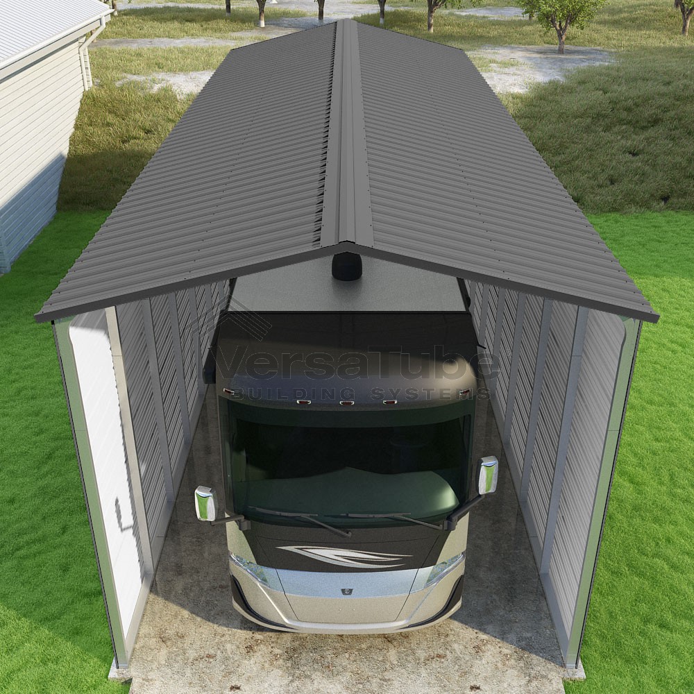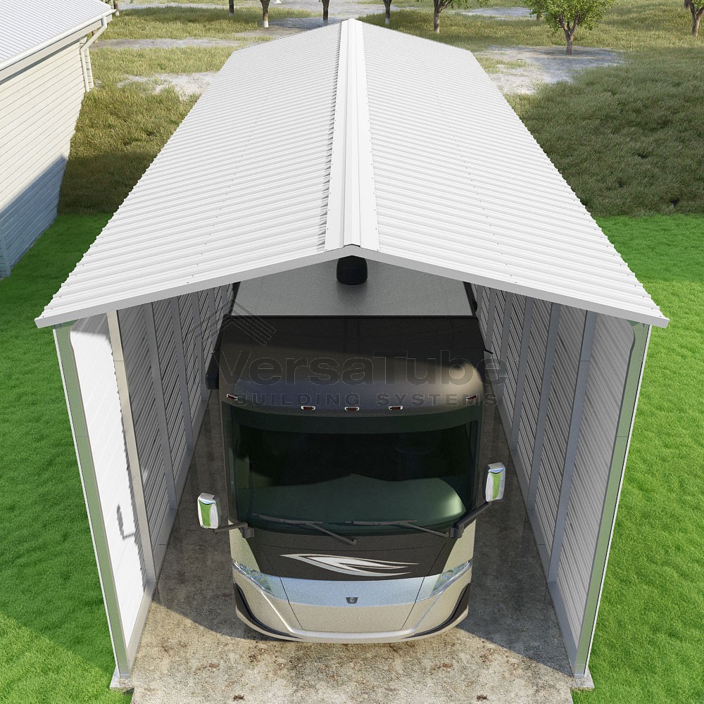 Pinnacle Series DIY carport kit features vertical sheet metal roof panels with ridge cap, gable and eave trim for an A-frame roof style and extended coverage on both ends.