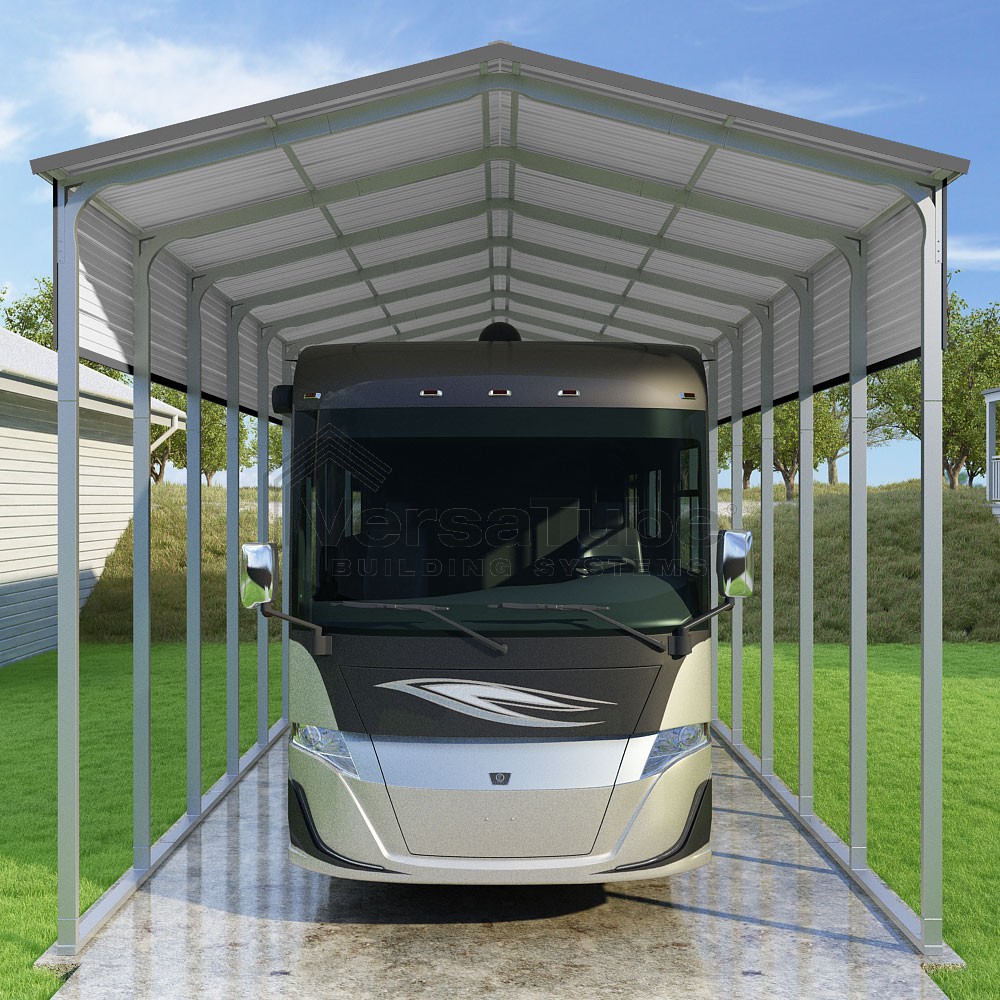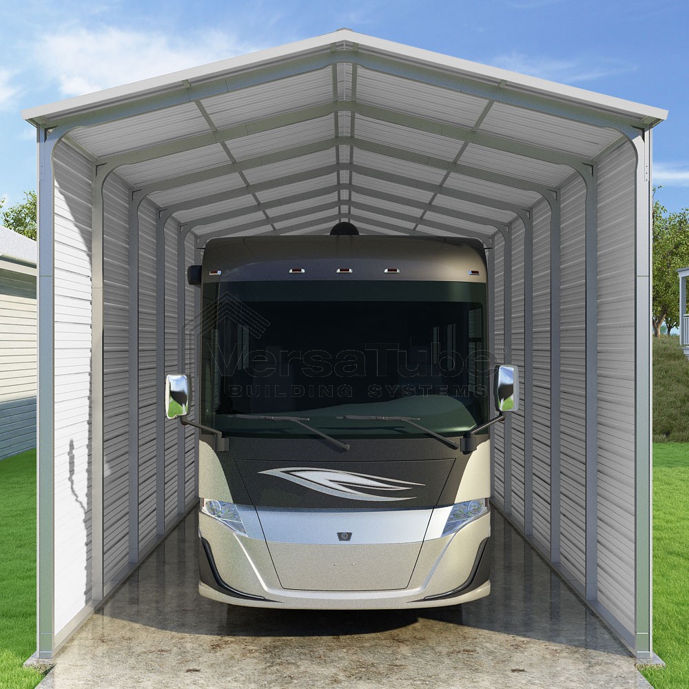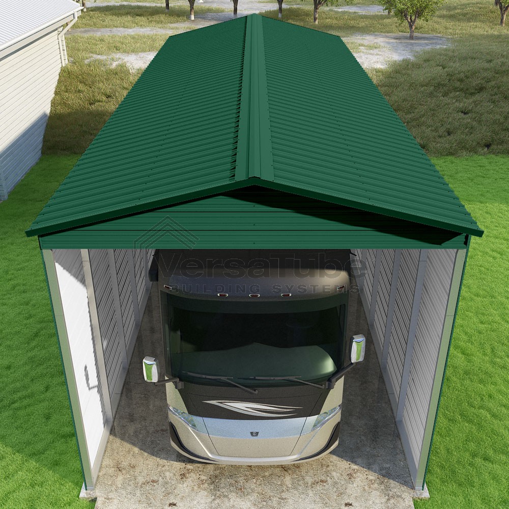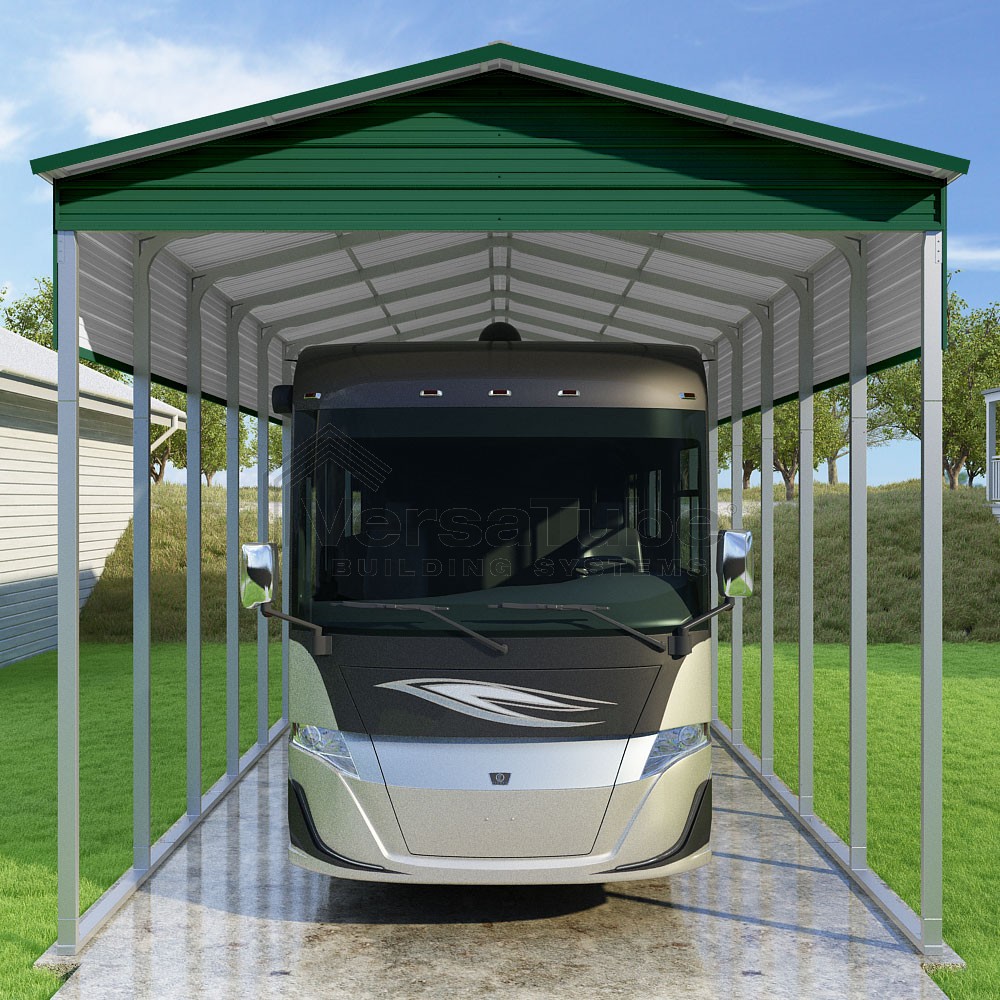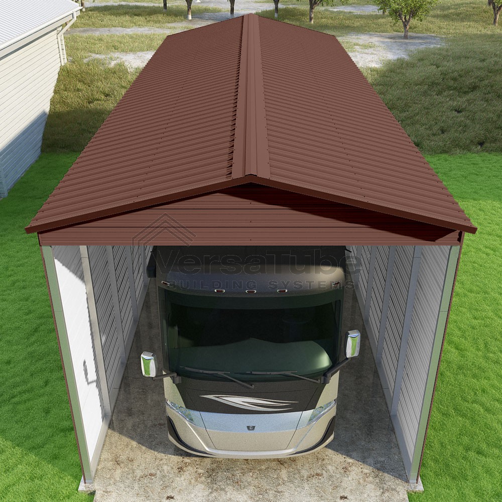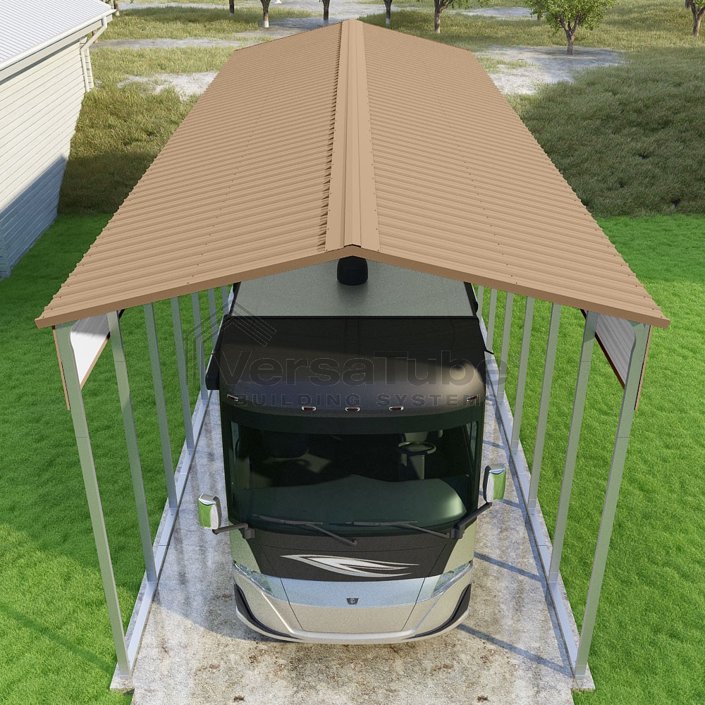 Pinnacle Series DIY carport kit features vertical sheet metal roof panels with ridge cap, gable and eave trim for an A-frame roof style and extended coverage on both ends.
