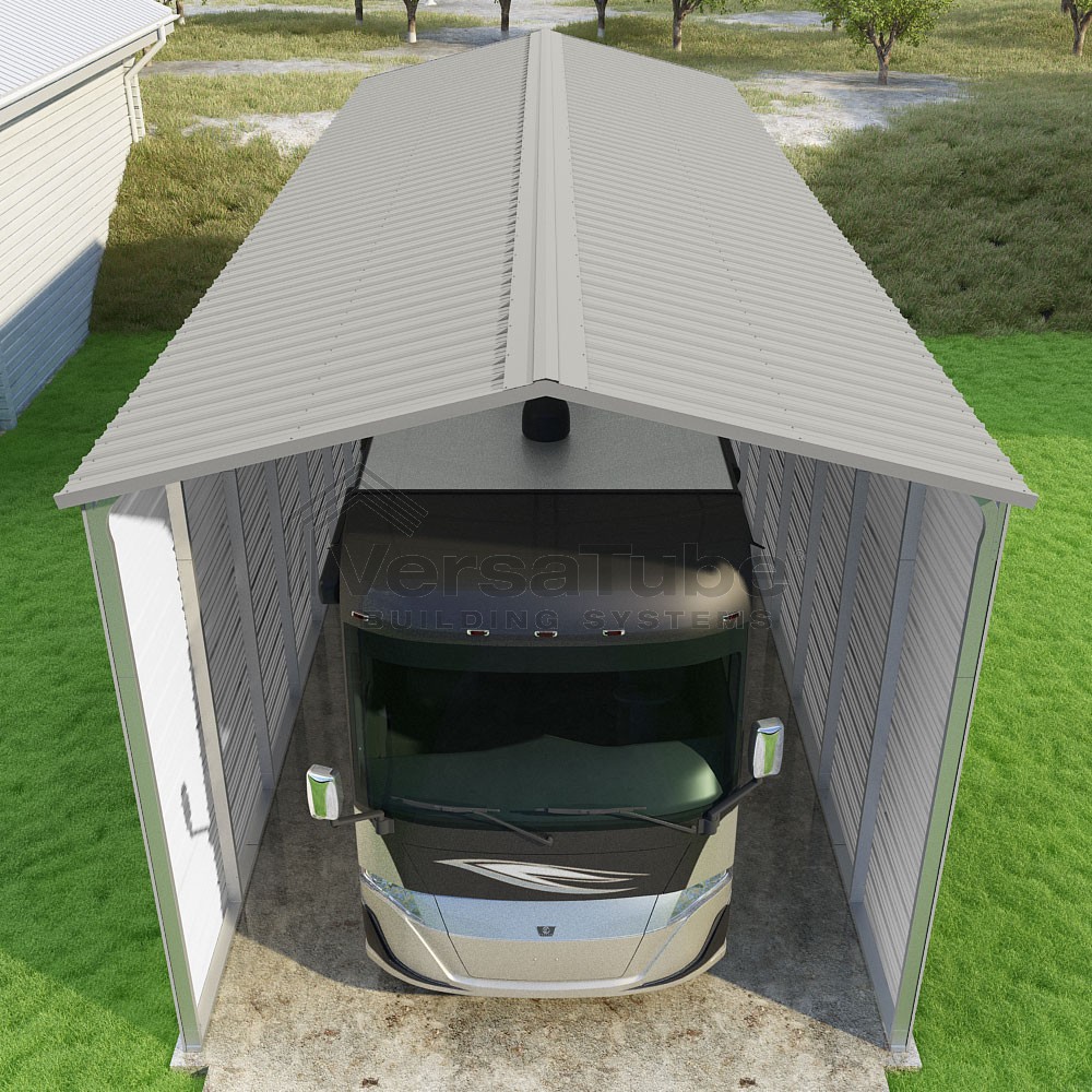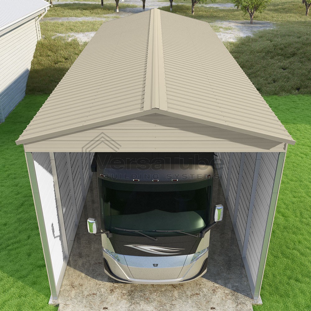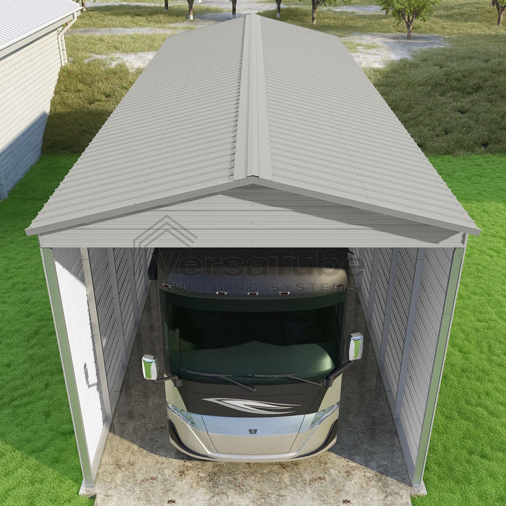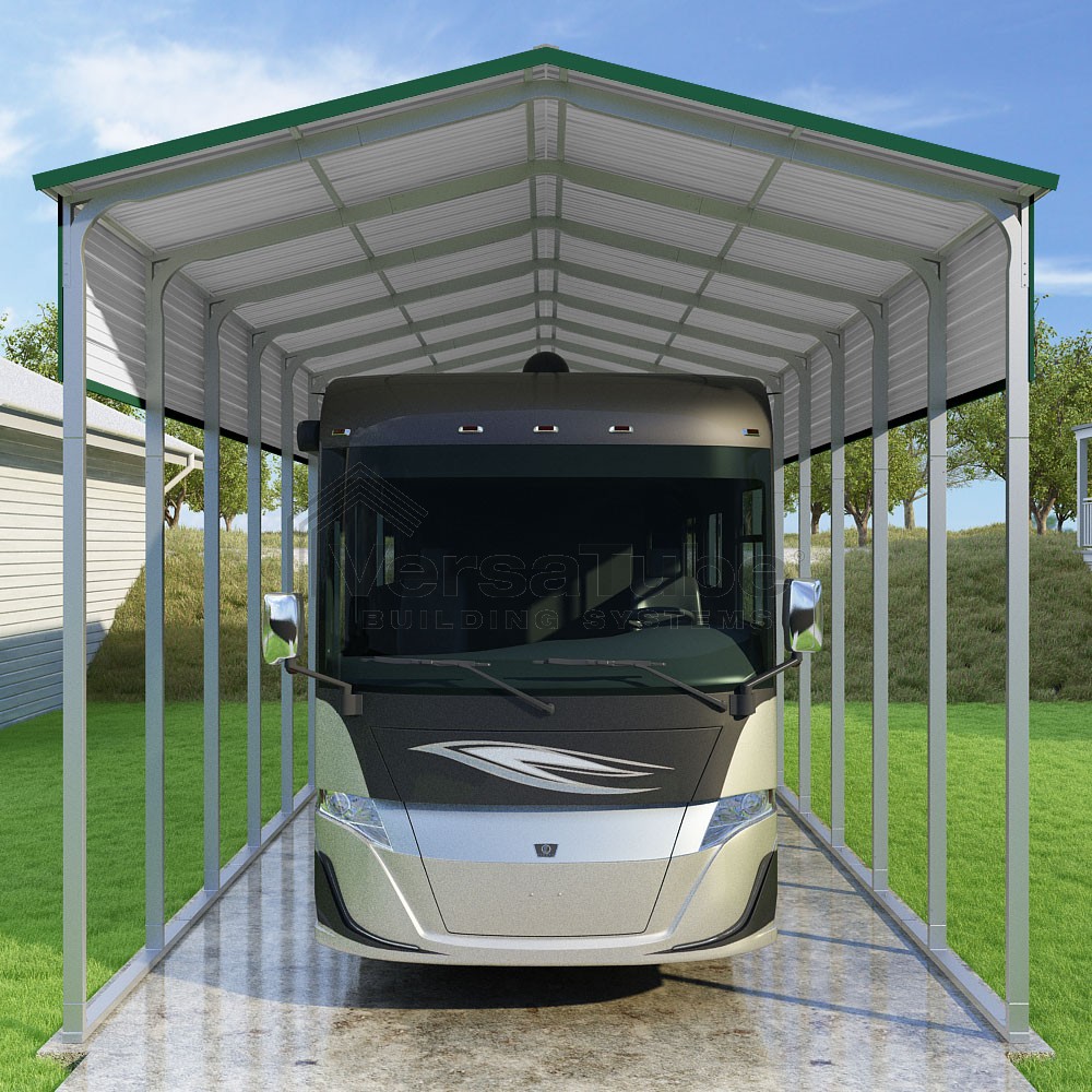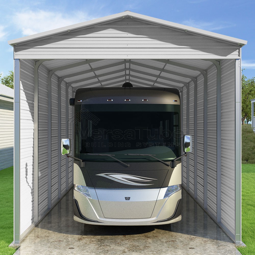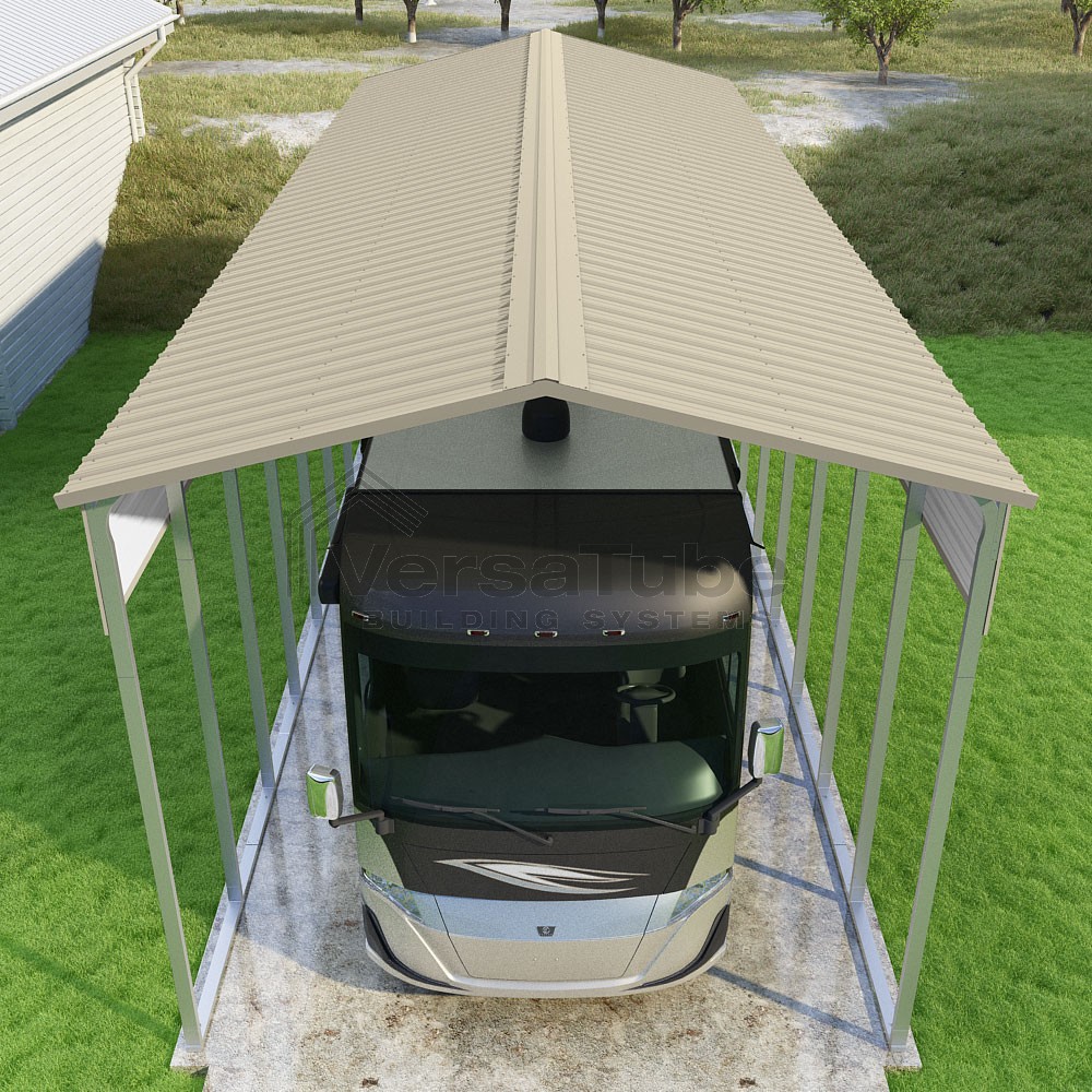 Pinnacle Series DIY carport kit features vertical sheet metal roof panels with ridge cap, gable and eave trim for an A-frame roof style and extended coverage on both ends.