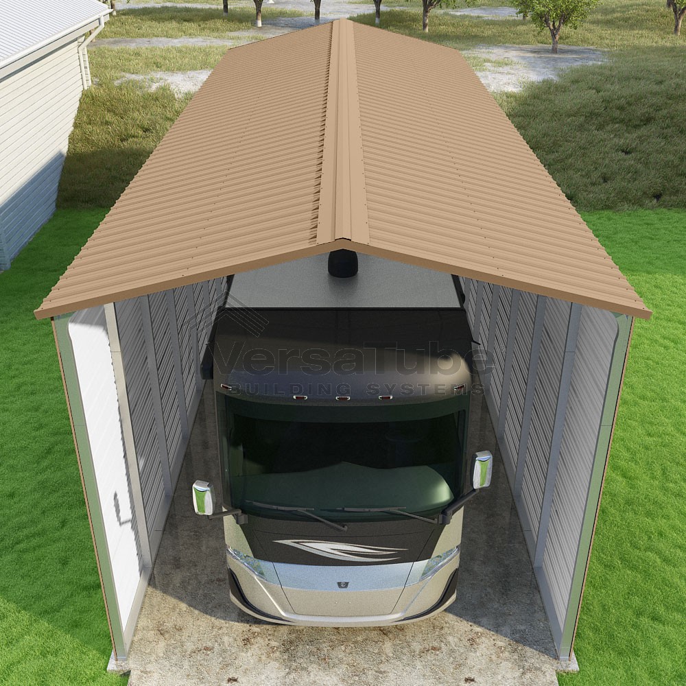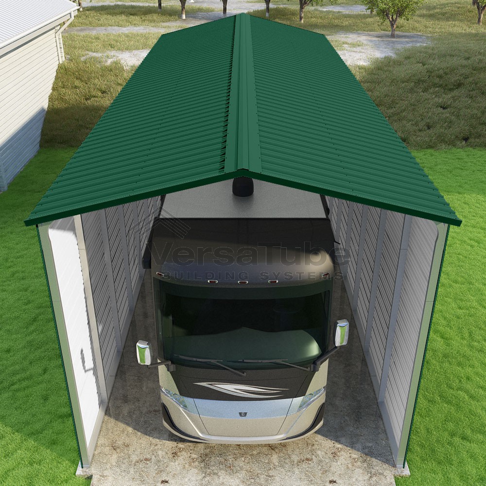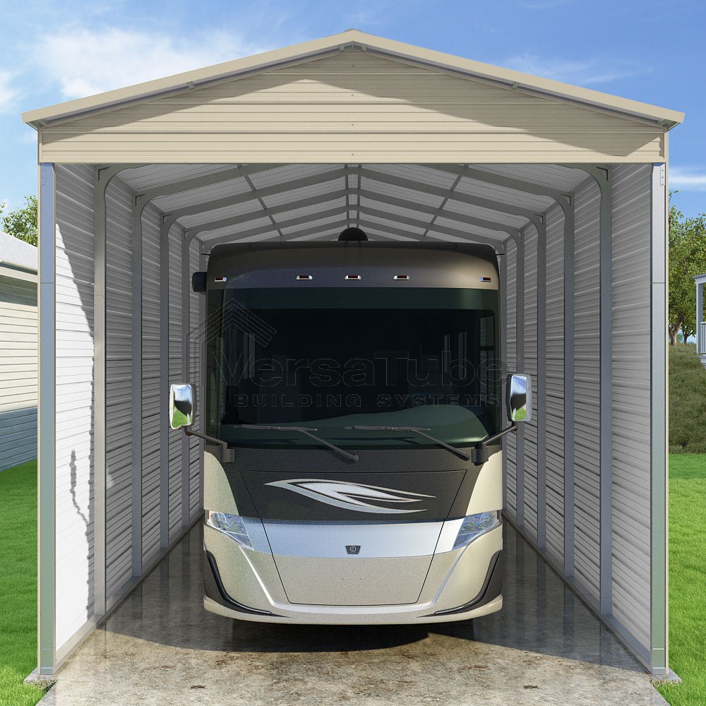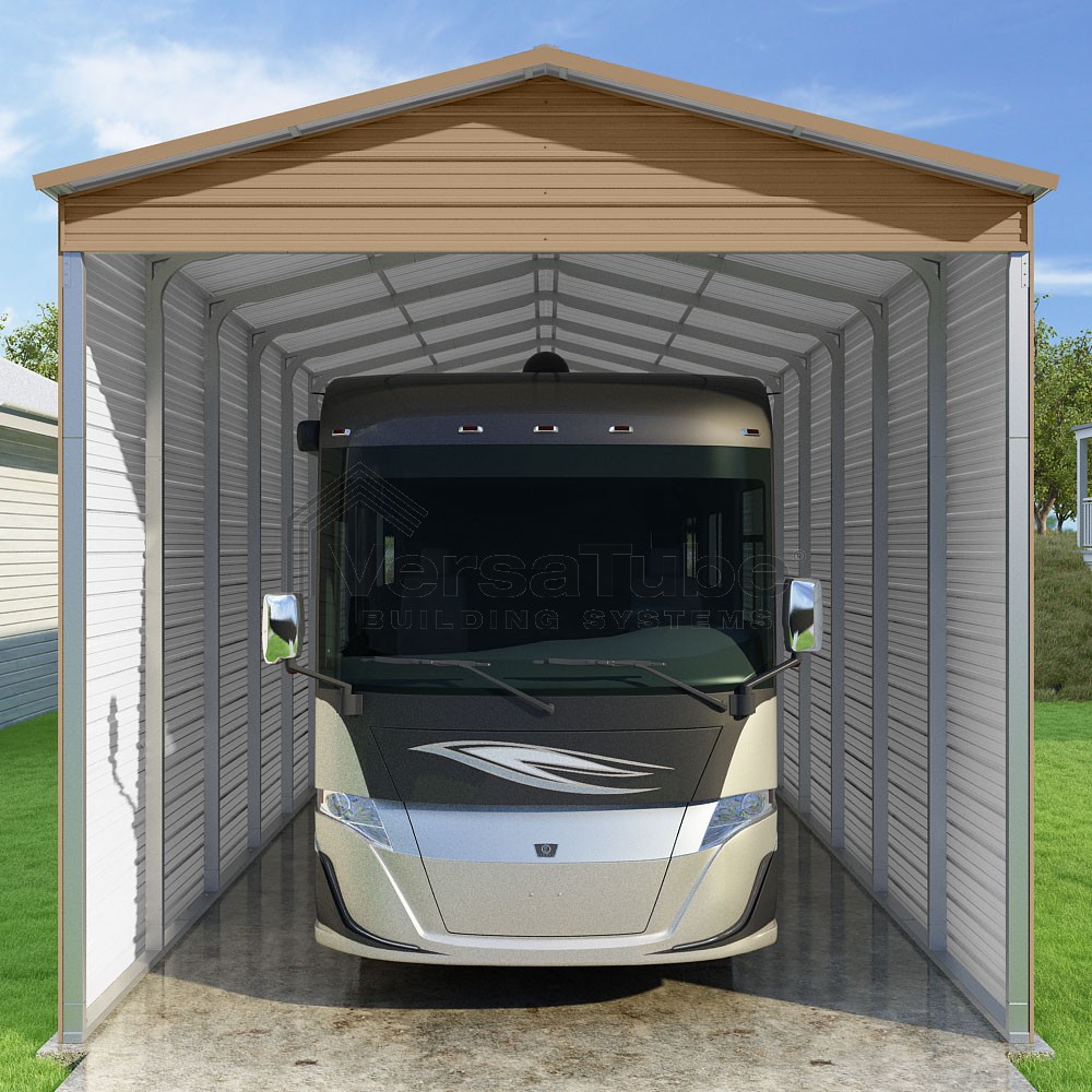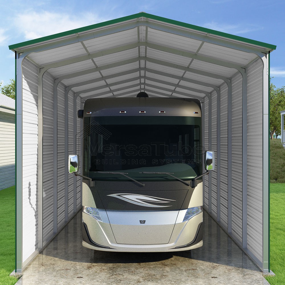Pinnacle Series DIY carport kit features vertical sheet metal roof panels with ridge cap, gable and eave trim for an A-frame roof style and extended coverage on both ends.