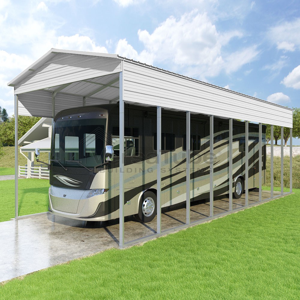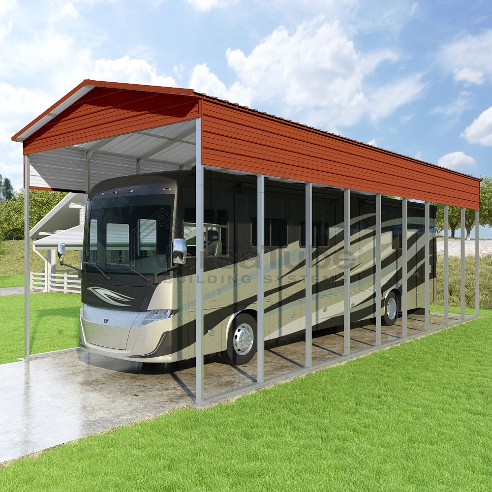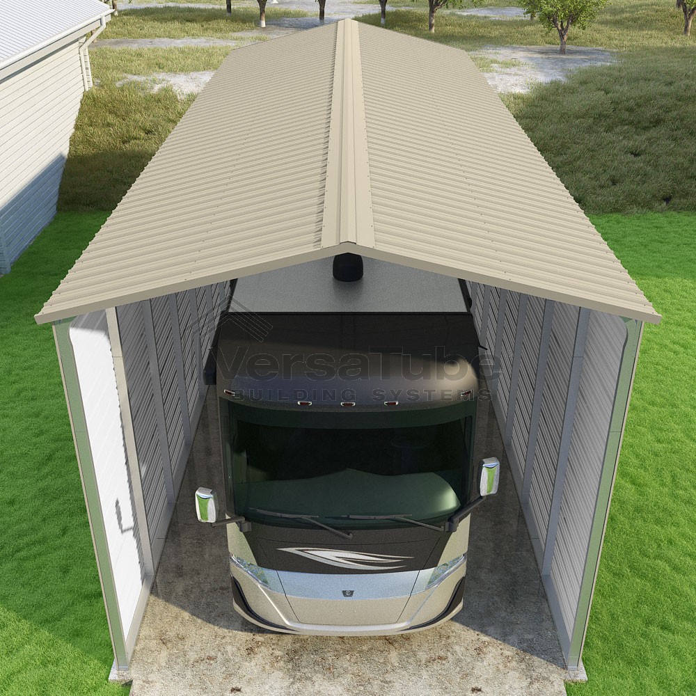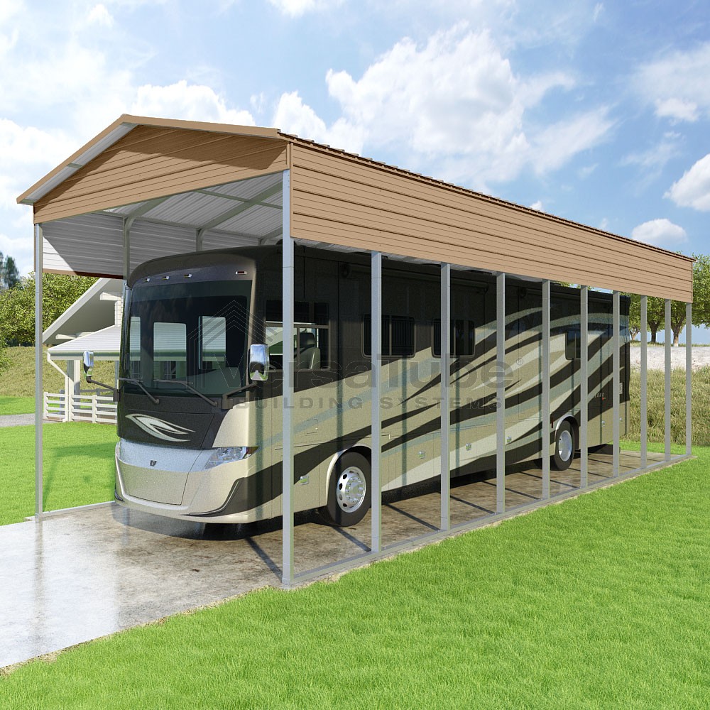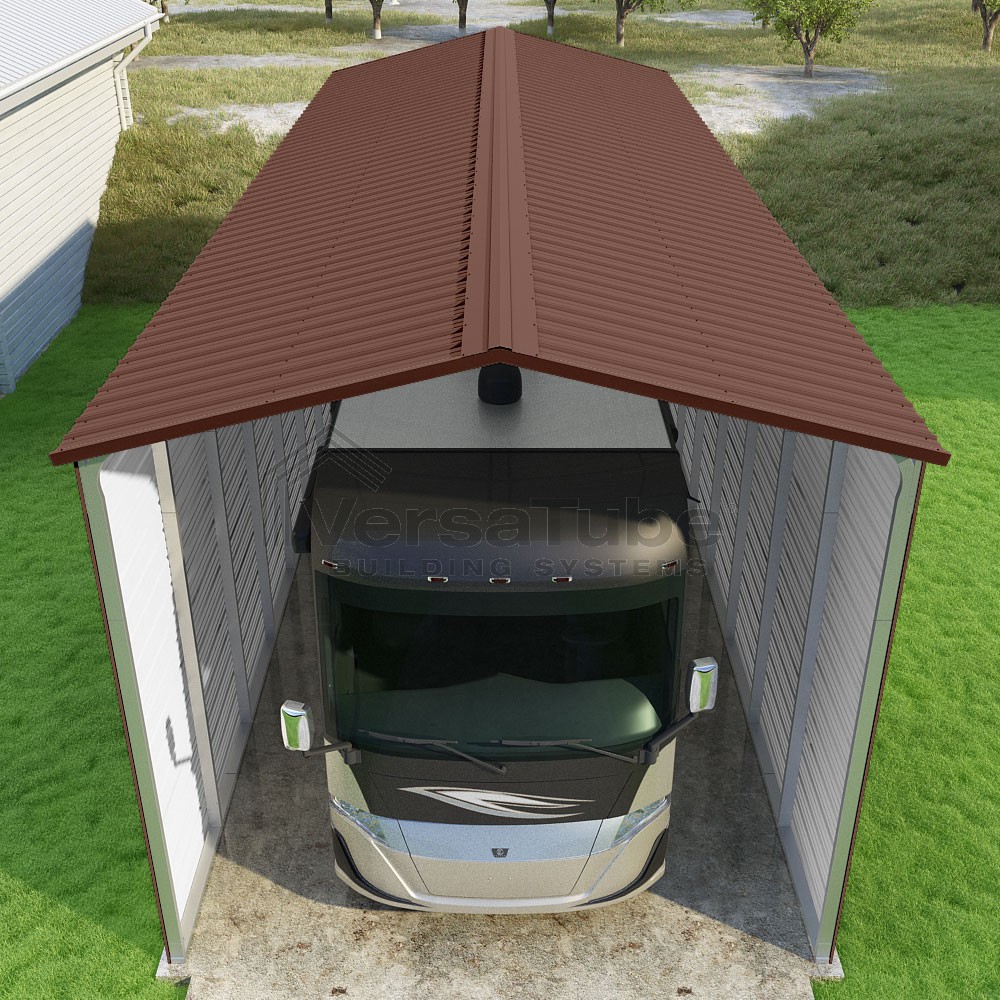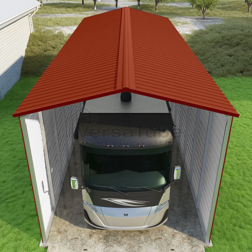 Pinnacle Series DIY carport kit features vertical sheet metal roof panels with ridge cap, gable and eave trim for an A-frame roof style and extended coverage on both ends.