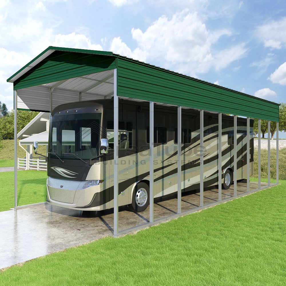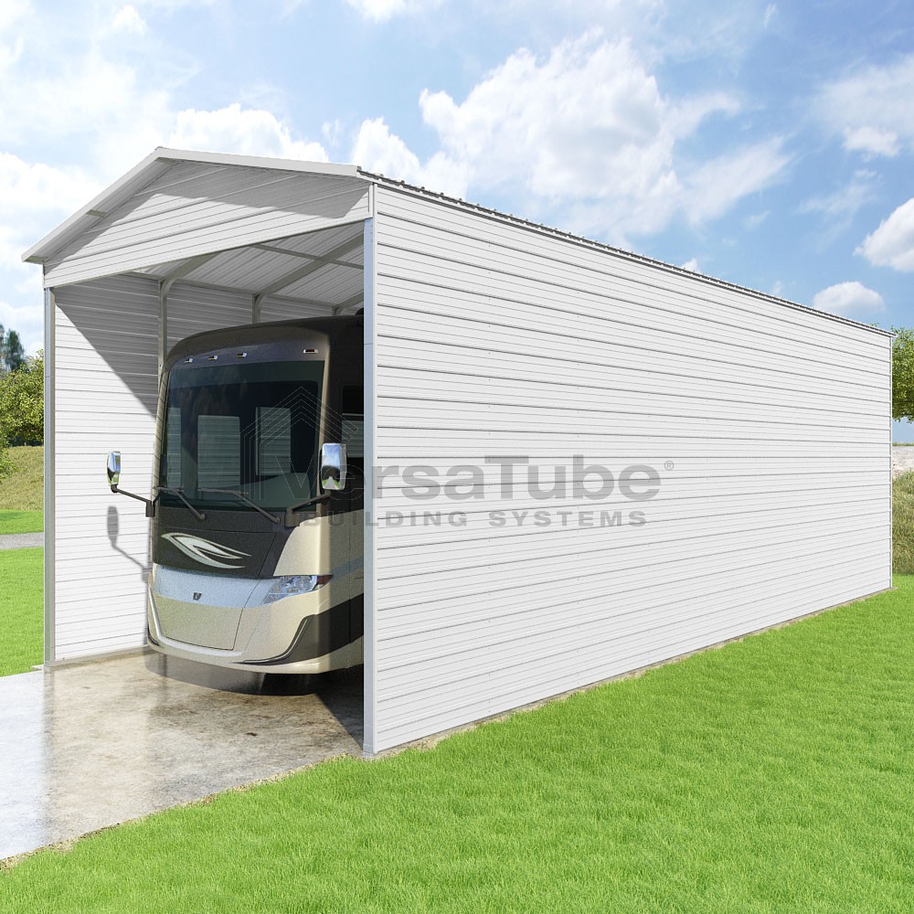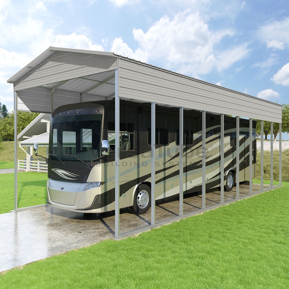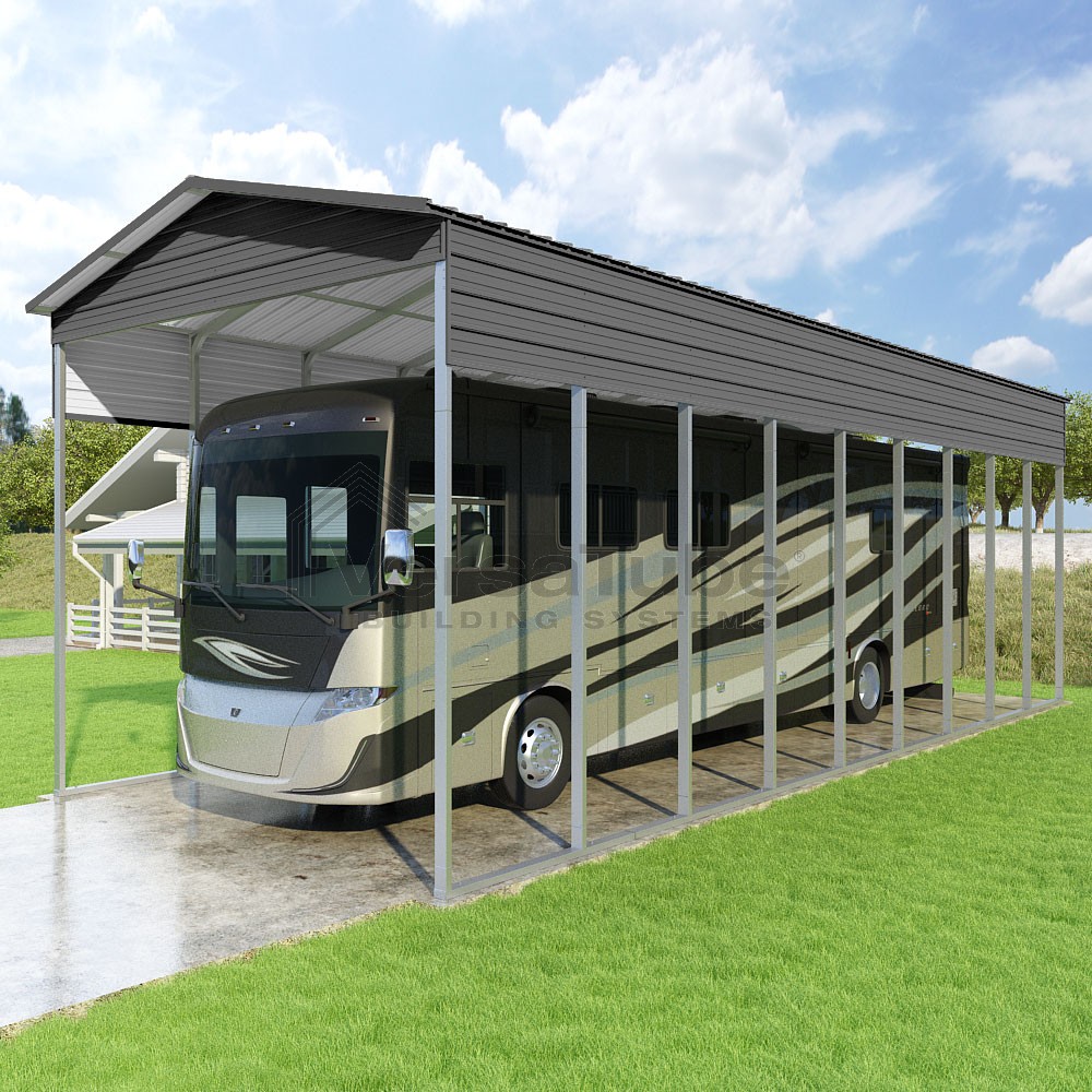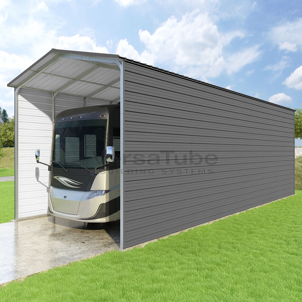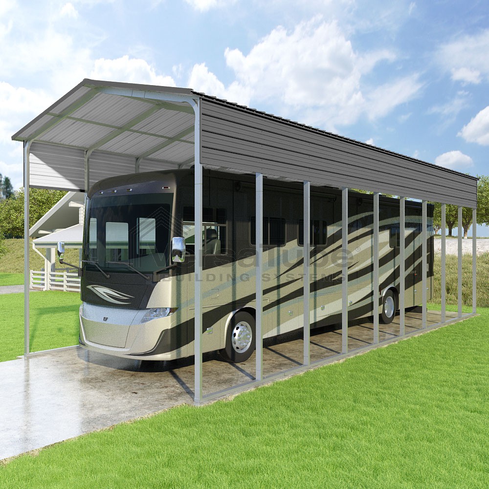 Pinnacle Series DIY carport kit features vertical sheet metal roof panels with ridge cap, gable and eave trim for an A-frame roof style and extended coverage on both ends.